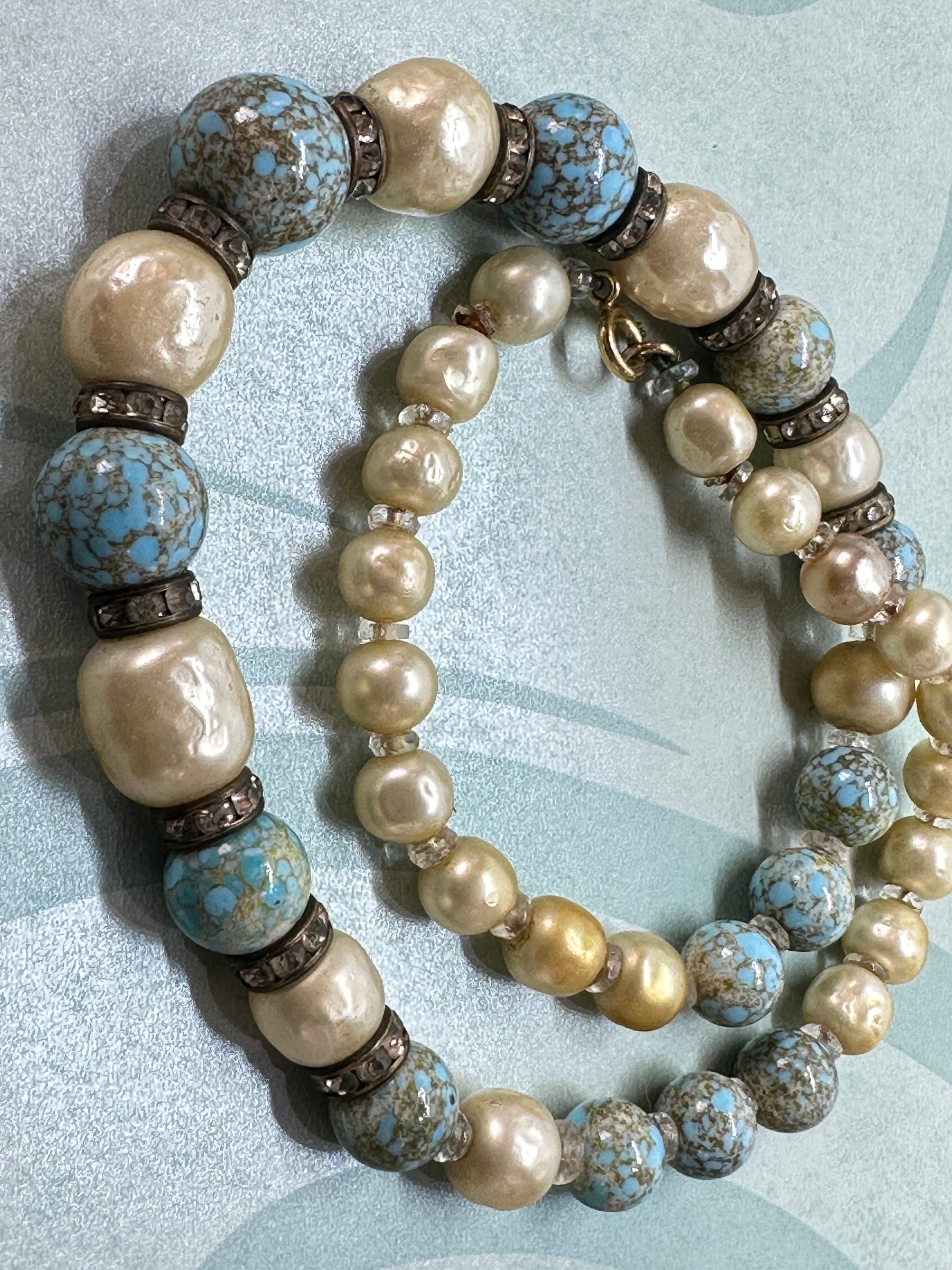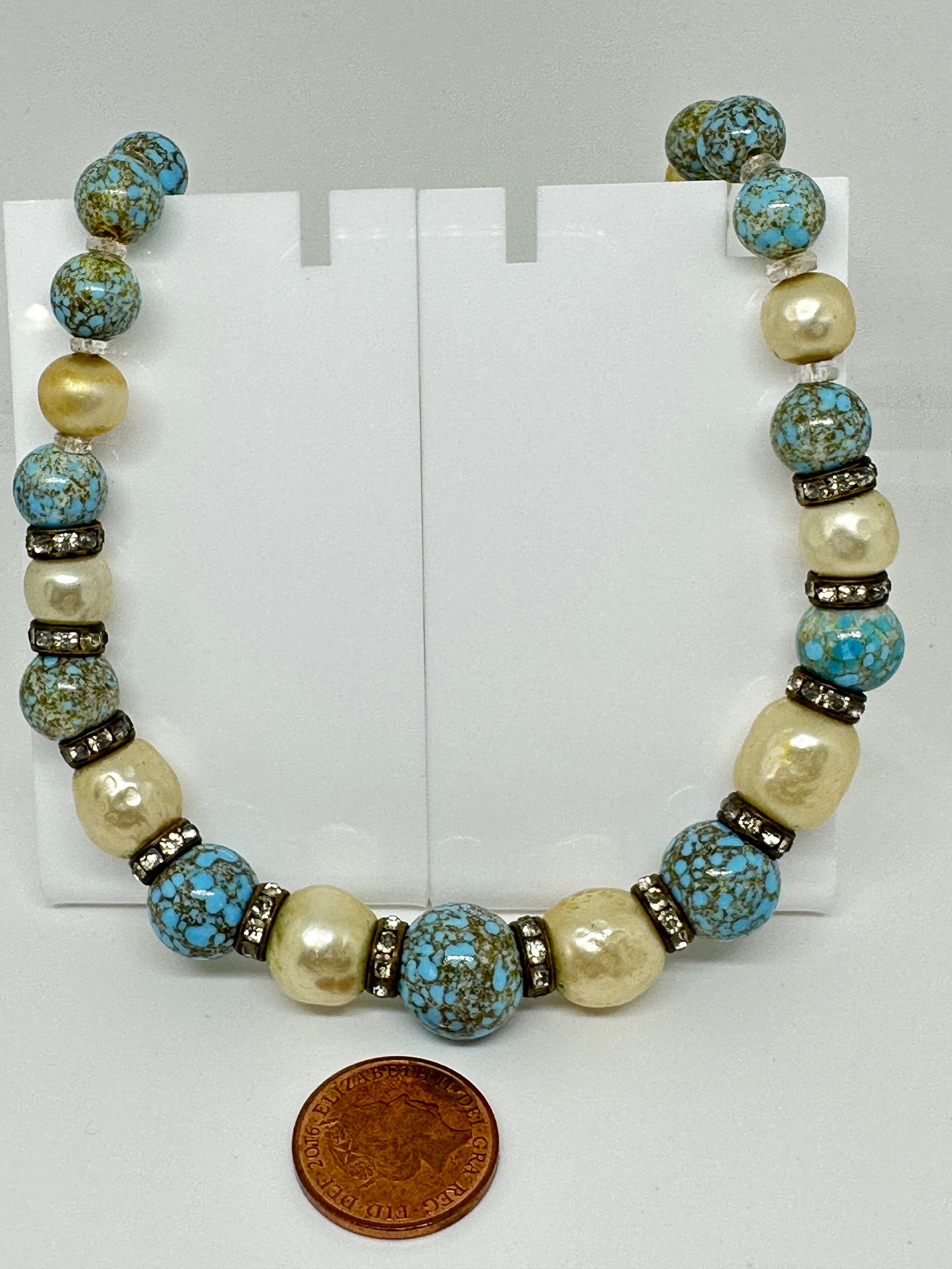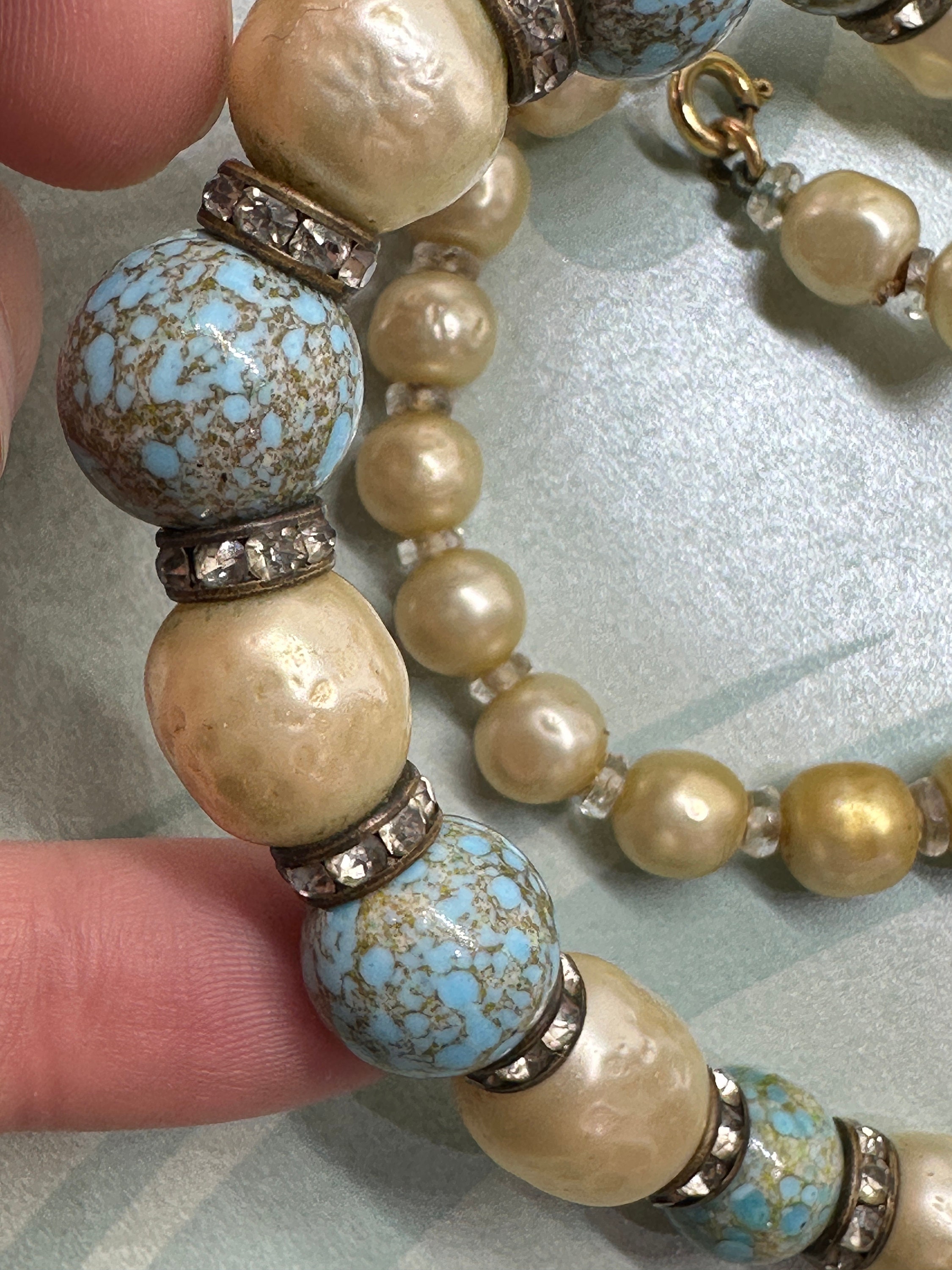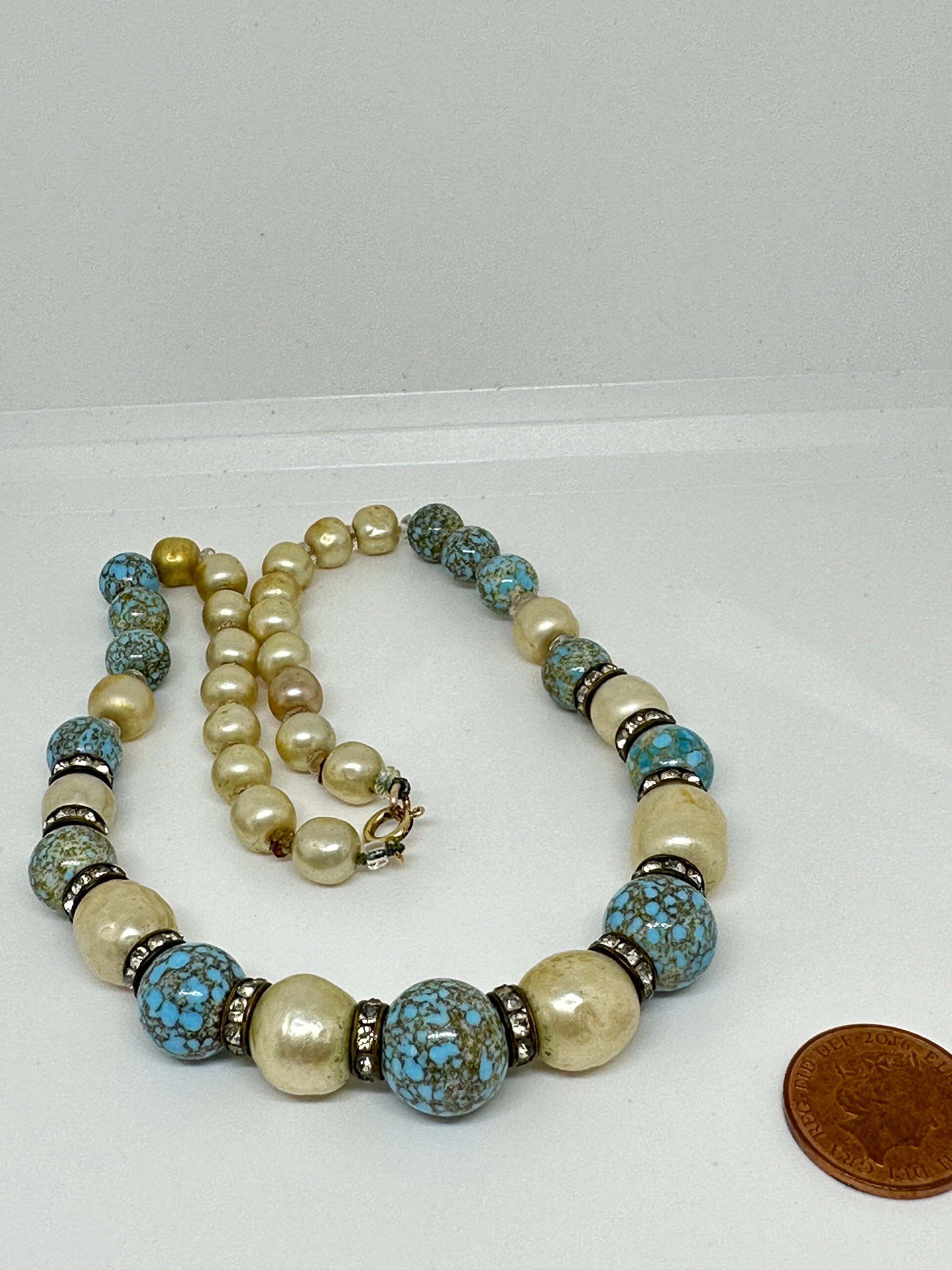 Art Deco beaded necklace, comprising of hand knotted Peking glass beads, simulated glass pearls and rhinestone rondelle spacer beads. It measures approx 17” in length and the largest bead measures 1cm. It is in great condition with no damage. Please ask for any other details.