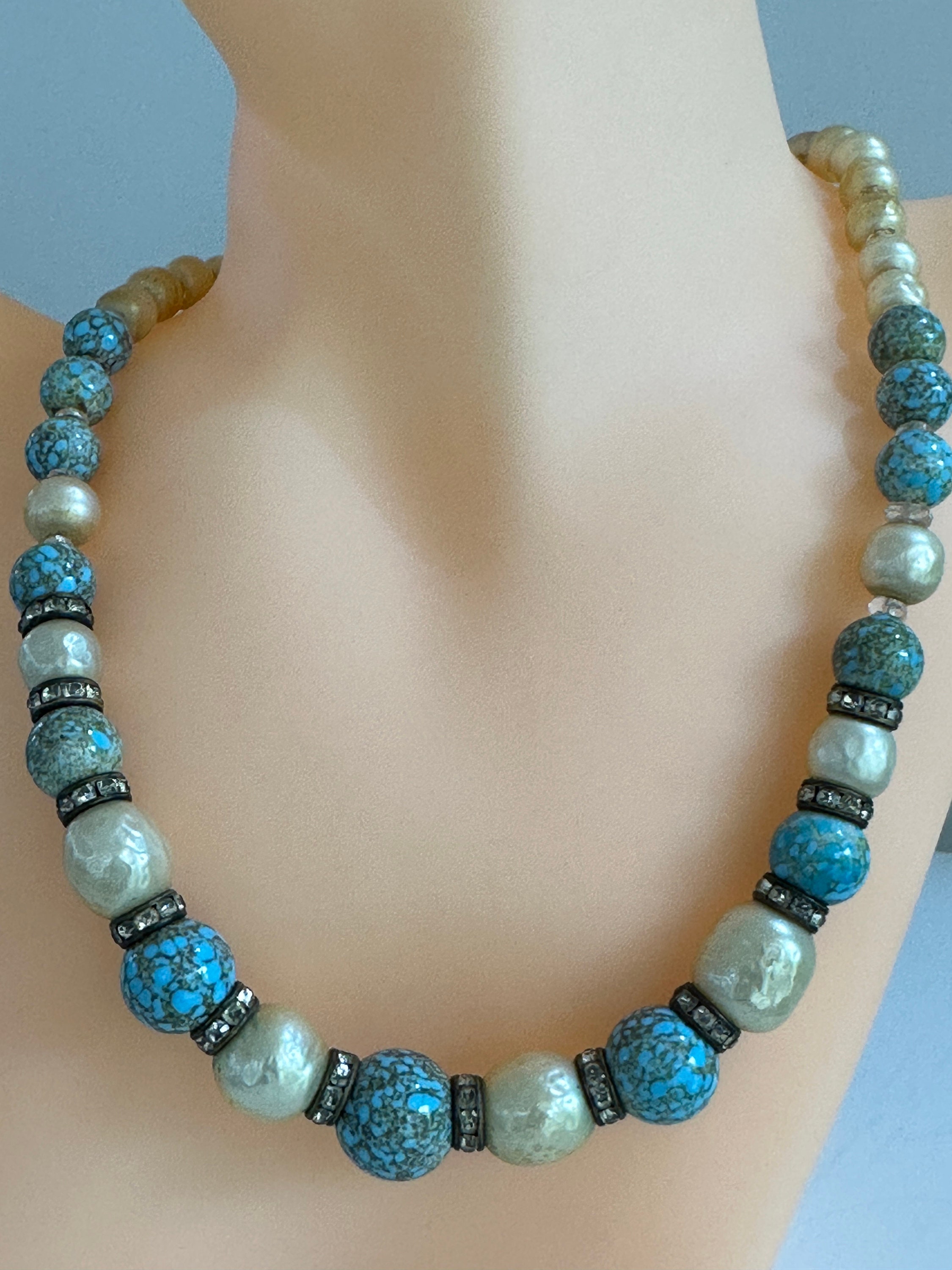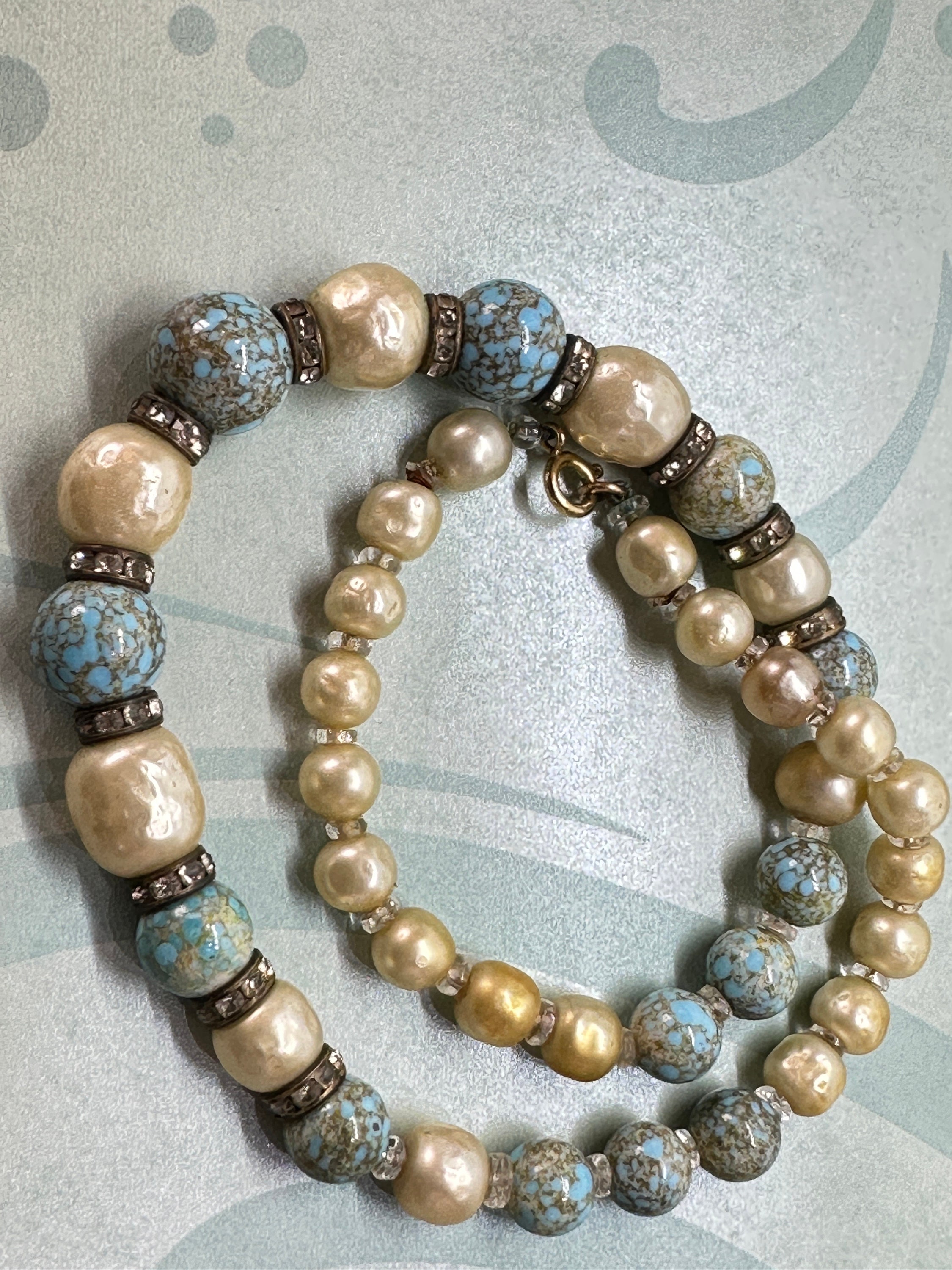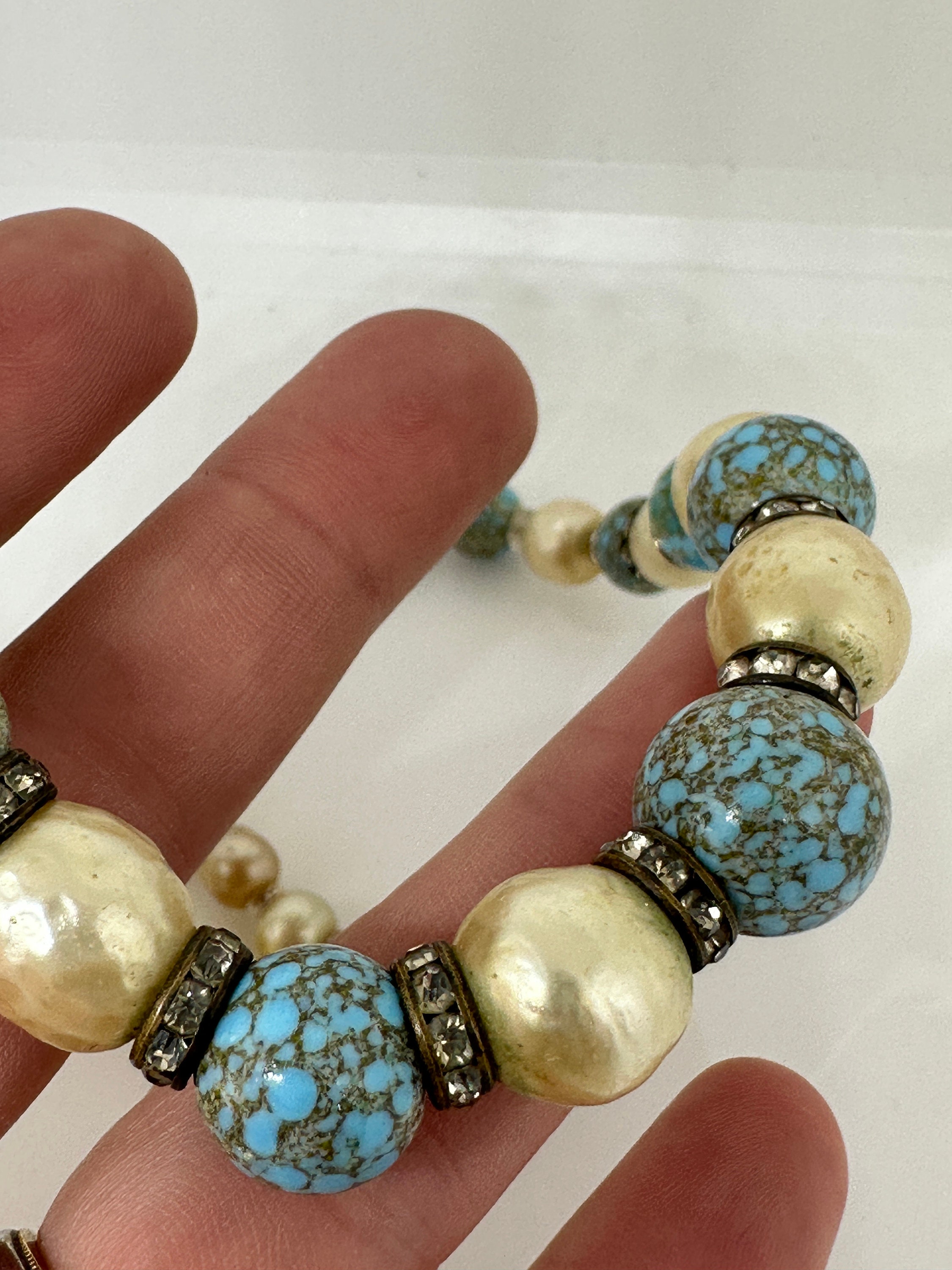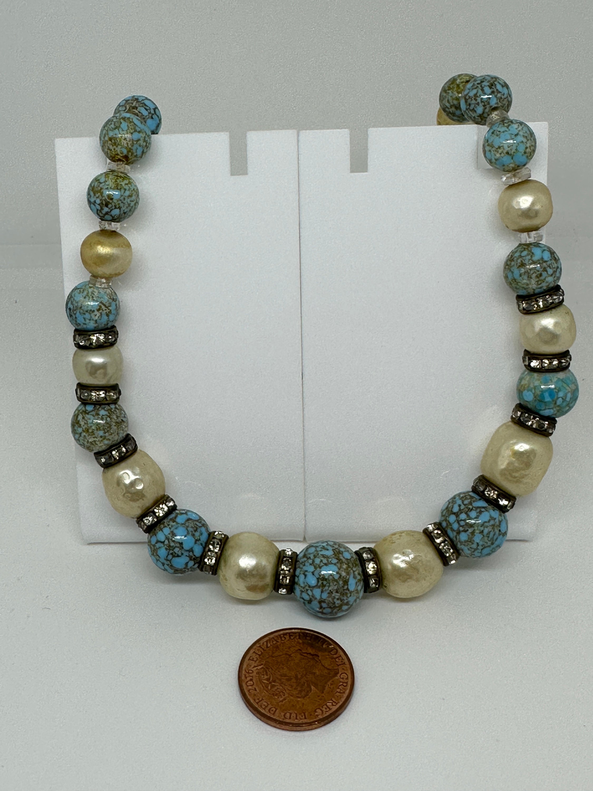 Art Deco beaded necklace, comprising of hand knotted Peking glass beads, simulated glass pearls and rhinestone rondelle spacer beads. It measures approx 17” in length and the largest bead measures 1cm. It is in great condition with no damage. Please ask for any other details.