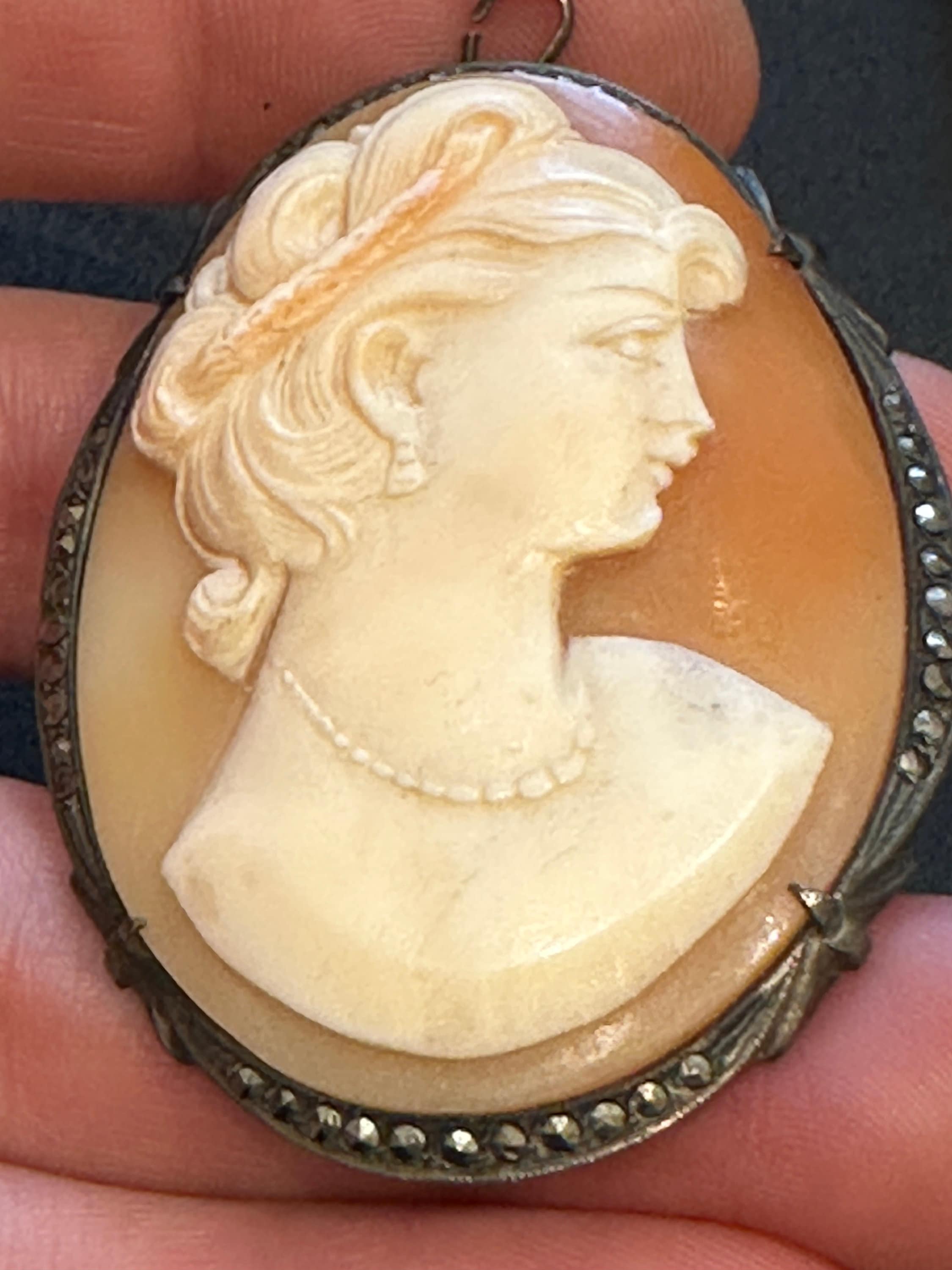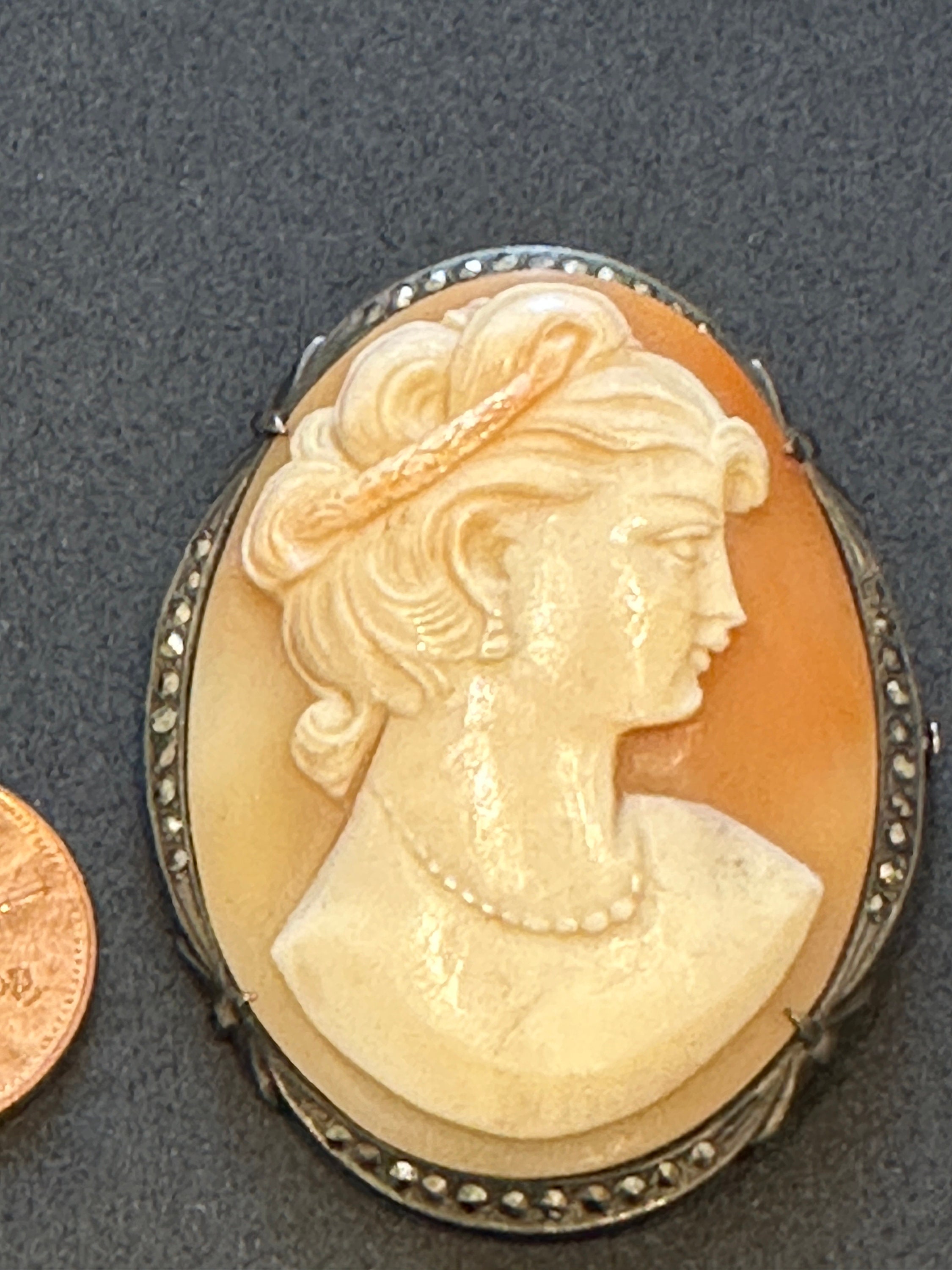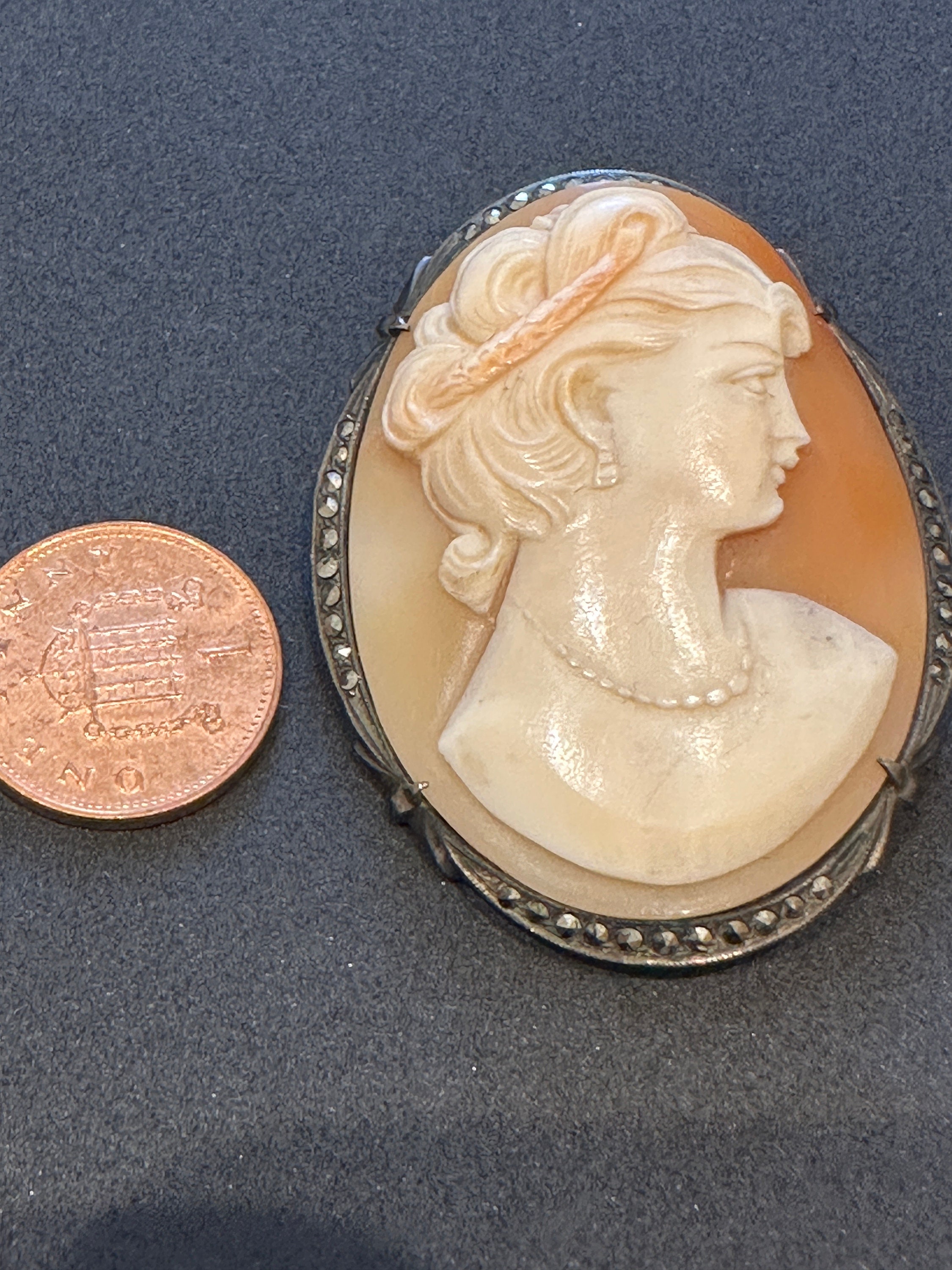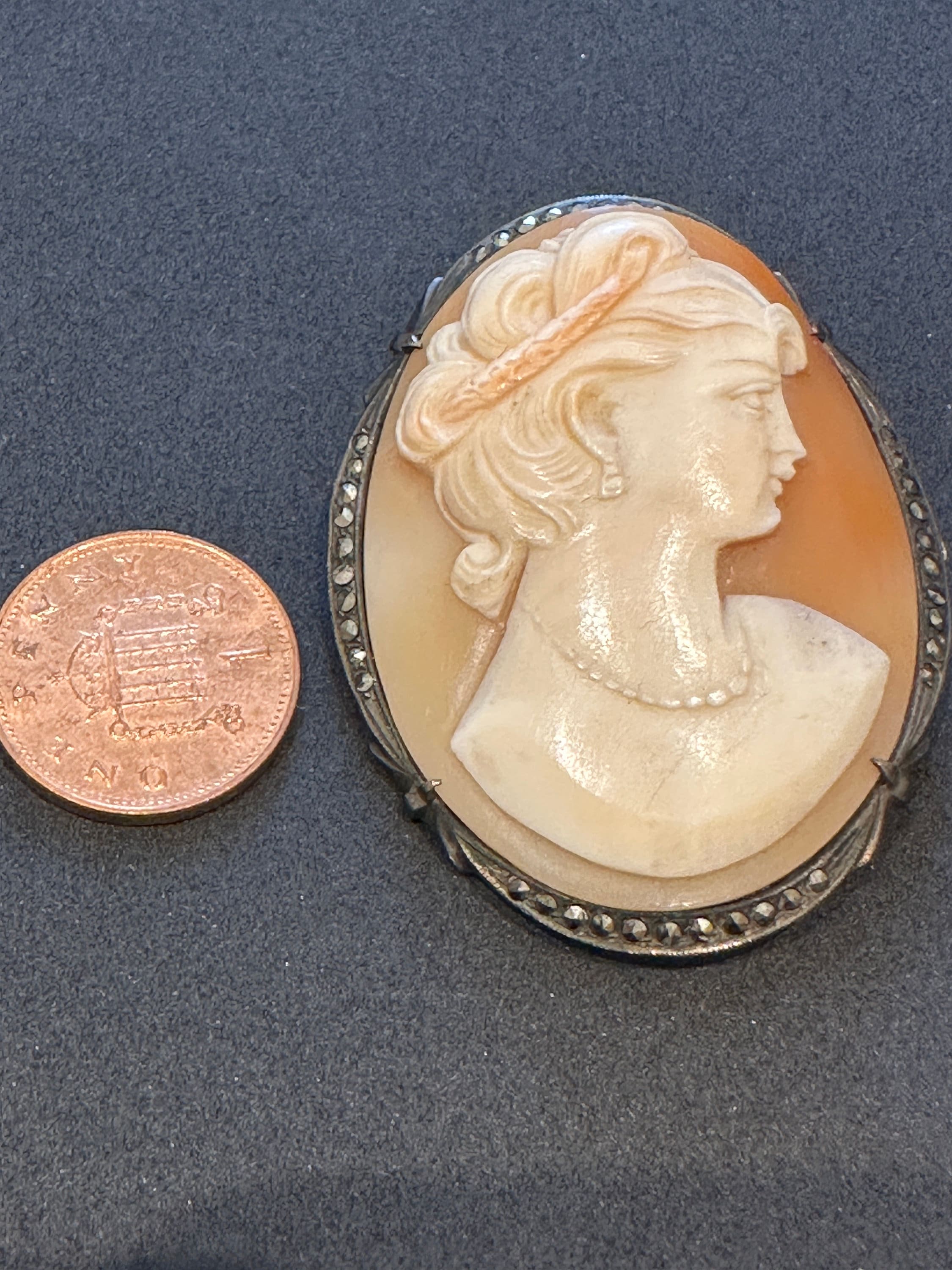 Sterling Silver (800) framed carved shell cameo pin adorned with Marcasites. Extremely well crafted and marked 800 for continental silver. It measures 5cm by 4cm. This can be worn either as a pendant or a brooch. It remains in excellent vintage condition with no damage.