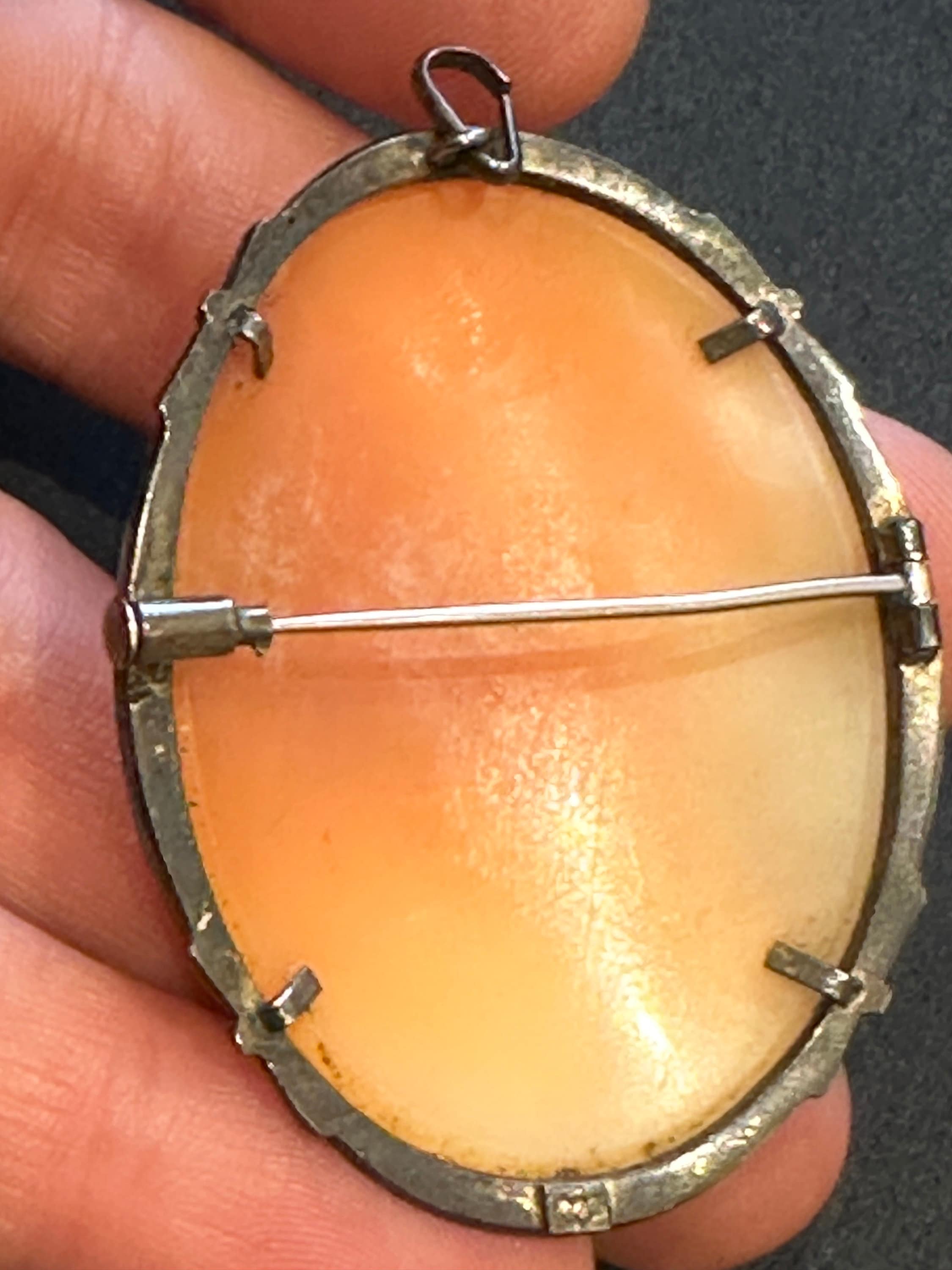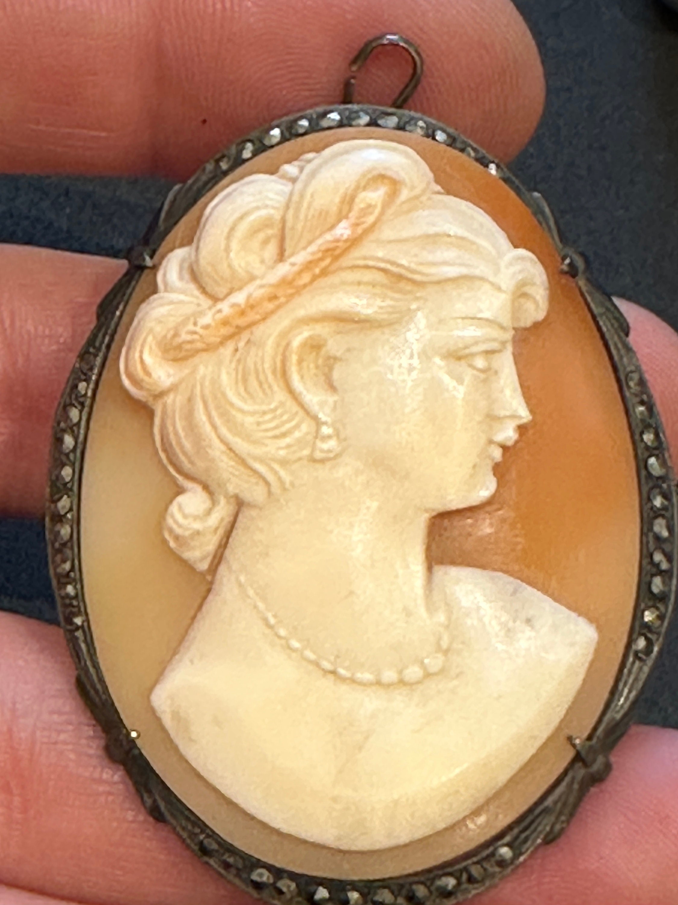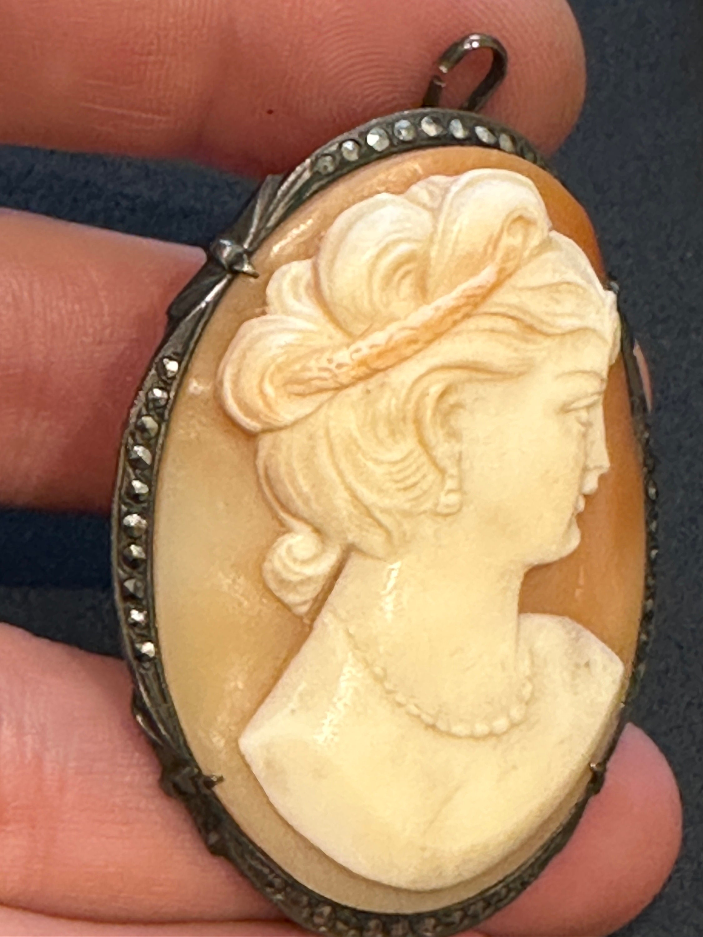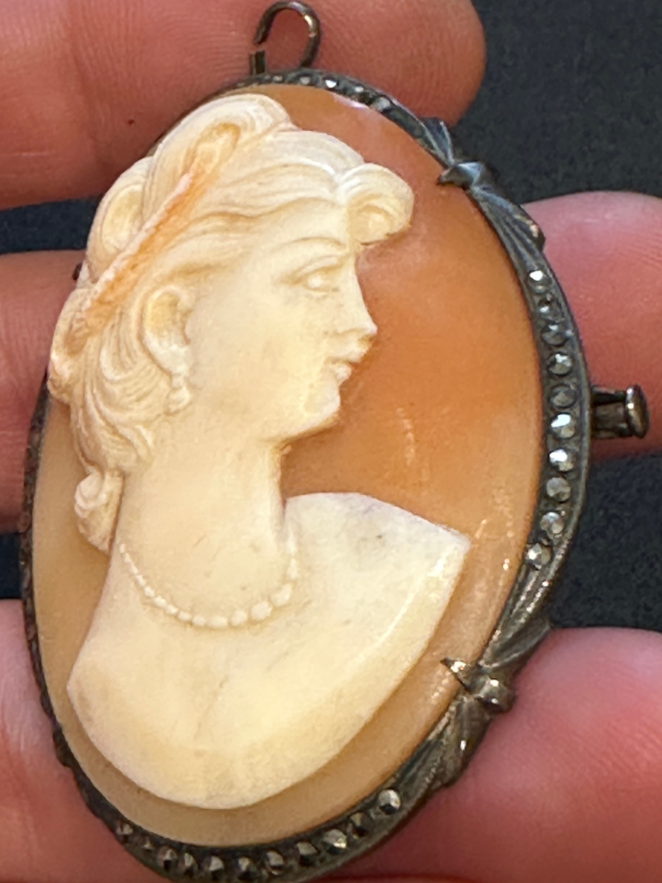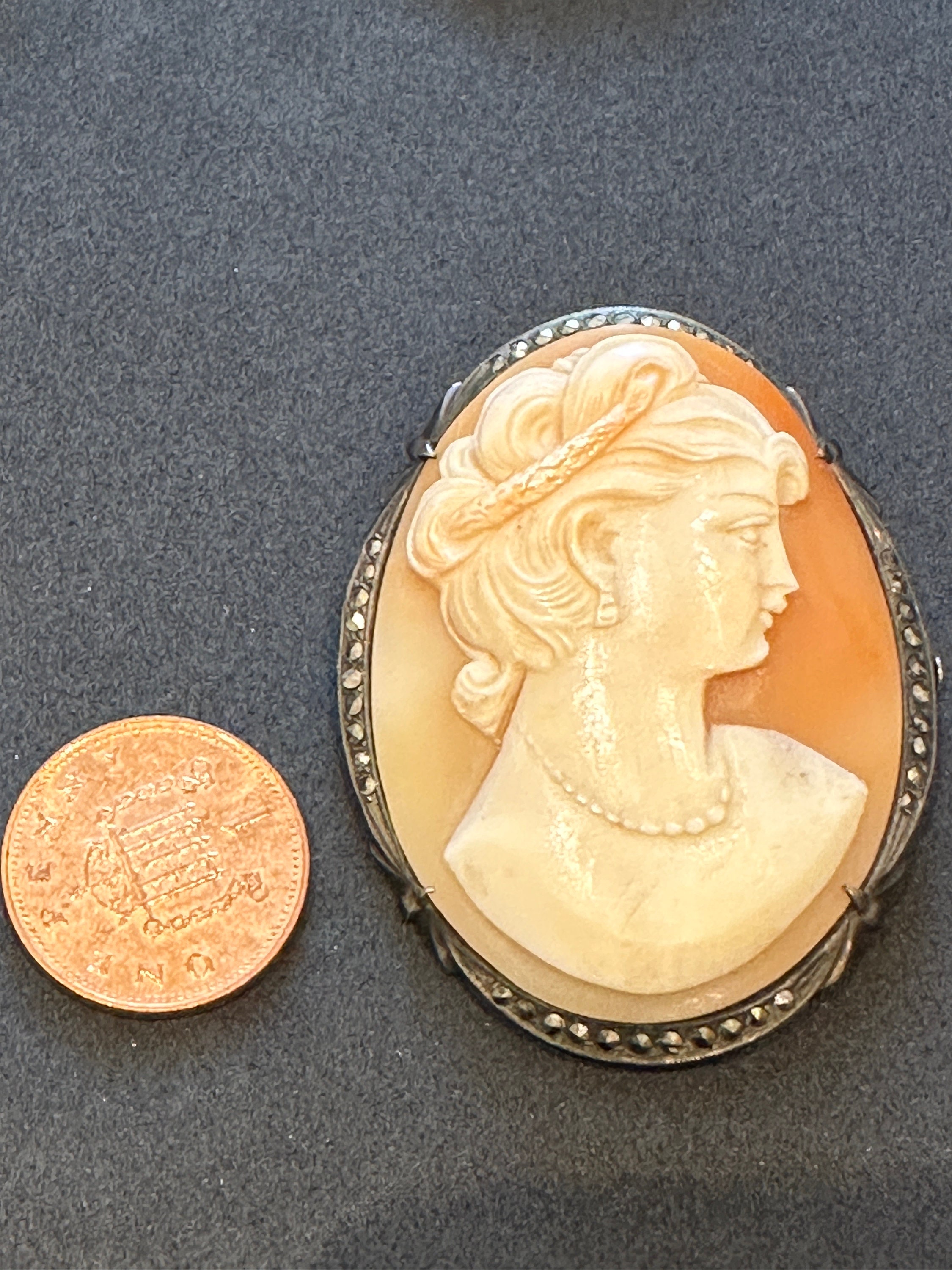 Sterling Silver (800) framed carved shell cameo pin adorned with Marcasites. Extremely well crafted and marked 800 for continental silver. It measures 5cm by 4cm. This can be worn either as a pendant or a brooch. It remains in excellent vintage condition with no damage.