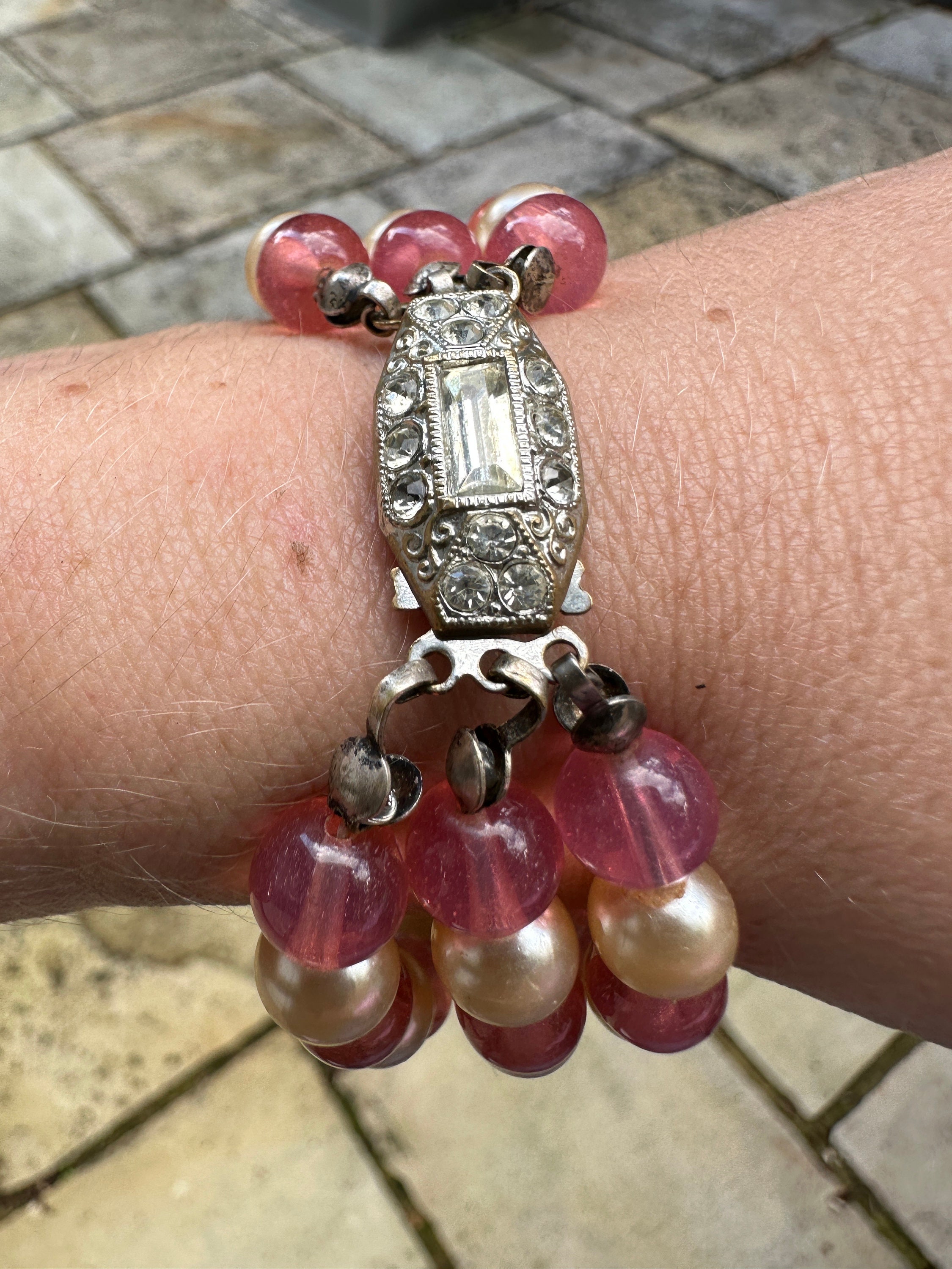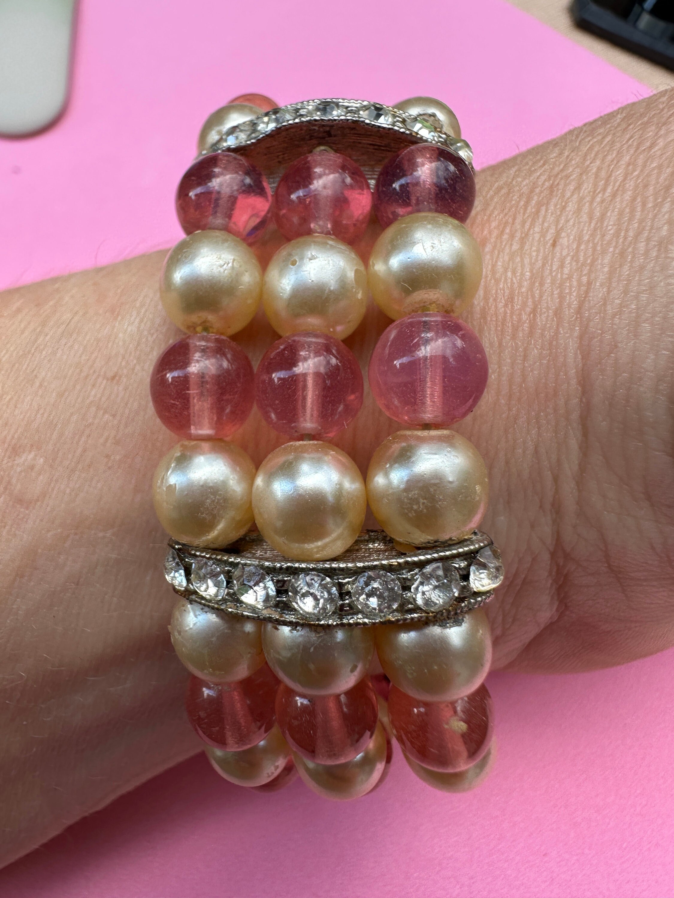 A beautiful vintage rhinestone bracelet with simulated glass pearls and pink glass beads. This is very much a statement piece and would complement any outfit. It is in great condition and is 1inch wide and 7.5 inches in length. This is a beautiful bracelet and remains in great condition. There are a couple of scratches to the pearls but on the inside so not noticeable.