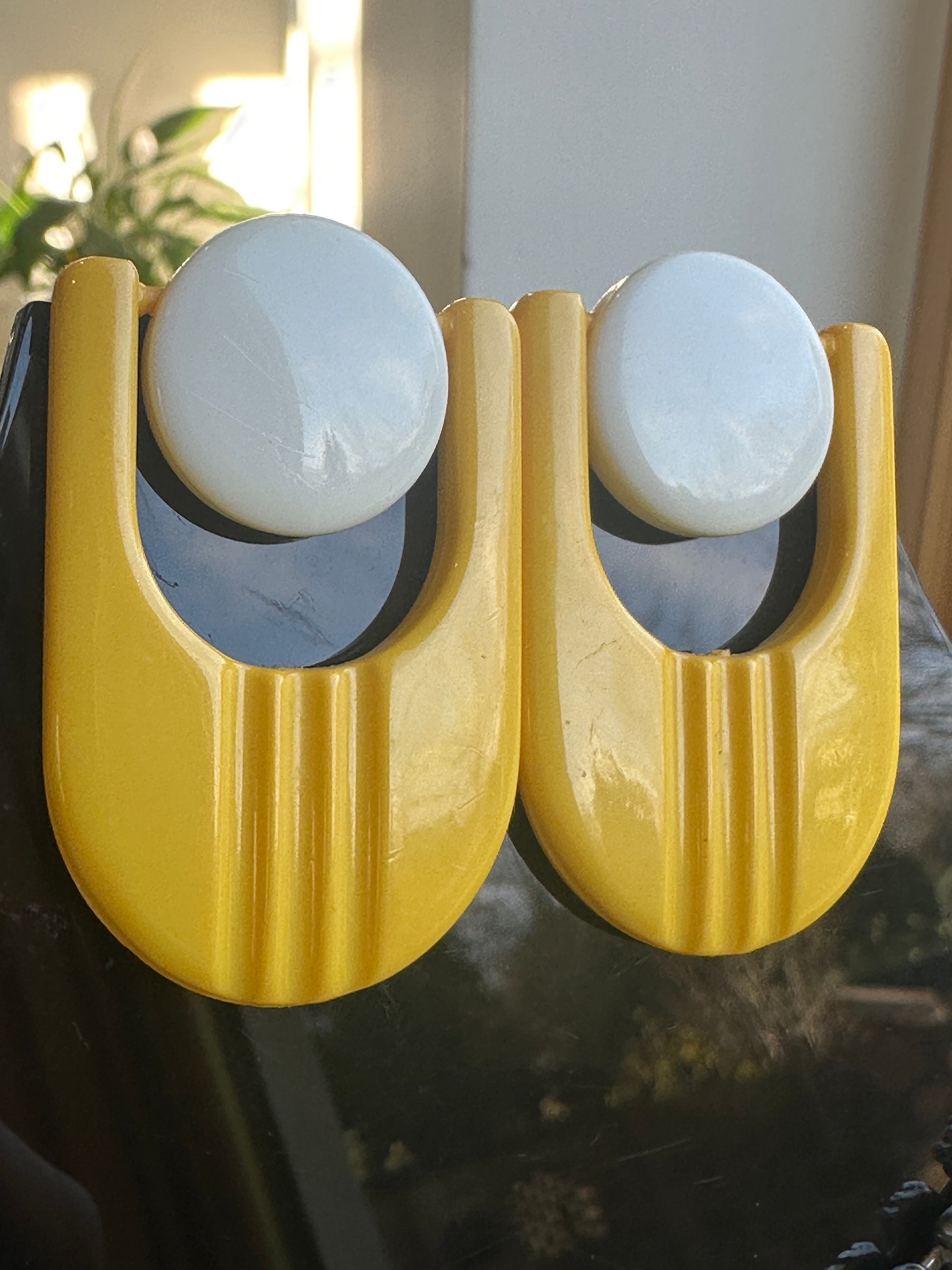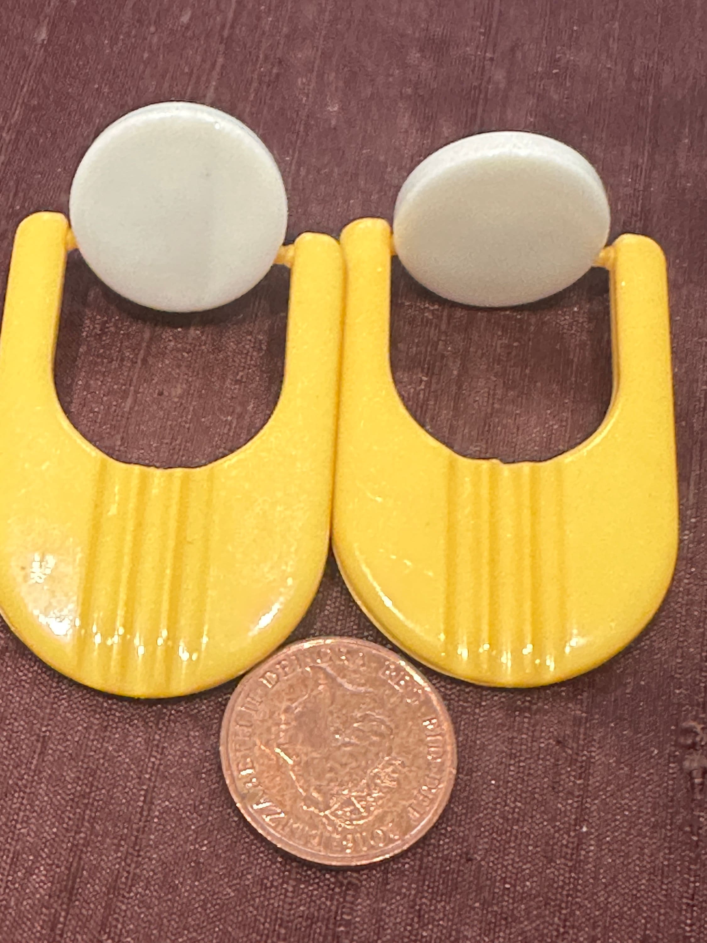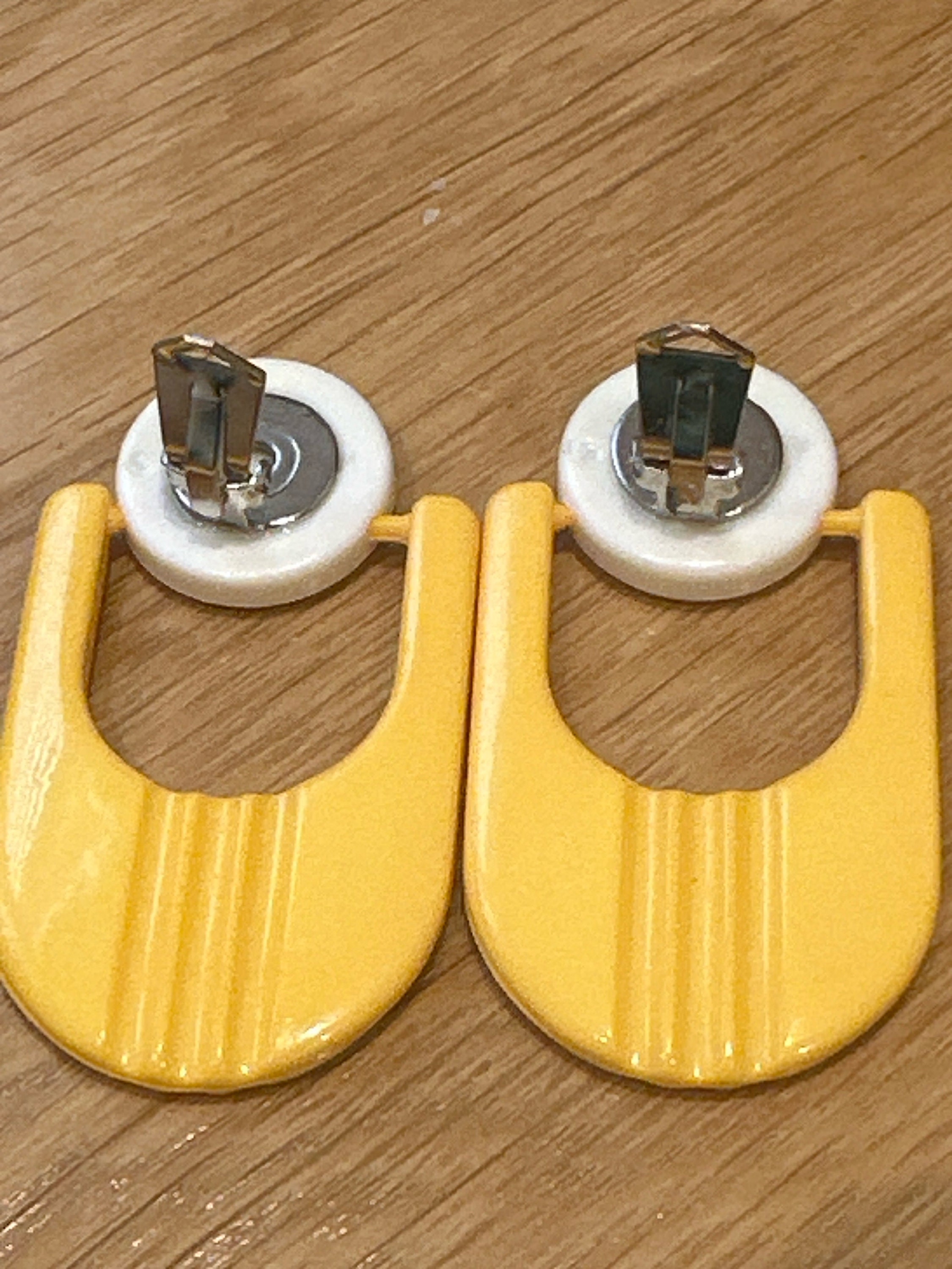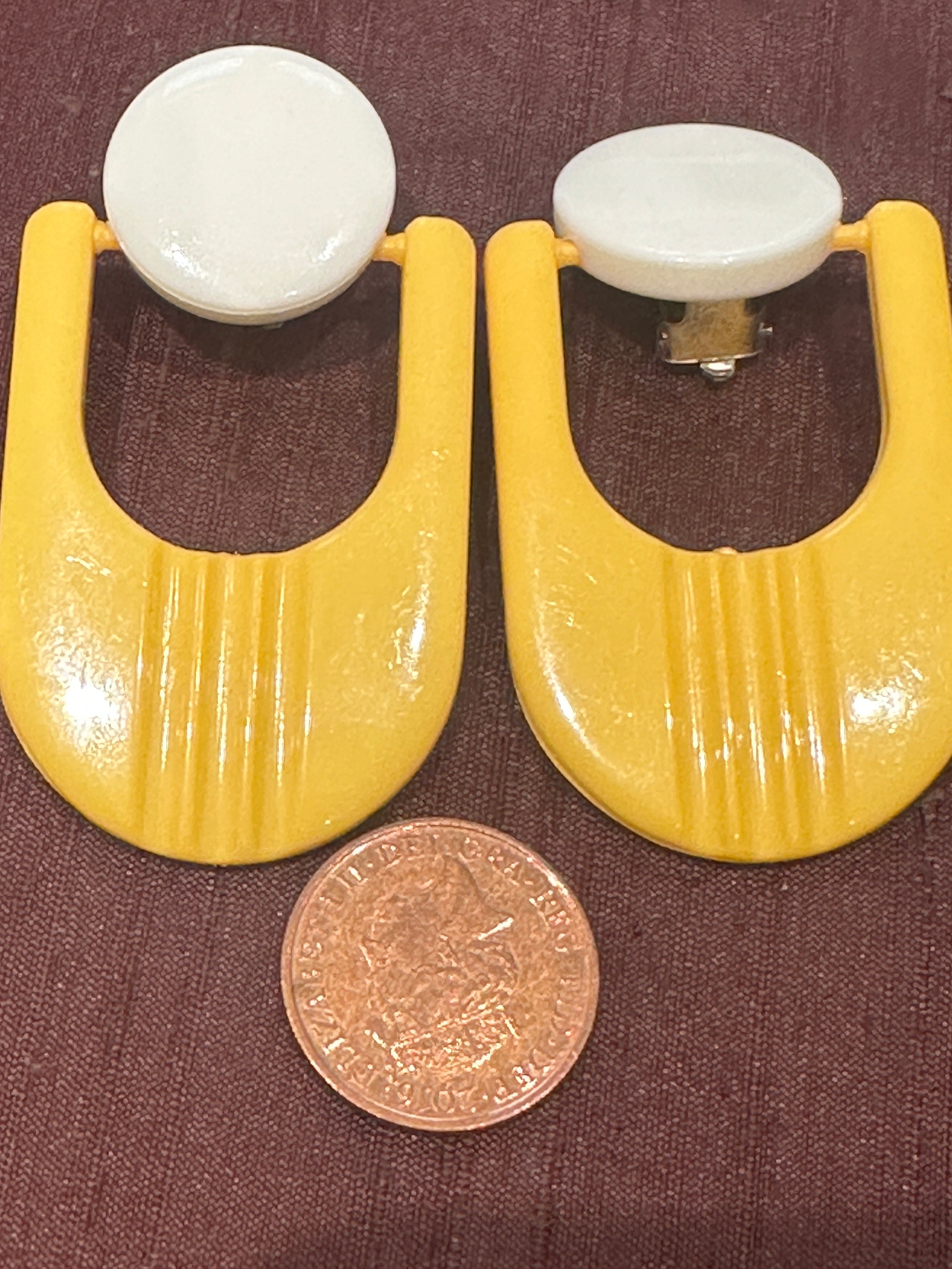 Fantastic Futuristic atomic stylised yellow and white oversized 60s style clip on earrings. They are articulated so move and aren’t fixed in. These are 1960s in style but we’re probably made in 1980s. They measure 6cm in length and remain in excellen condition.