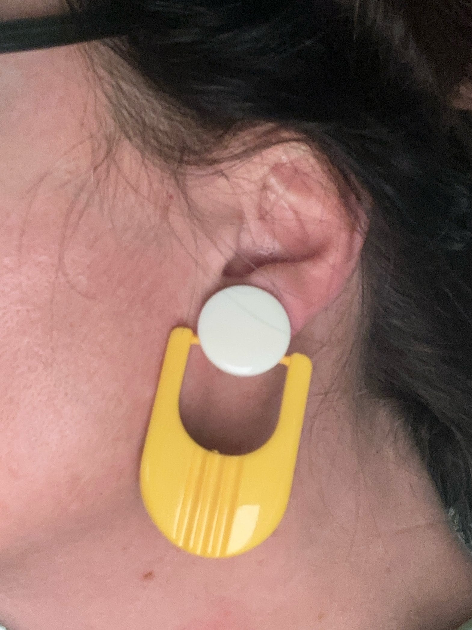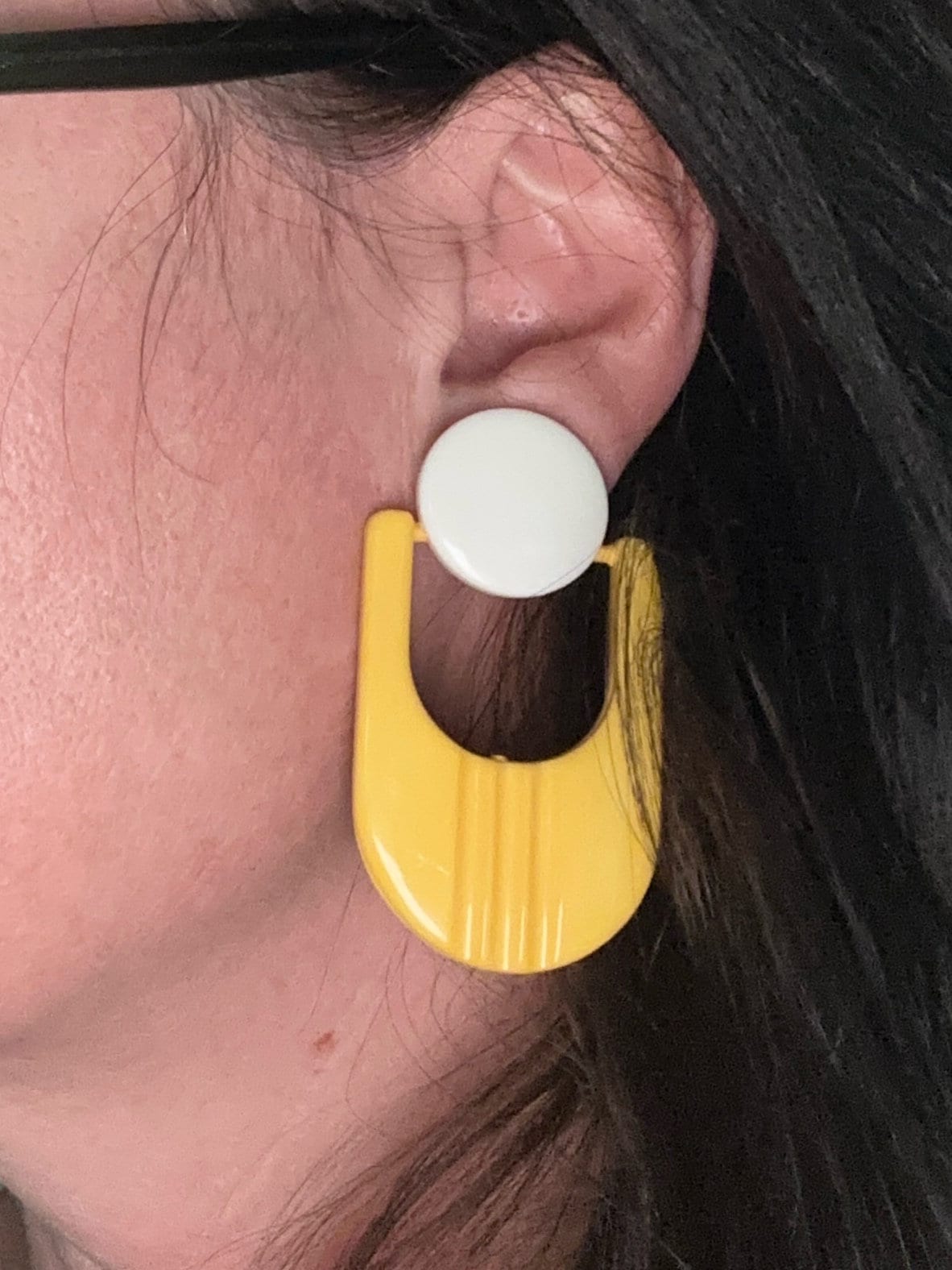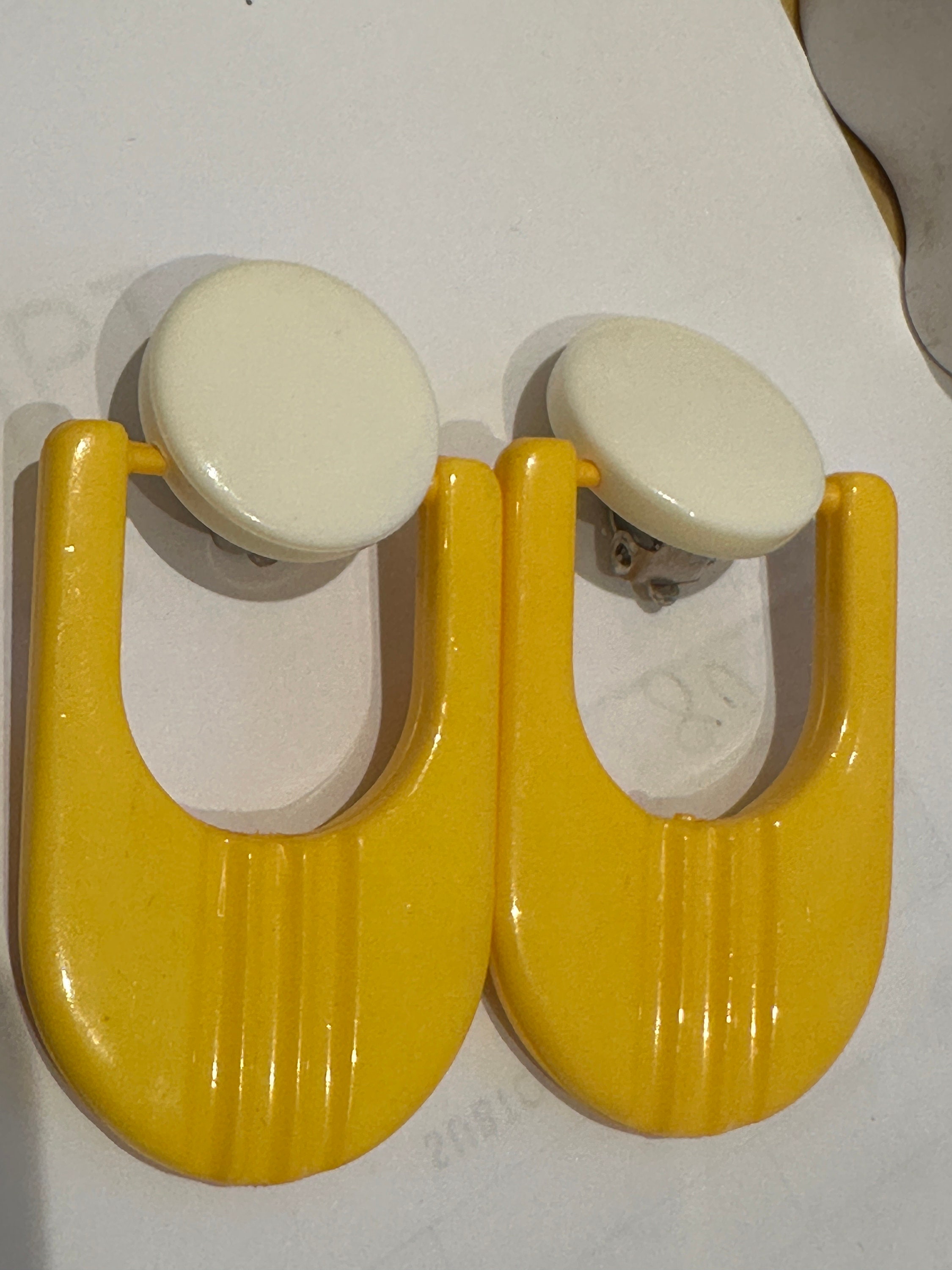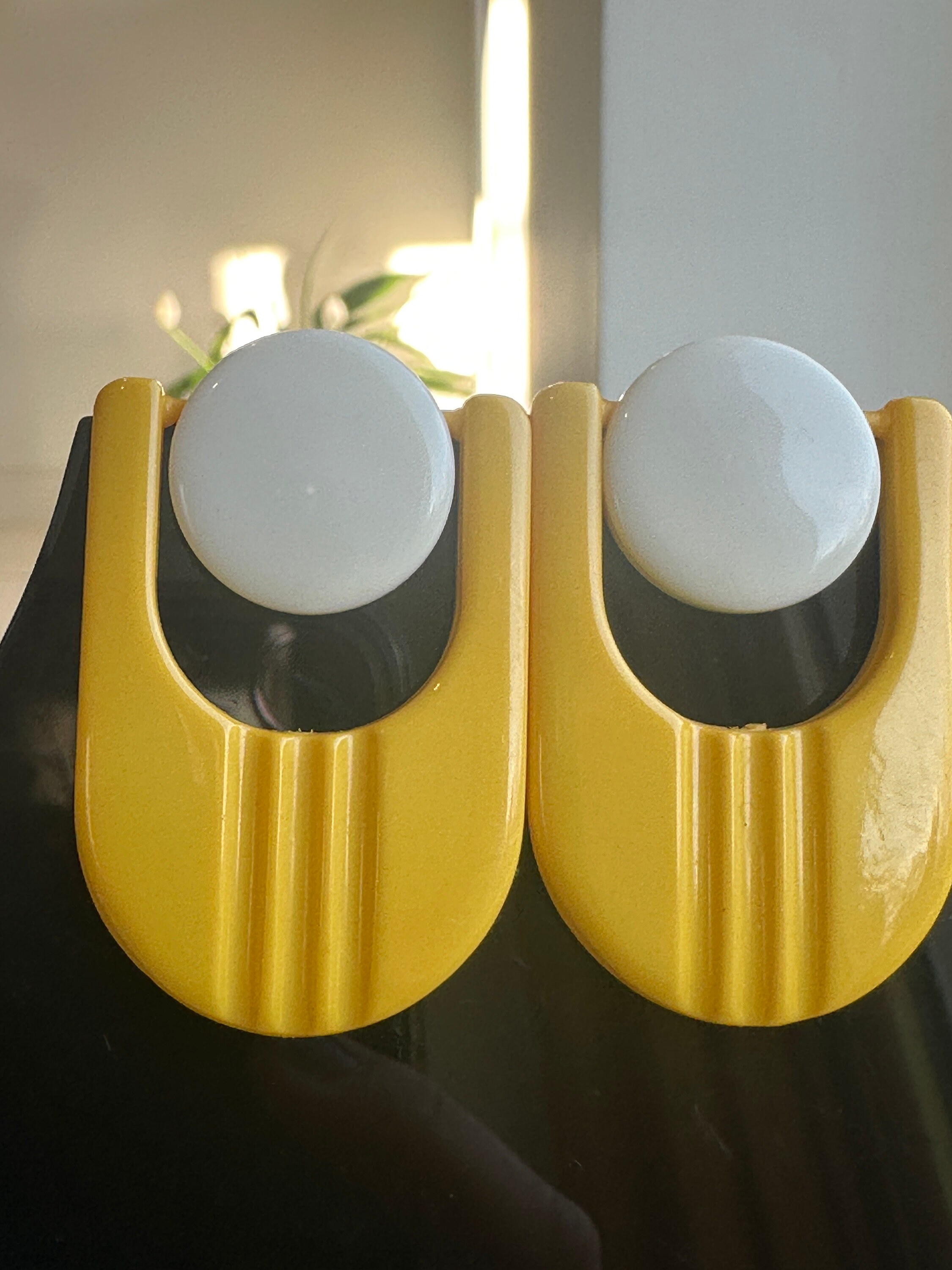 Fantastic Futuristic atomic stylised yellow and white oversized 60s style clip on earrings. They are articulated so move and aren’t fixed in. These are 1960s in style but we’re probably made in 1980s. They measure 6cm in length and remain in excellen condition.