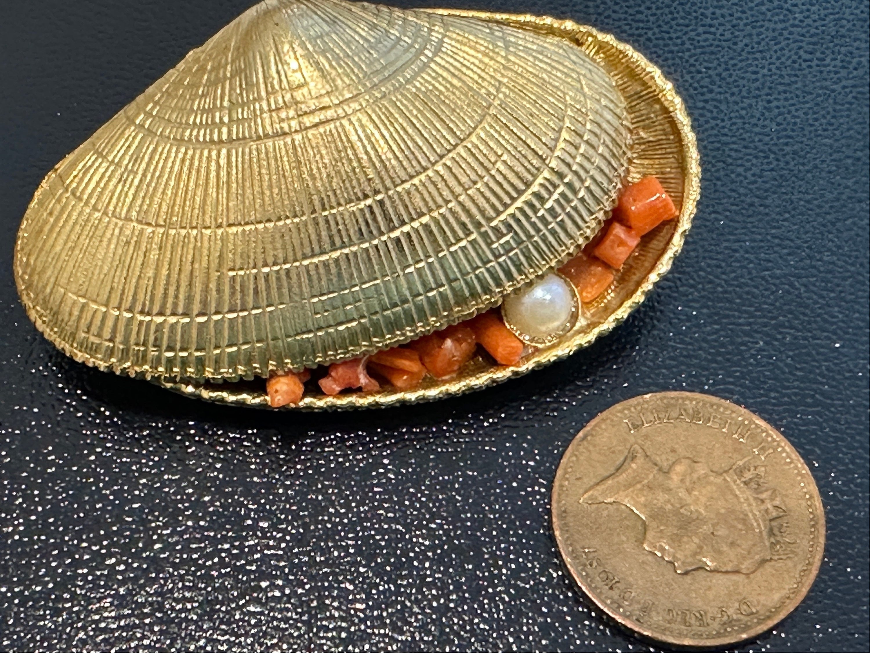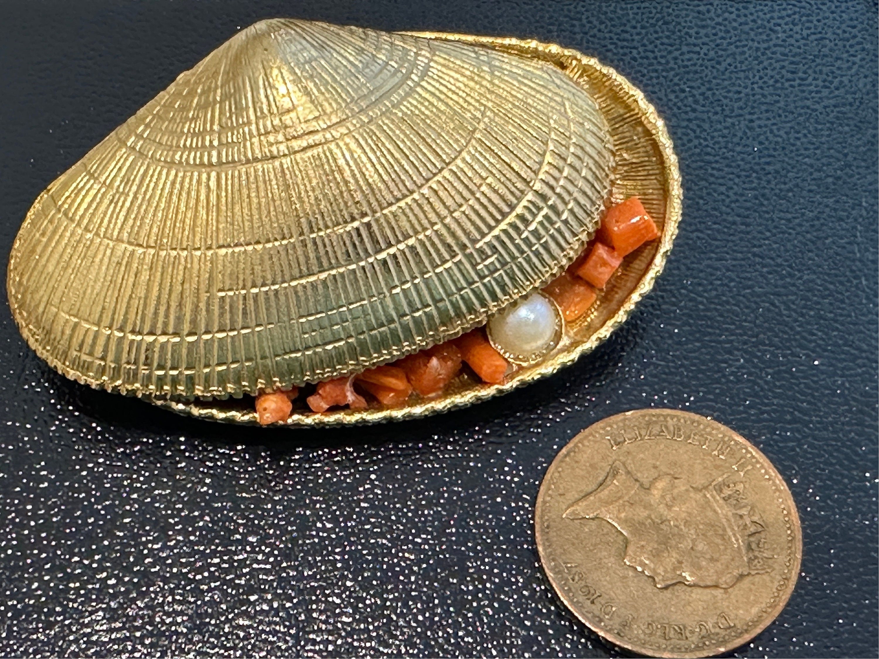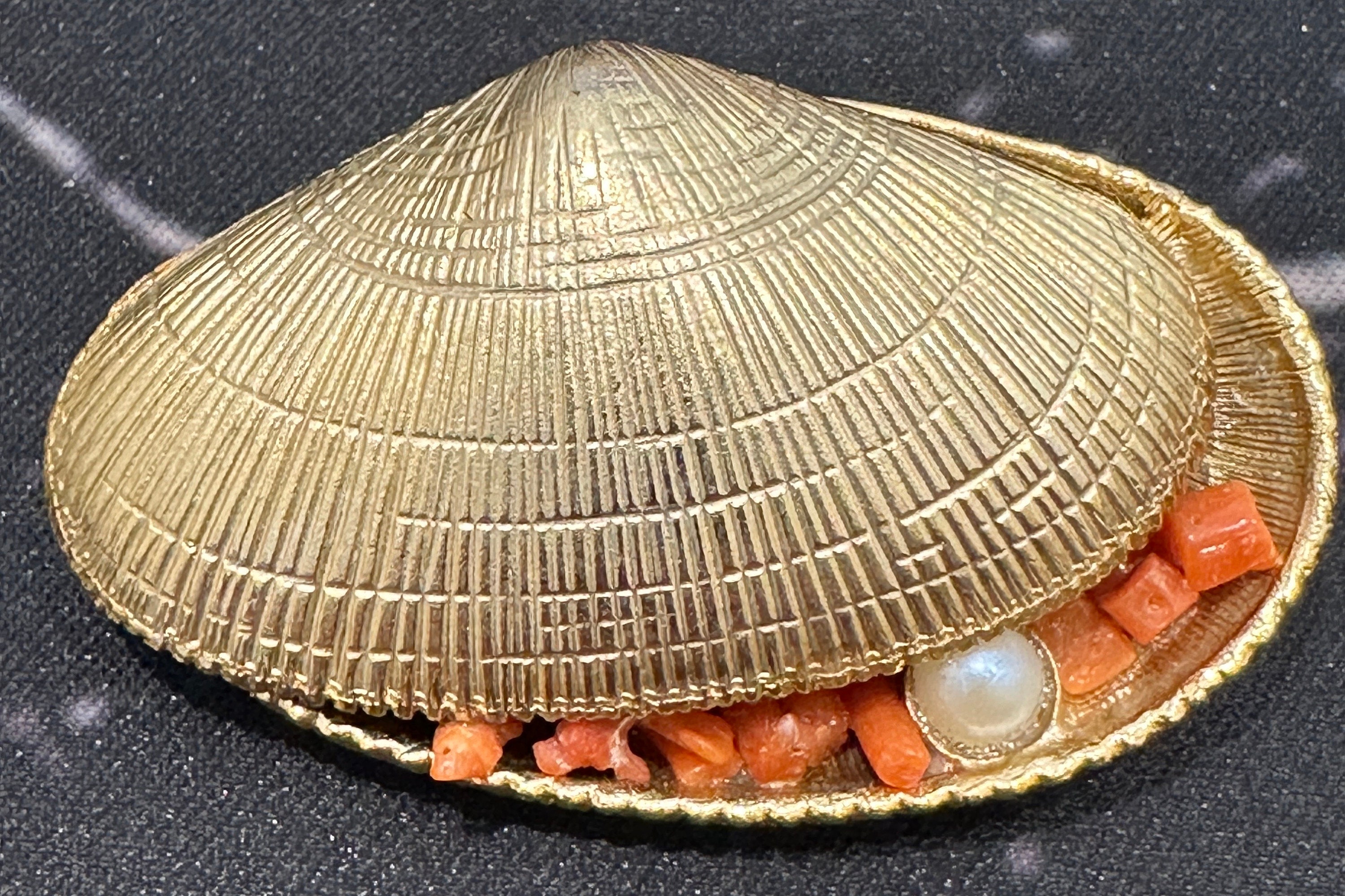Signed Exquisite brooch in the form of an opened clam/ oyster shell. It measures 5cm in length by 3cm in width. A very rare piece, I’ve never seen one before.