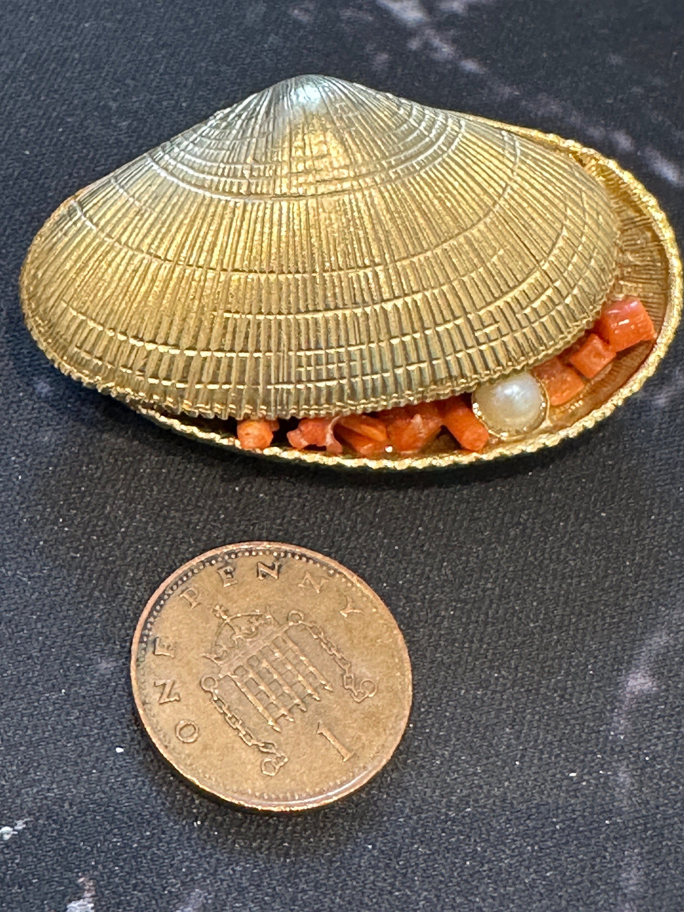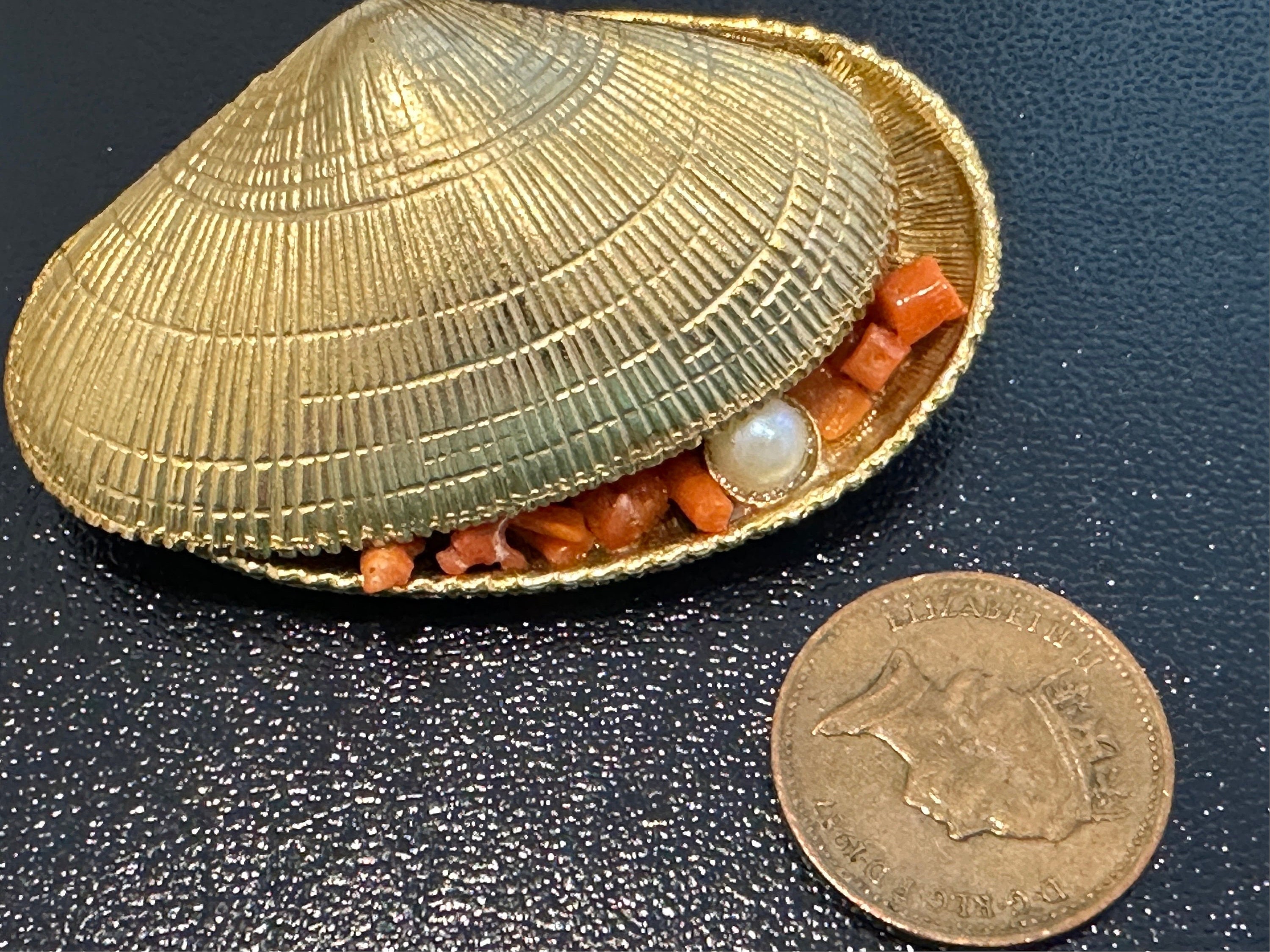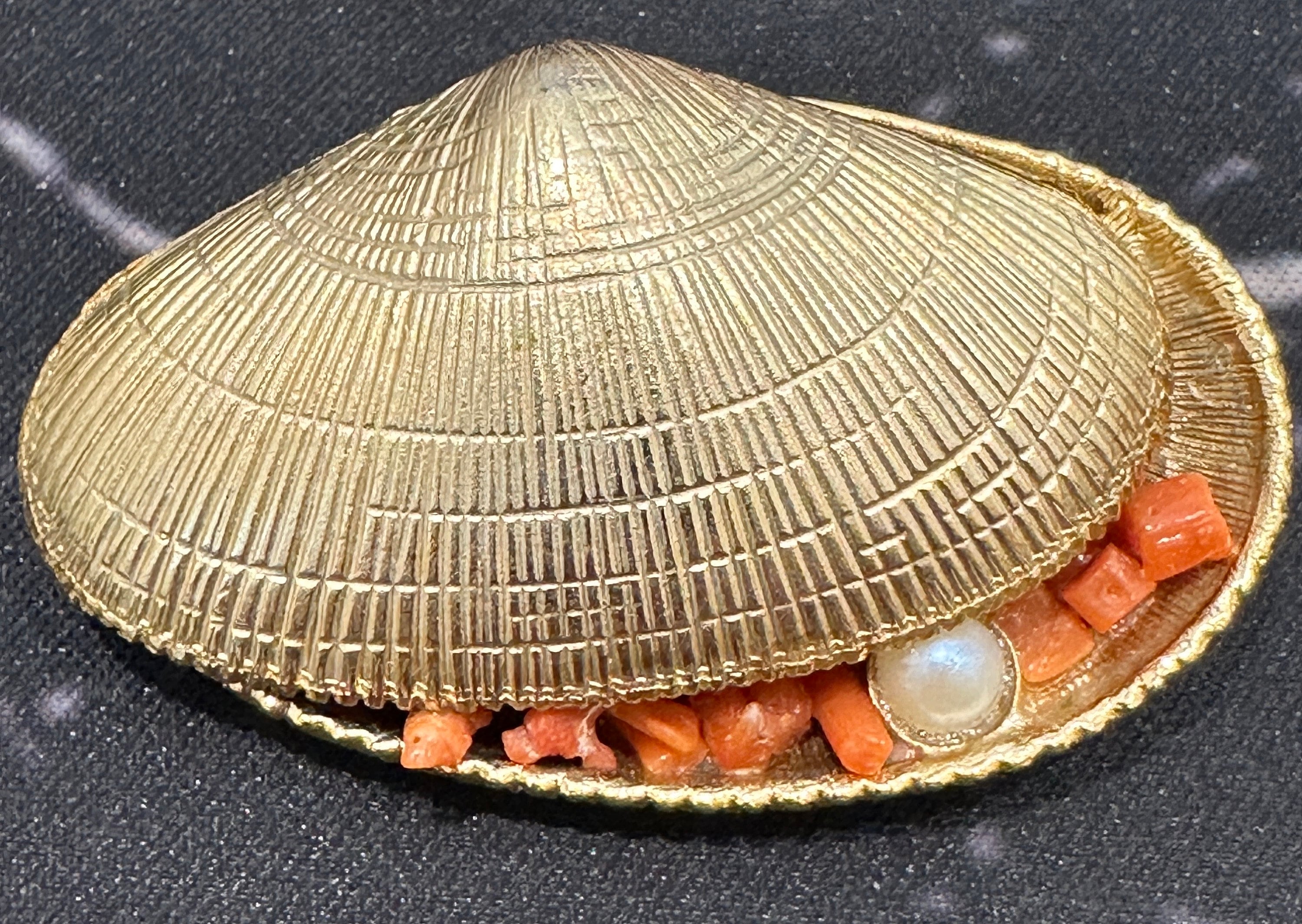 Signed Exquisite brooch in the form of an opened clam/ oyster shell. It measures 5cm in length by 3cm in width. A very rare piece, I’ve never seen one before.
