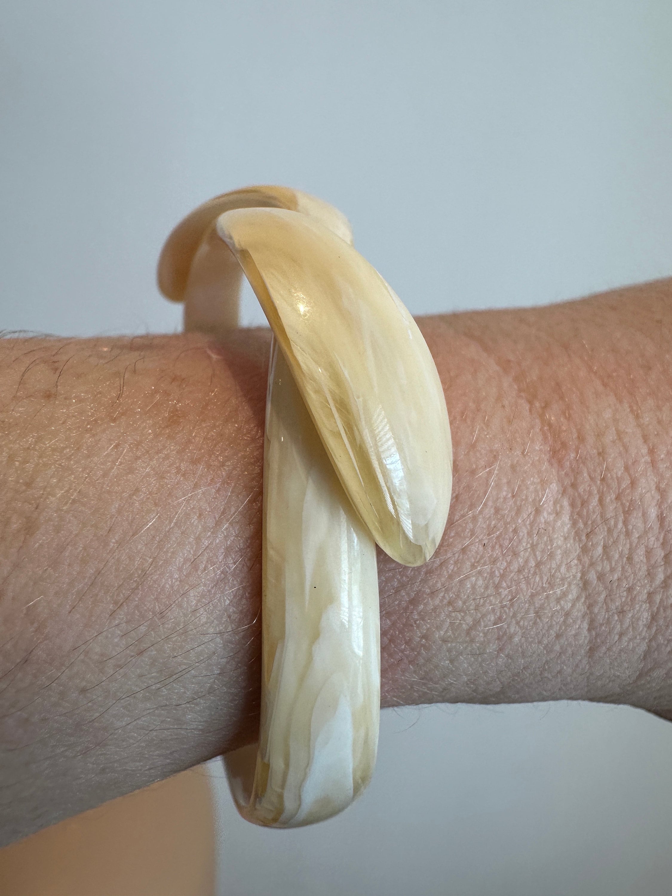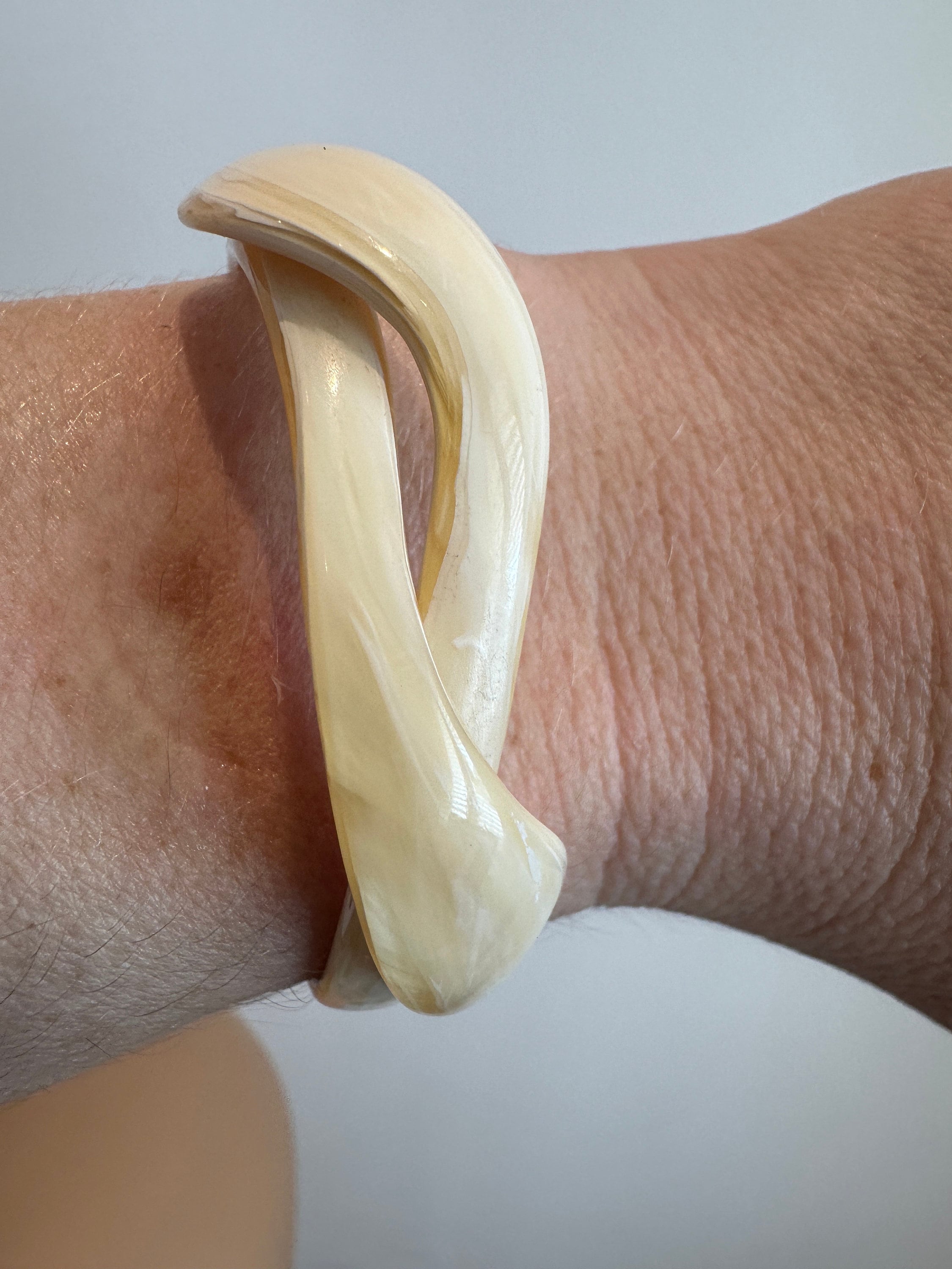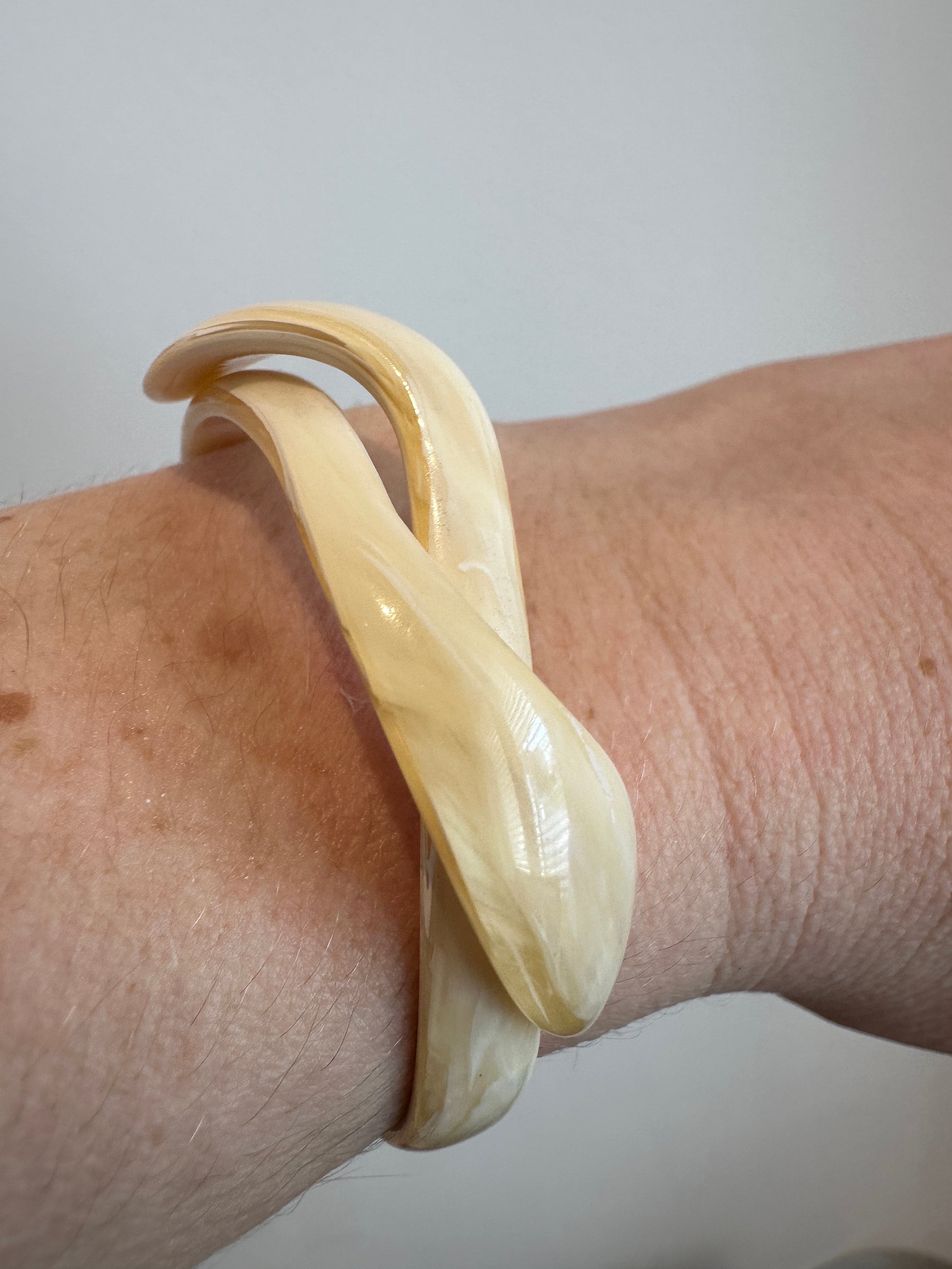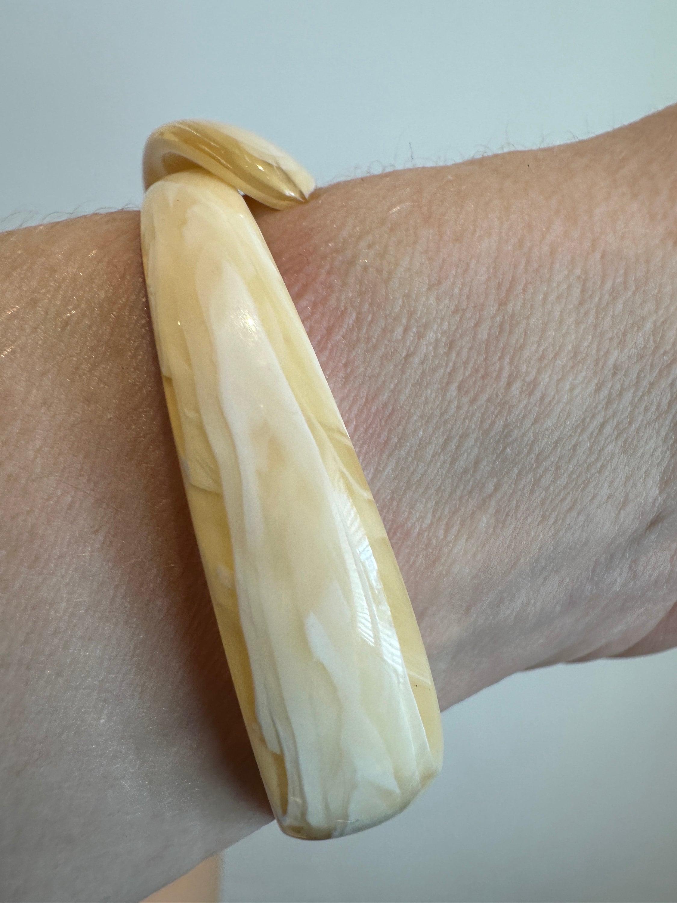 Here is a vintage celluloid snake bracelet by designer Lea Stein. This bracelet has all the associated elements of a vintage piece of her work apart from the signature. It is for a small wrist best 6inches in diameter. The celluloid has little give but opens enough to place in a smaller wrist. Quite tricky to put on.