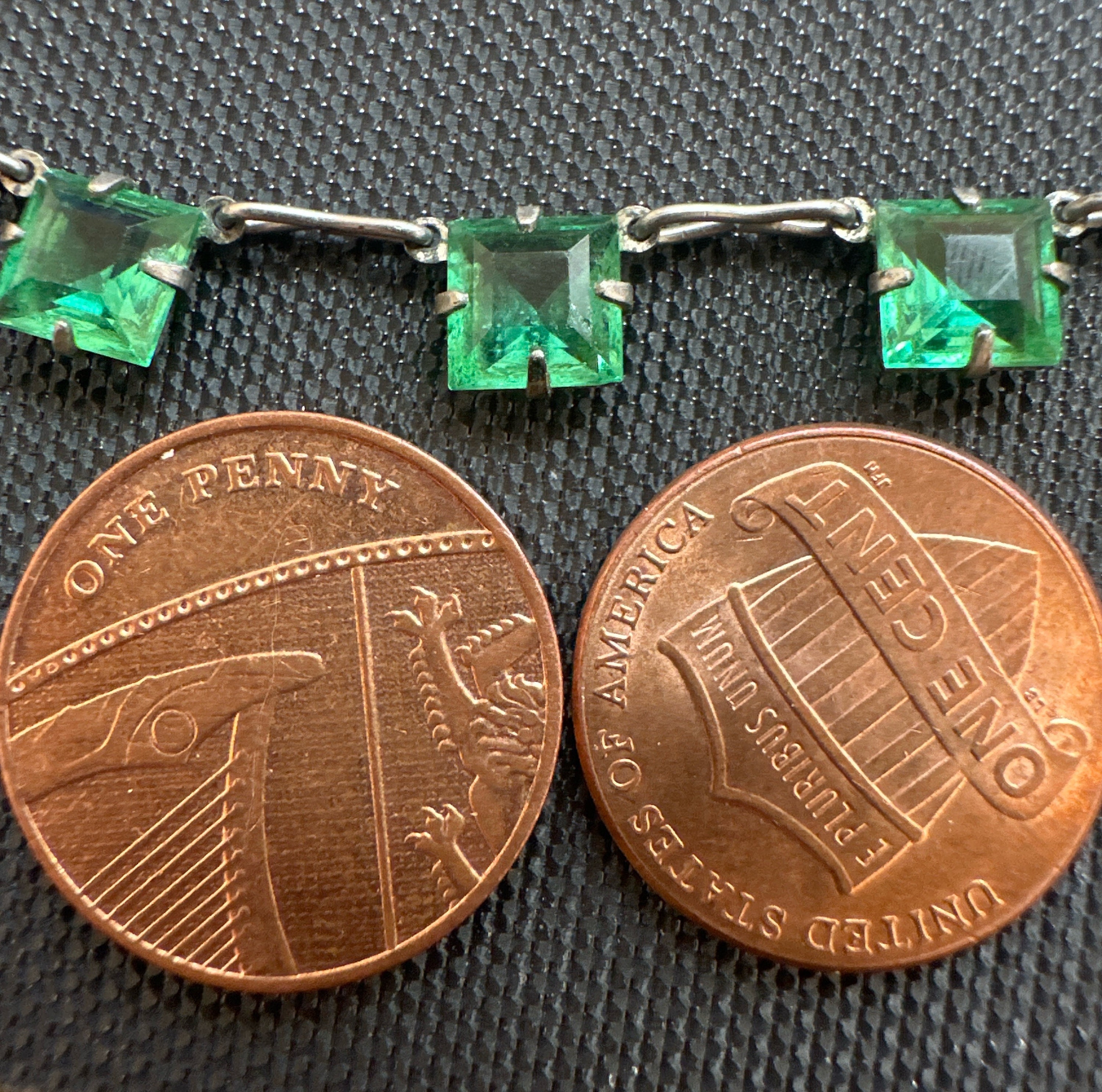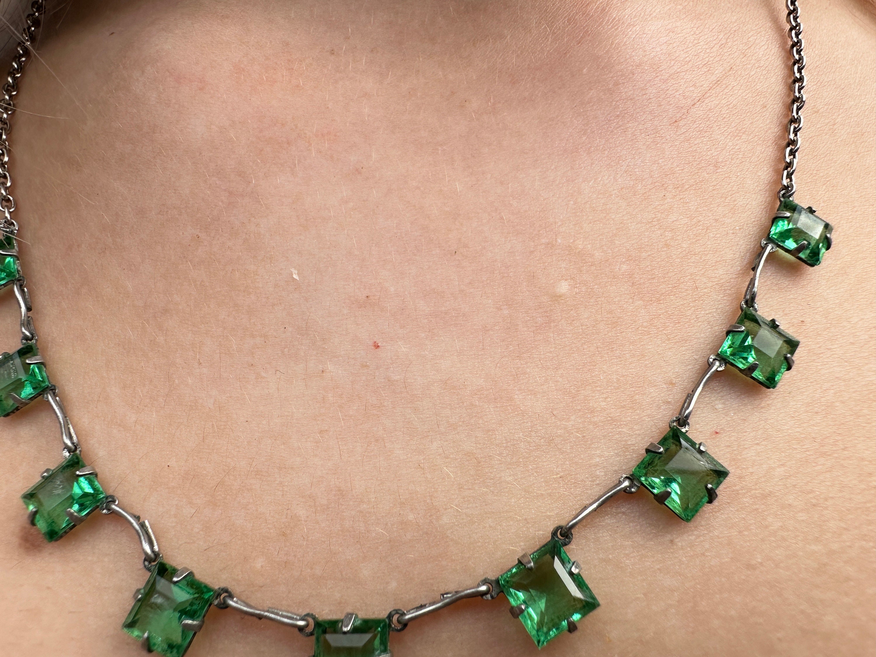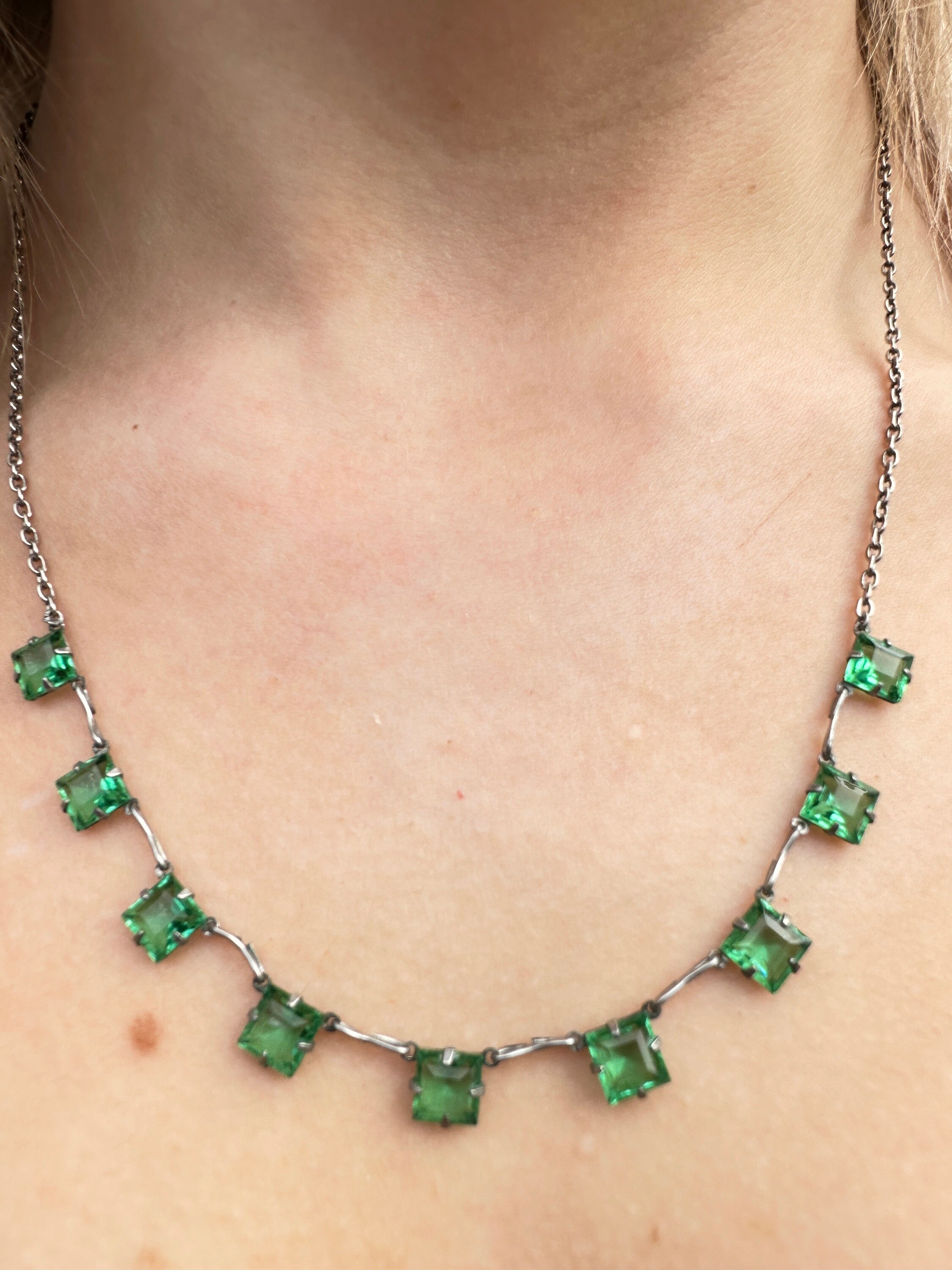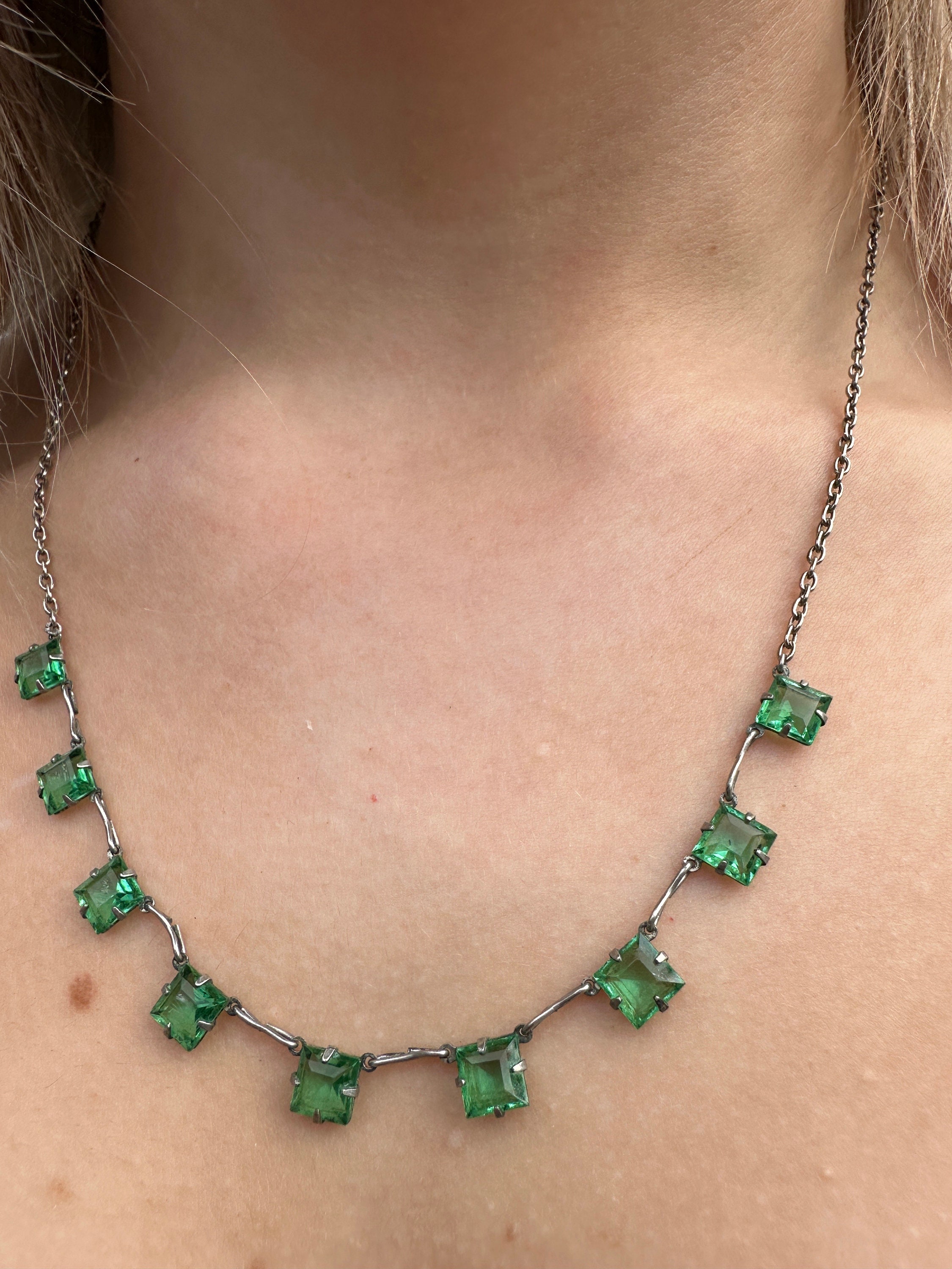 Vintage silver Art Deco peridot colour paste / glass opened back bezel set droplet necklace 20 inches in length. Each stone is approximately 0.6cm in diameter.