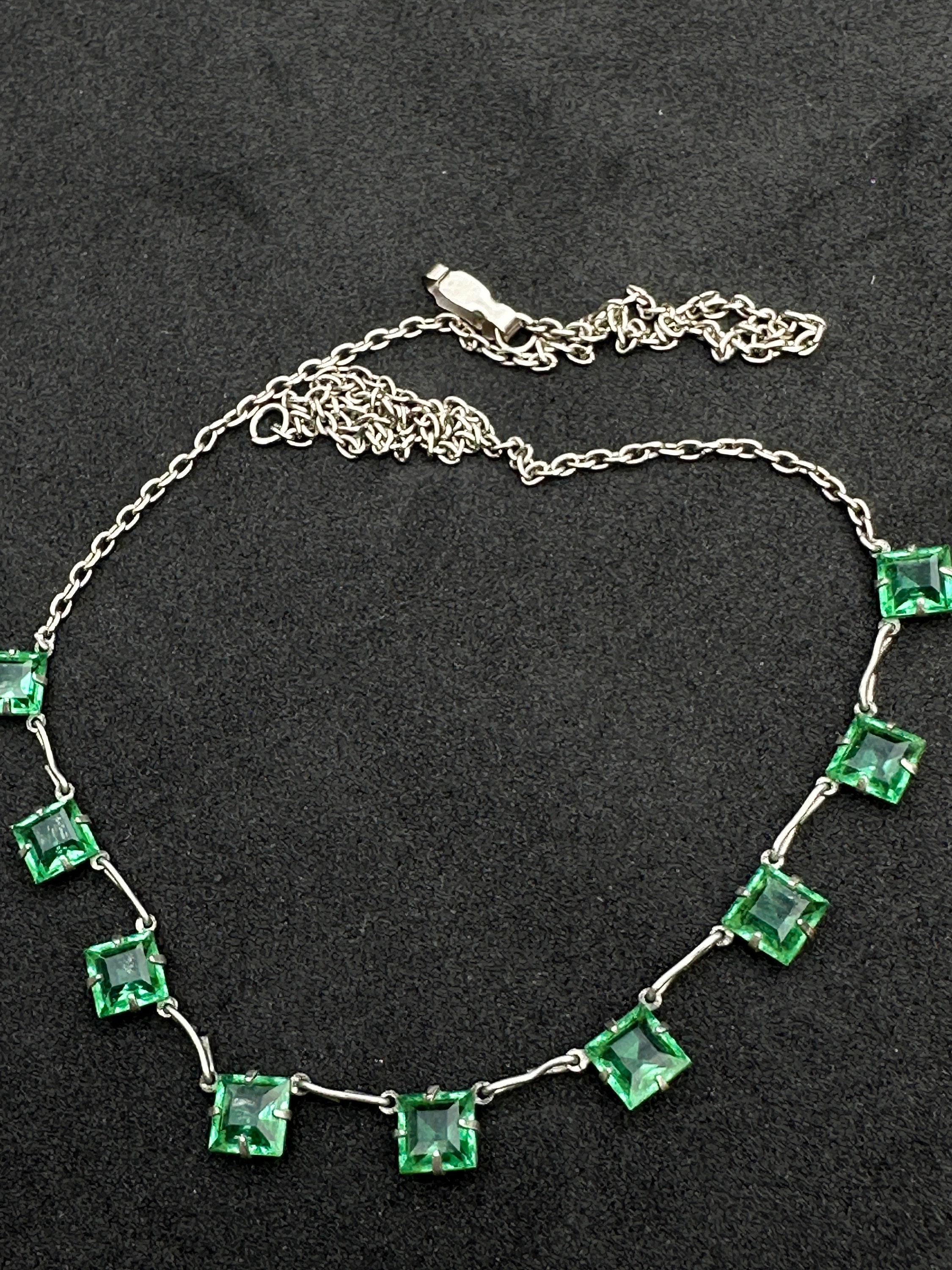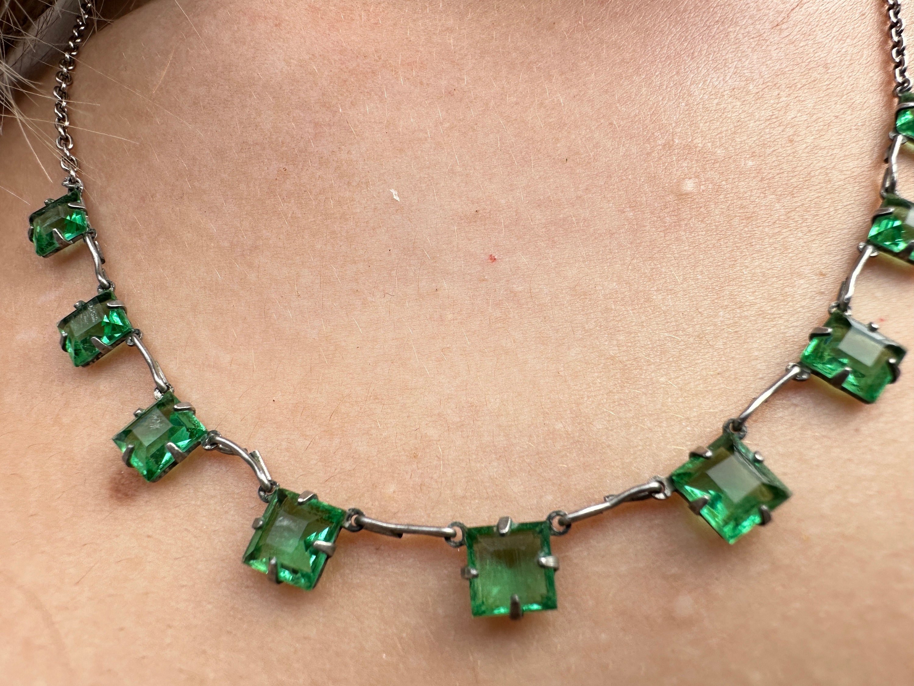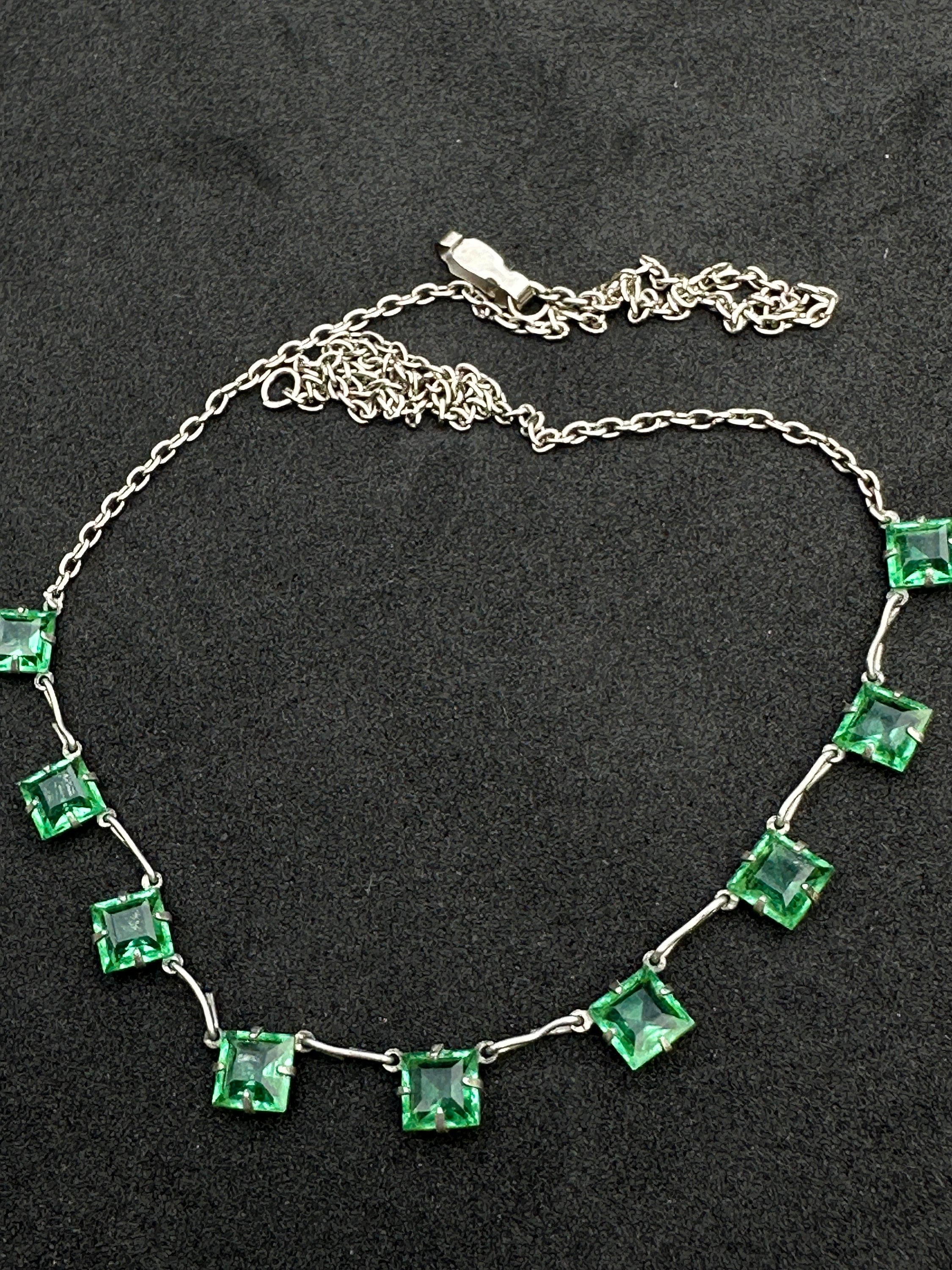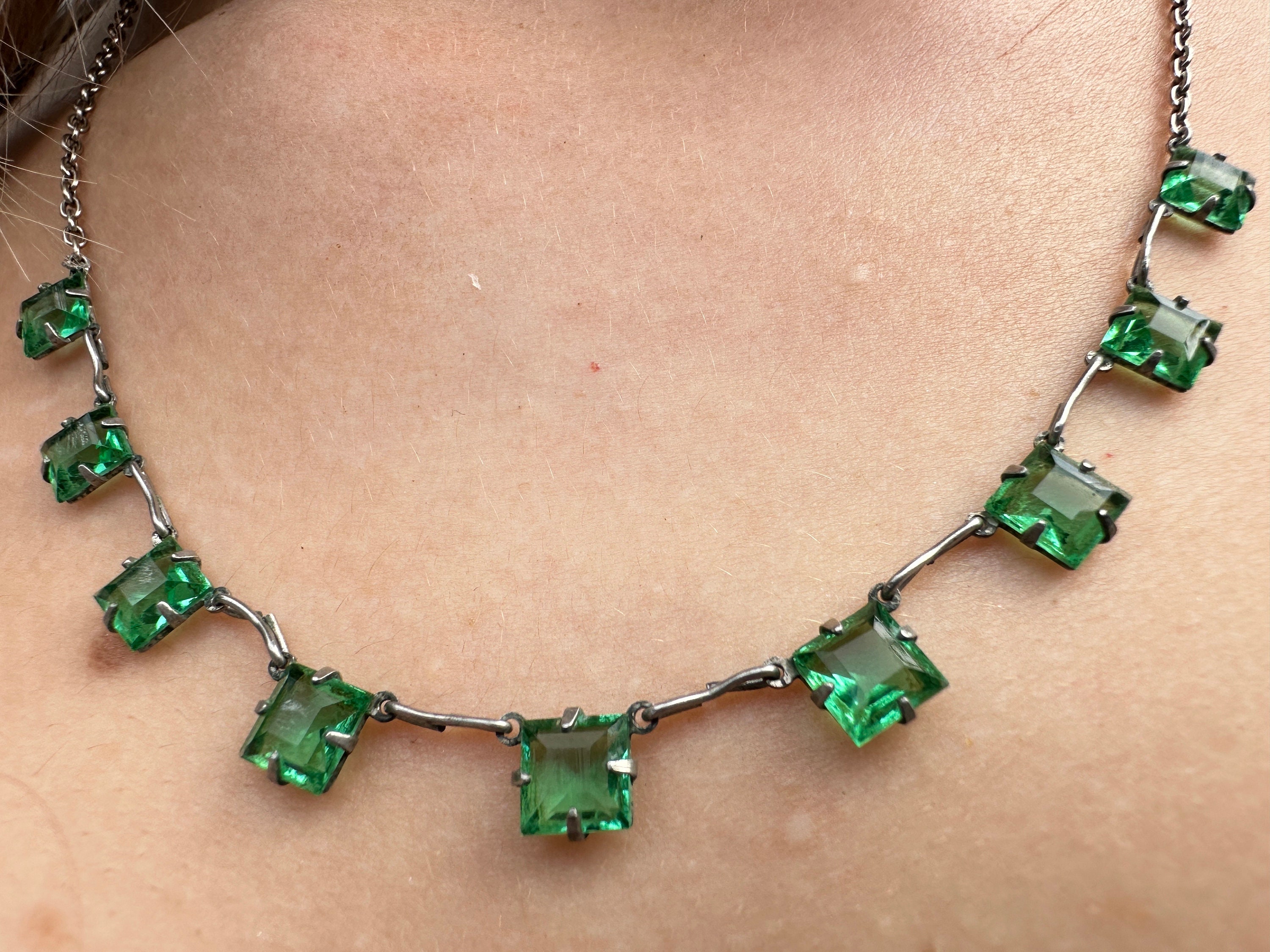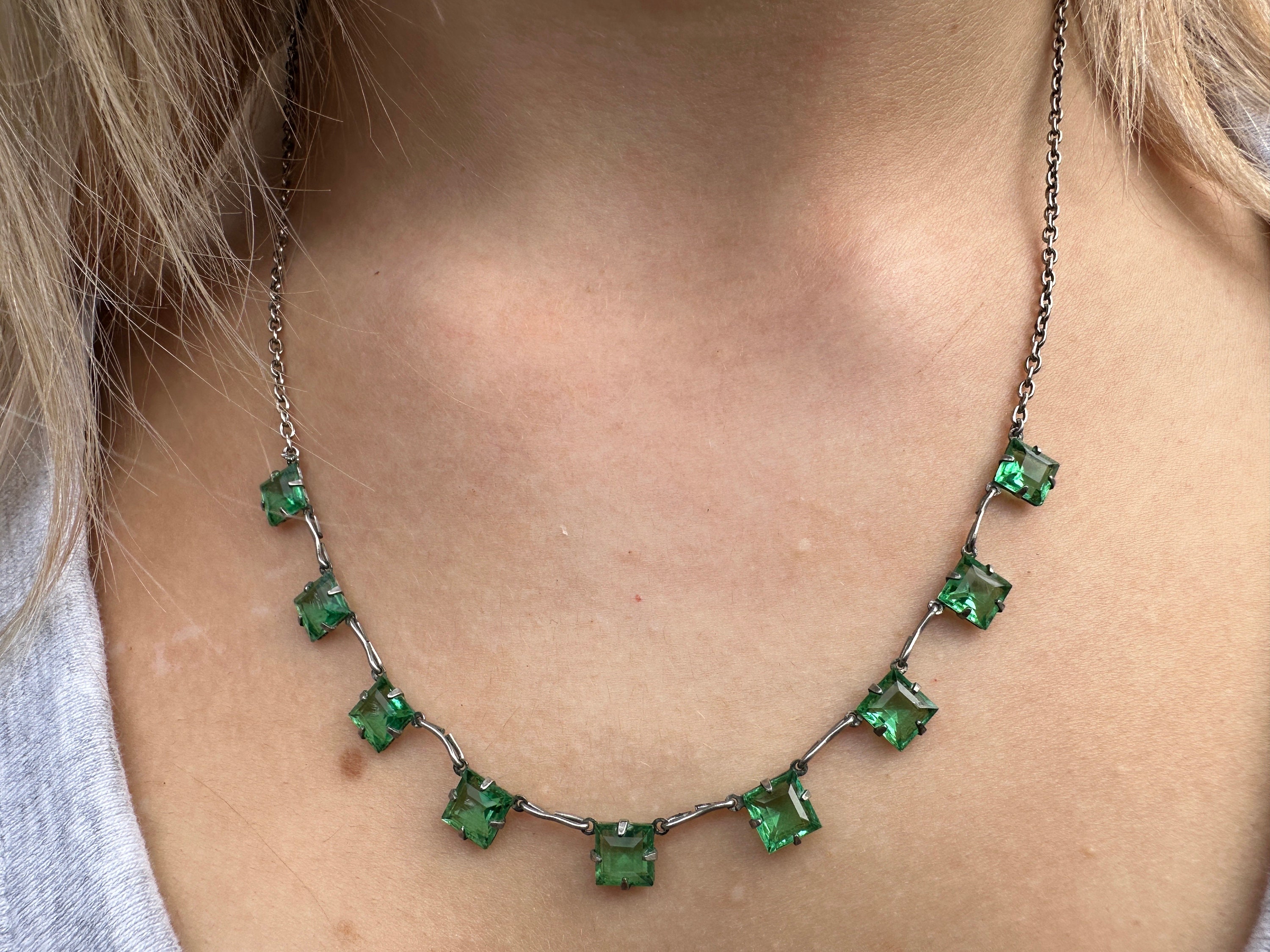 Vintage silver Art Deco peridot colour paste / glass opened back bezel set droplet necklace 20 inches in length. Each stone is approximately 0.6cm in diameter.