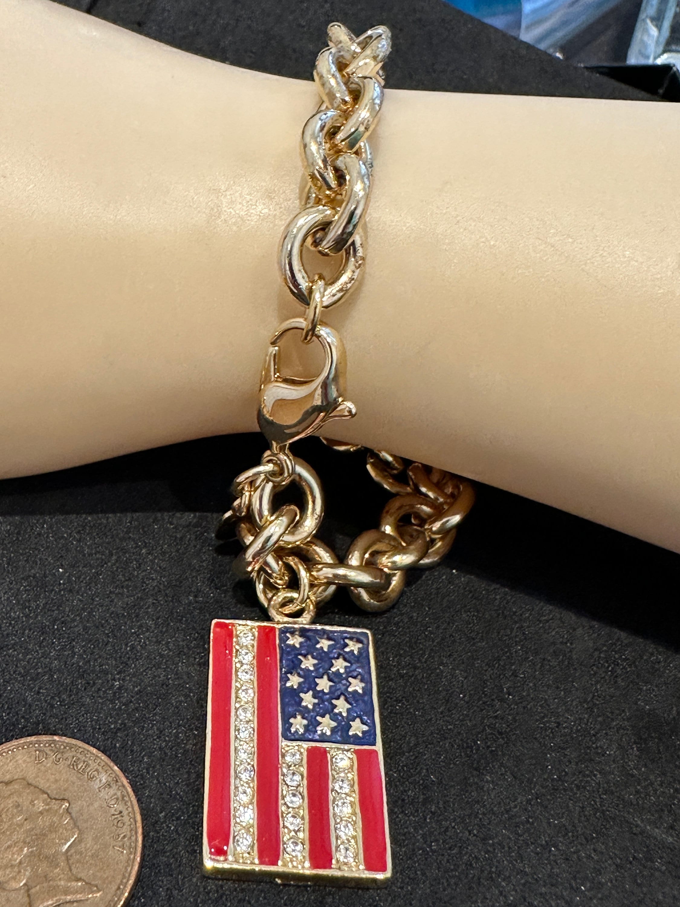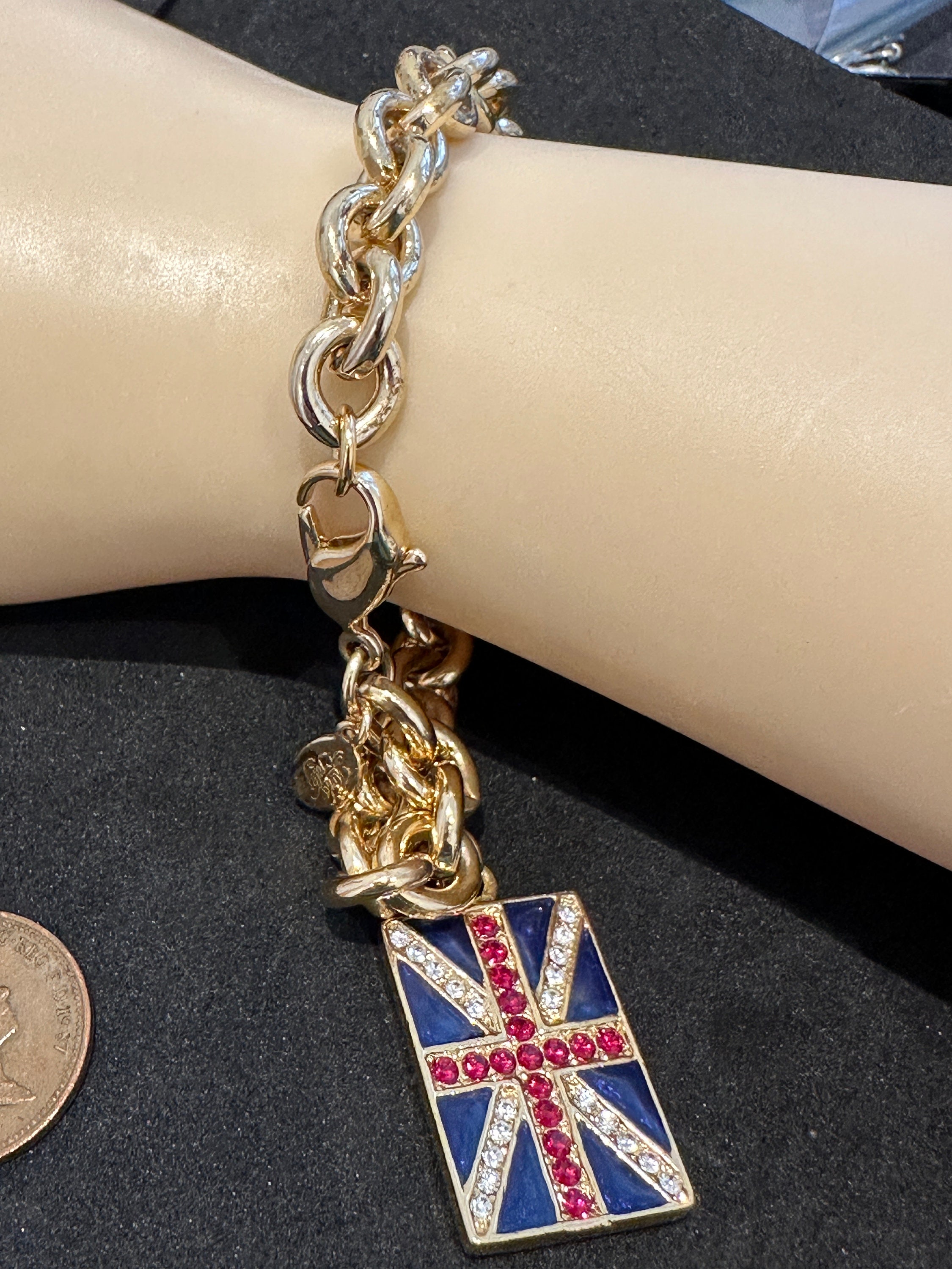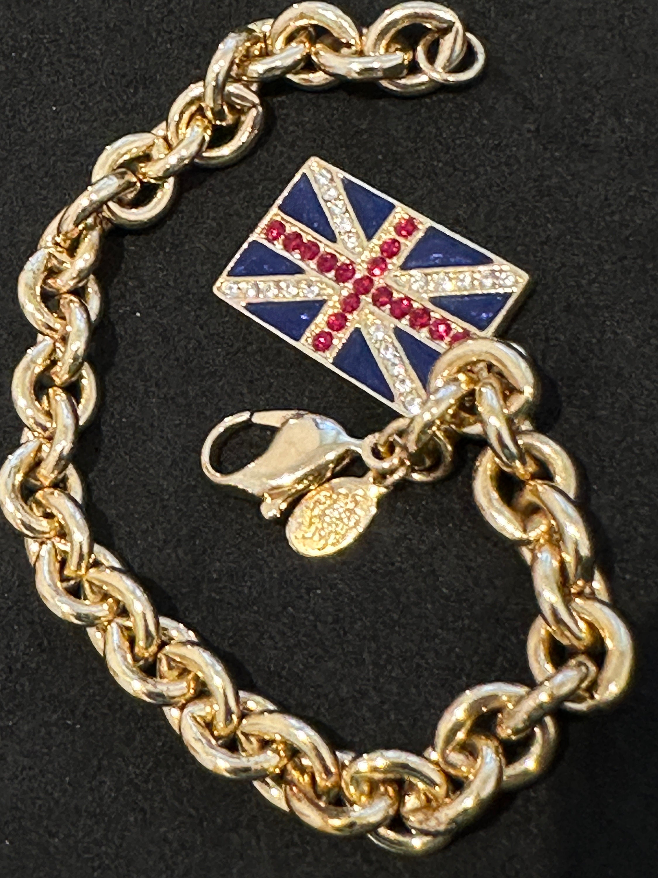 Vintage Kirk's Folly Gold Tone Reversible Flag USA UK Bracelet. This is a fabulous gift for anyone who has affinity to the USA and the U.K. It features a reversible flag charm on a thick gold plated bracelet. The bracelet measures approximately 8 inches and the flag charm measures 2.5cm by 1.5cm. it remains in excellent condition with no damage.