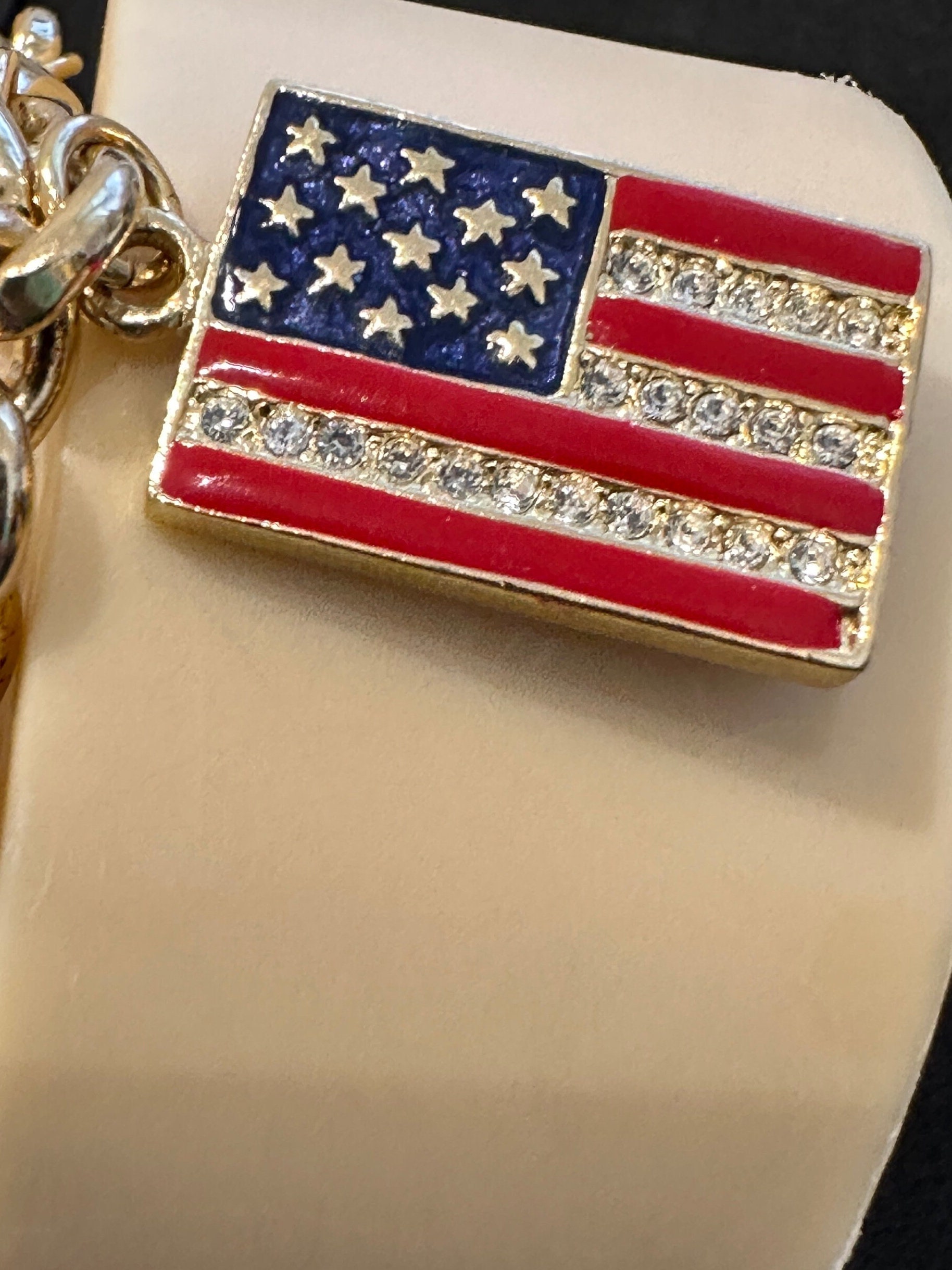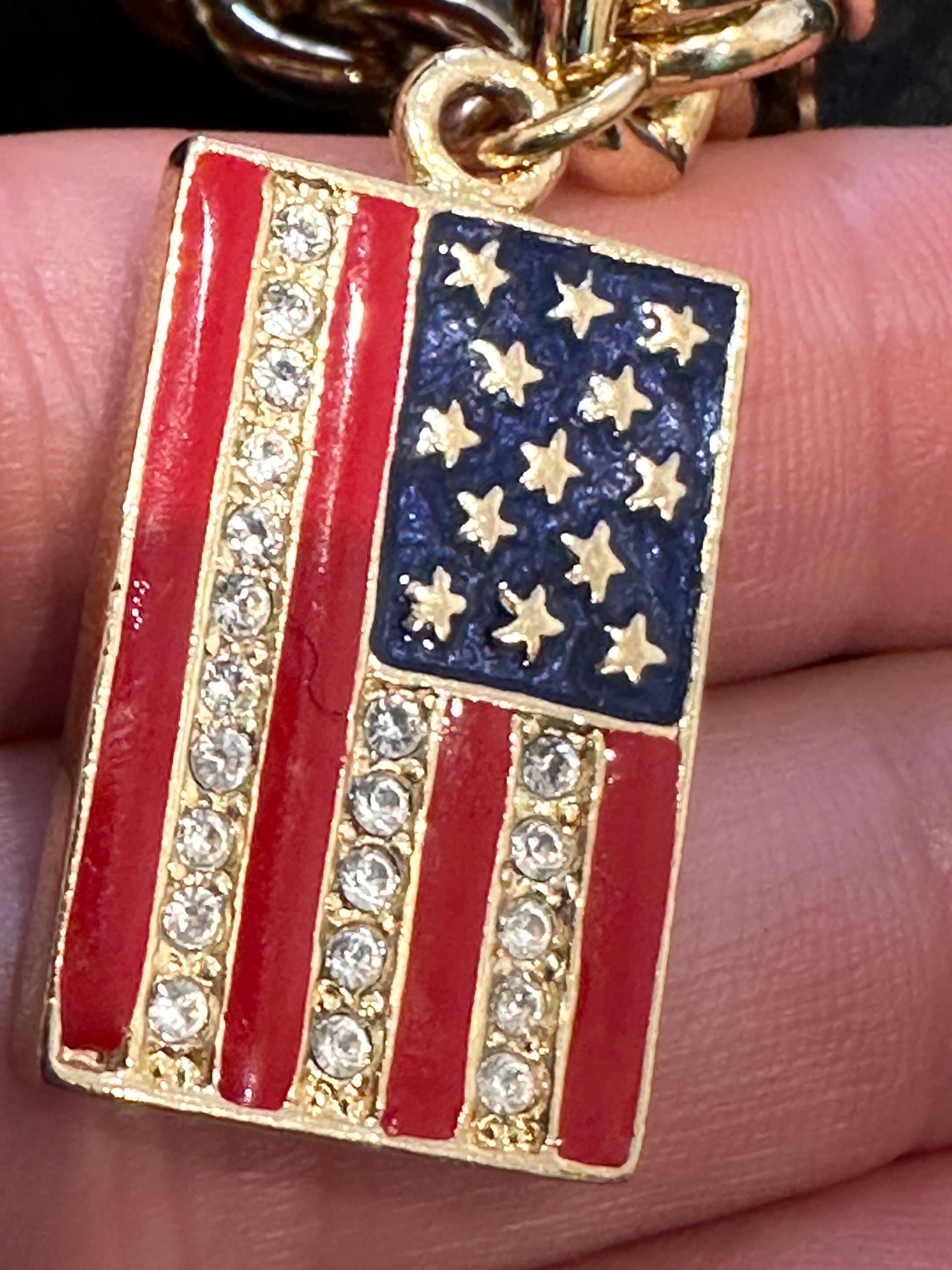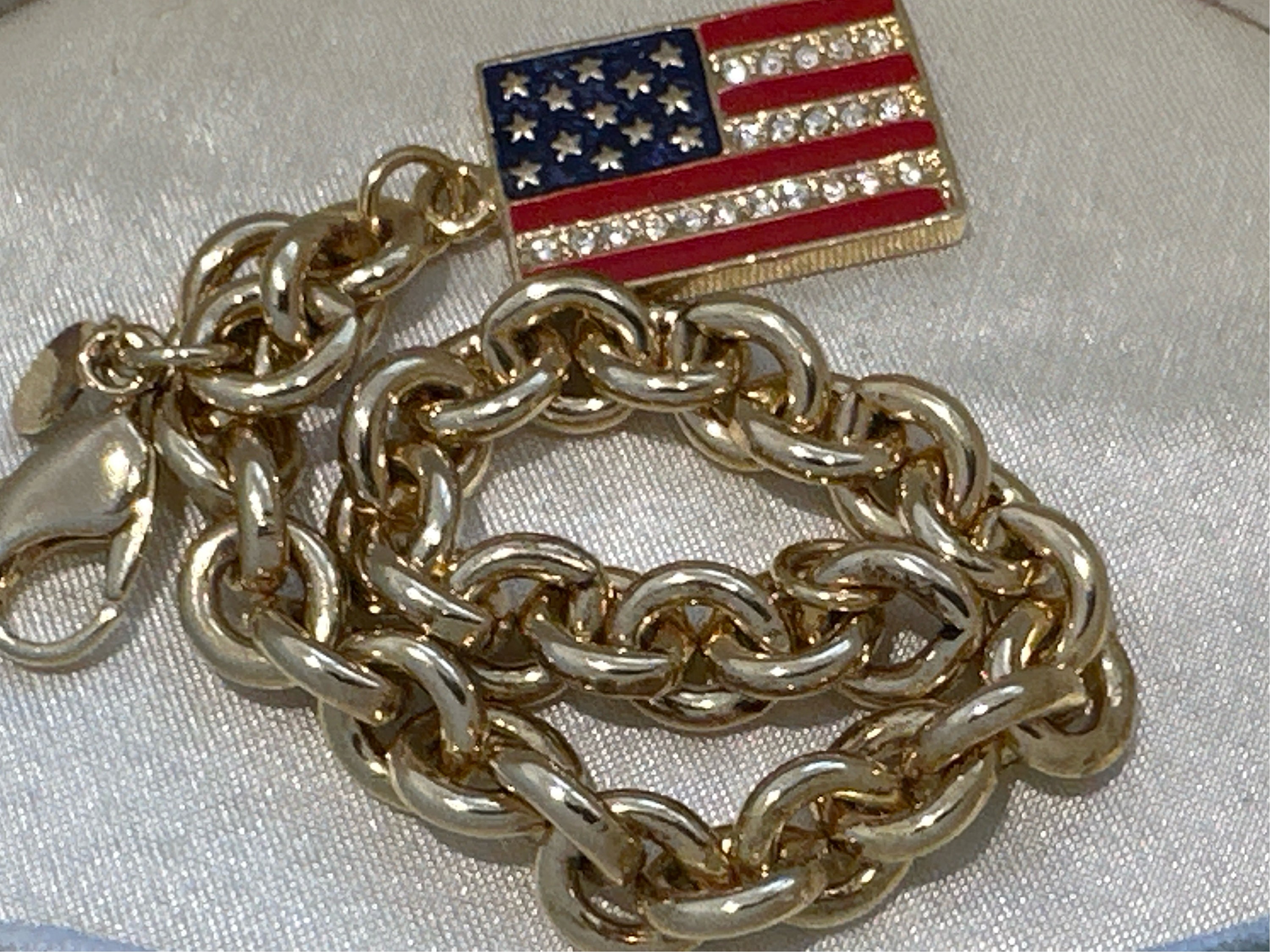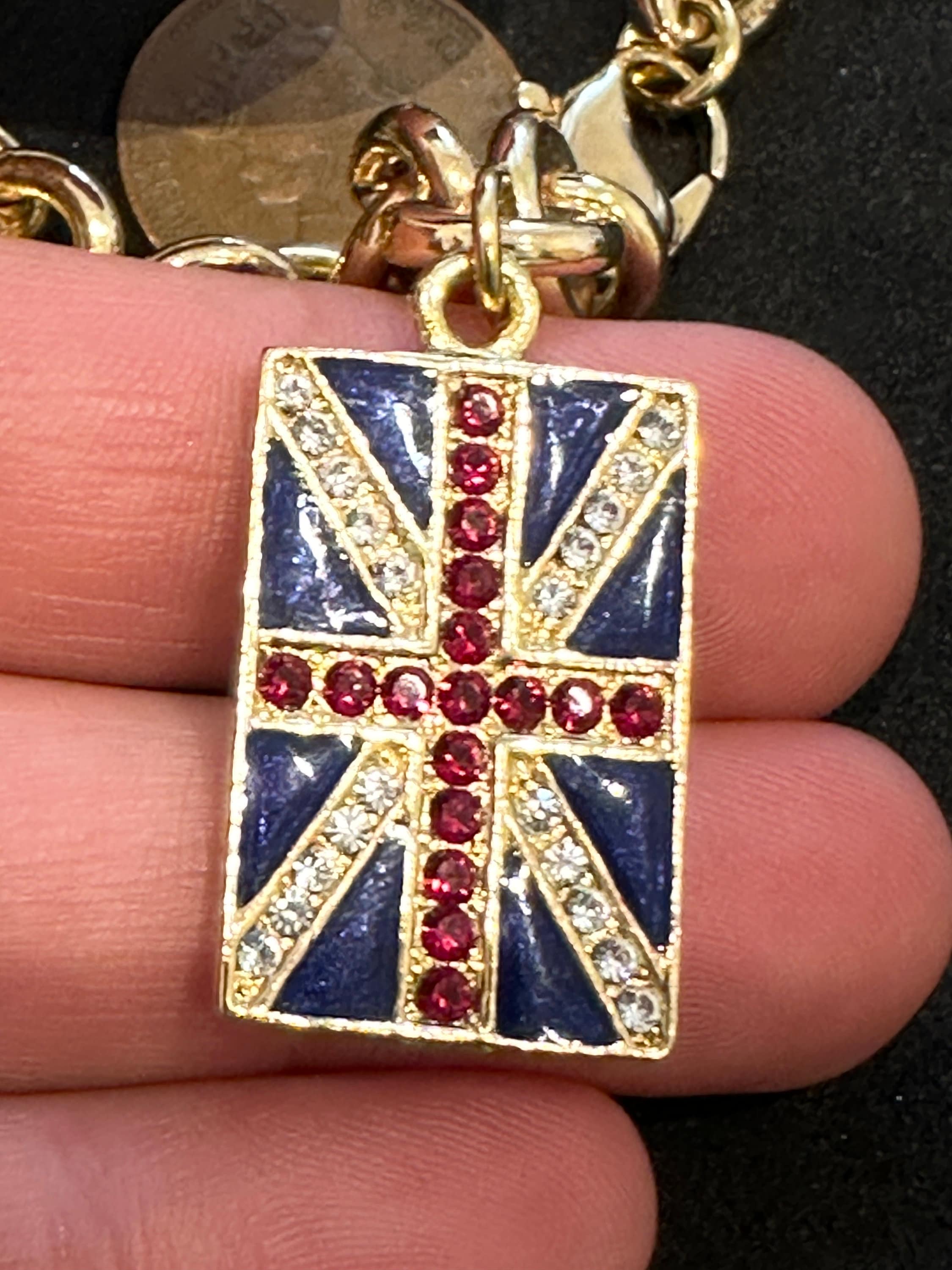 Vintage Kirk's Folly Gold Tone Reversible Flag USA UK Bracelet. This is a fabulous gift for anyone who has affinity to the USA and the U.K. It features a reversible flag charm on a thick gold plated bracelet. The bracelet measures approximately 8 inches and the flag charm measures 2.5cm by 1.5cm. it remains in excellent condition with no damage.