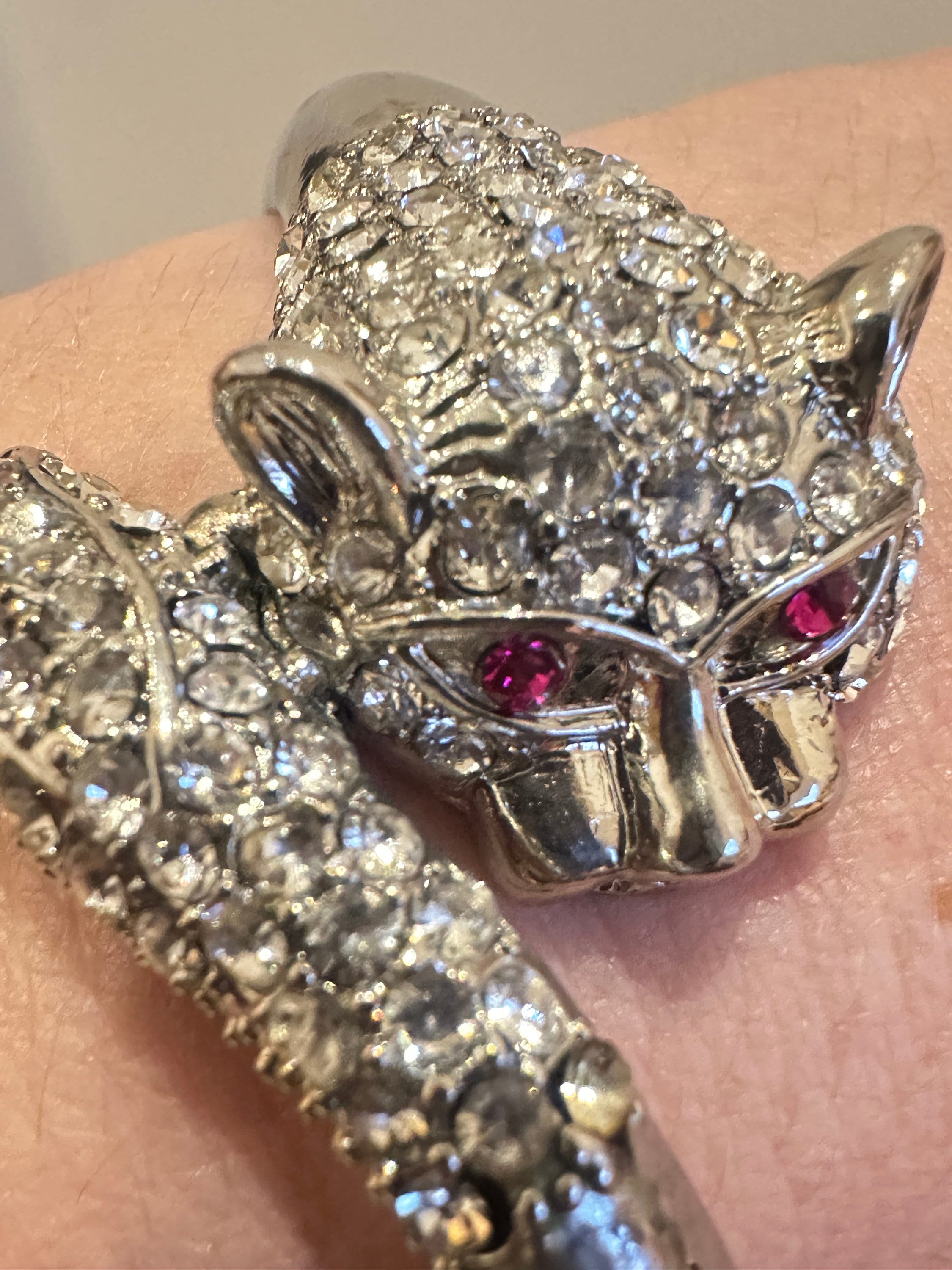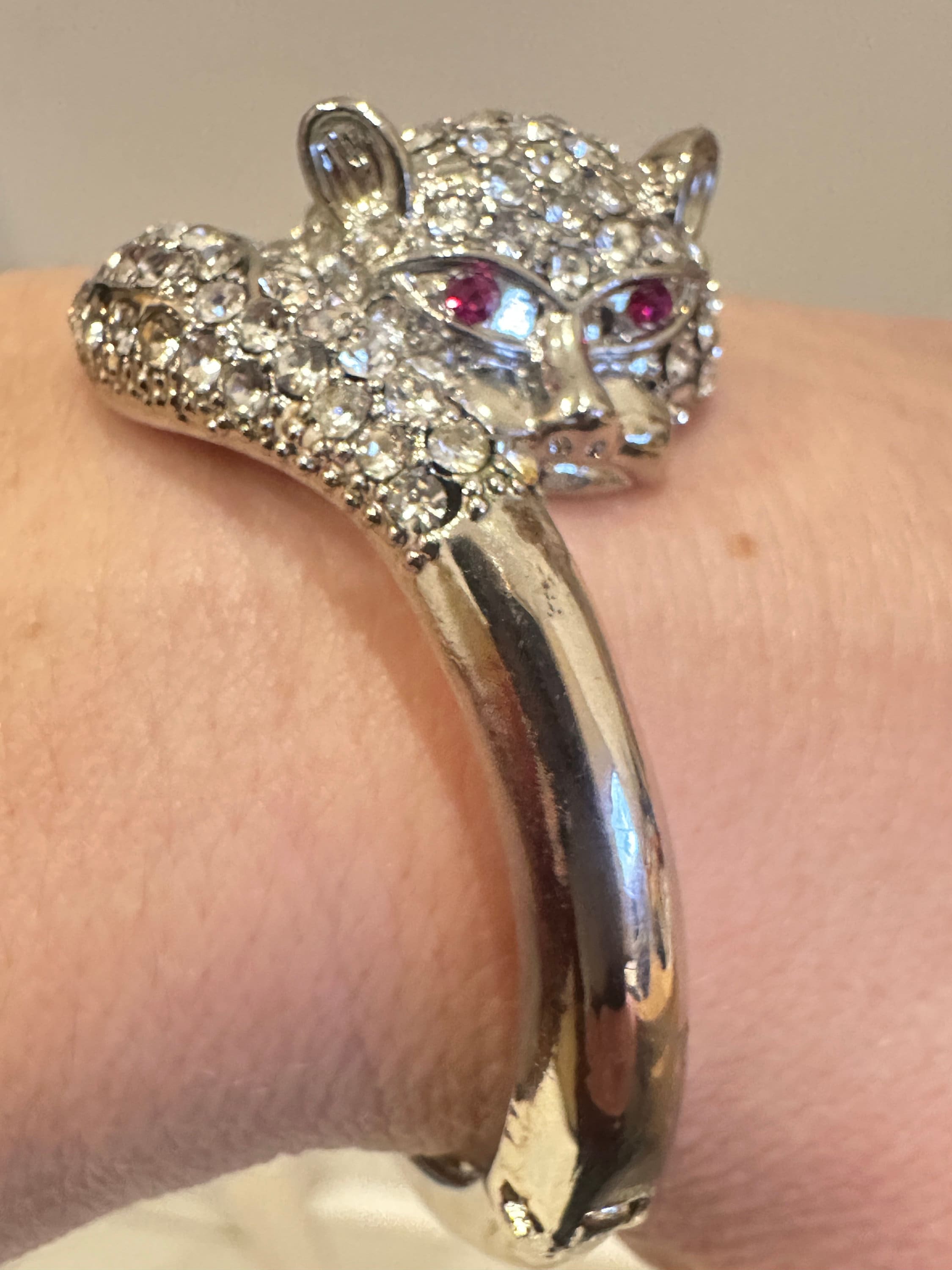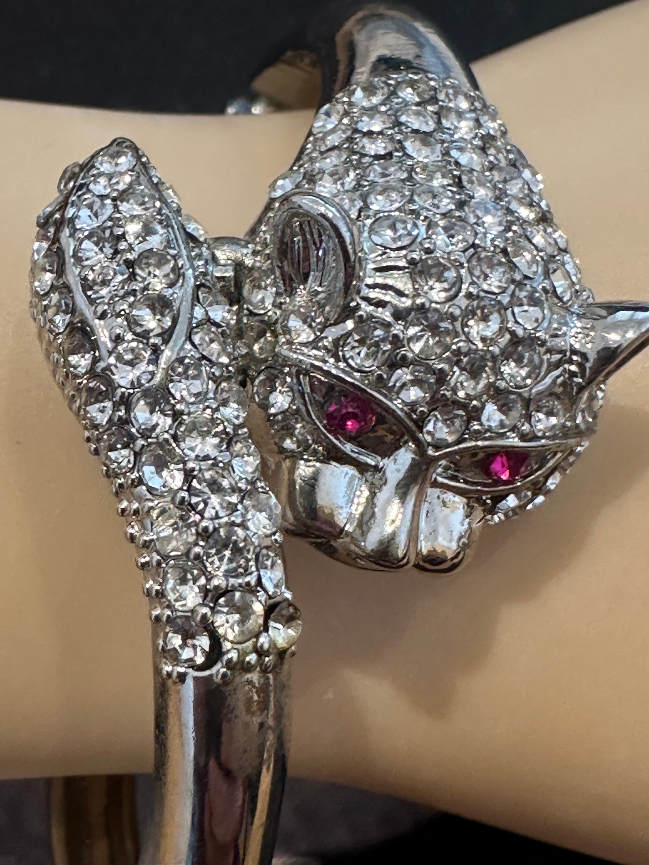 Here is a great fun quirky vintage cats head bracelet. it features a cats head and tail covered in rhinestones. The metal looks to be rhodium plated and remains nice and shiny. the bracelet has an internal measurement of 6cm by 5cm. It fastens with a push in clip.