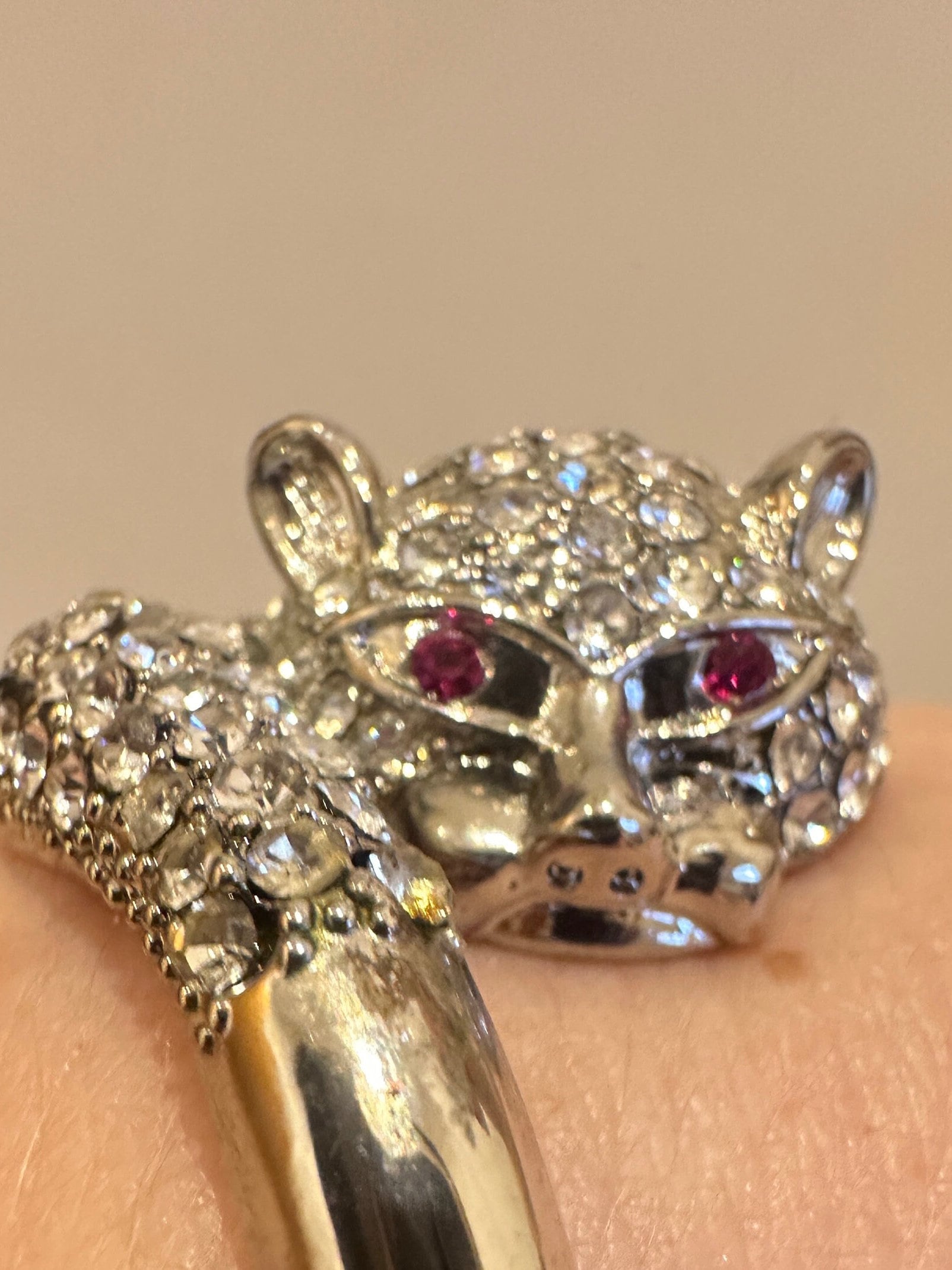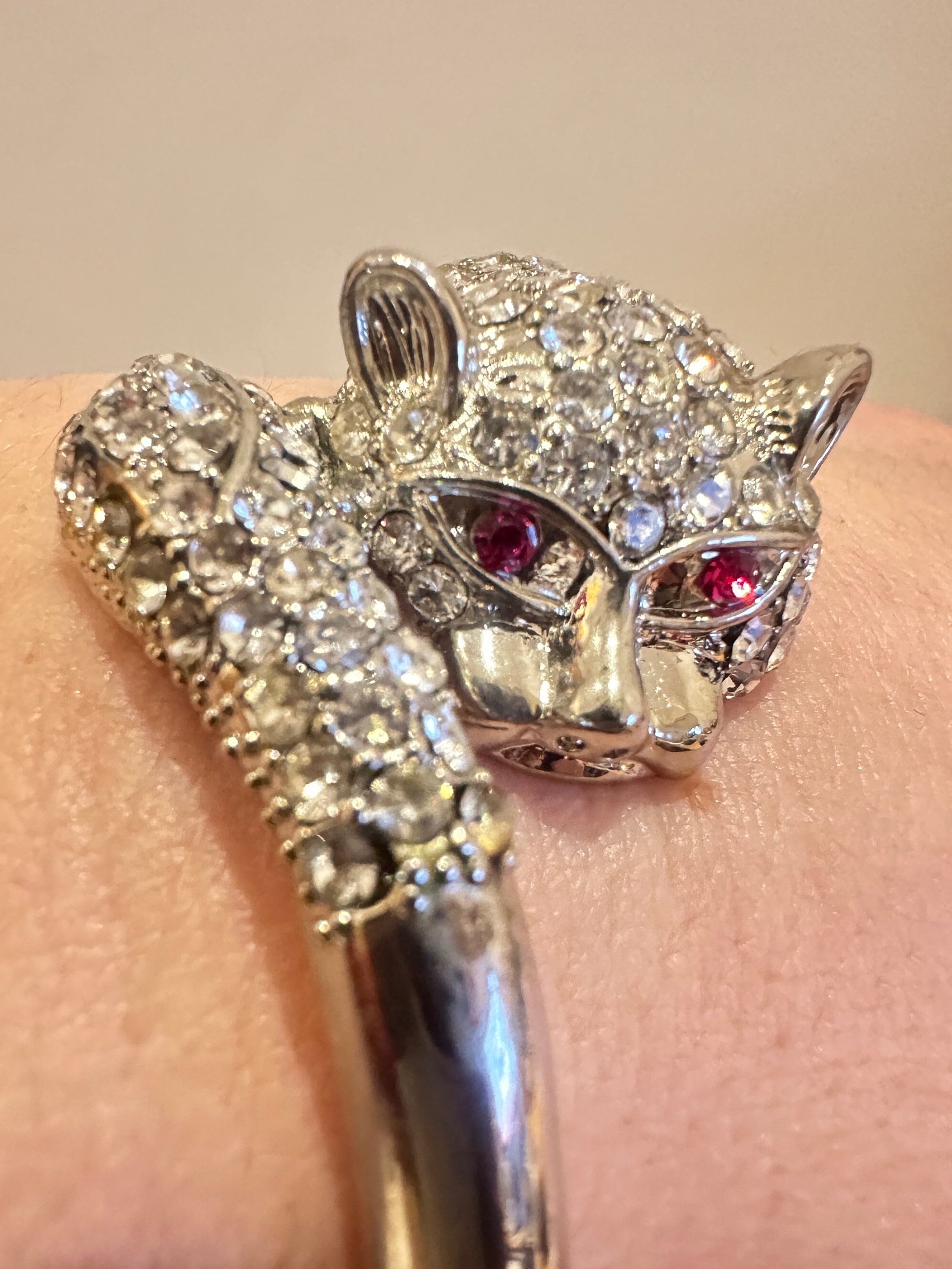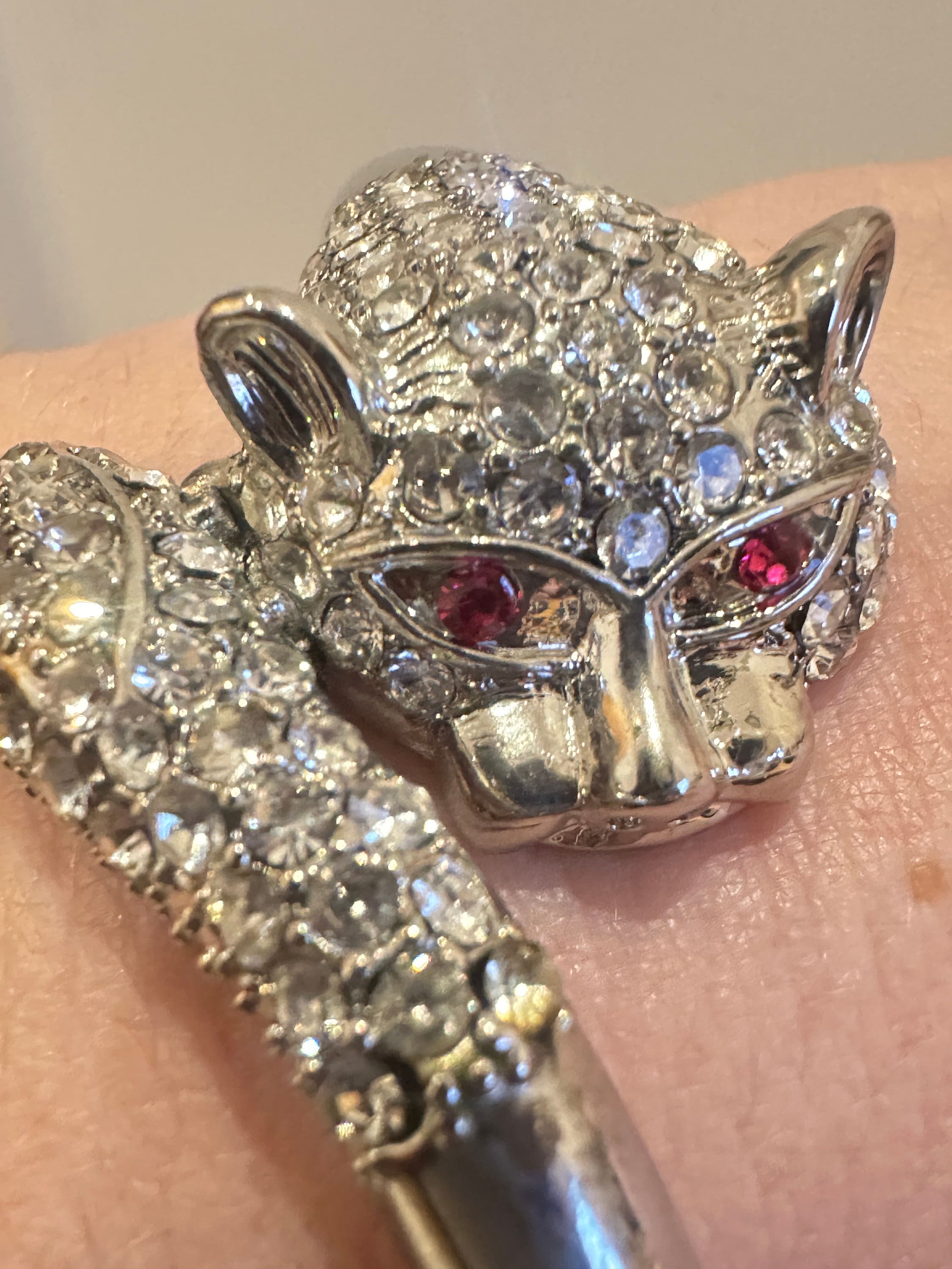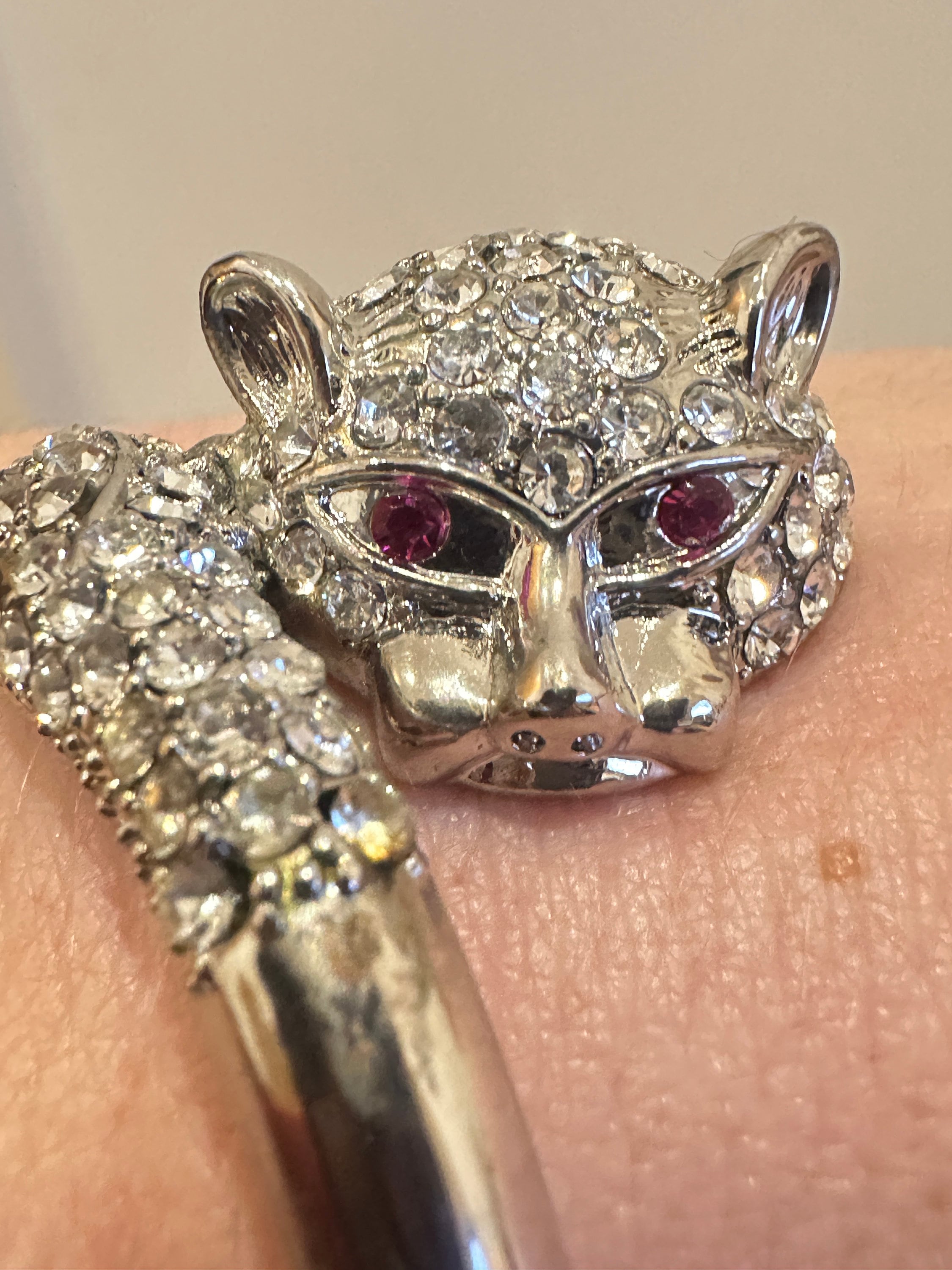 Here is a great fun quirky vintage cats head bracelet. it features a cats head and tail covered in rhinestones. The metal looks to be rhodium plated and remains nice and shiny. the bracelet has an internal measurement of 6cm by 5cm. It fastens with a push in clip.