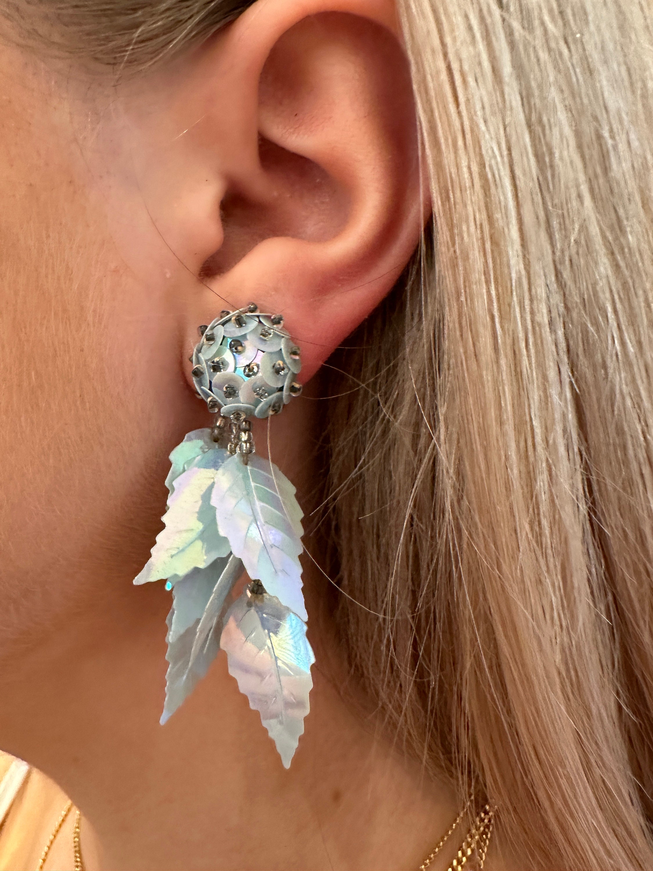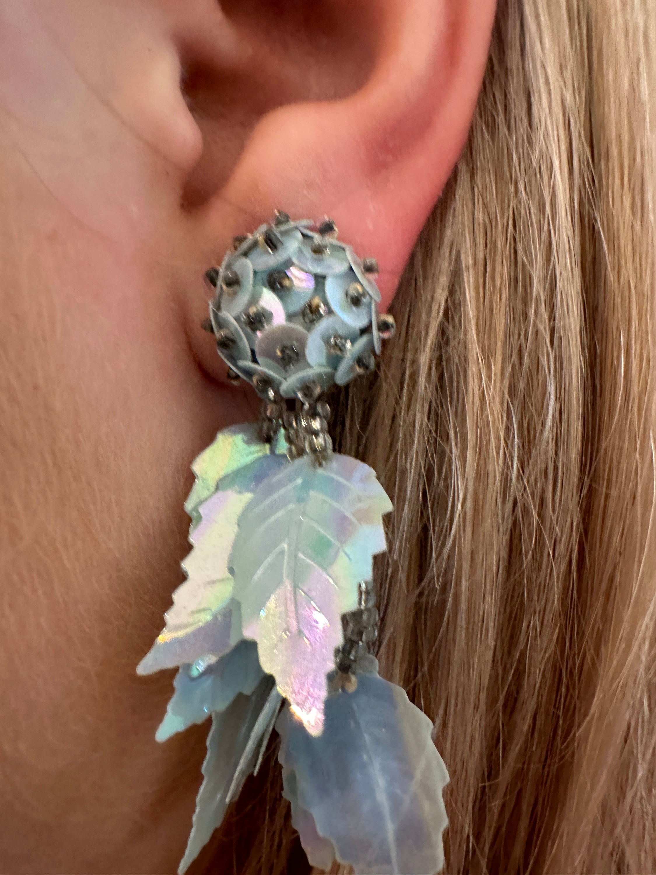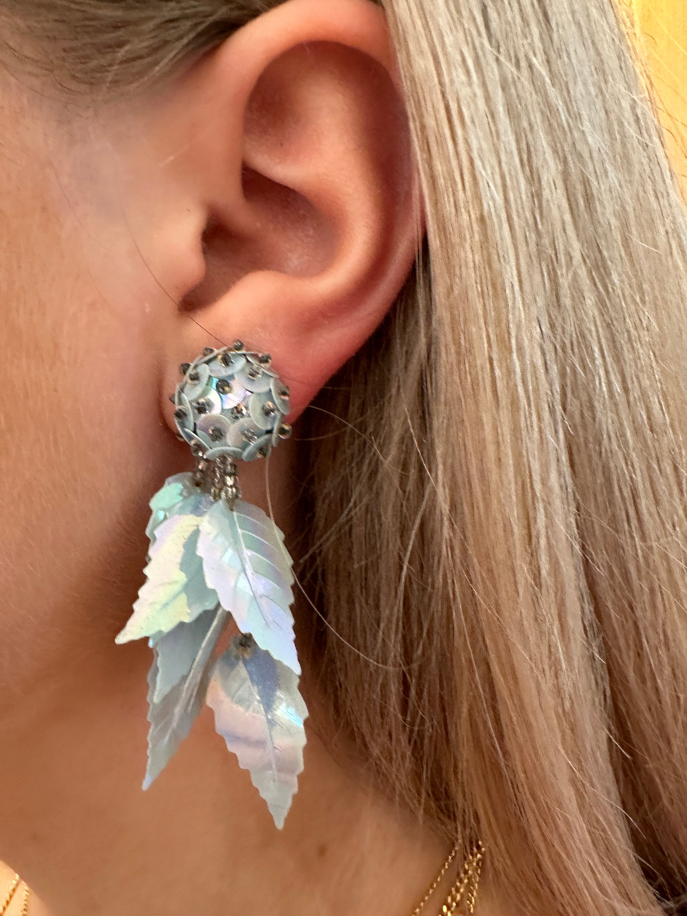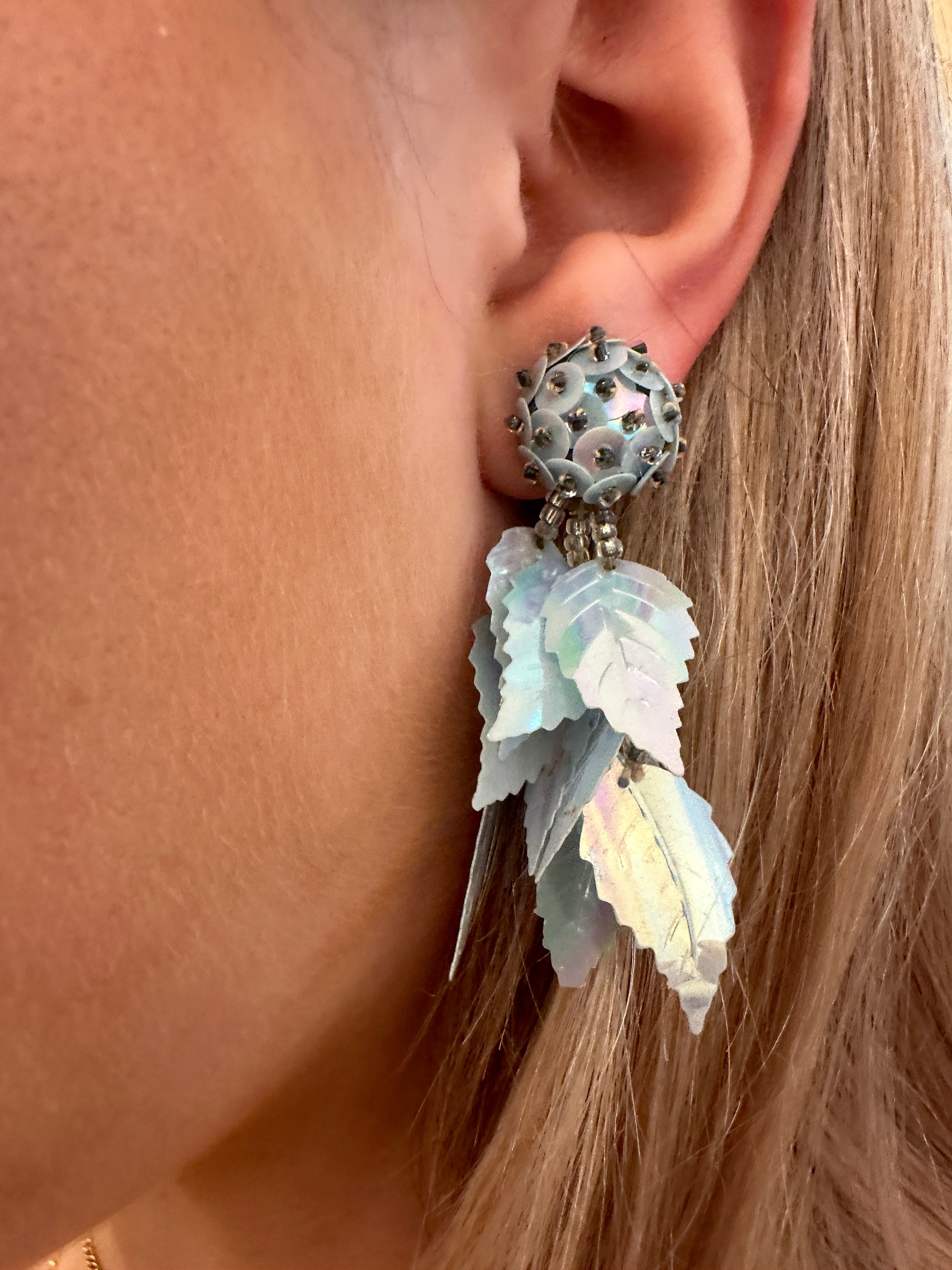Iridescent pale pastel blue long vintage sequin earrings. These measure approximately 6cm in length.