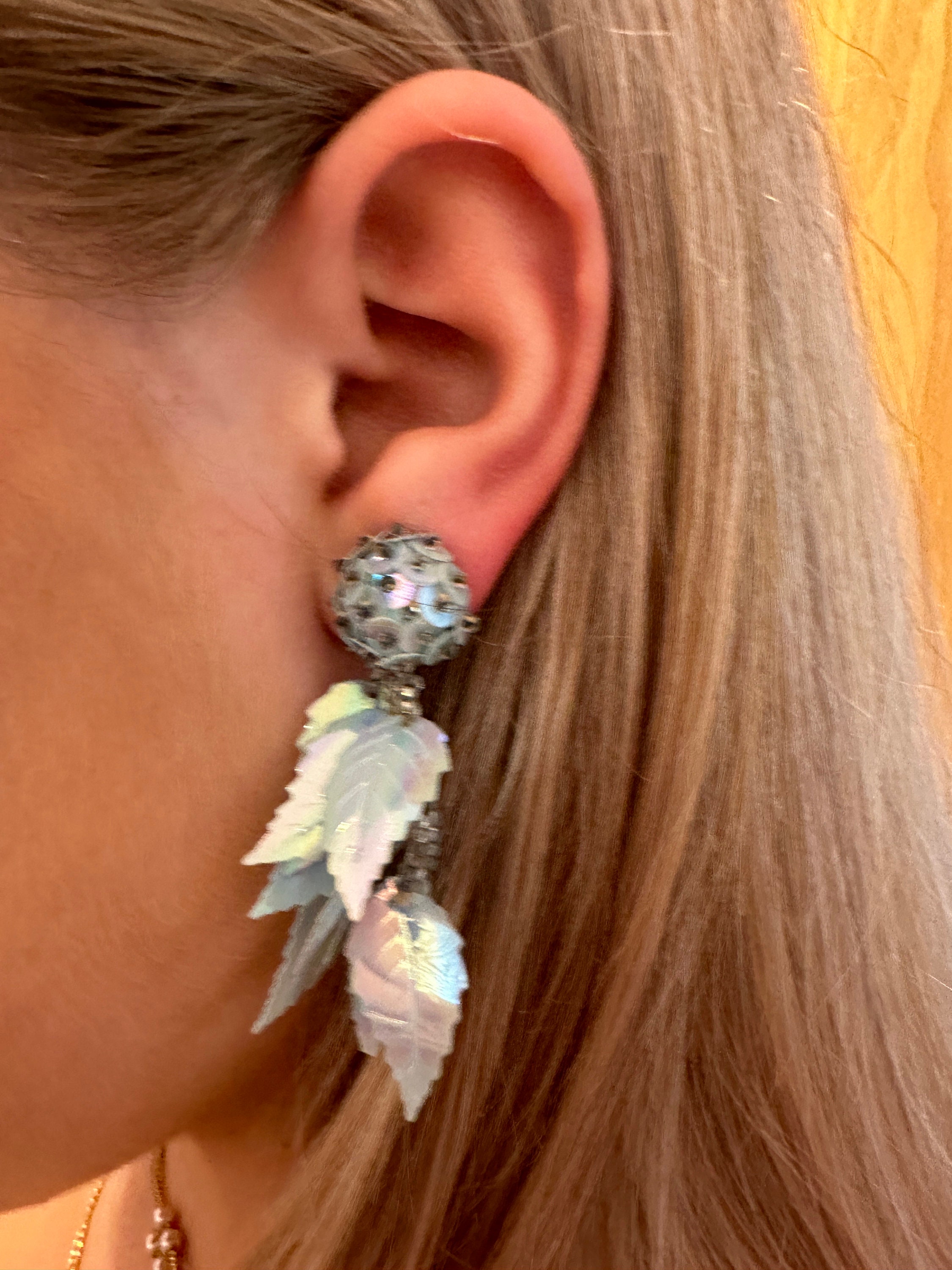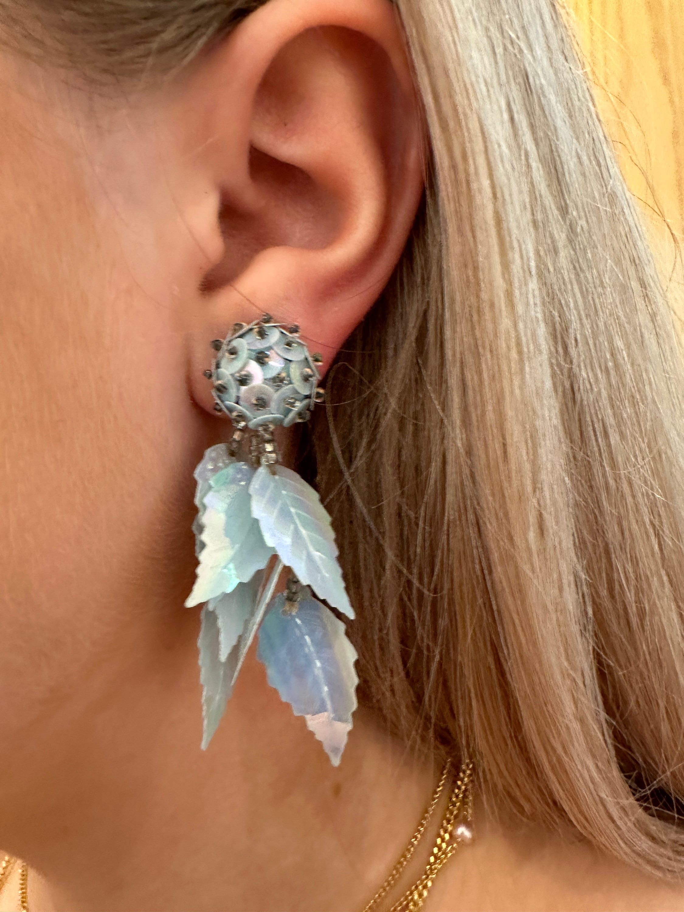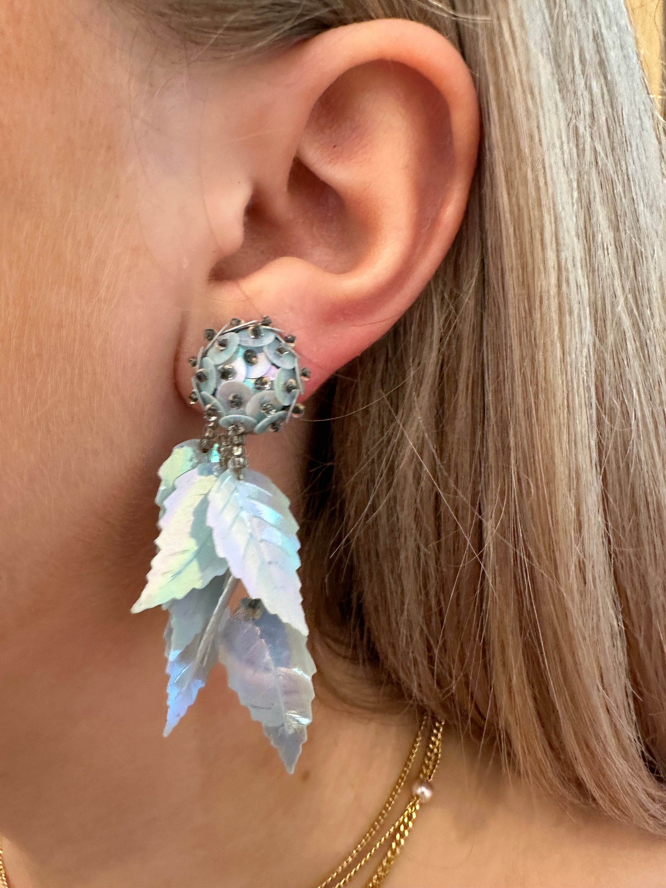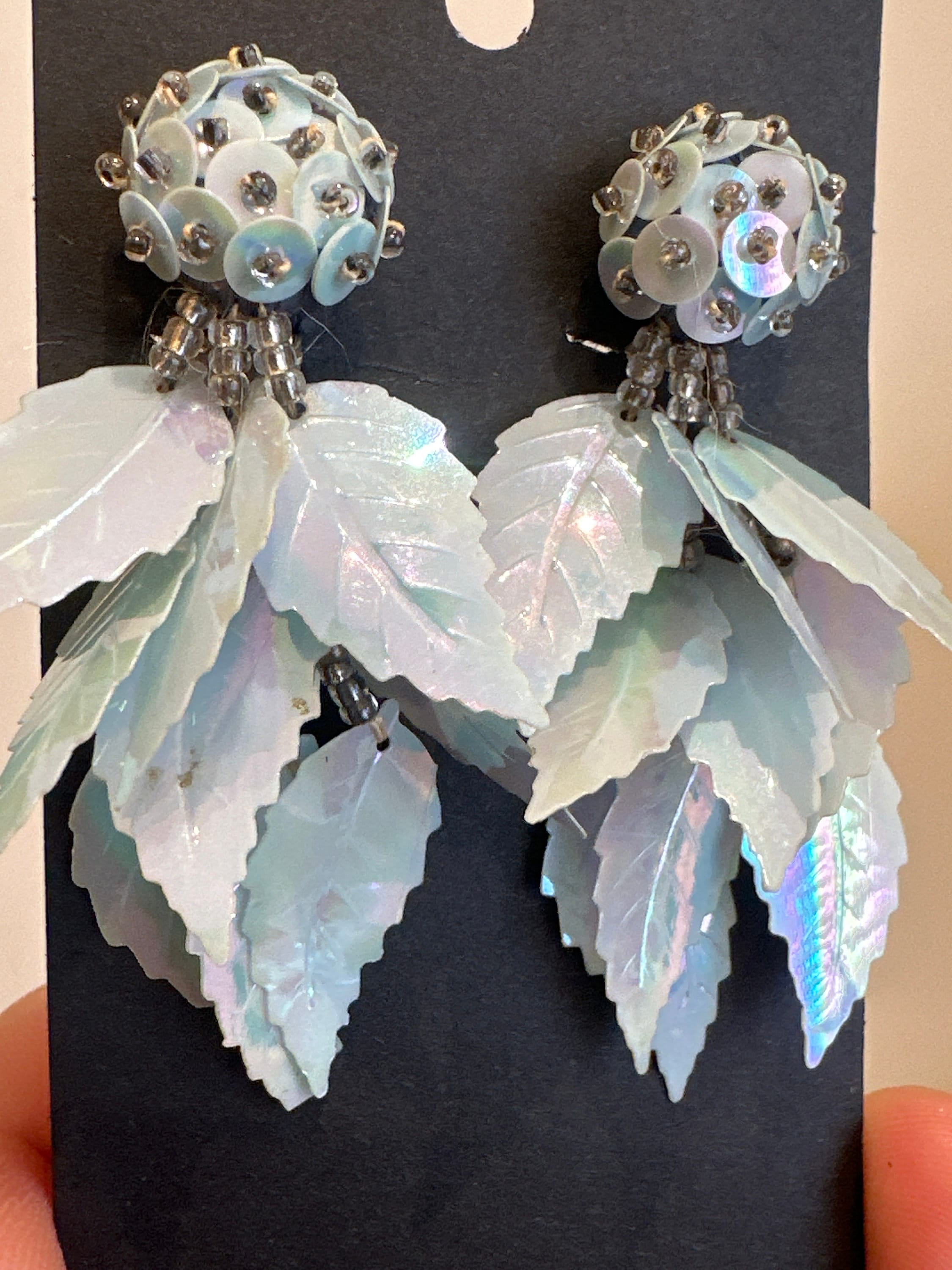 Iridescent pale pastel blue long vintage sequin earrings. These measure approximately 6cm in length.