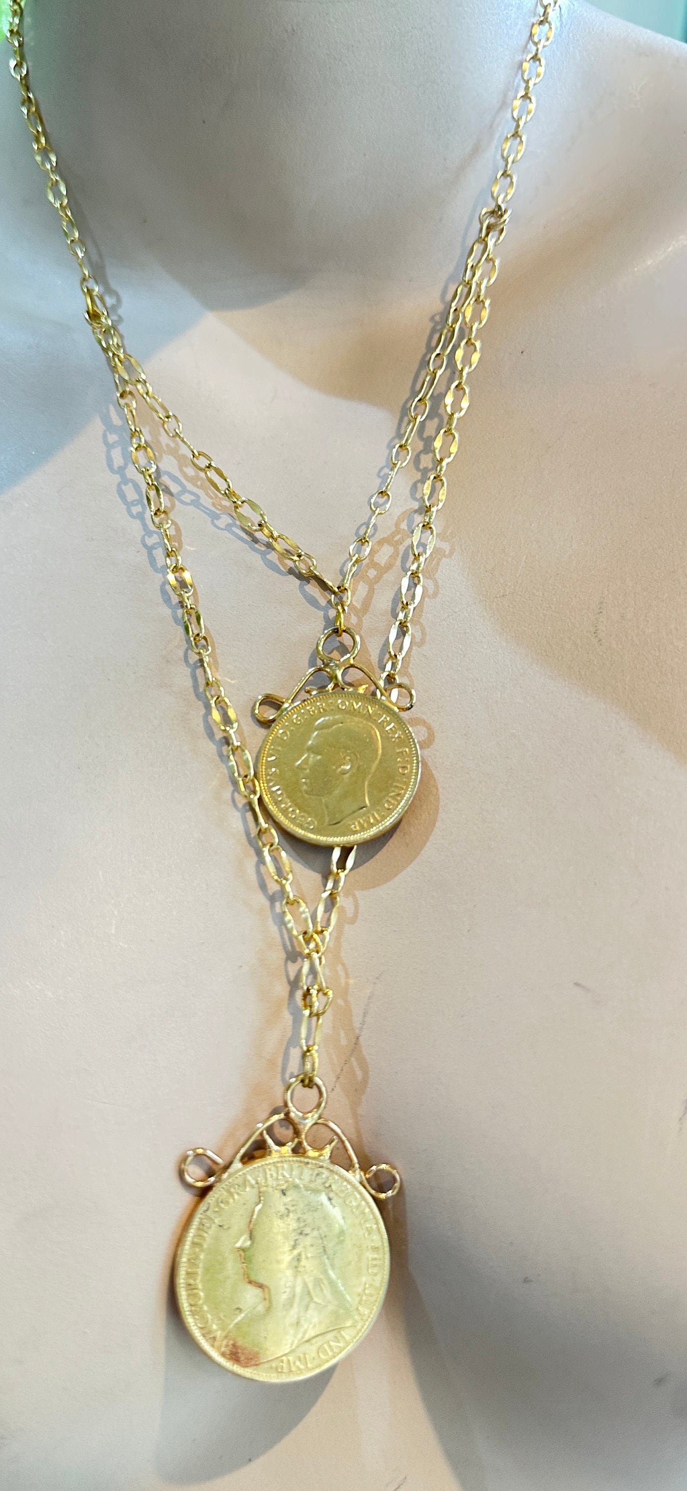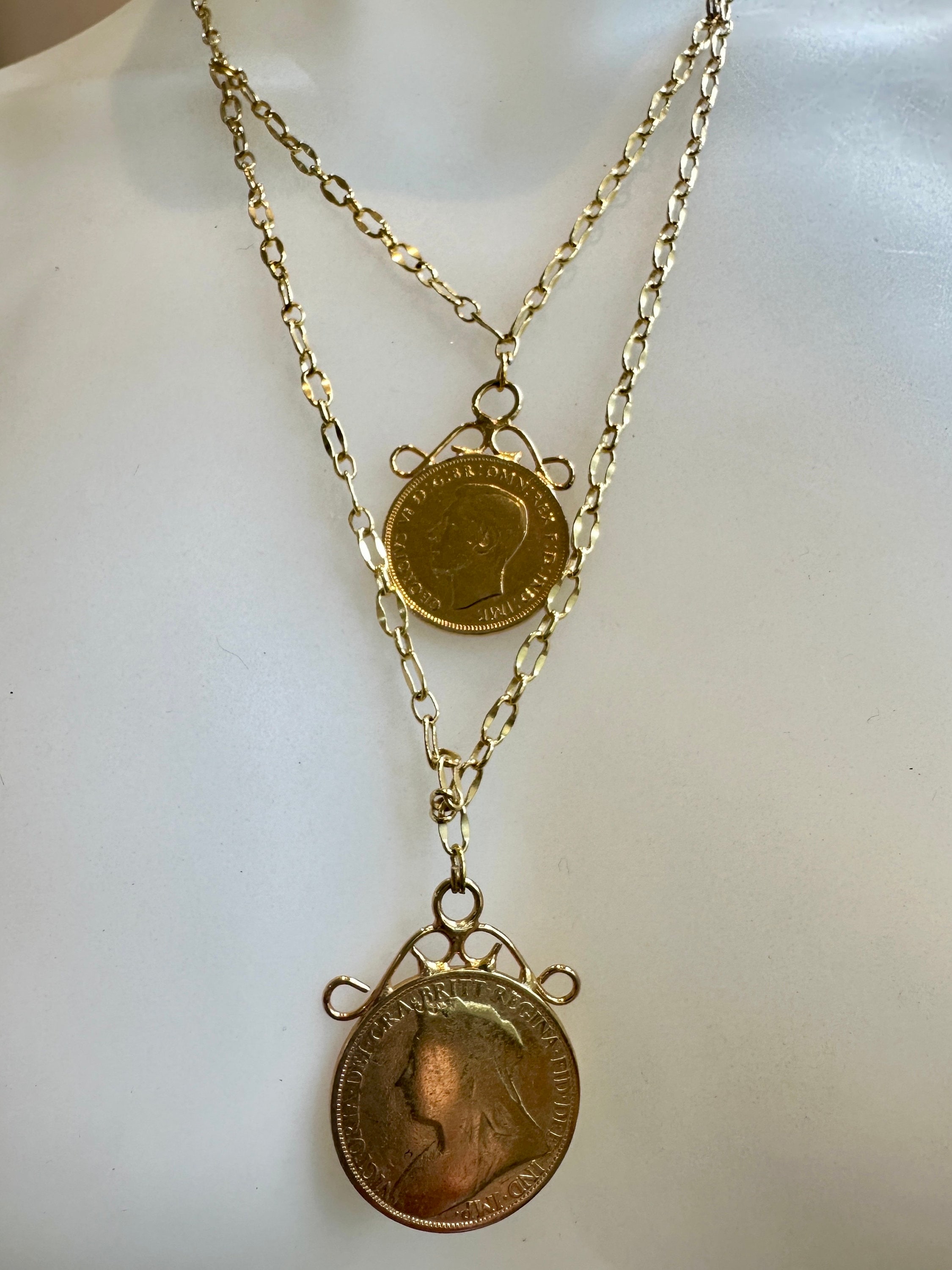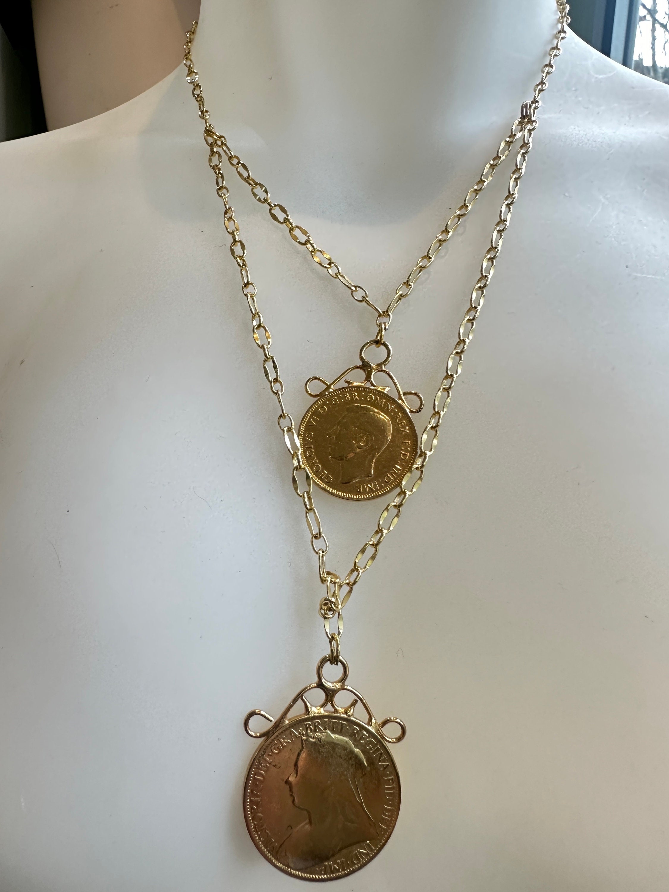 This piece I have made from 2 vintage gold plated coins. I have used a very high quality gold plated chain to create the layered effect.