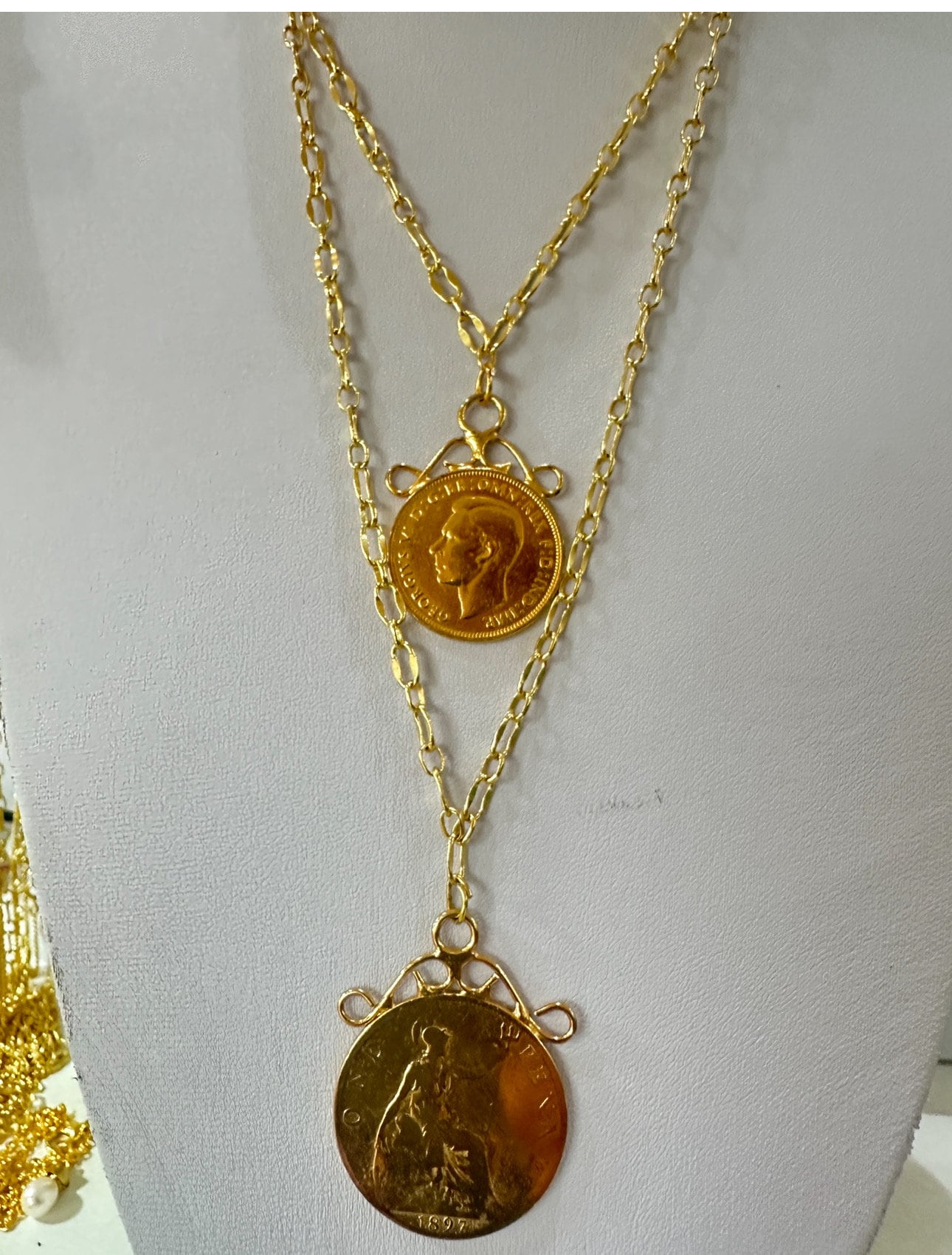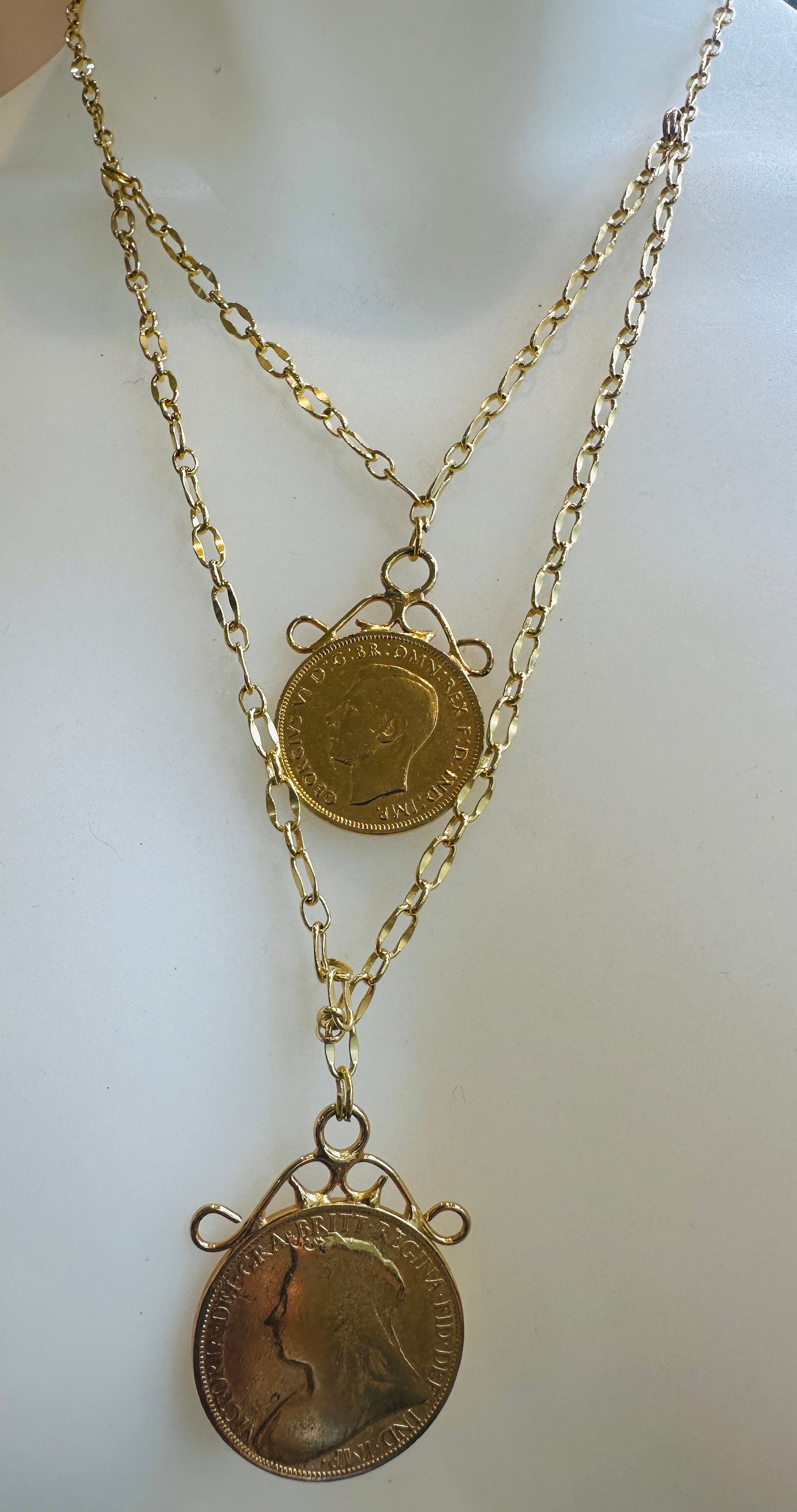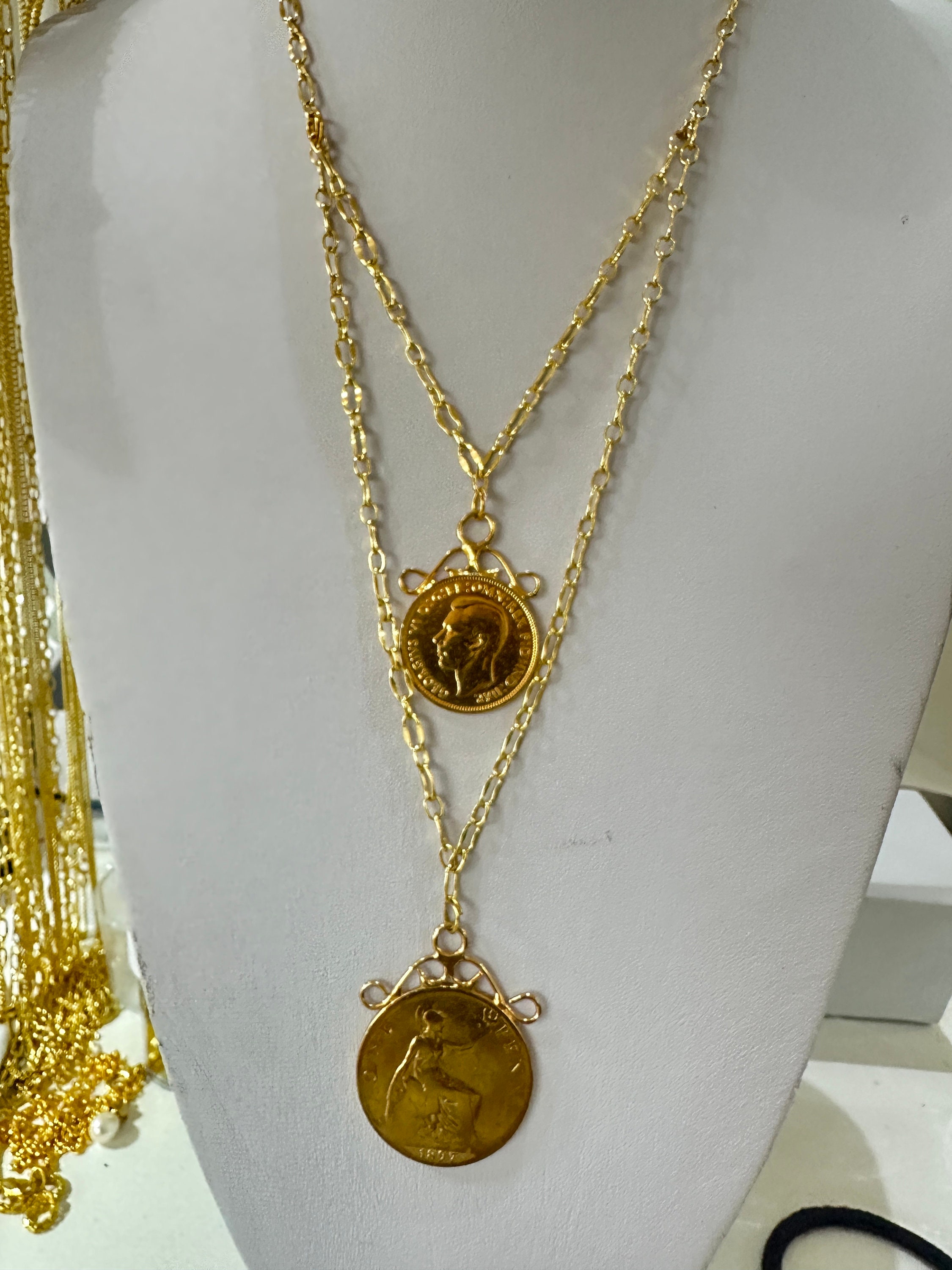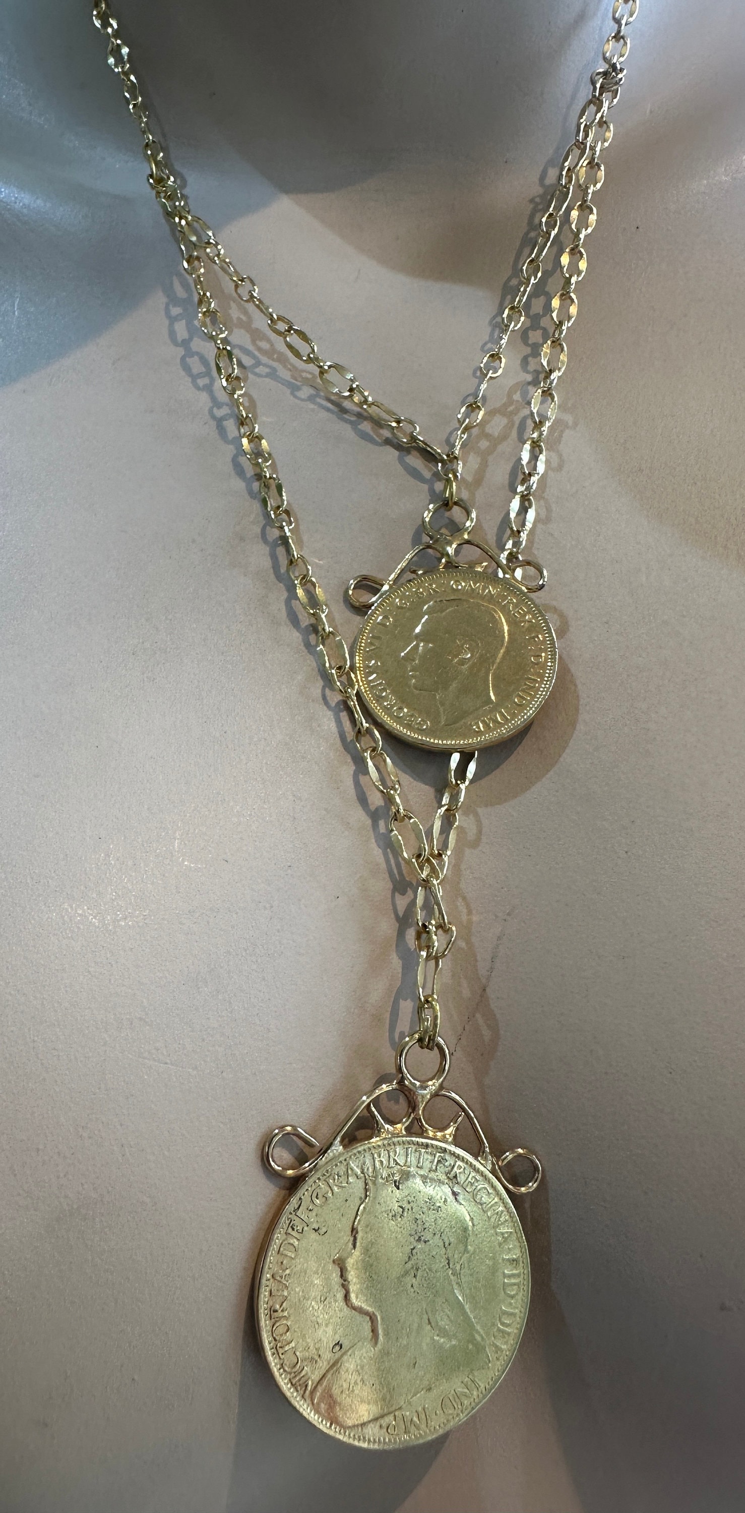 This piece I have made from 2 vintage gold plated coins. I have used a very high quality gold plated chain to create the layered effect.