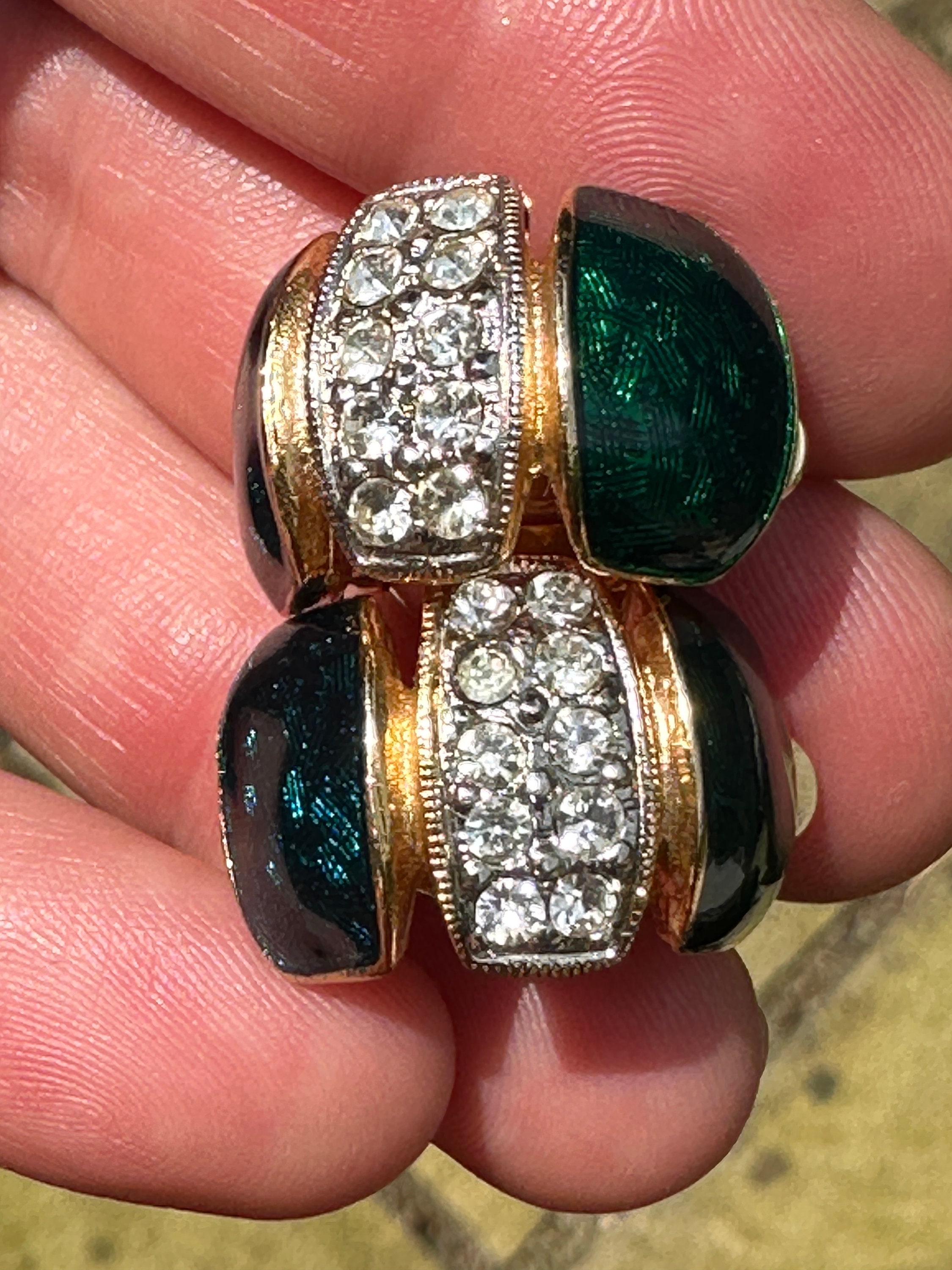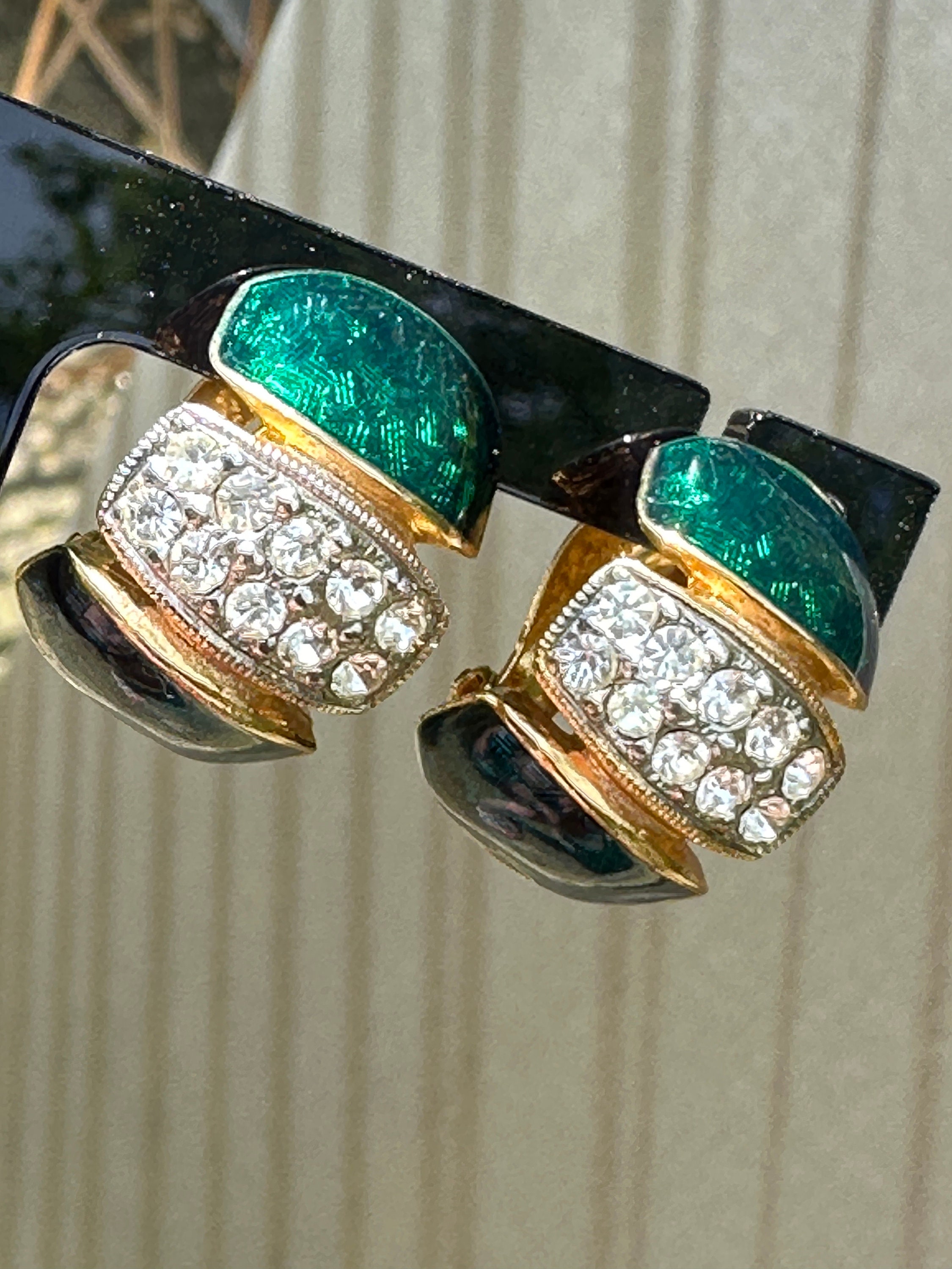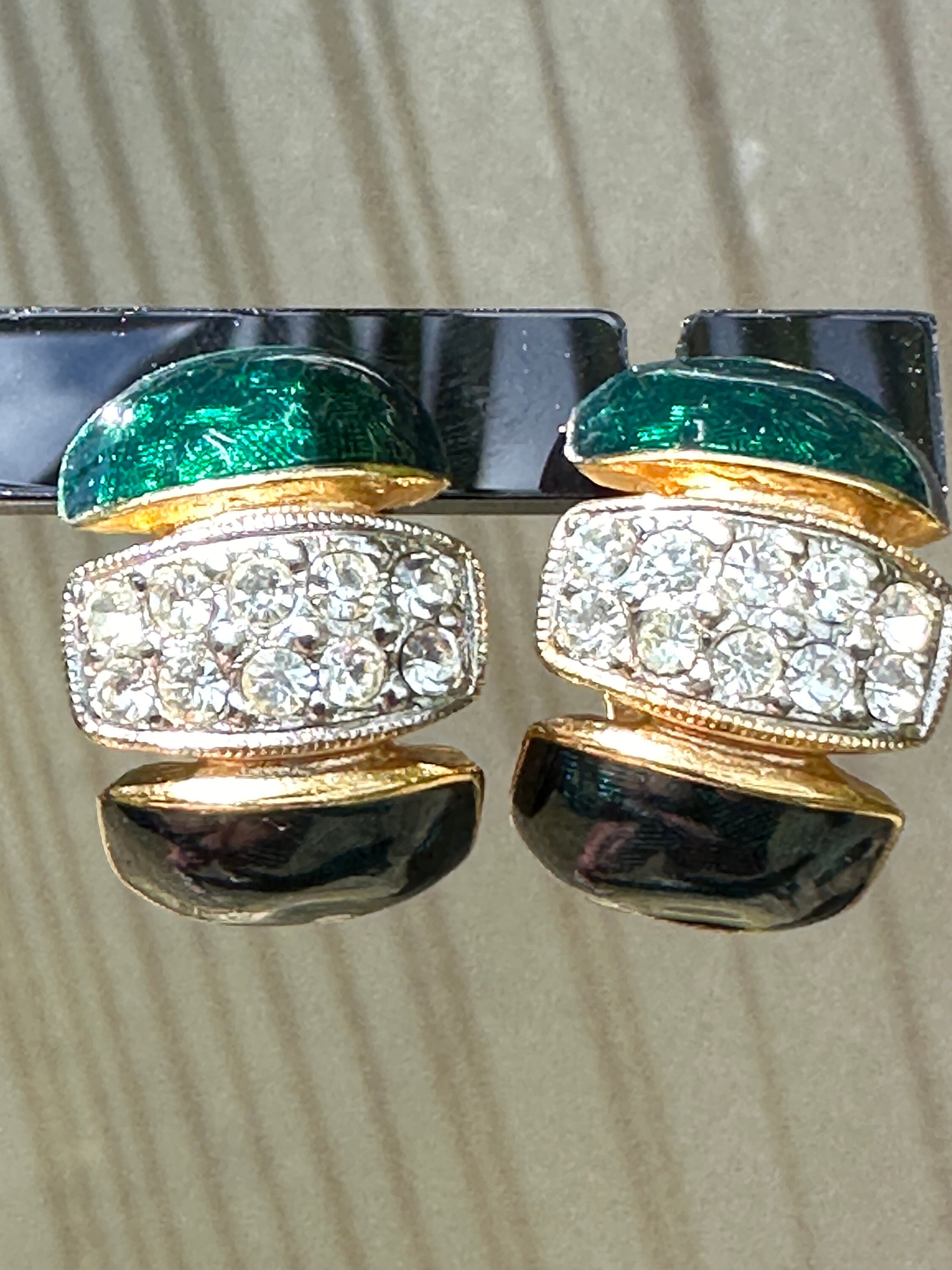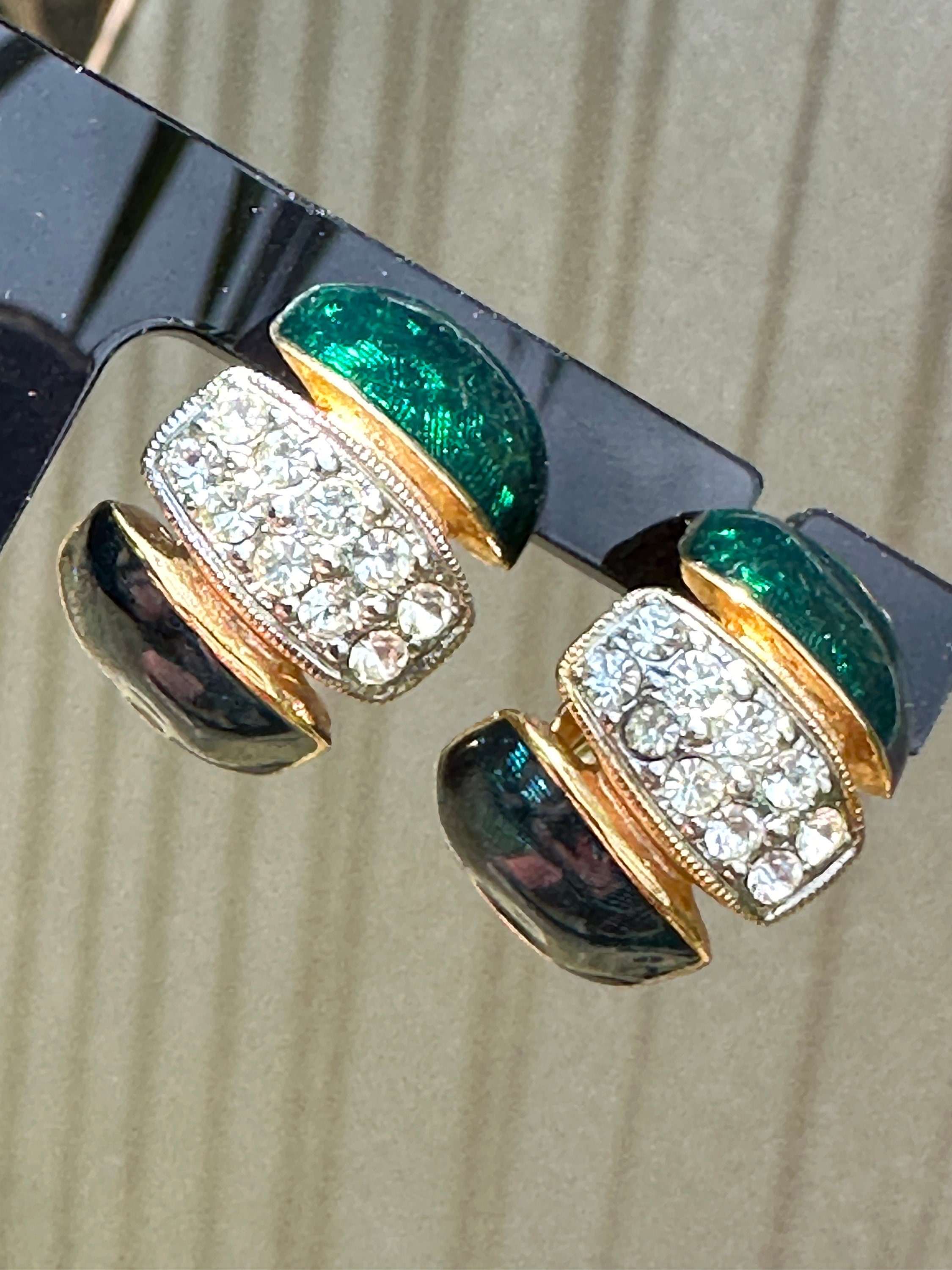 Here are a lovely pair of vintage half hoop earrings they are very well made and feature dark blue and green enamel, pave set crystals and gold plated metal.
