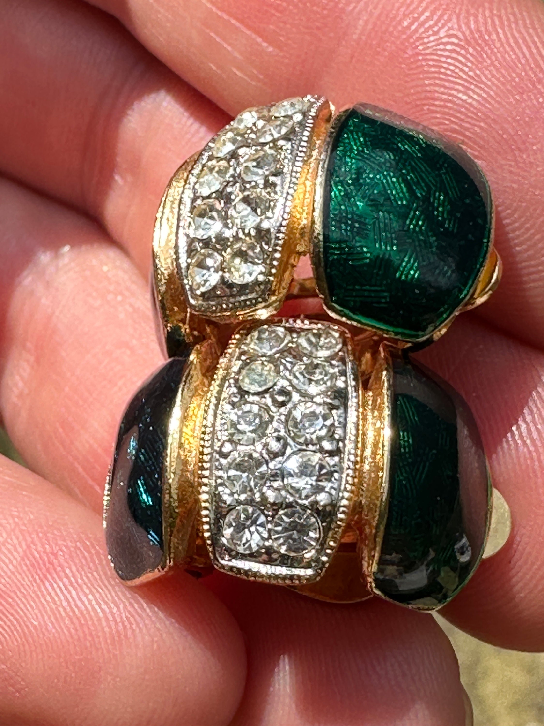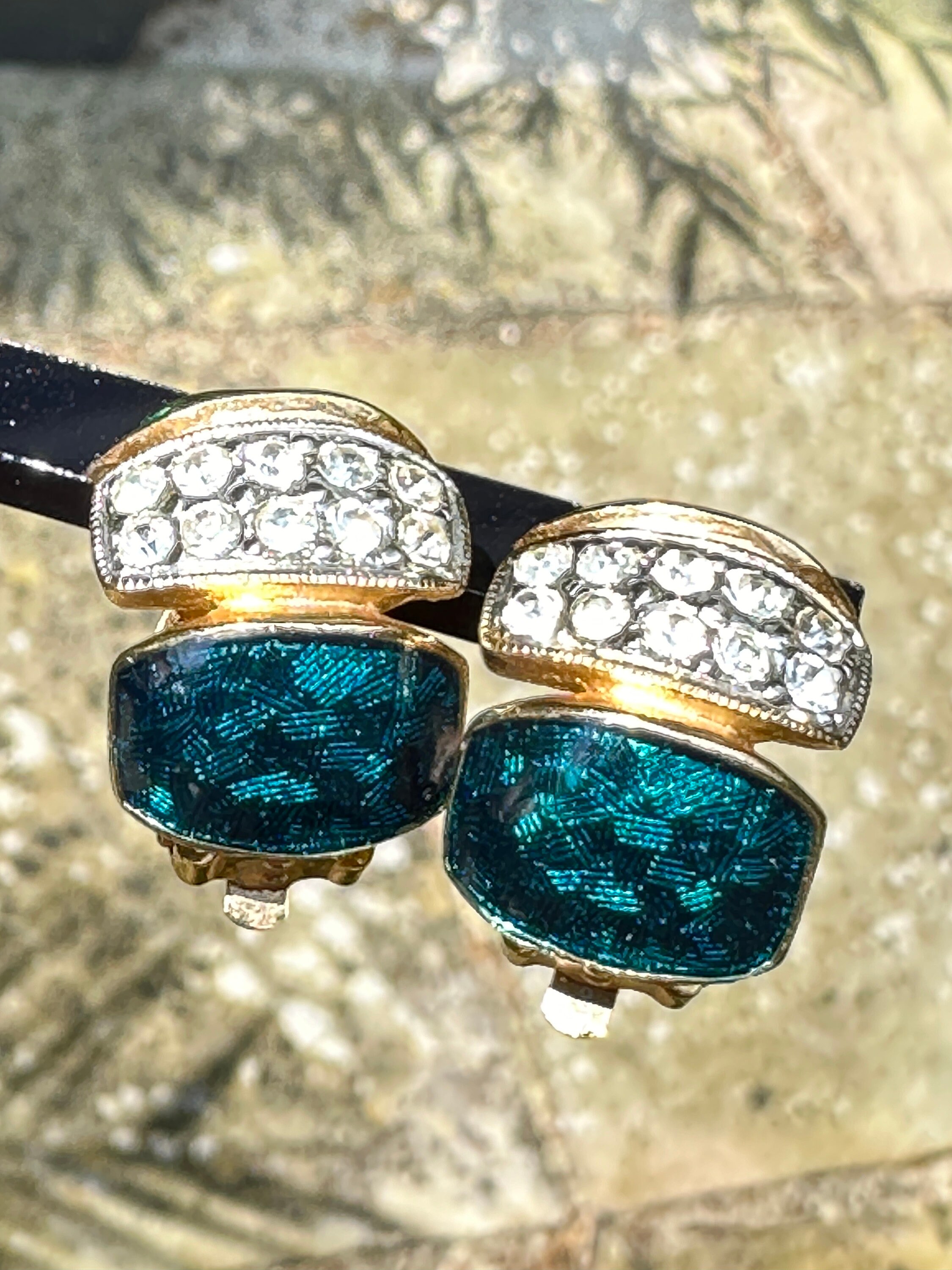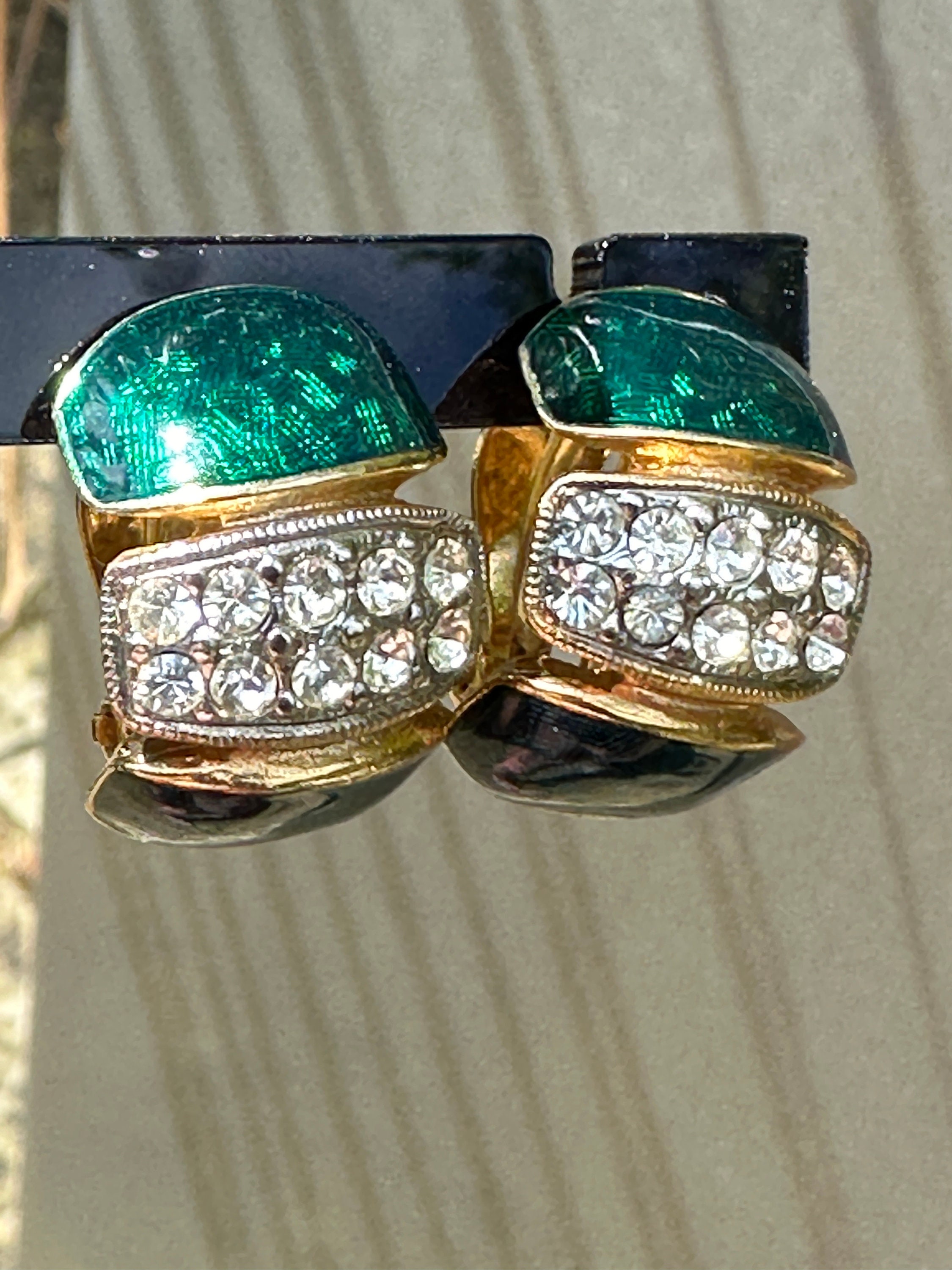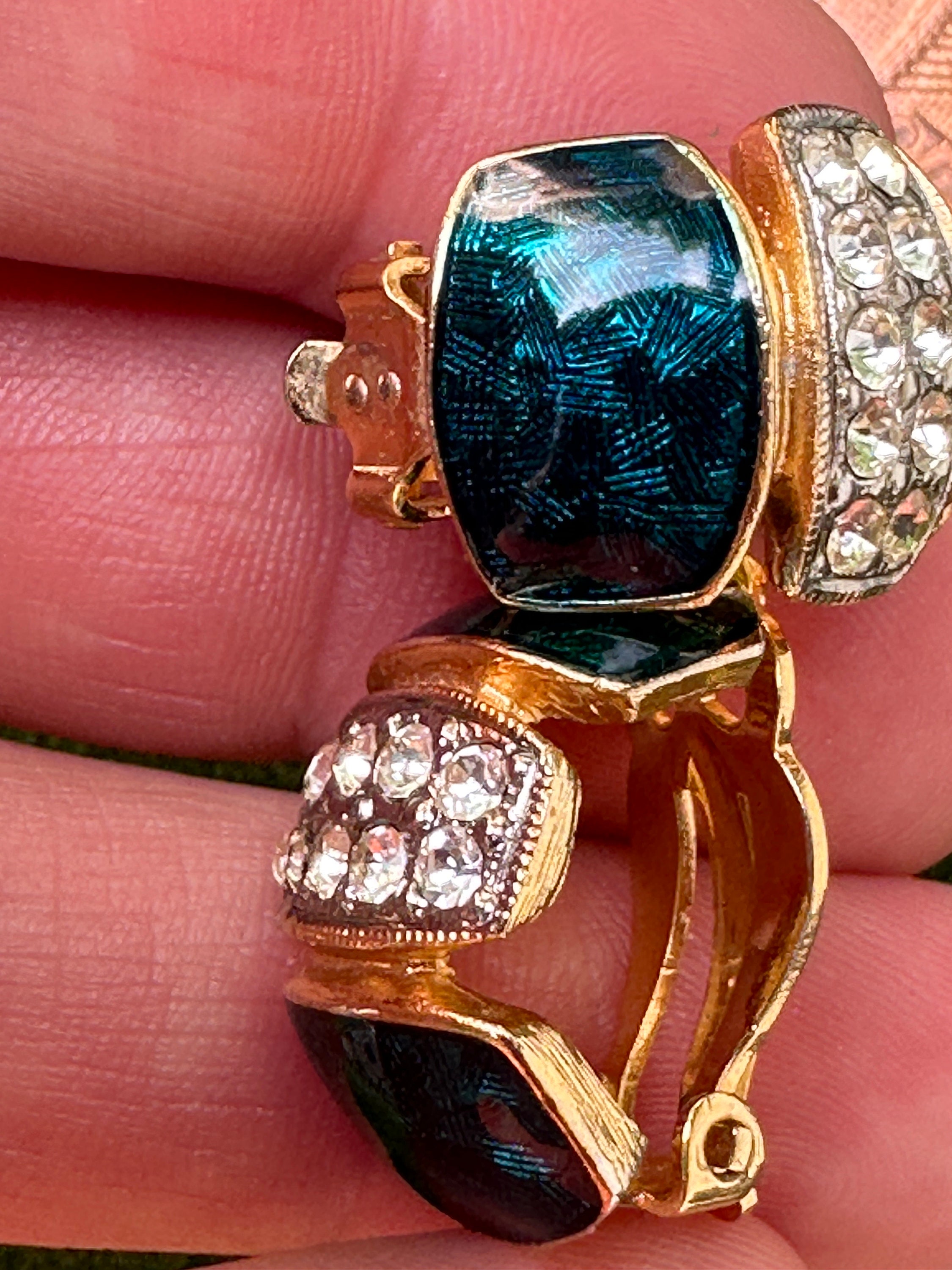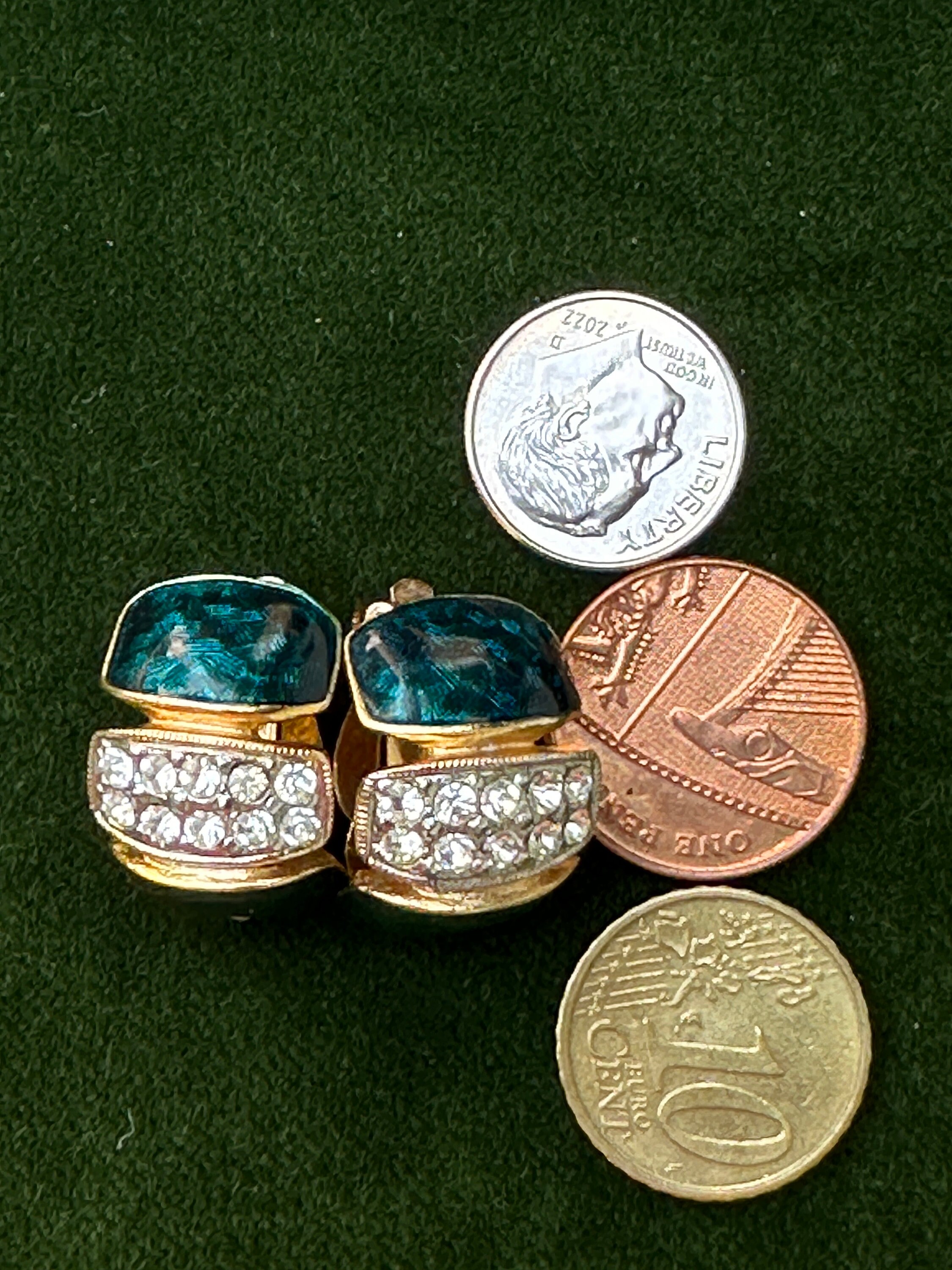 Here are a lovely pair of vintage half hoop earrings they are very well made and feature dark blue and green enamel, pave set crystals and gold plated metal.