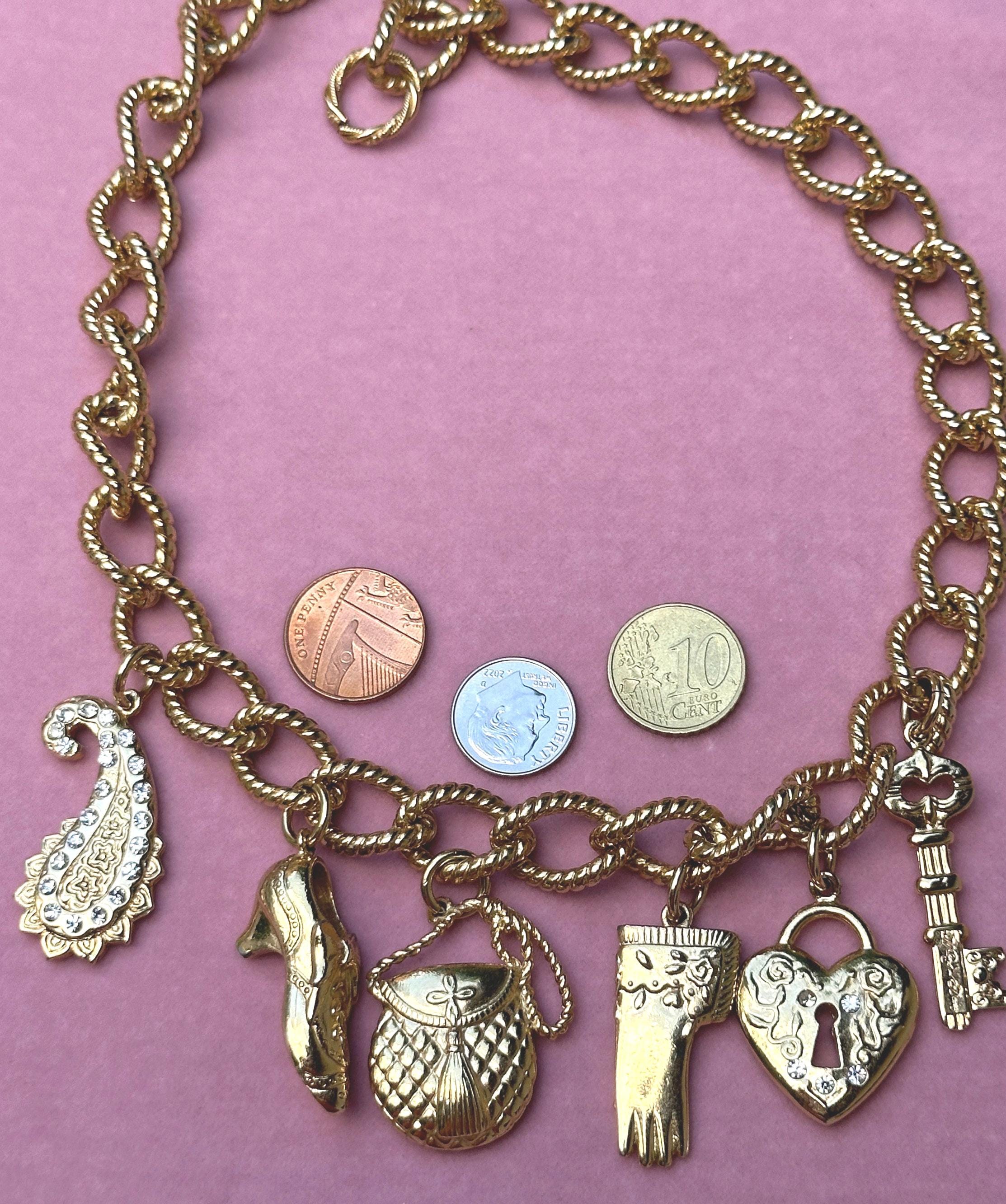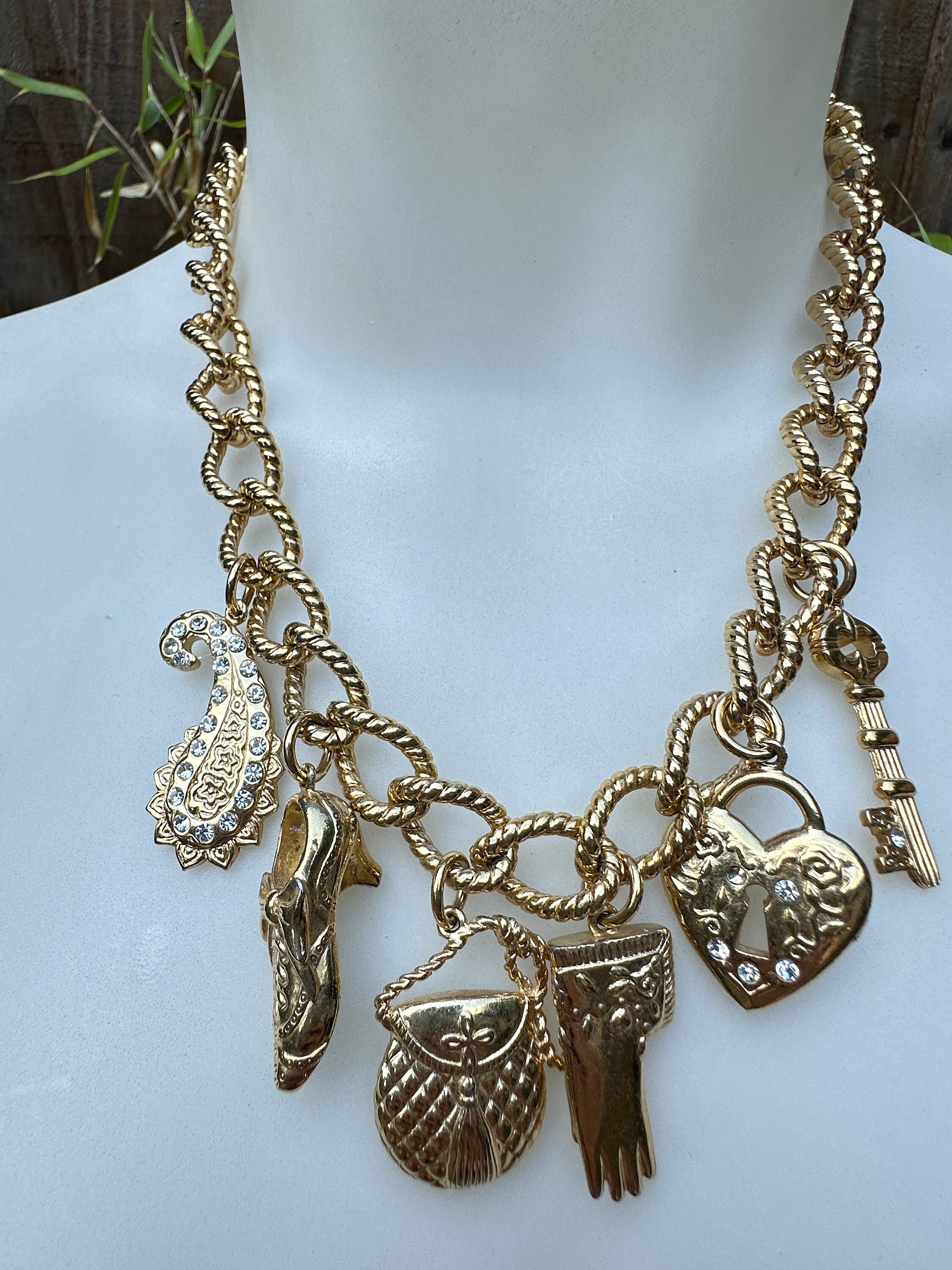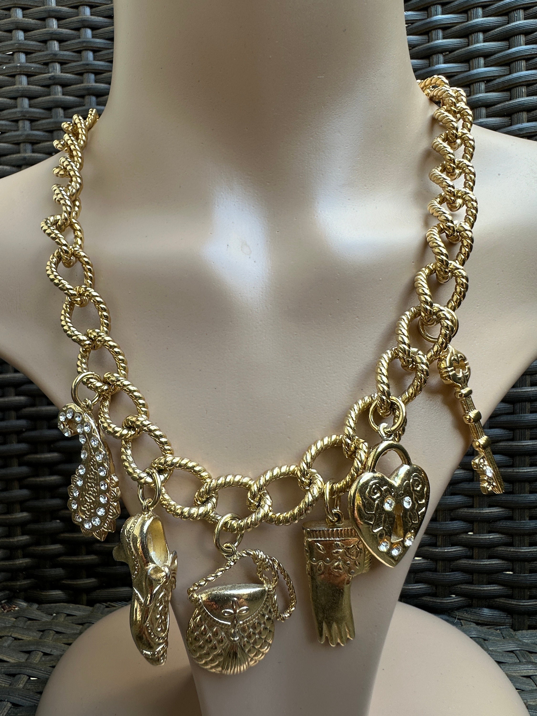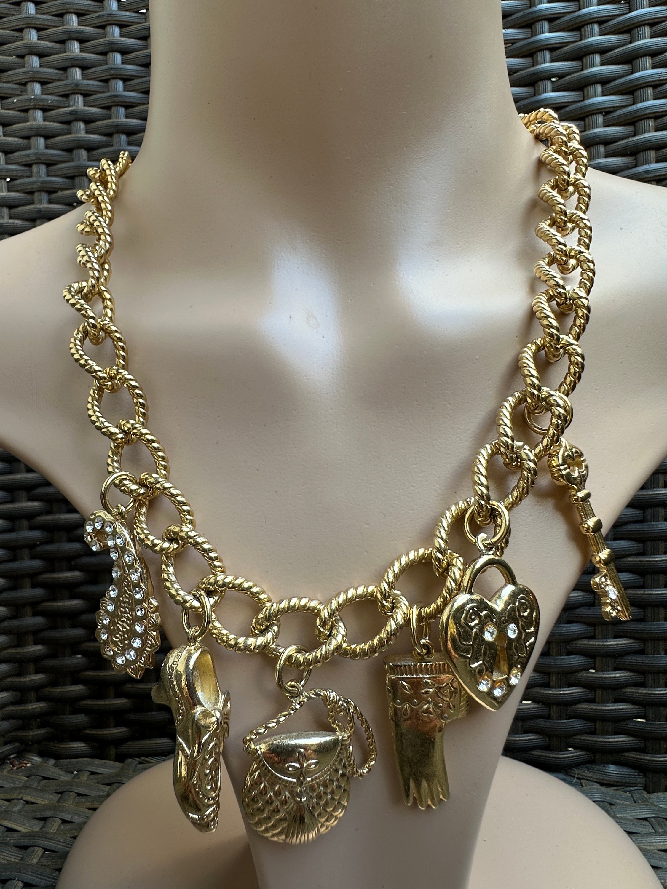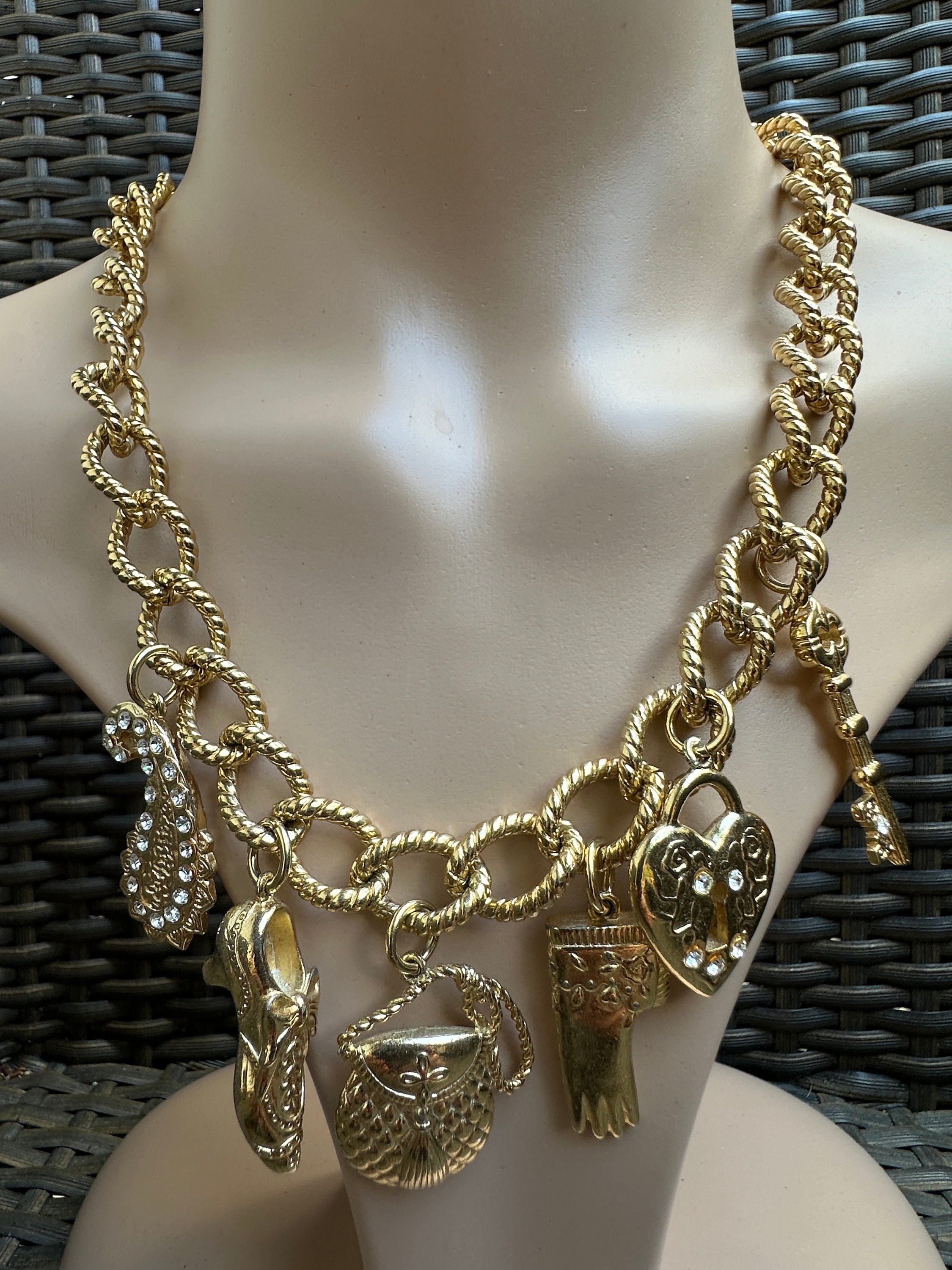 Here is a fabulous Gold plated thick chain charm necklace. This necklace by Whiting & Davis features 6 large charms. It is signed on the key charm. The necklace measures 20 inches in length and remains in excellent condition.