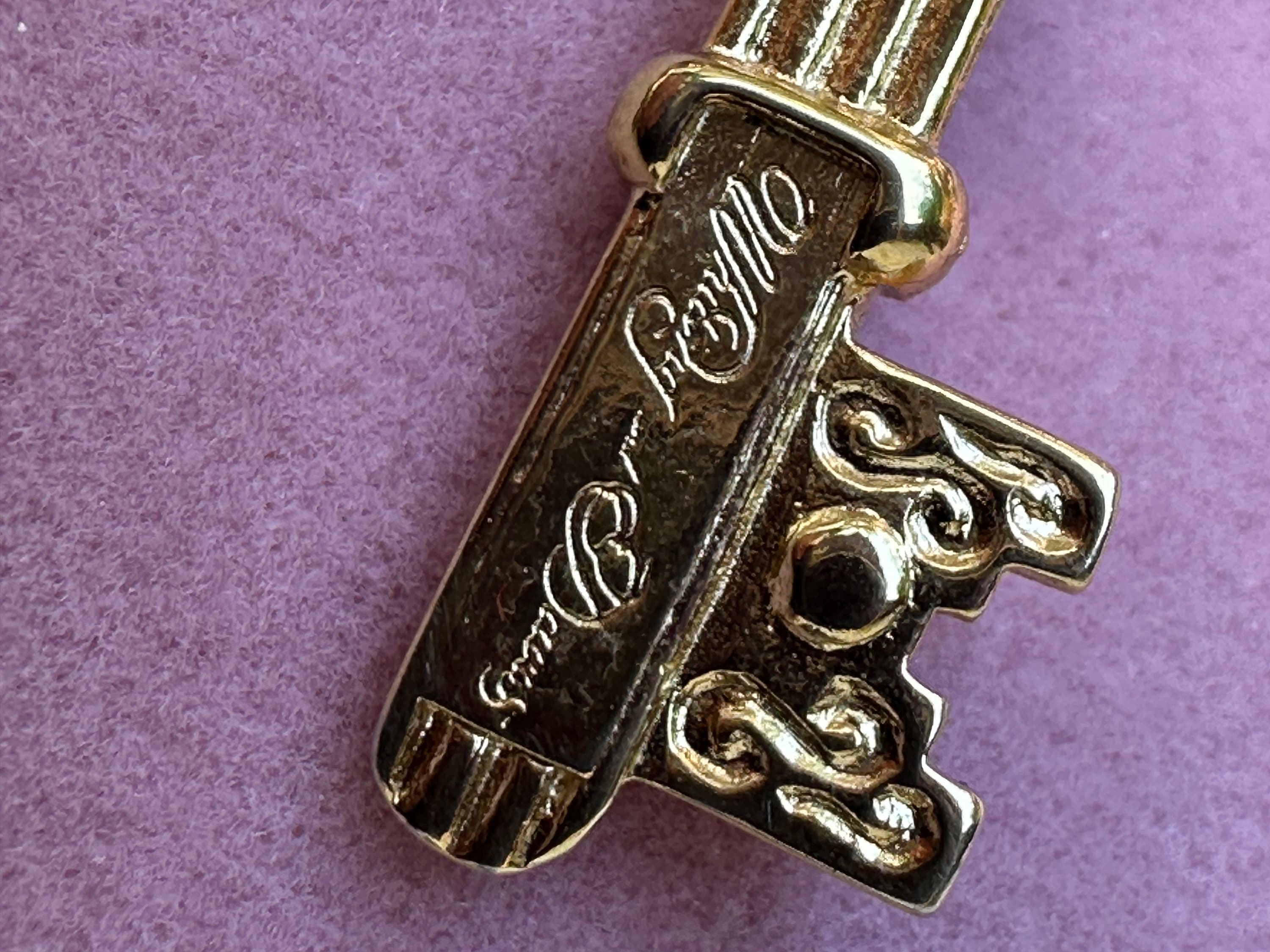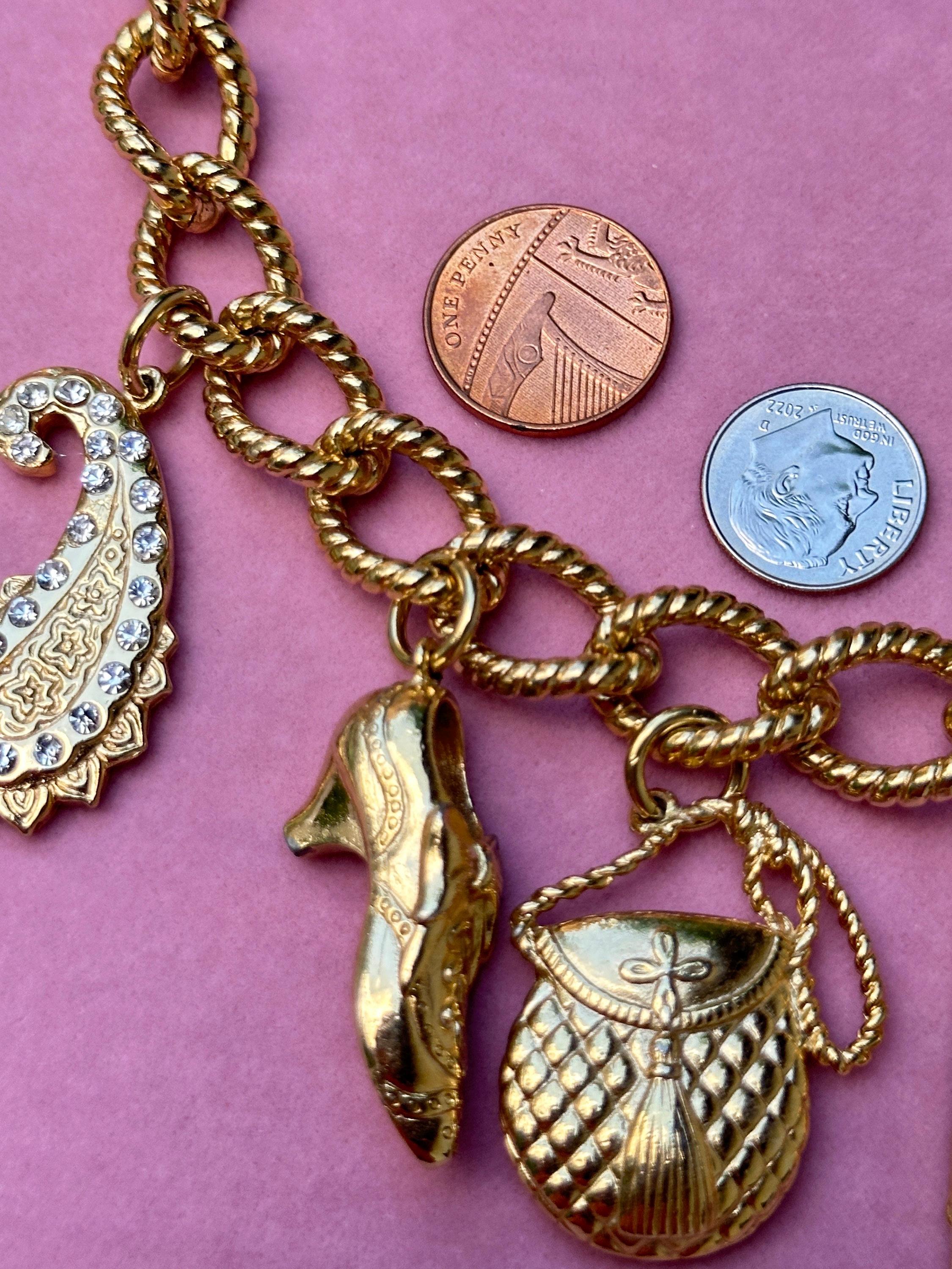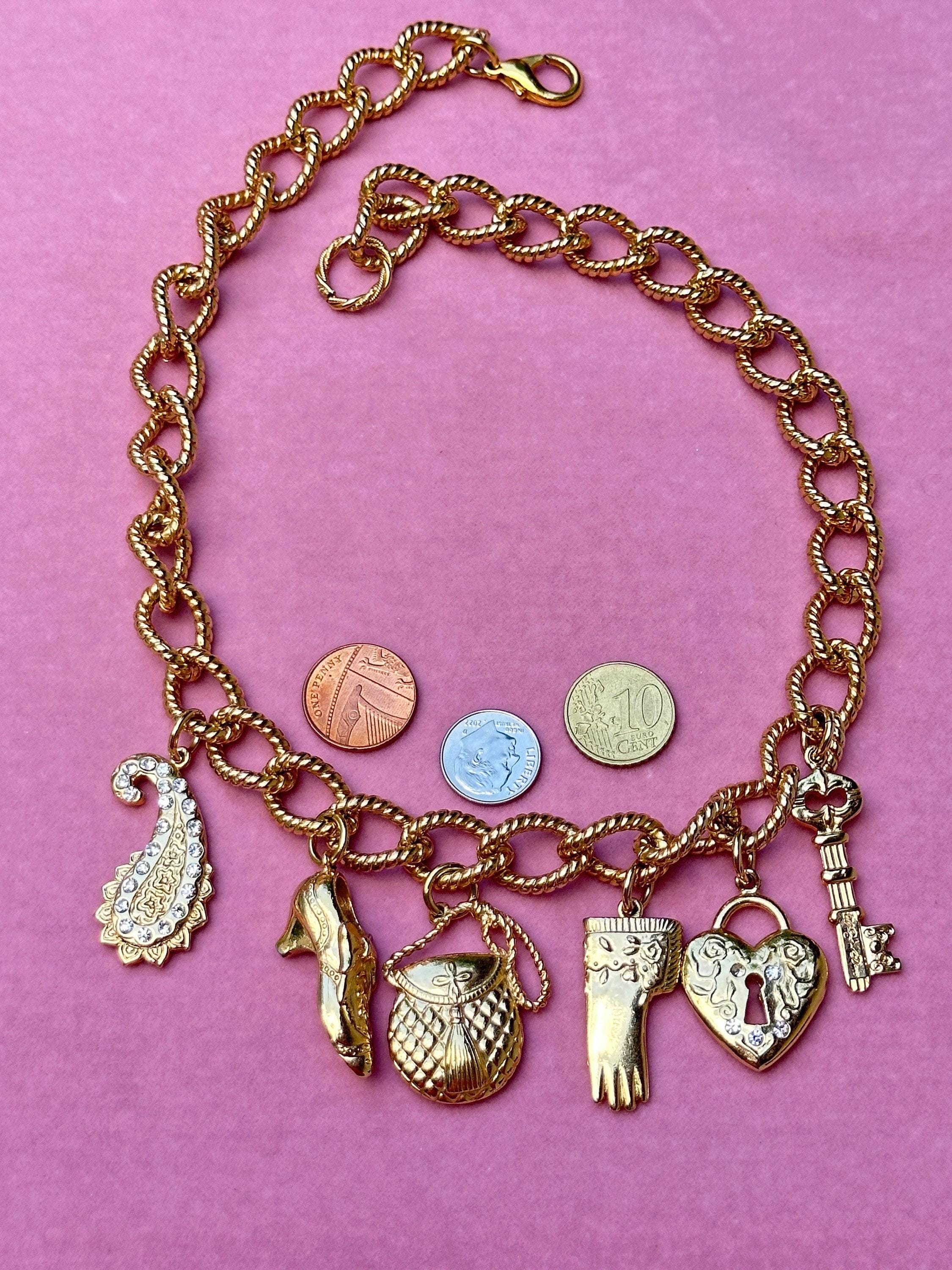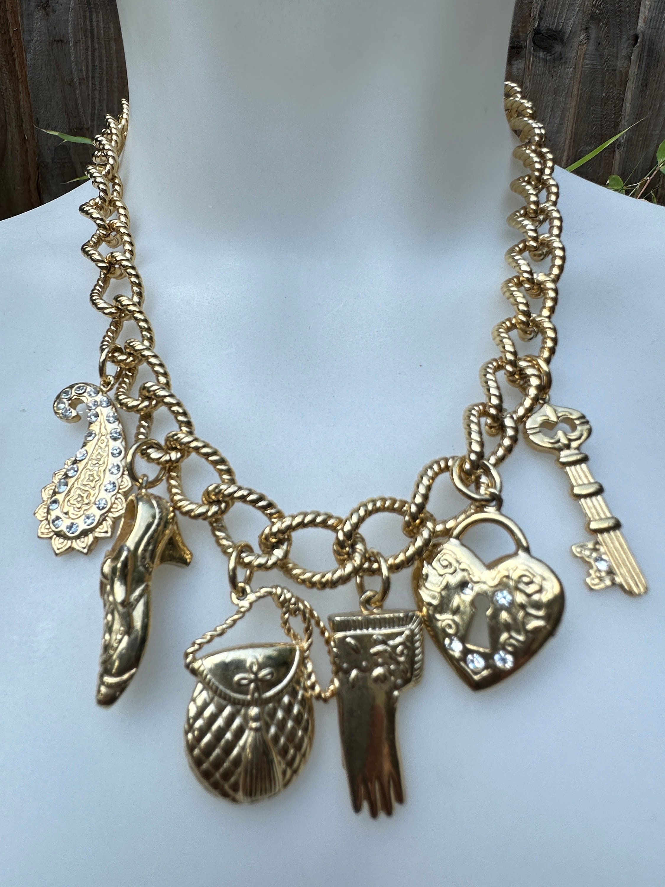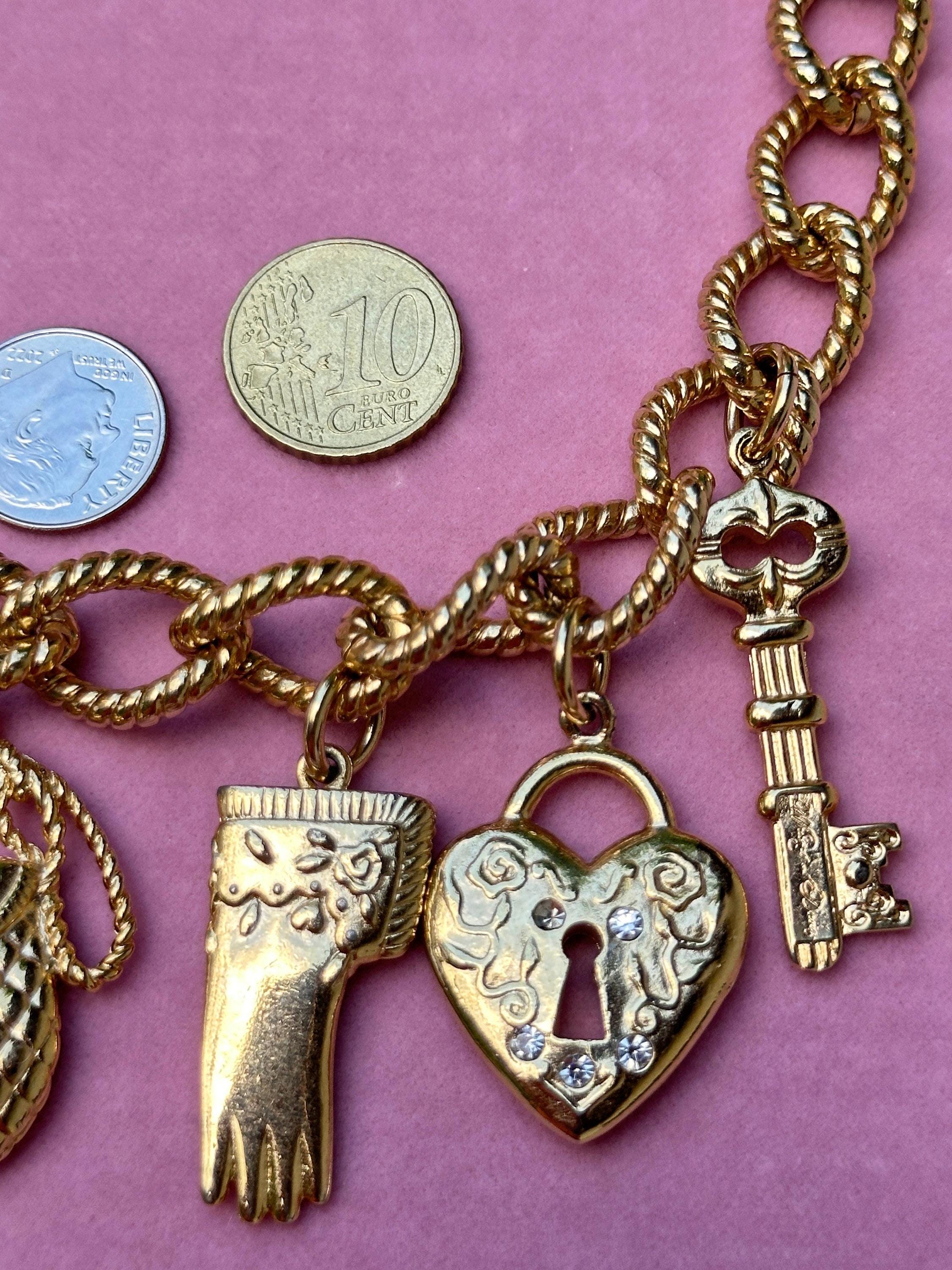 Here is a fabulous Gold plated thick chain charm necklace. This necklace by Whiting & Davis features 6 large charms. It is signed on the key charm. The necklace measures 20 inches in length and remains in excellent condition.
