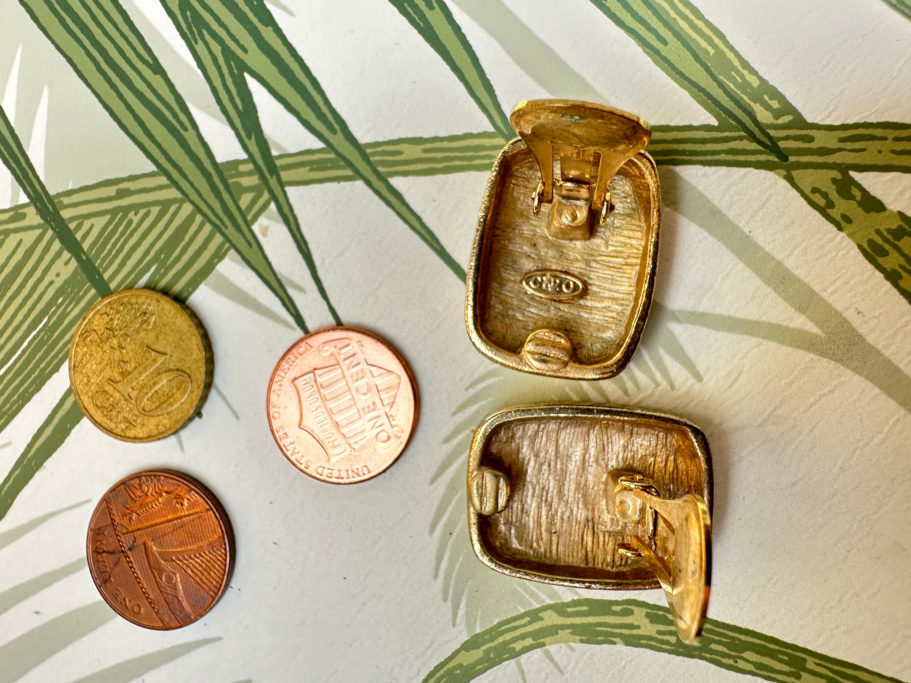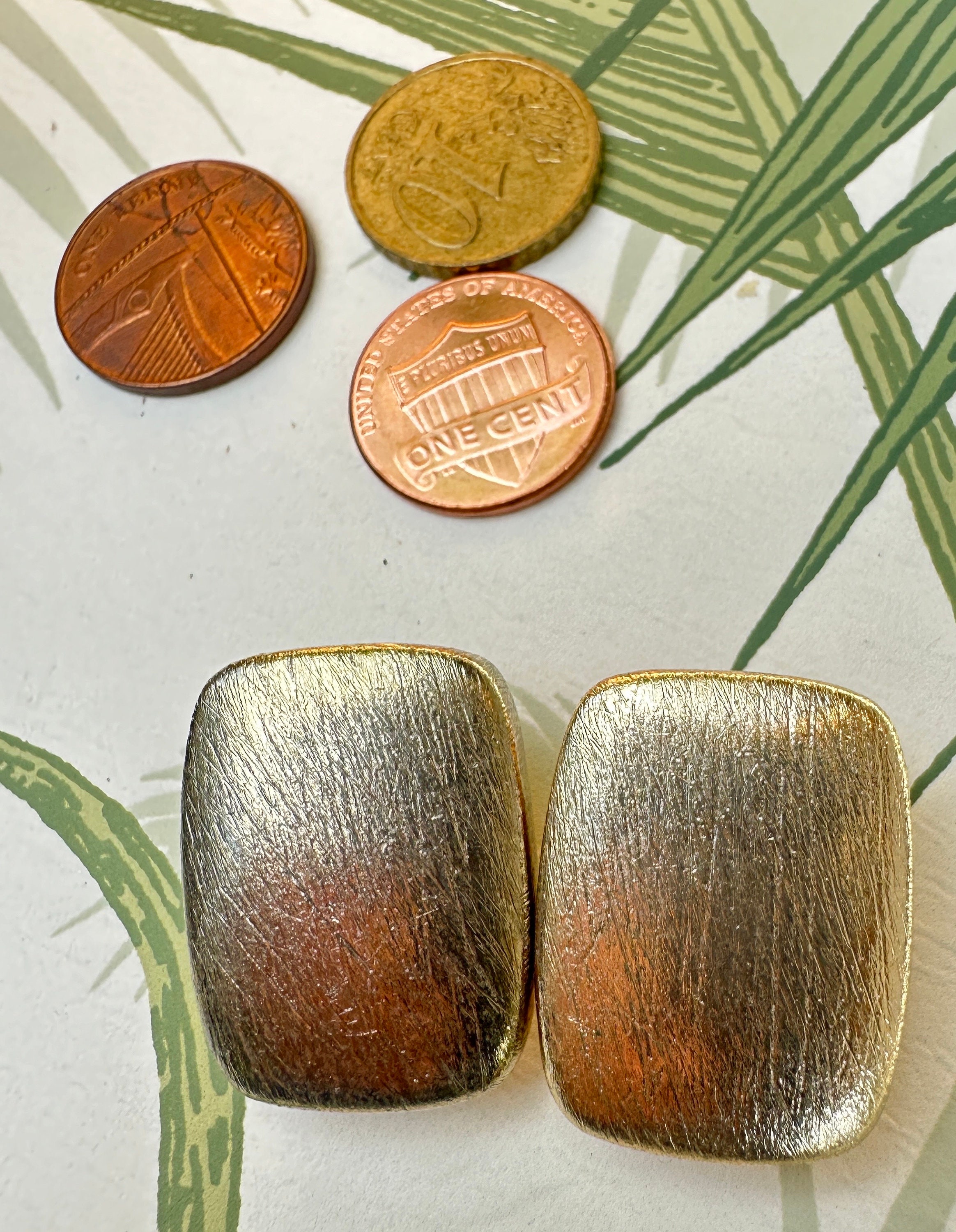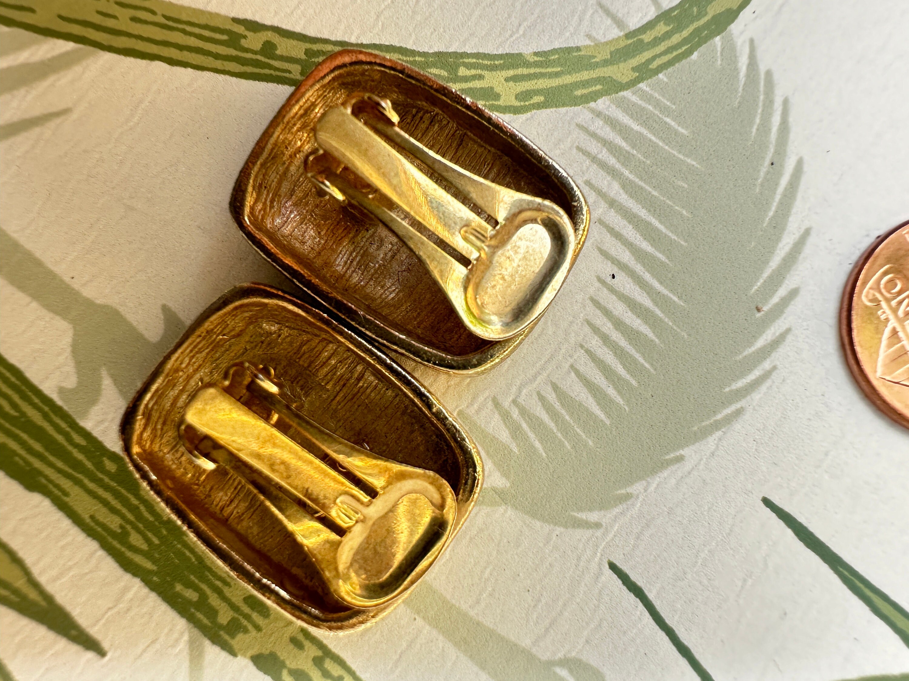 Here are a wonderful pair of vintage clip on earrings. They are made from gold toned metal which has a textured surface . These earrings measure a length of approximately 1 inches in height. They remain in excellent condition with no damage.