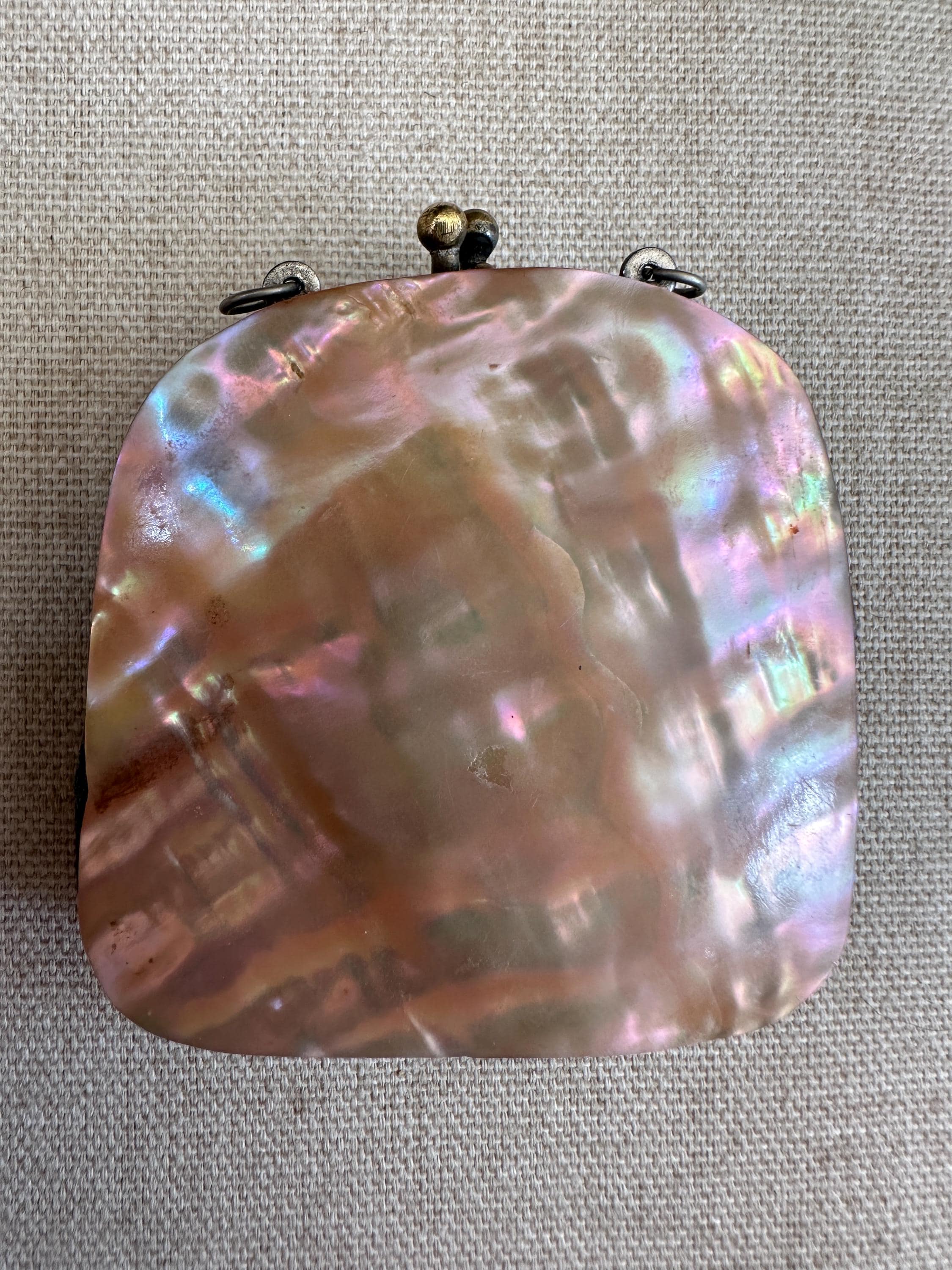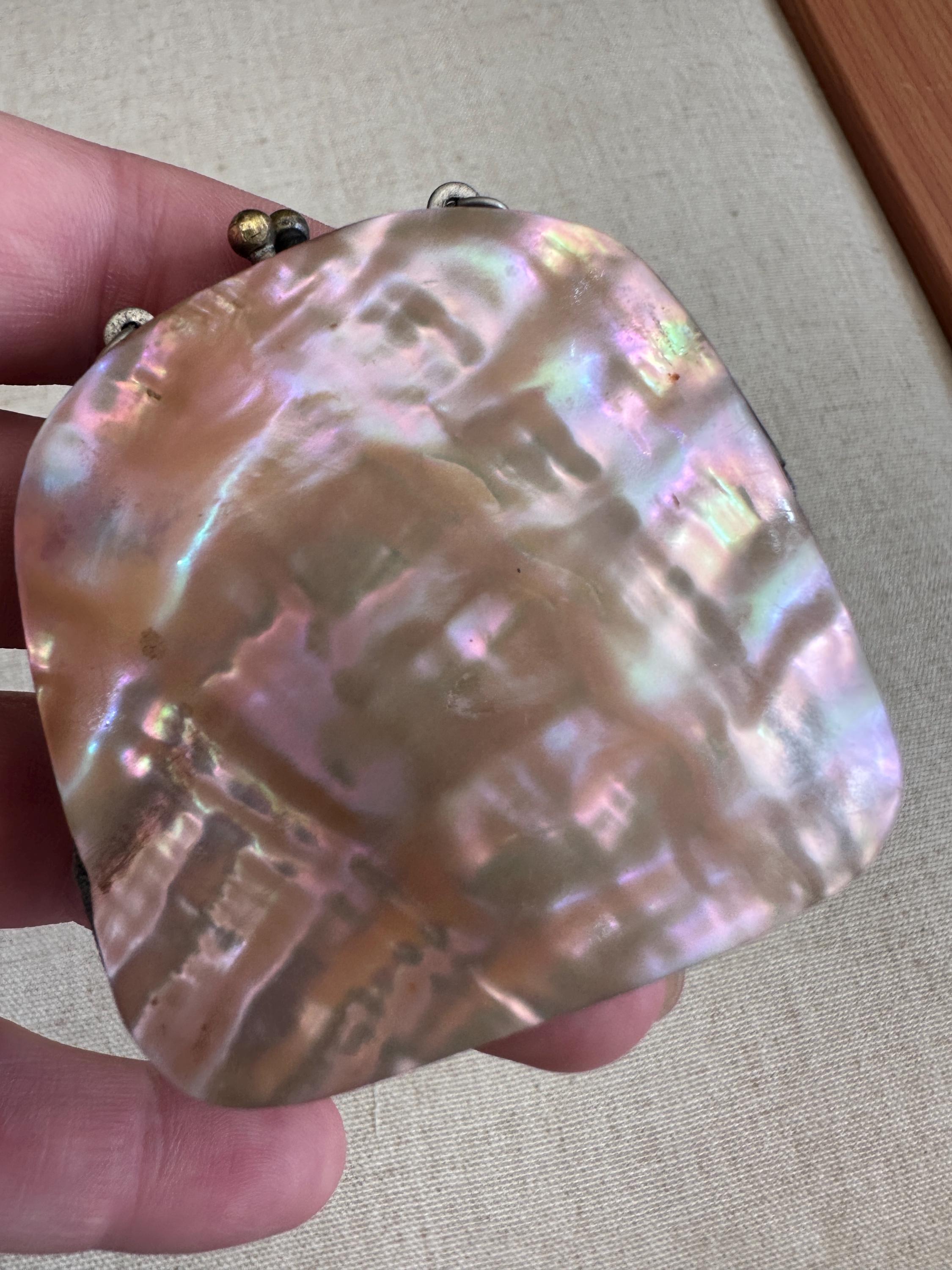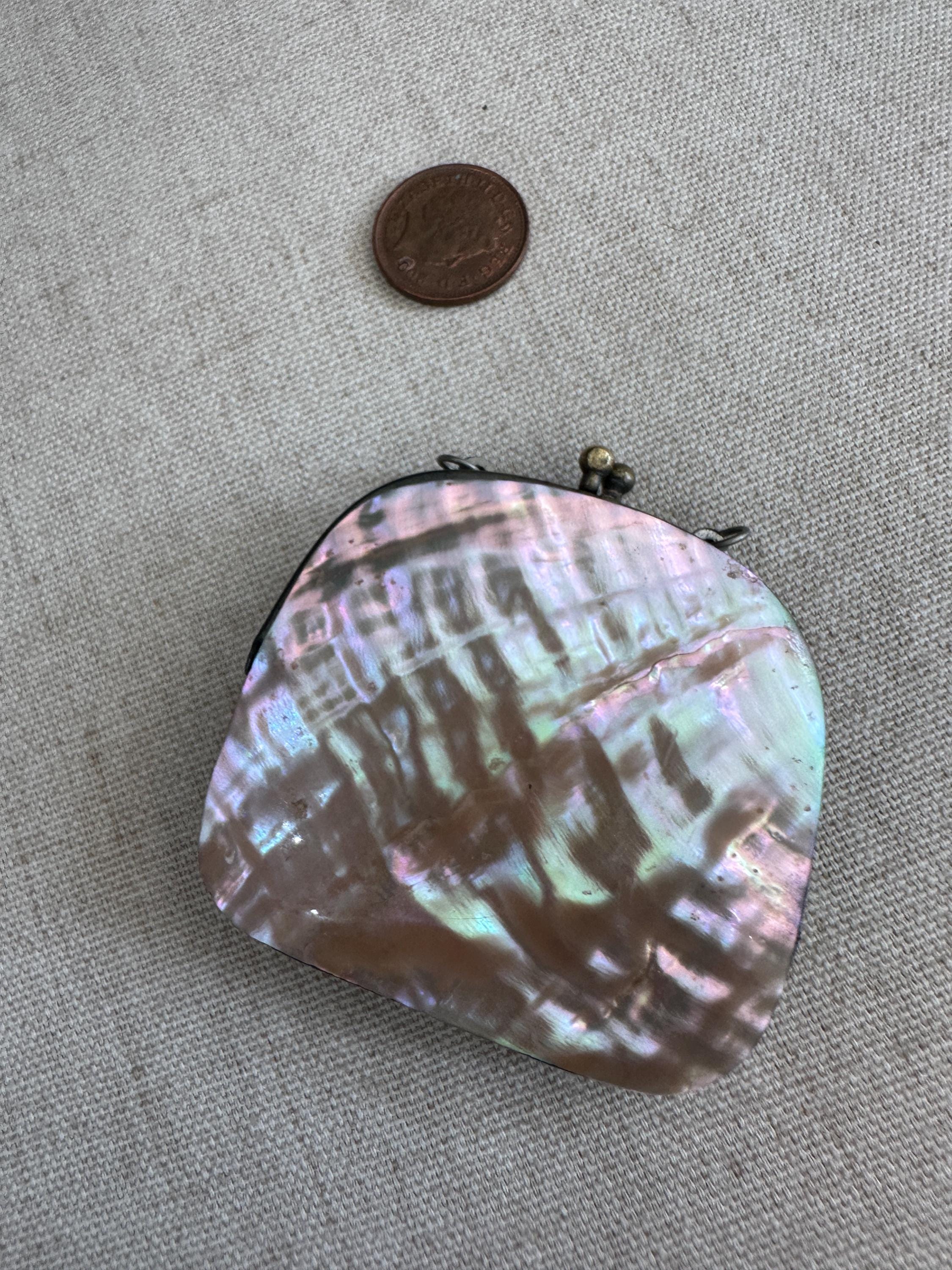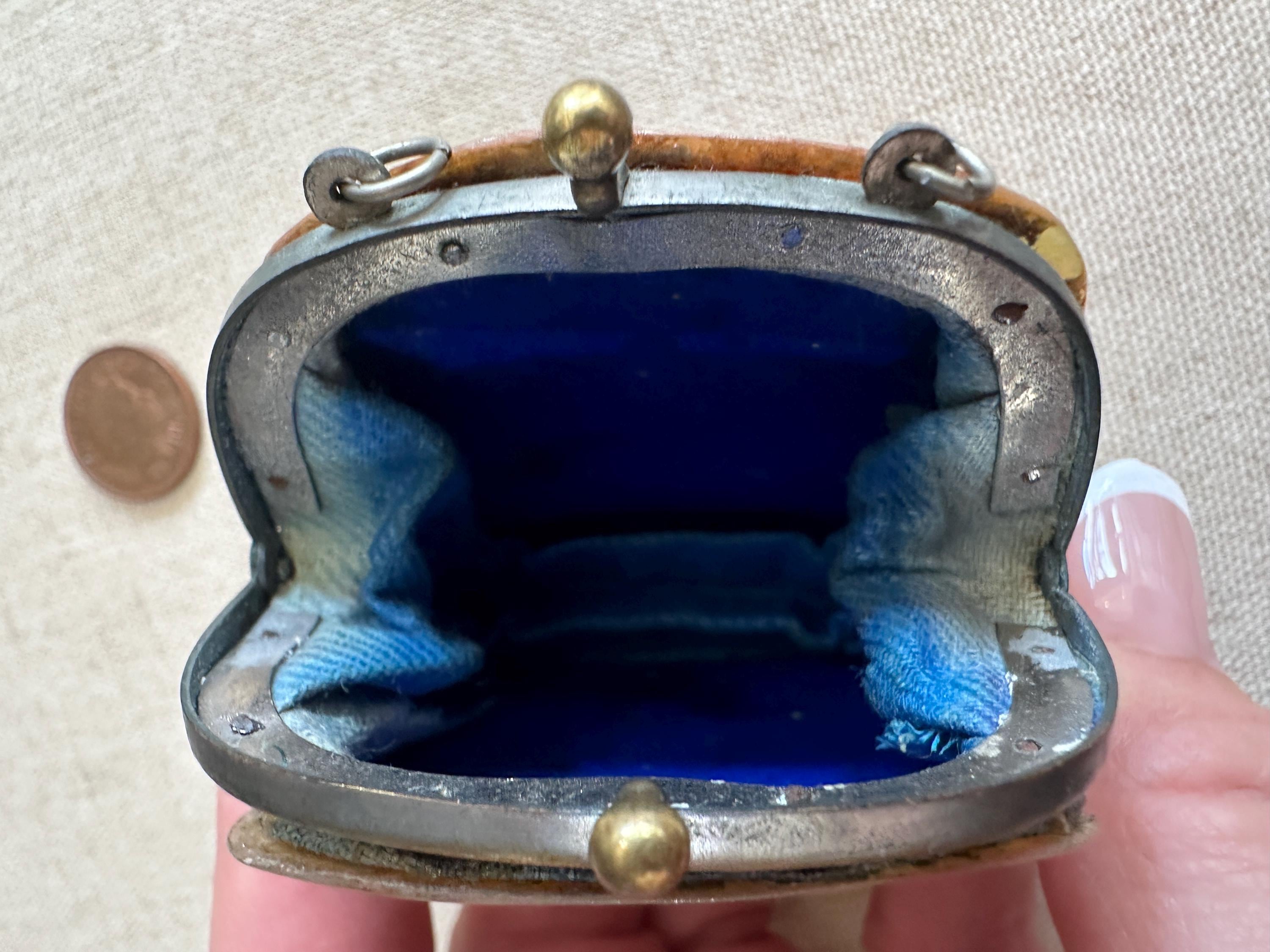 Miniature vintage mother of coin purse Chatelaine c1910. This lovely vintage coin purse measures approximately 6.5 cm in height by 6cm in length and has a depth of approximately 4cm. This piece has two hooks on which a chain would have hung and joined a chatelaine. This could easily be made into a necklace .