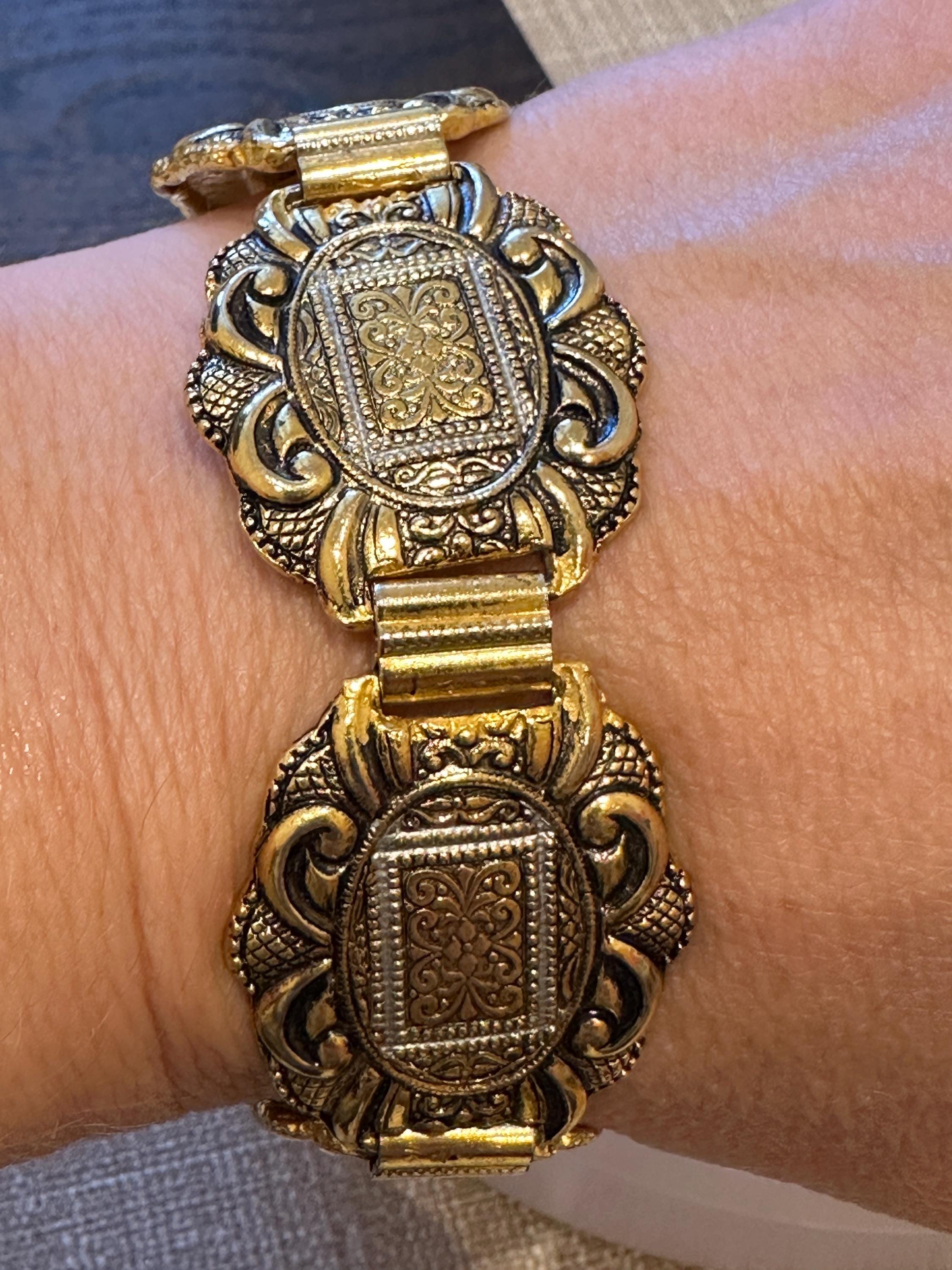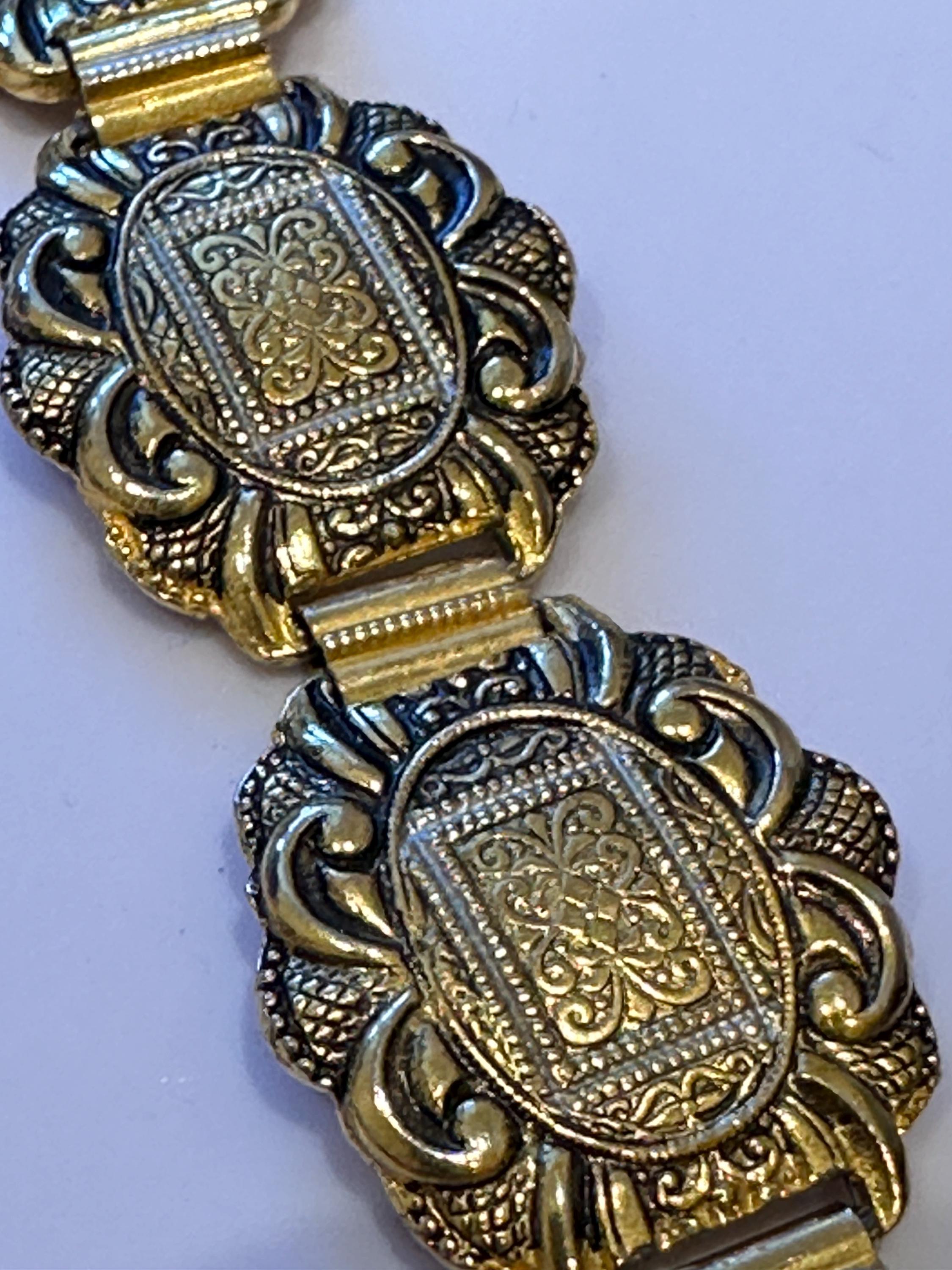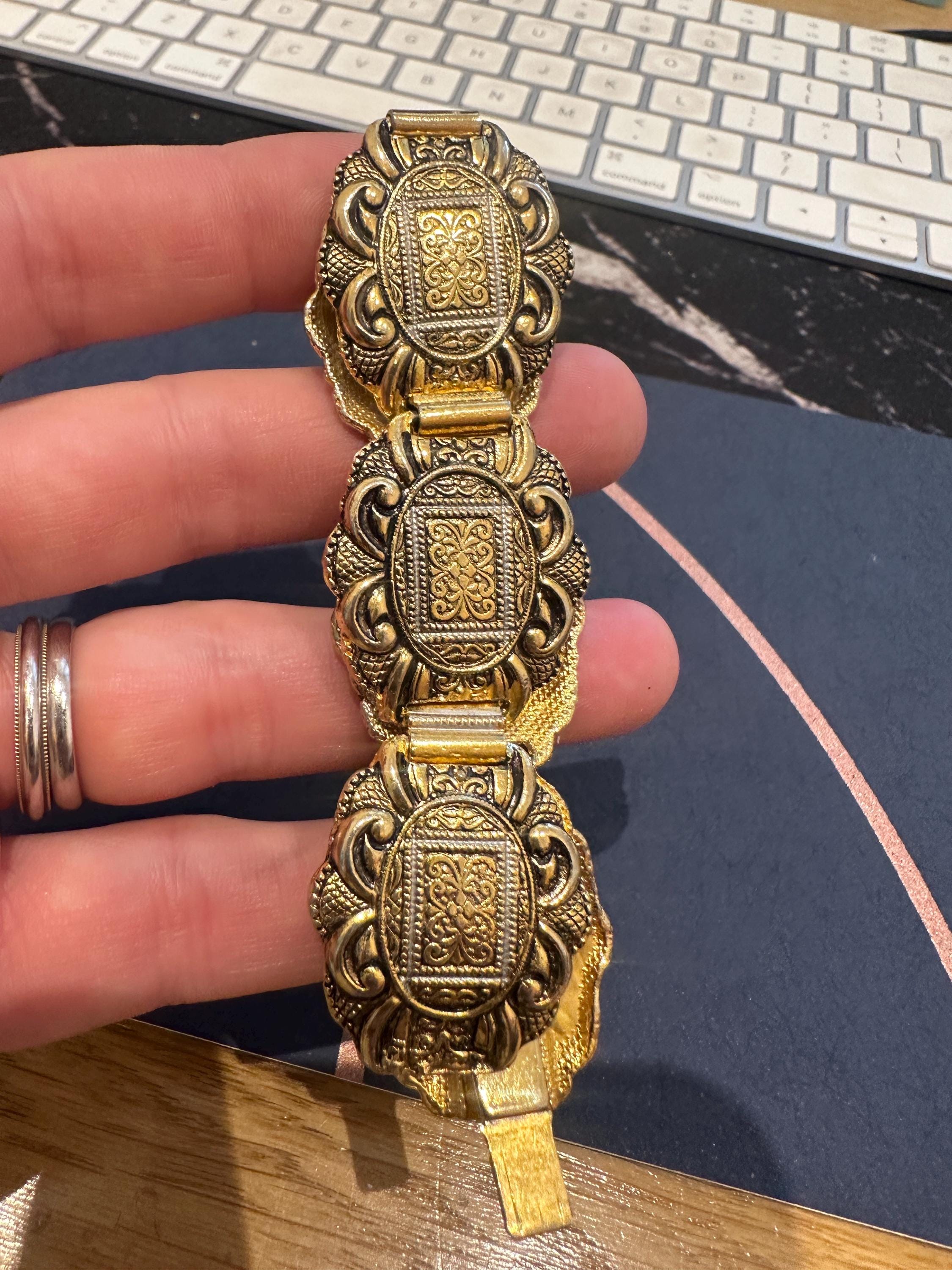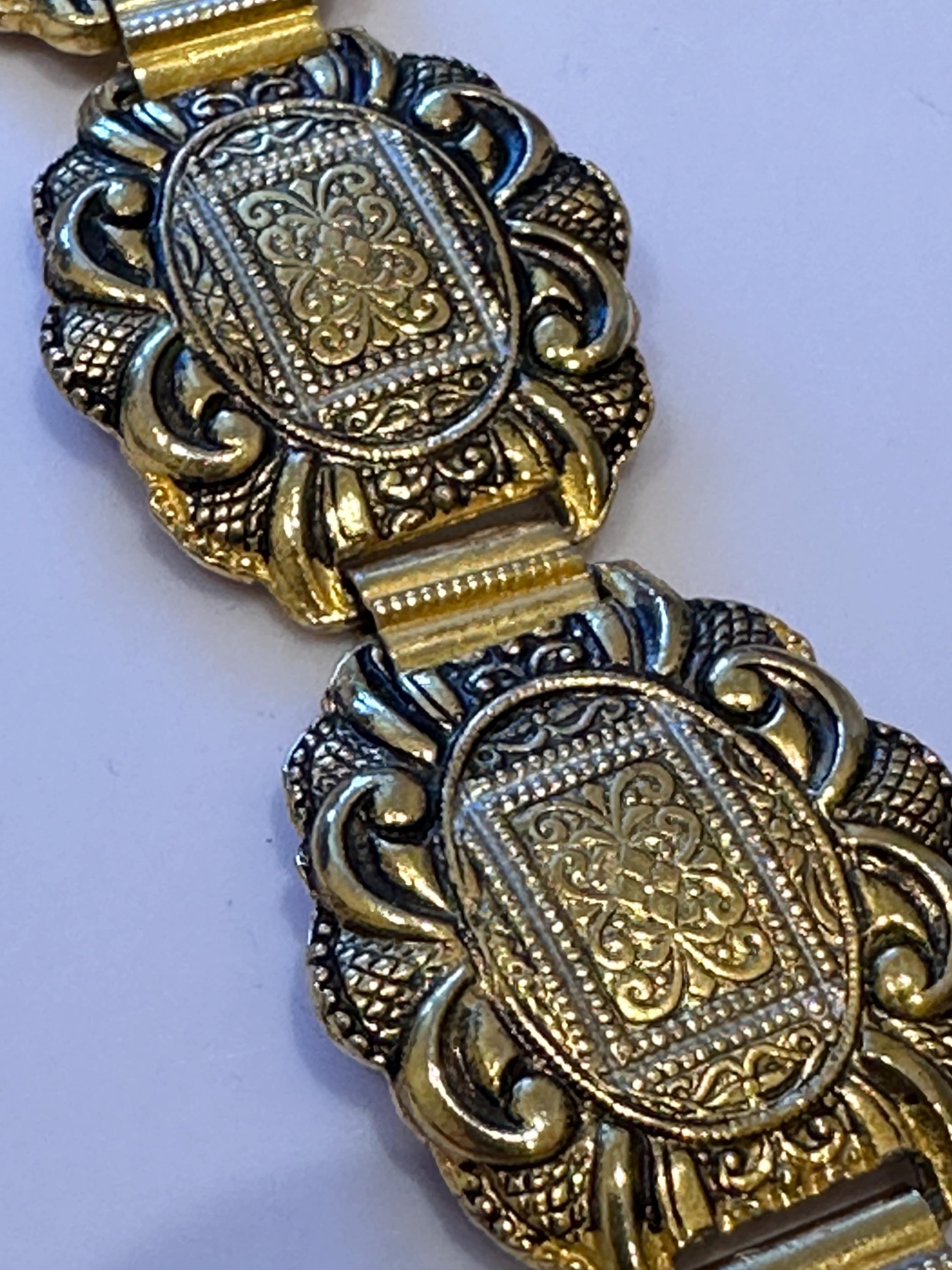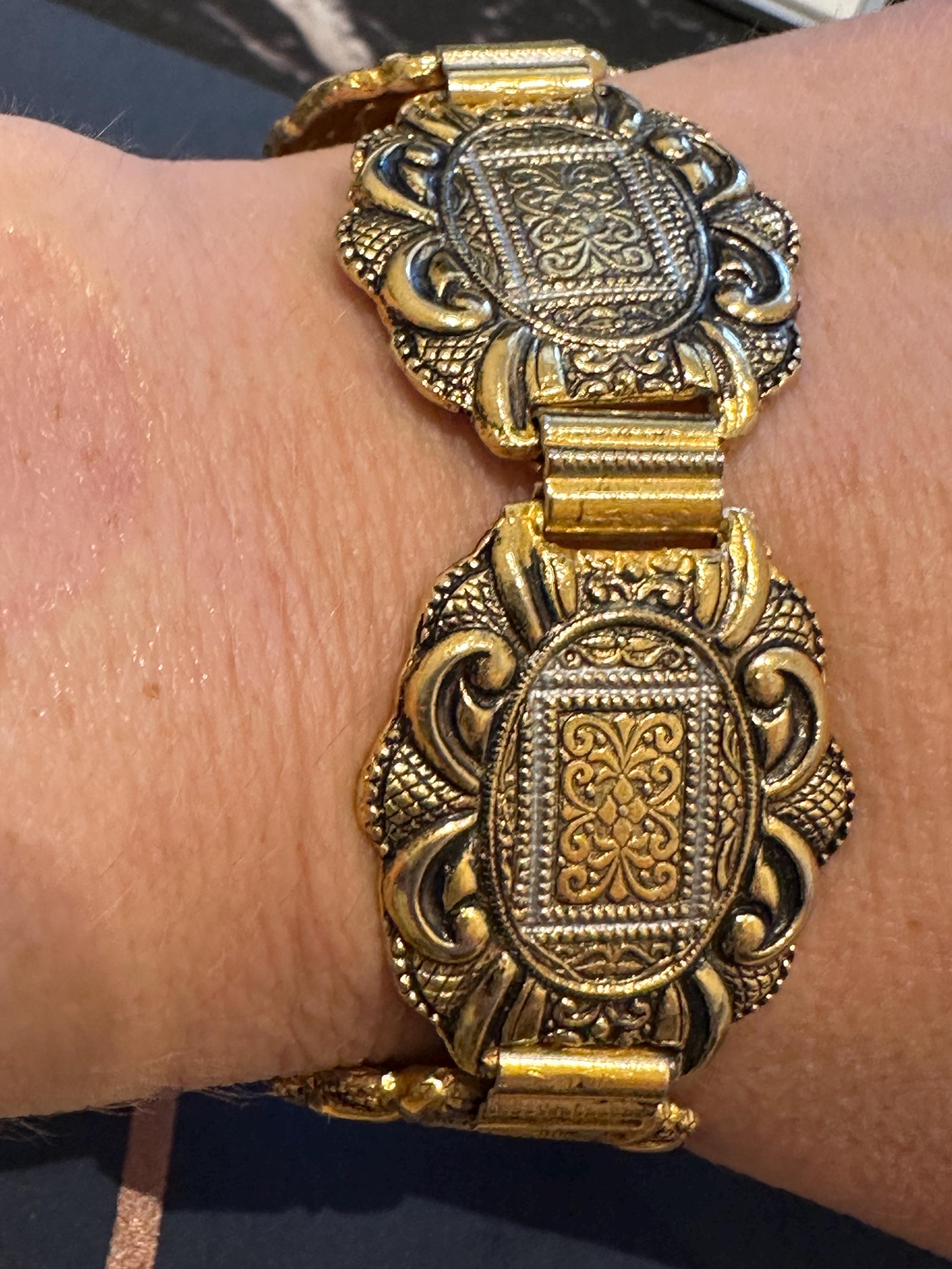 Vintage 60’s Toledoware panelled bracelet. Gold toned with a raised design. It measures 7.5inches in length and 1 inch in width.