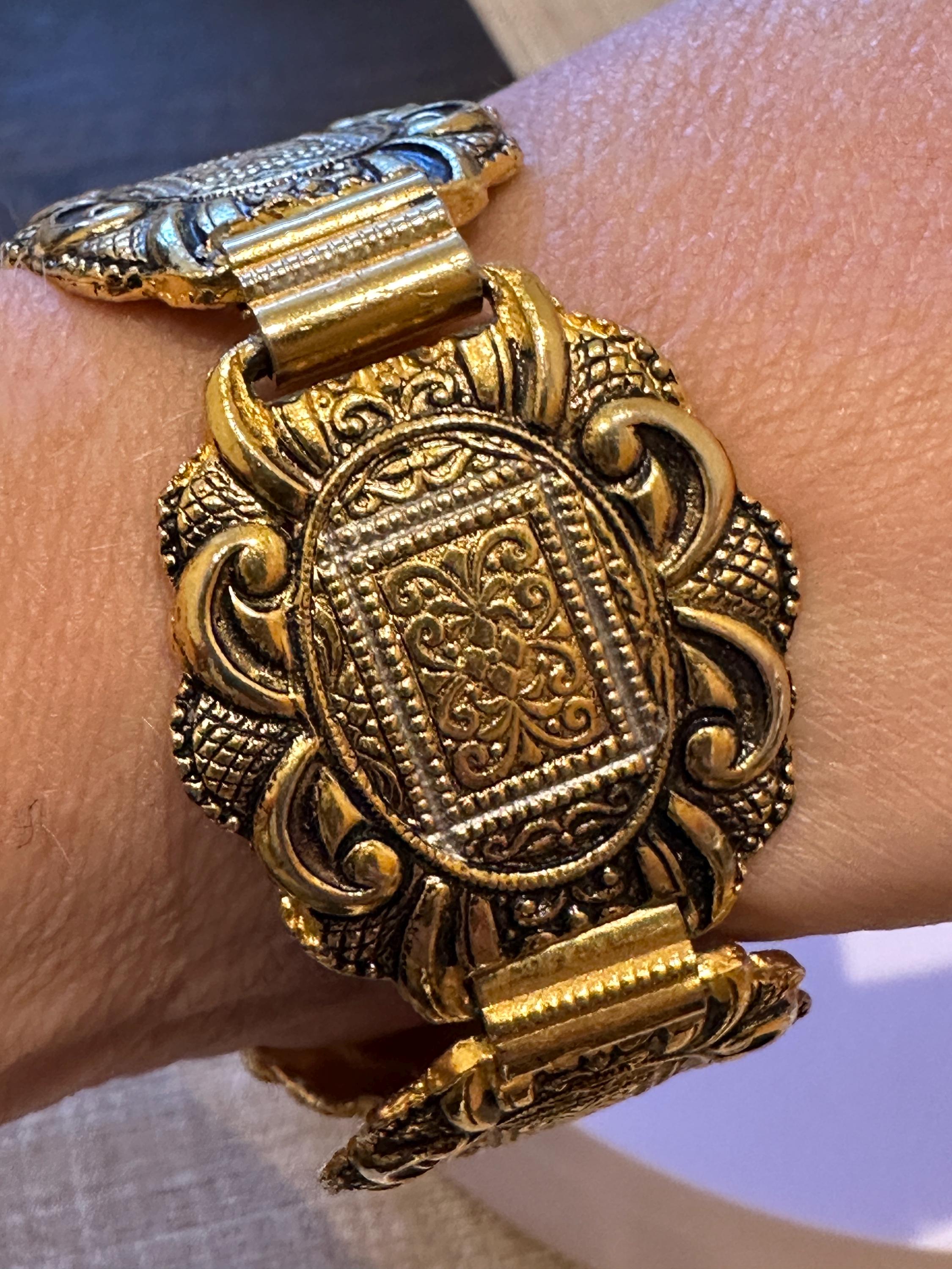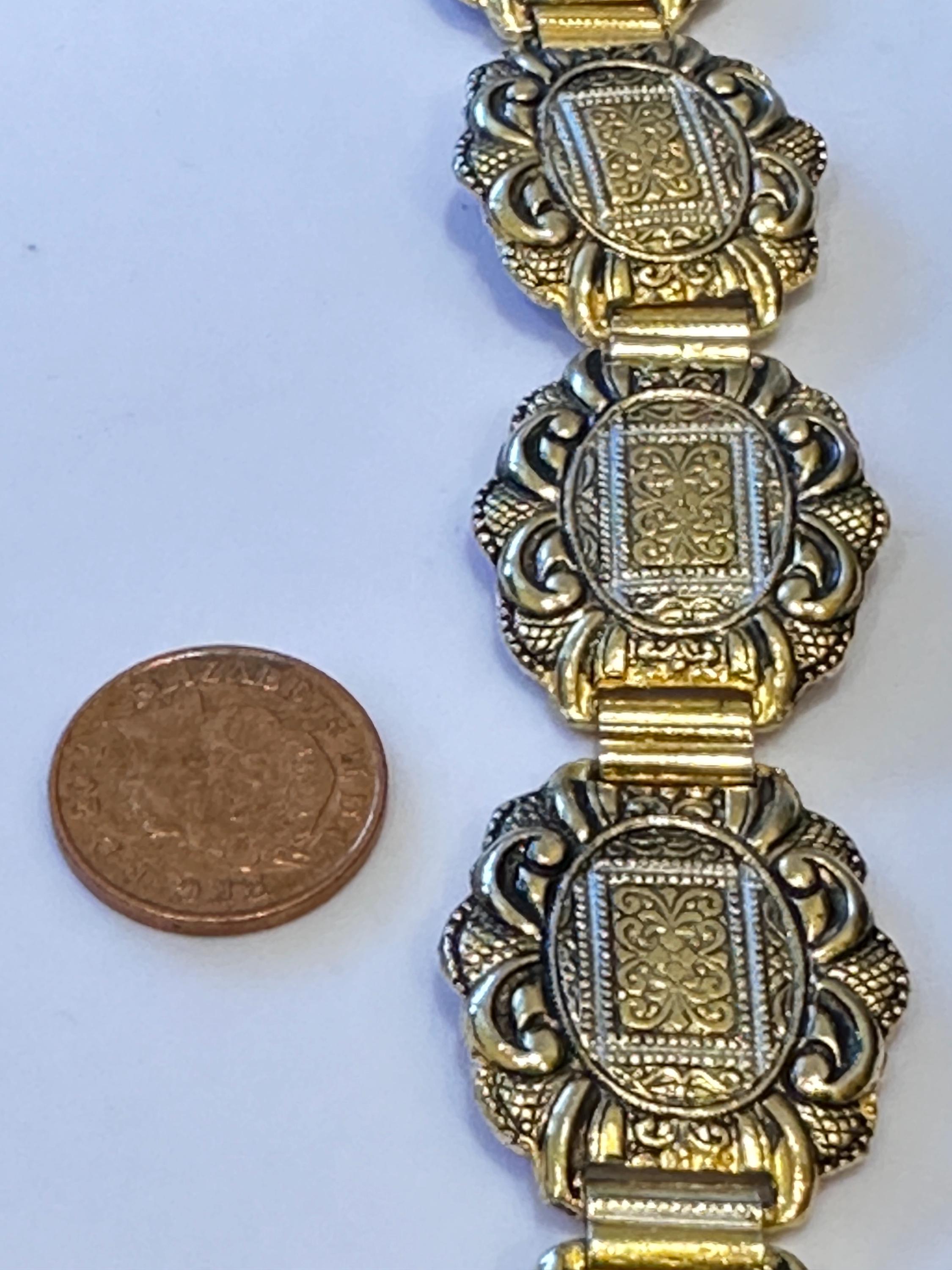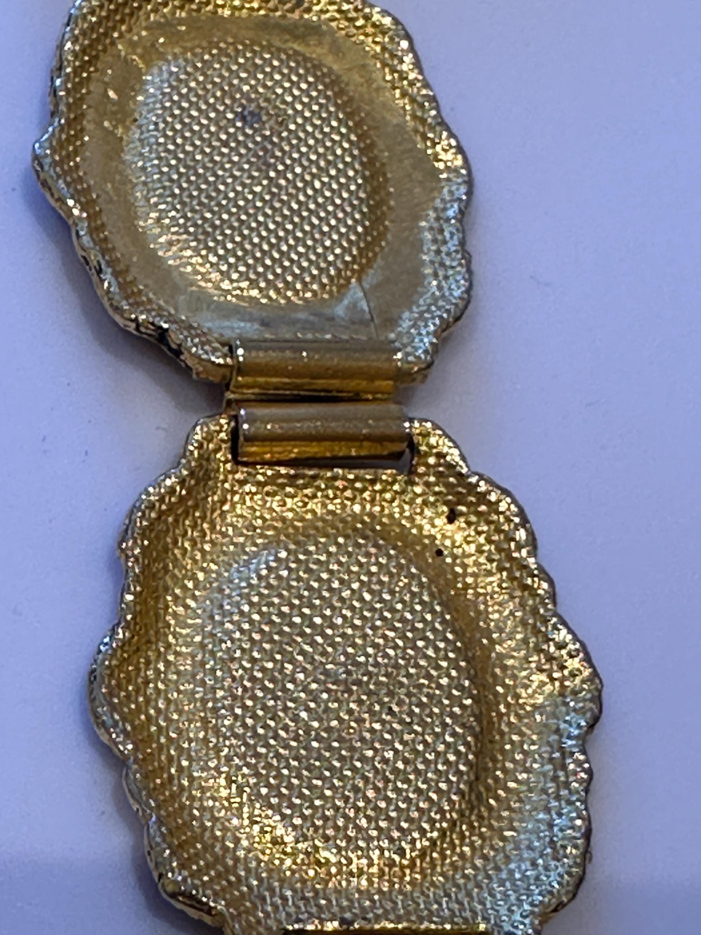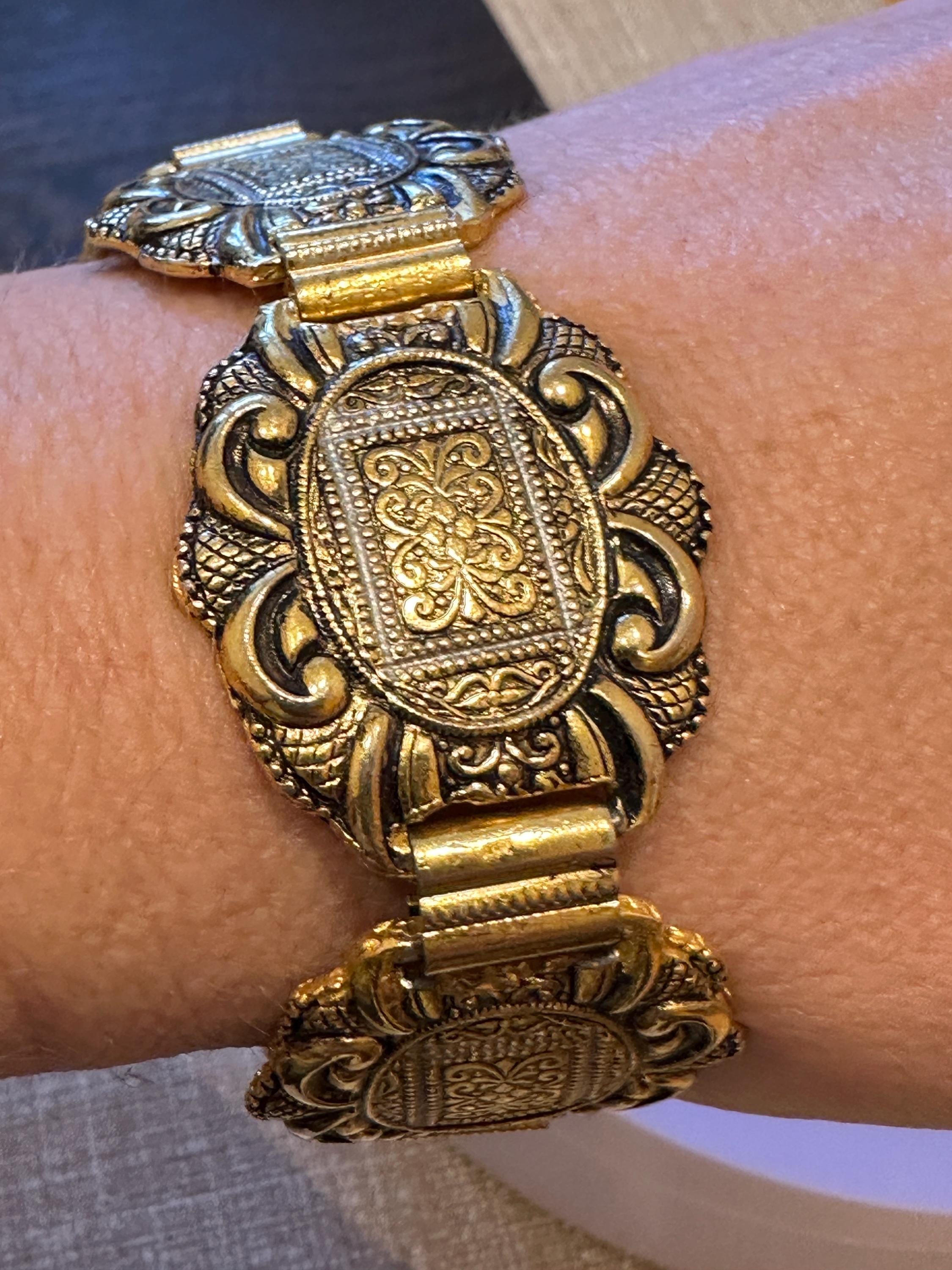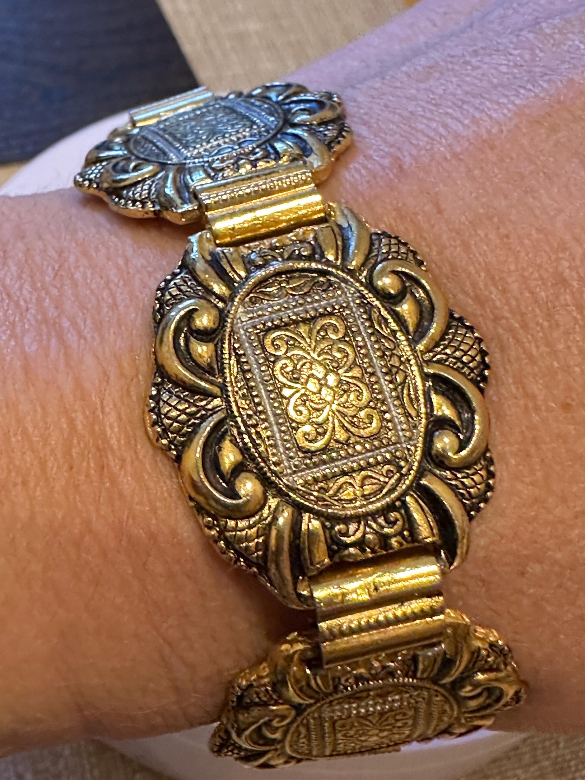 Vintage 60’s Toledoware panelled bracelet. Gold toned with a raised design. It measures 7.5inches in length and 1 inch in width.