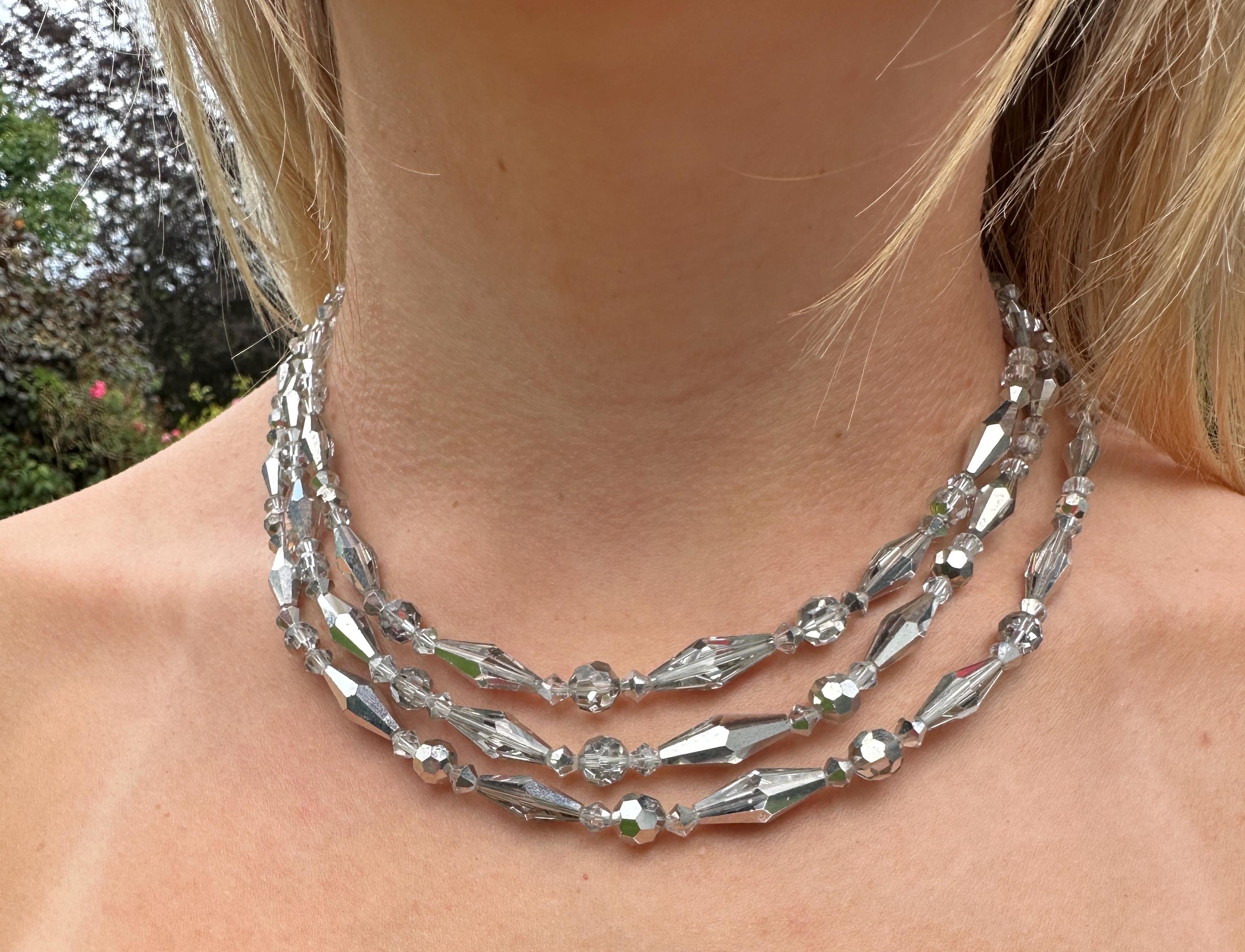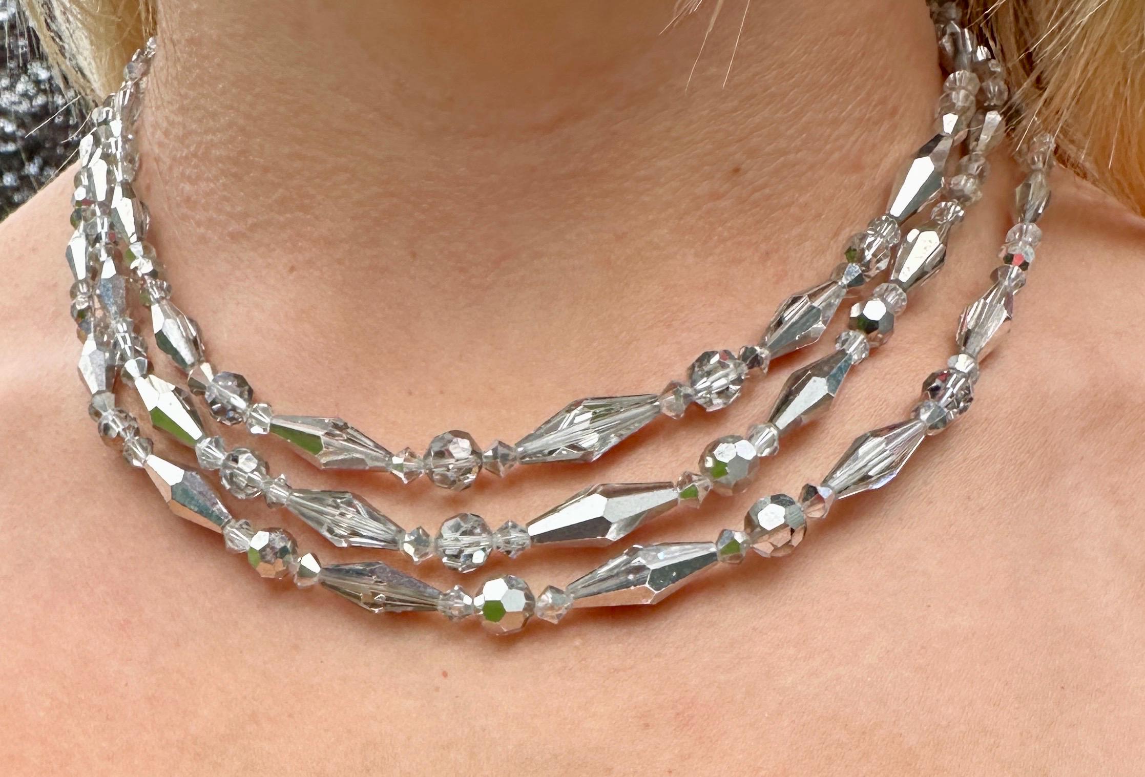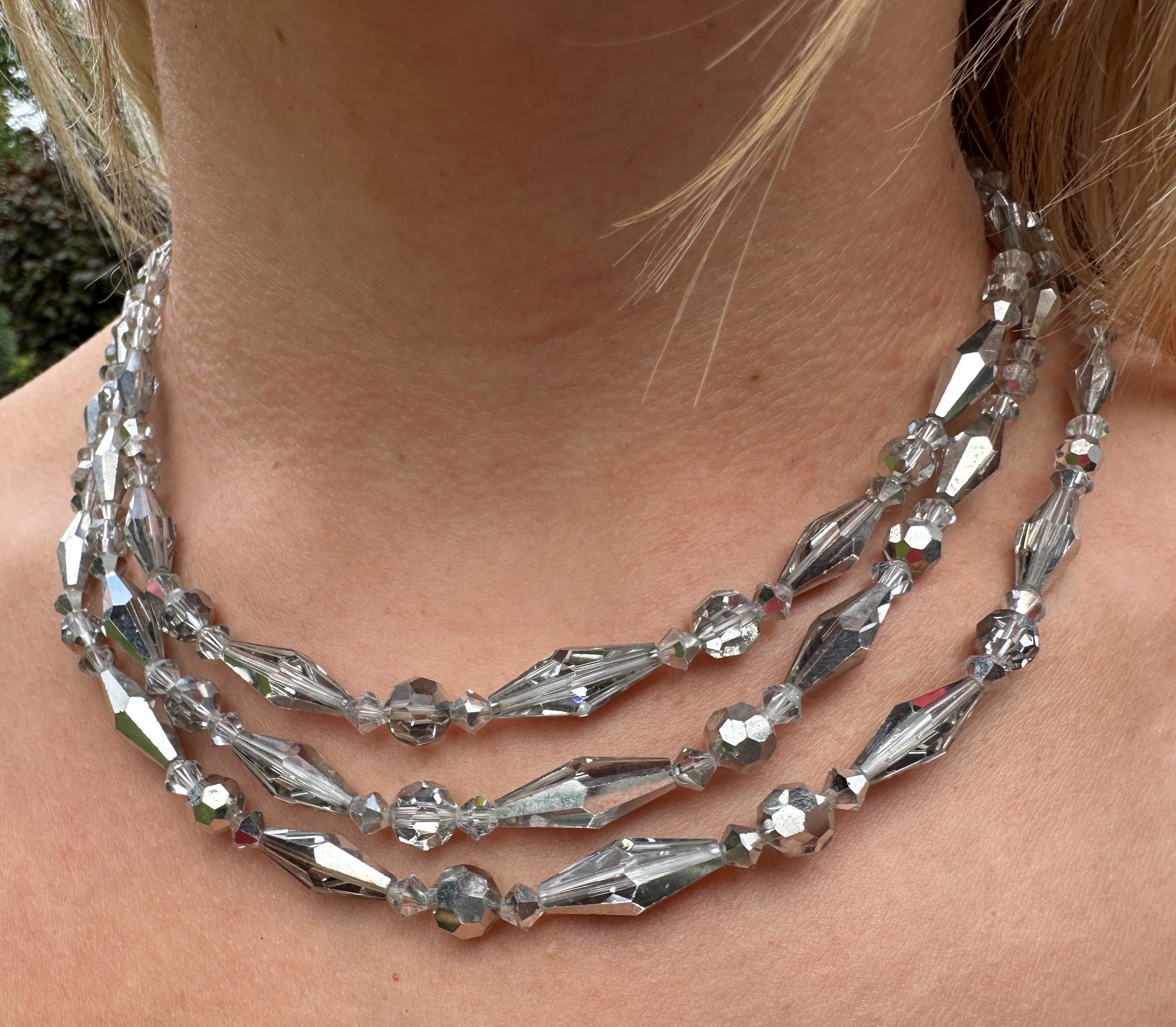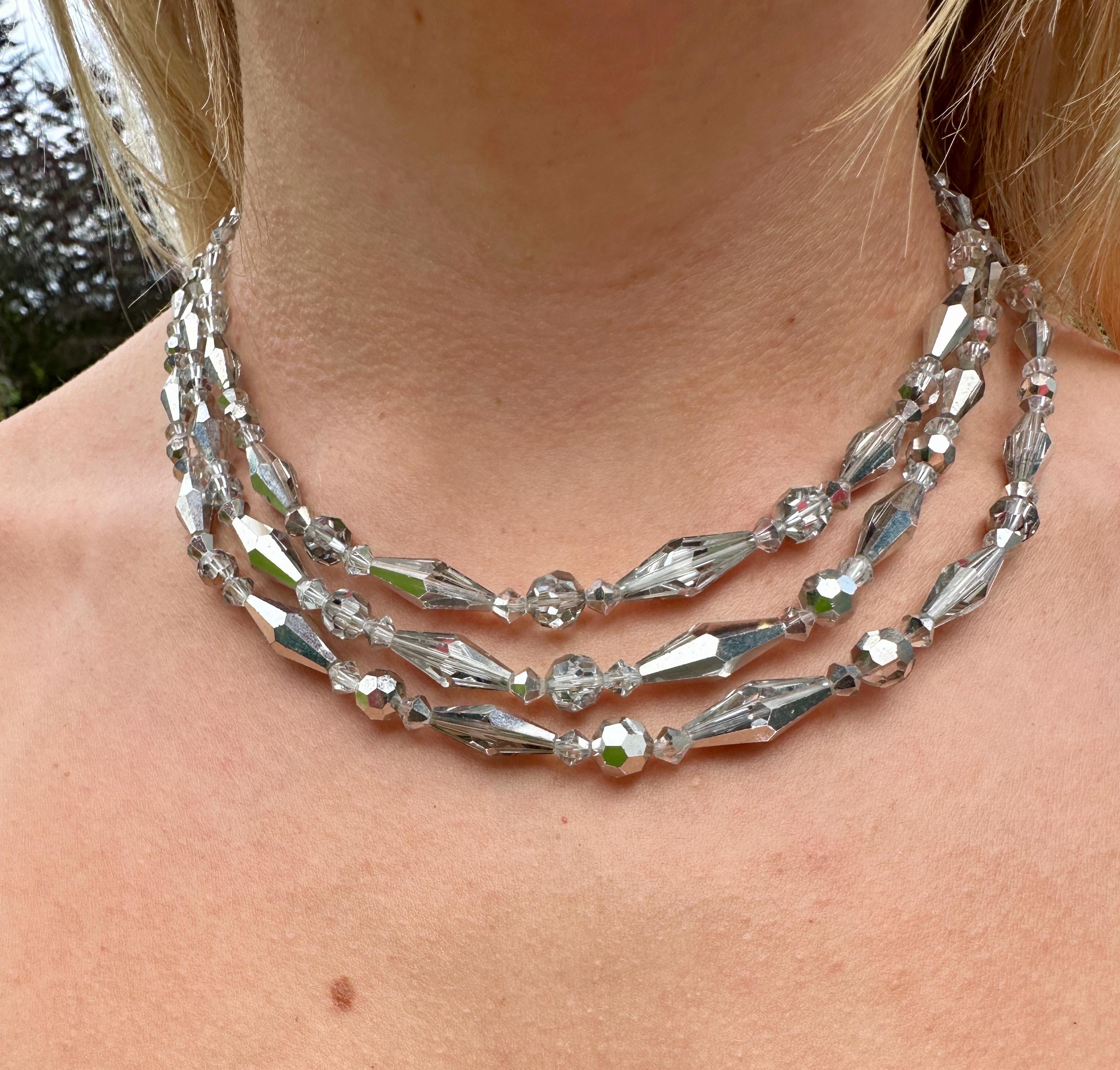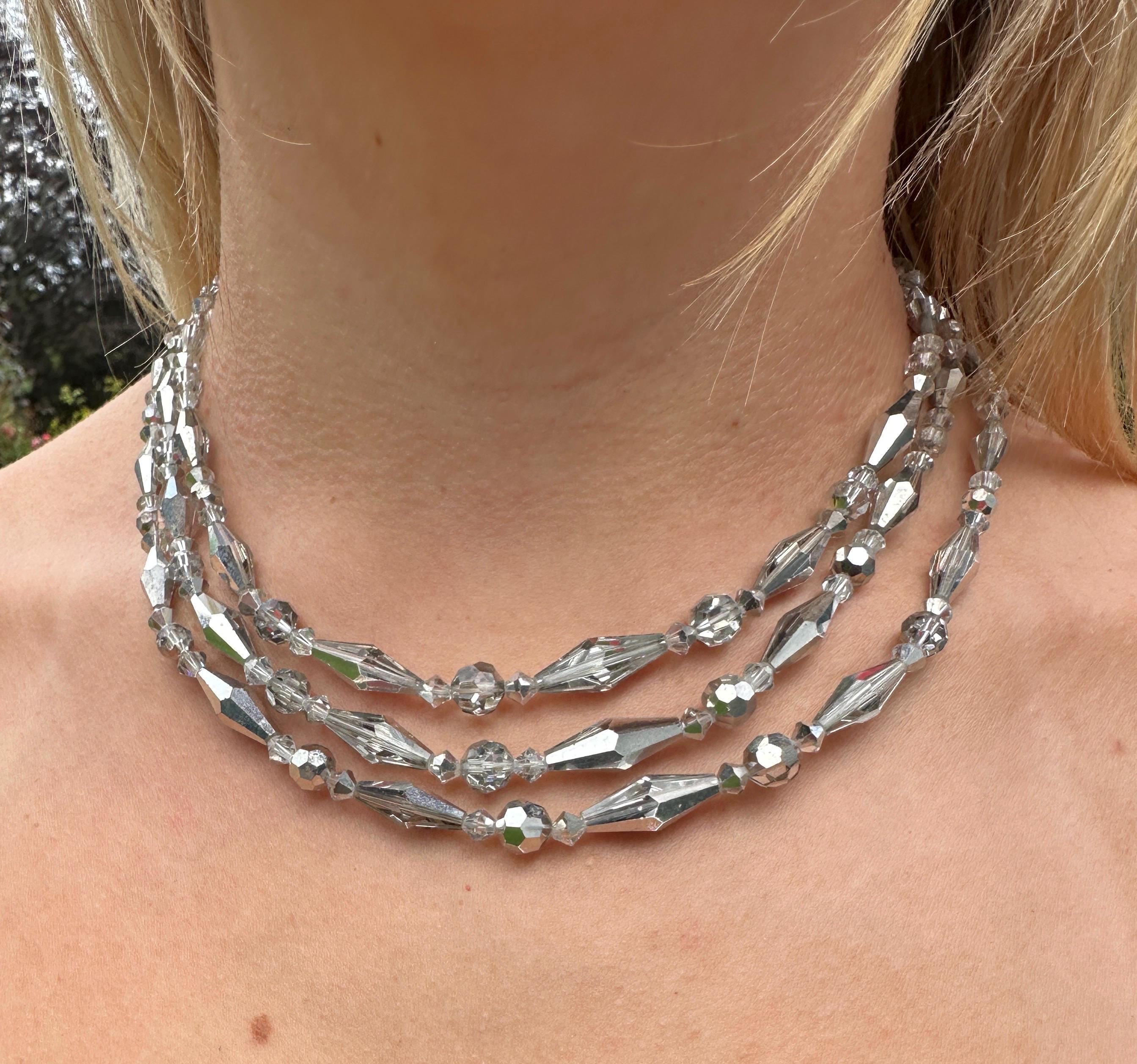 Here is a beautiful three stranded vintage glass beaded necklace. This necklace has a beautiful rhinestone clasp very 1960s in it’s design. The necklace comprises of silver painted crystal glass beads. It measures an inner strand of 14"and has a extension chain of just under 3 inches, it remains in great condition.