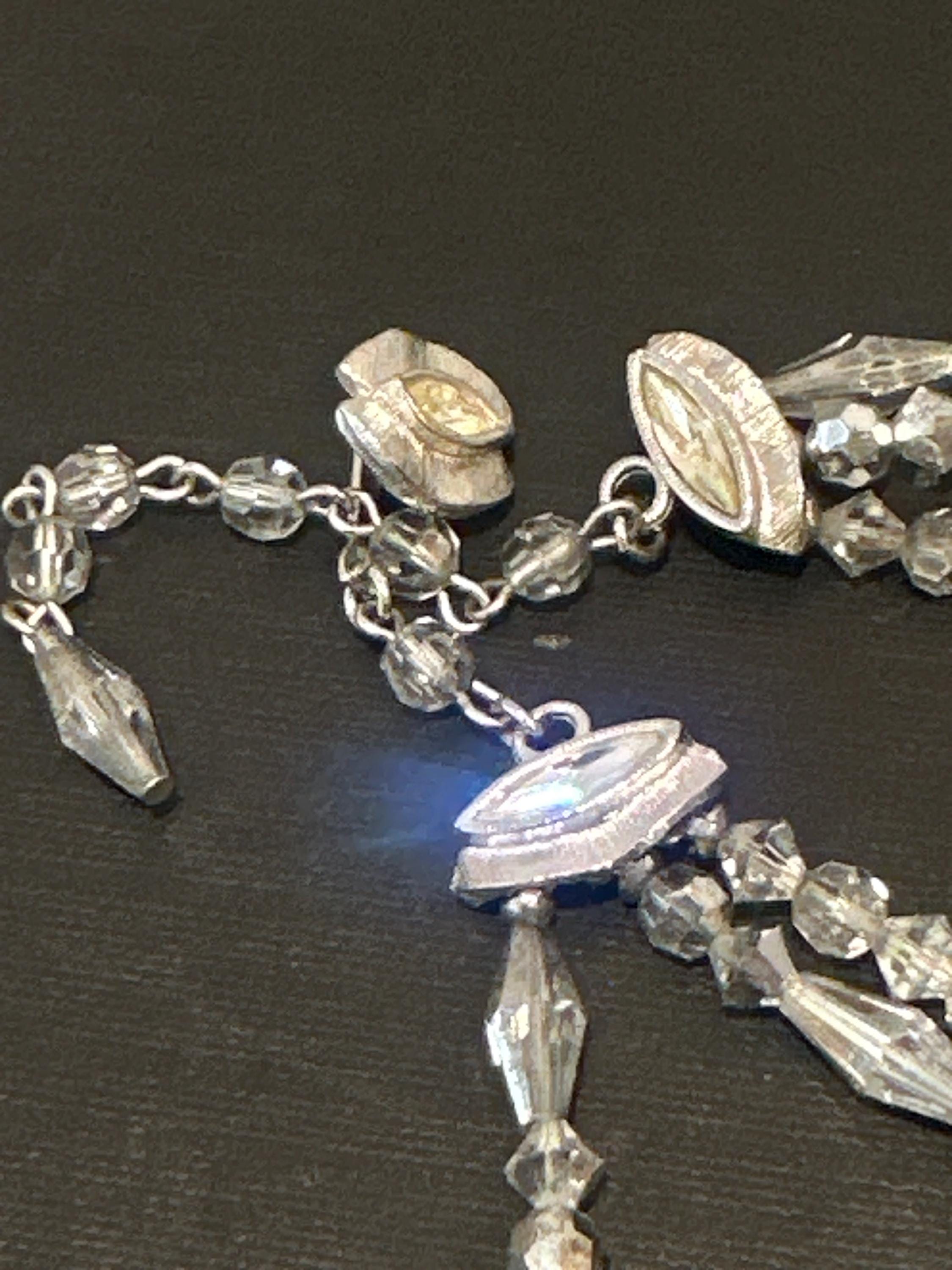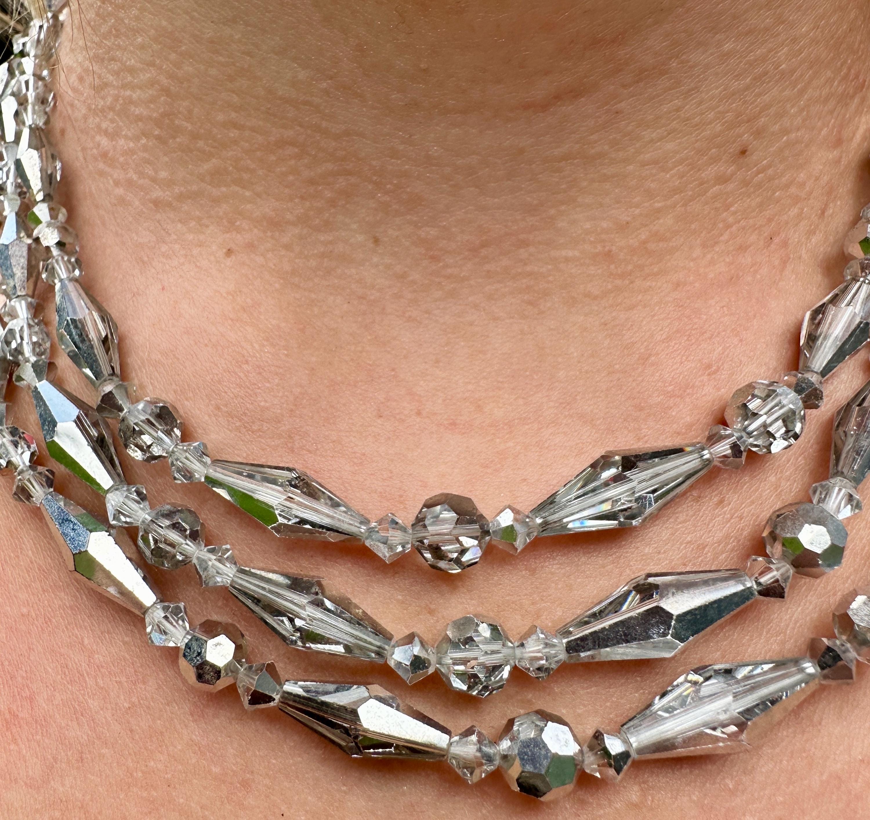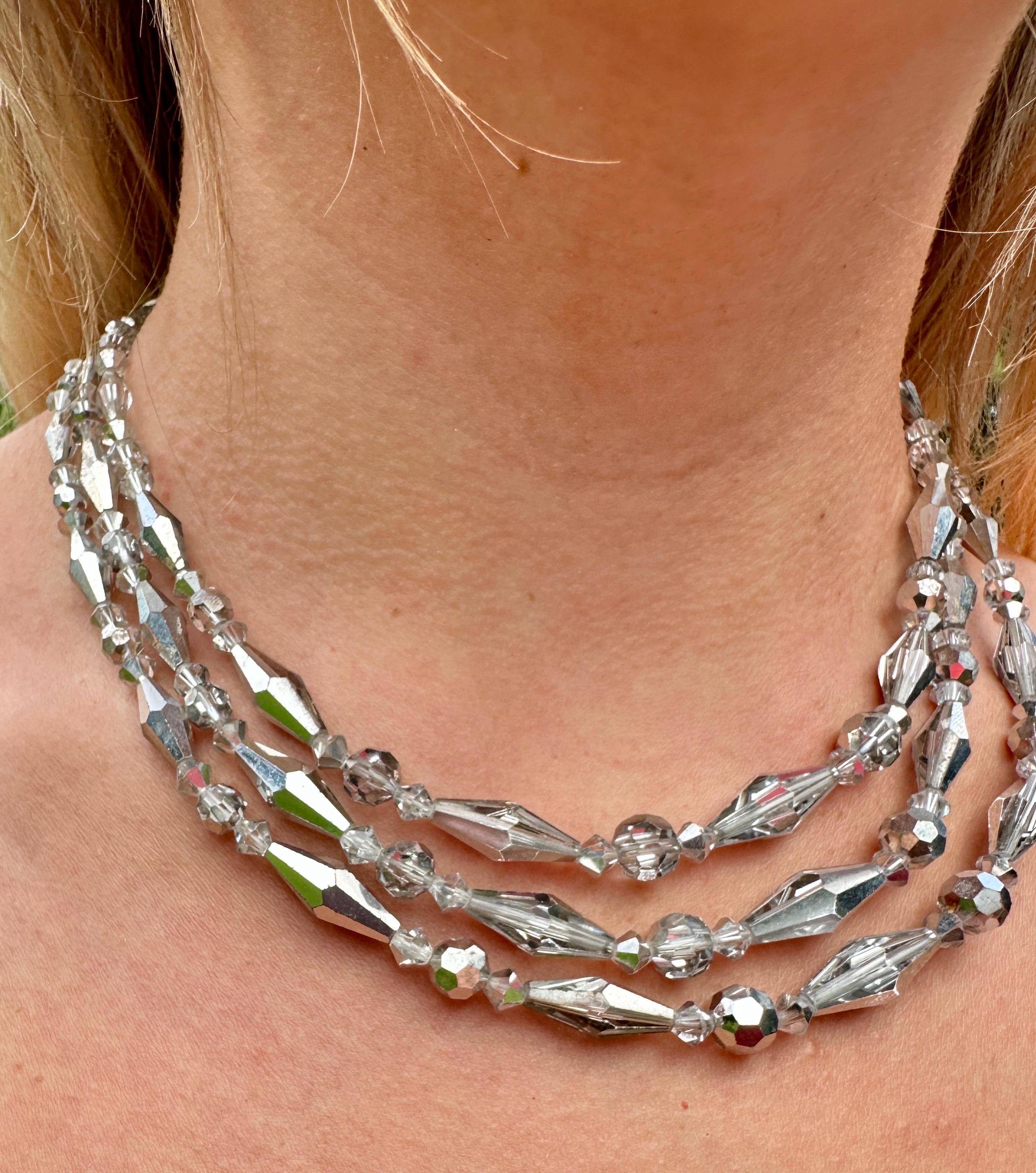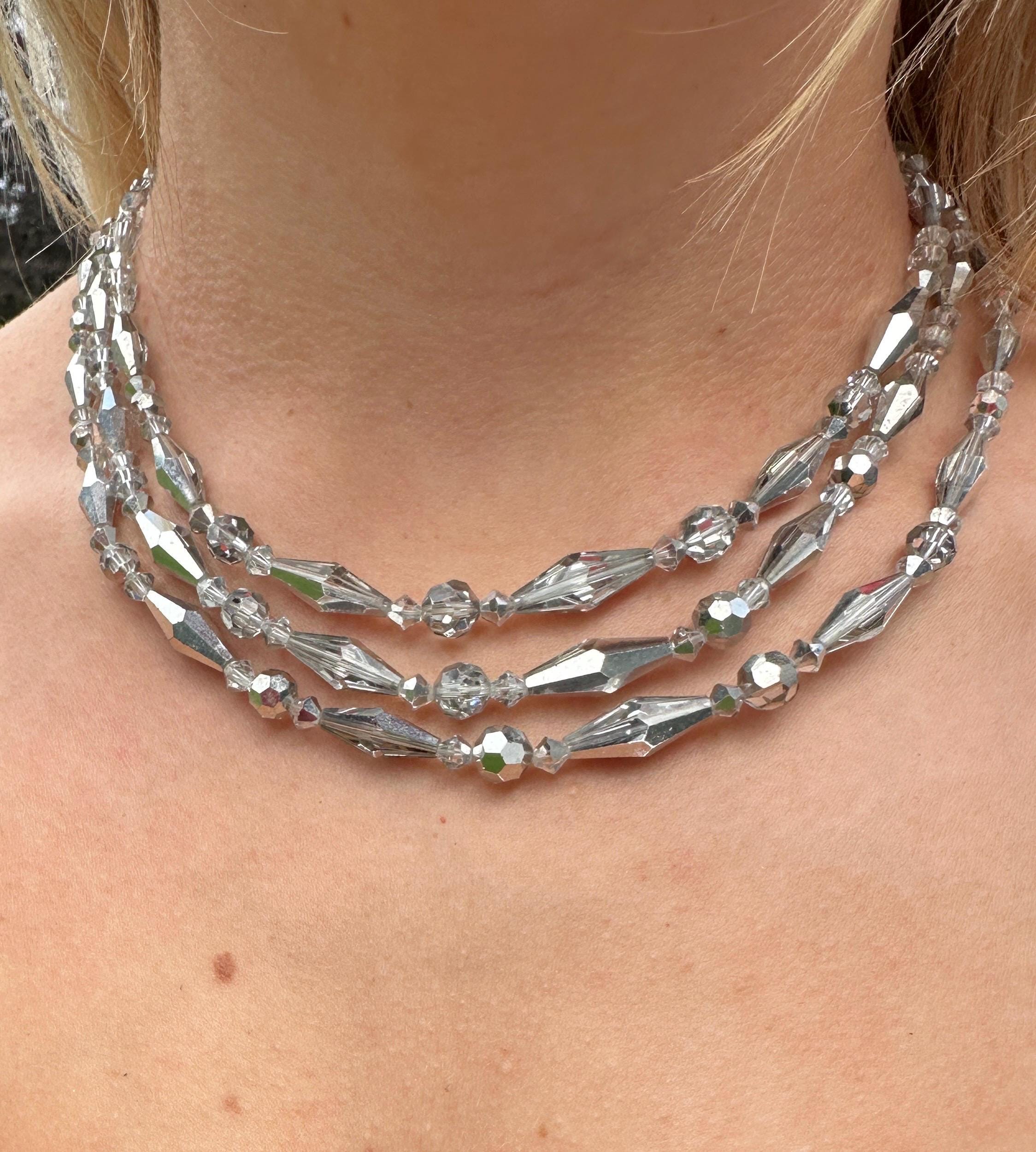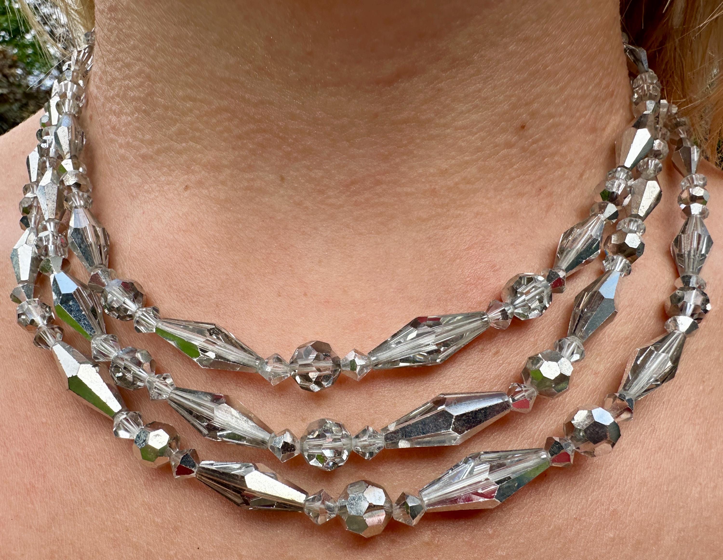 Here is a beautiful three stranded vintage glass beaded necklace. This necklace has a beautiful rhinestone clasp very 1960s in it’s design. The necklace comprises of silver painted crystal glass beads. It measures an inner strand of 14"and has a extension chain of just under 3 inches, it remains in great condition.