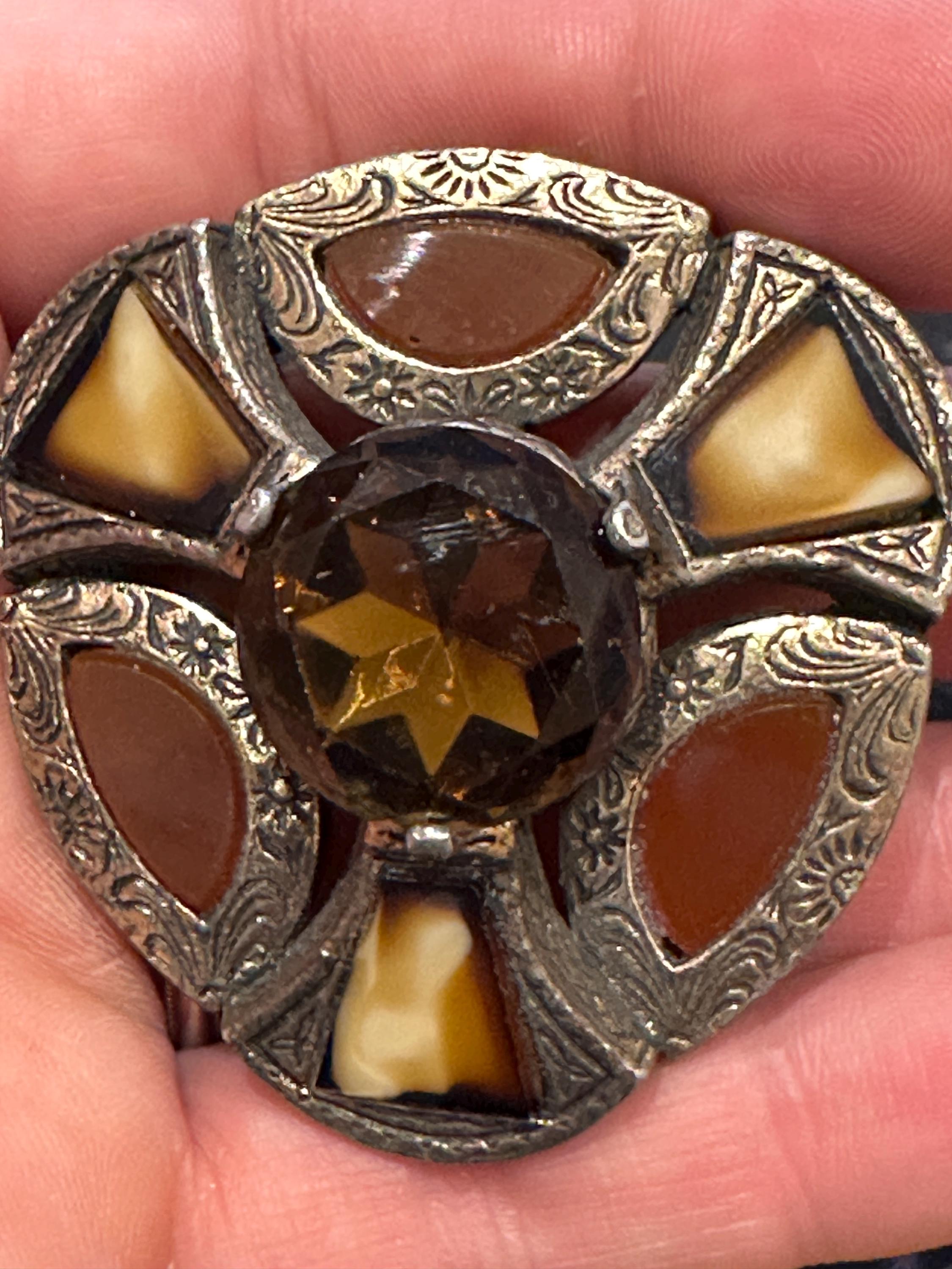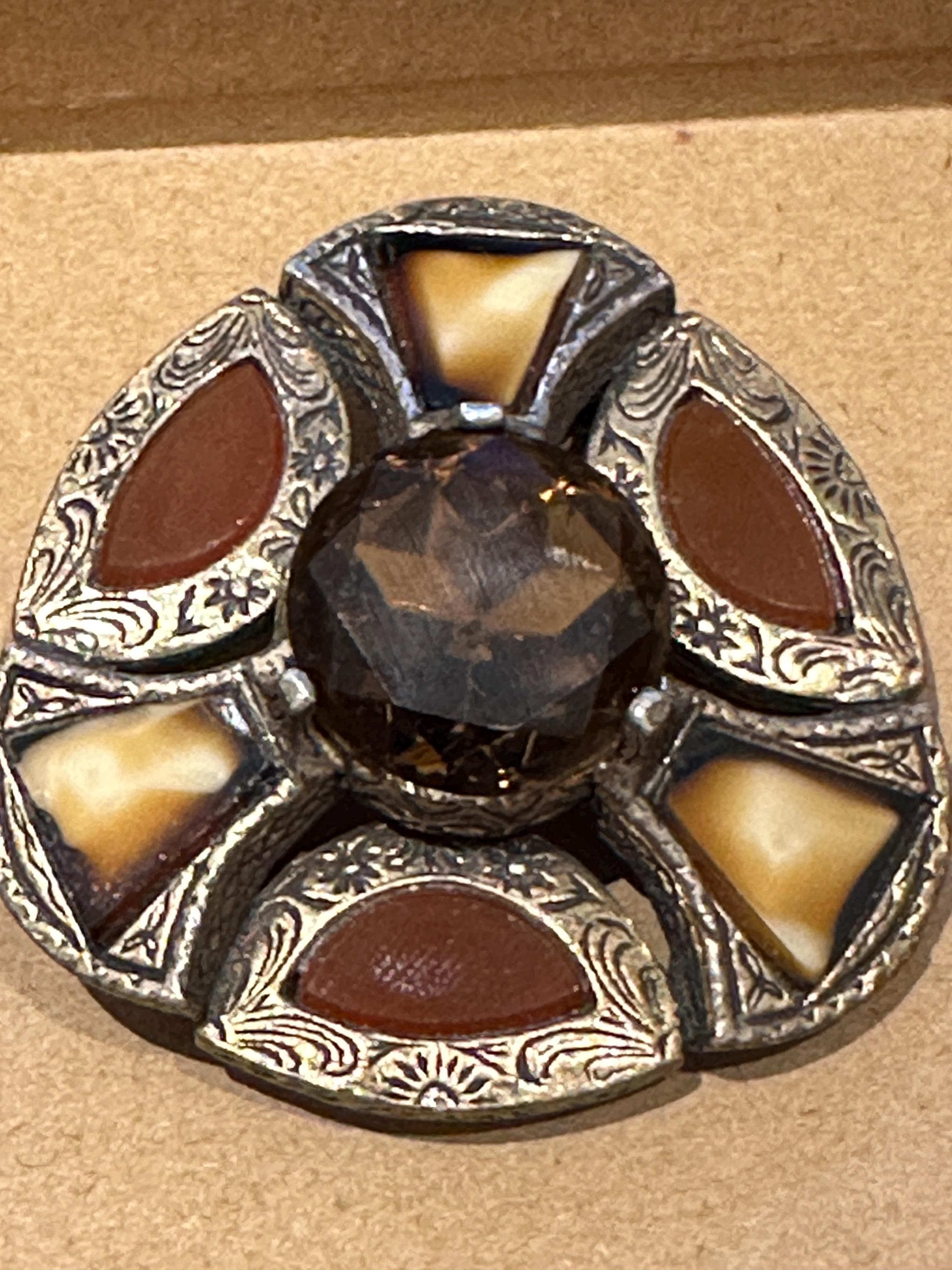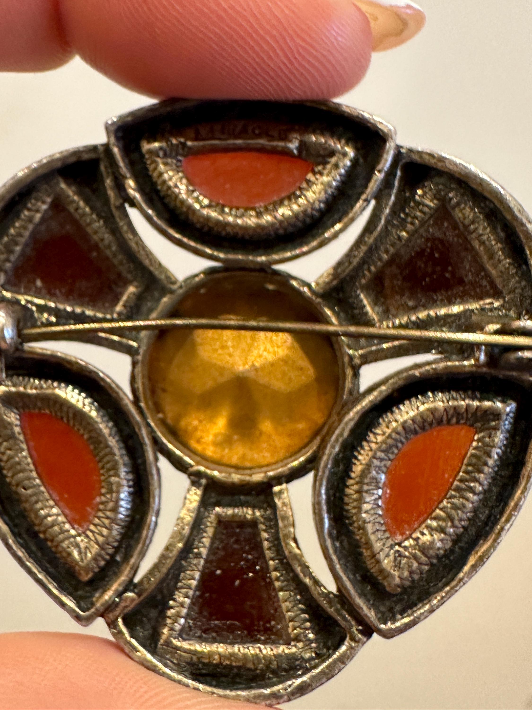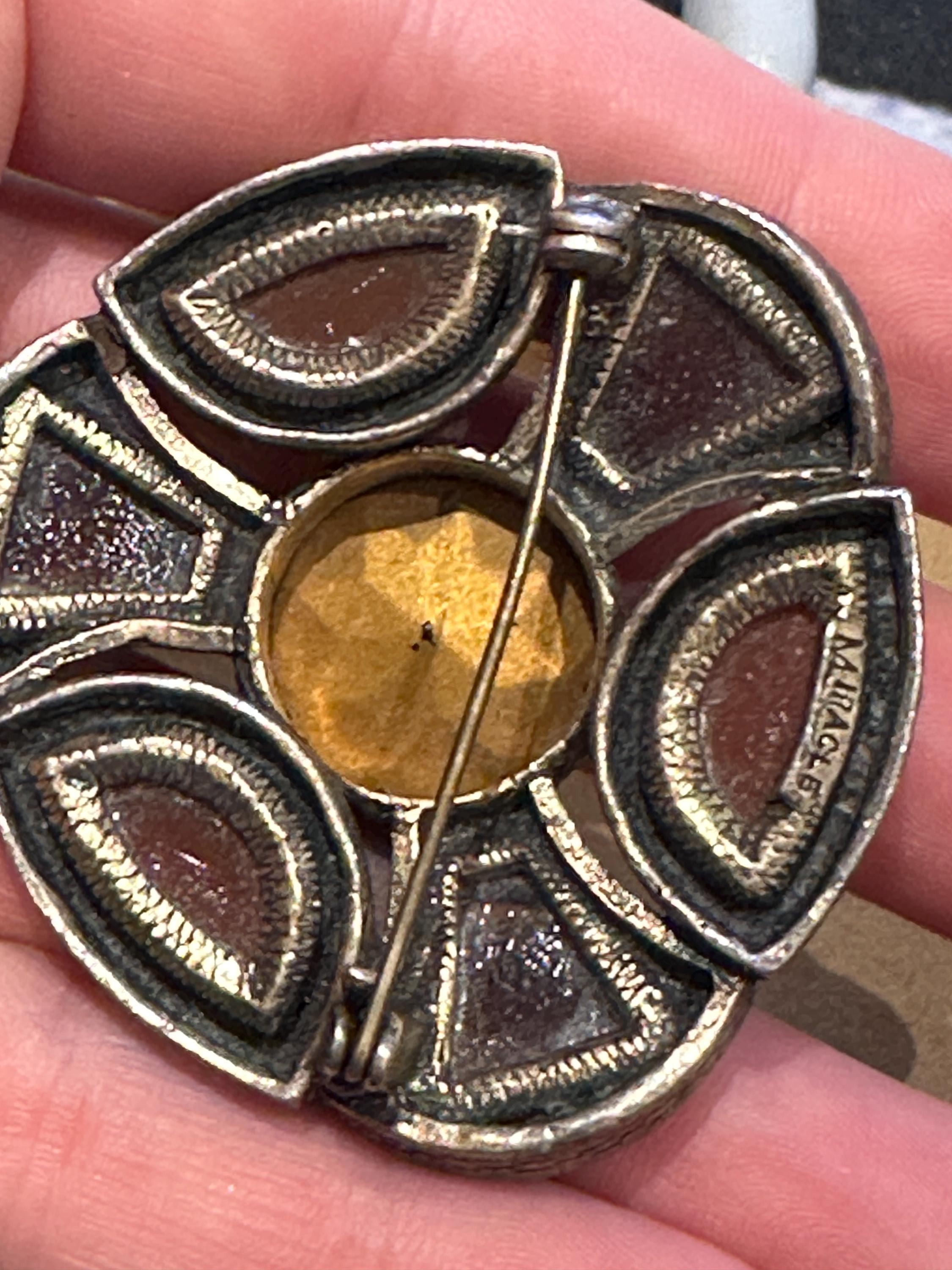Here is a Celtic style brooch dating from the 60/70s. It is made from a pewter type metal with faux glass agate cabochons. It is a signed piece by costume jewellery makers MIRACLE. The brooch measures 2 inches in length by 2 inches in width. It is in great condition with no damage.