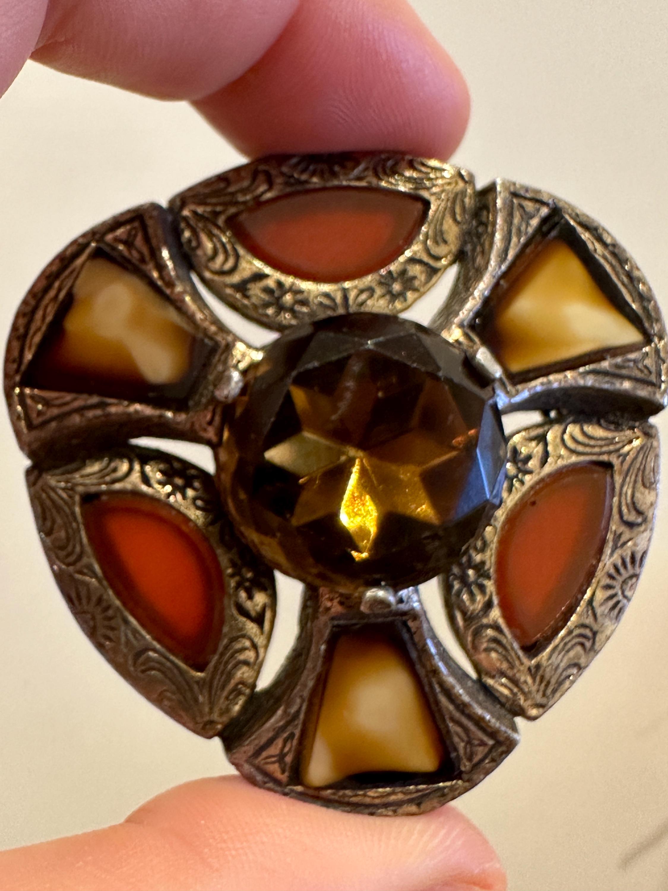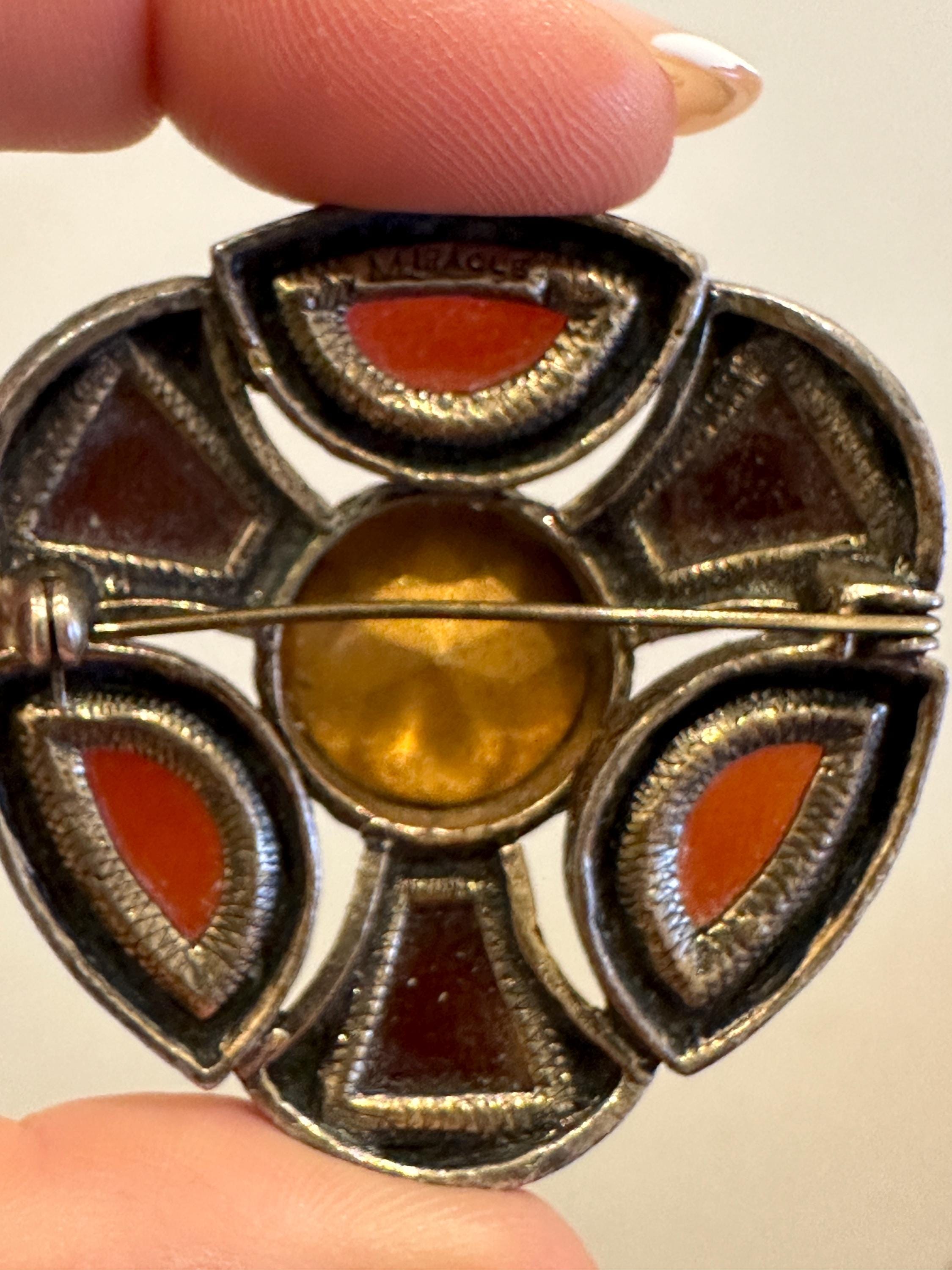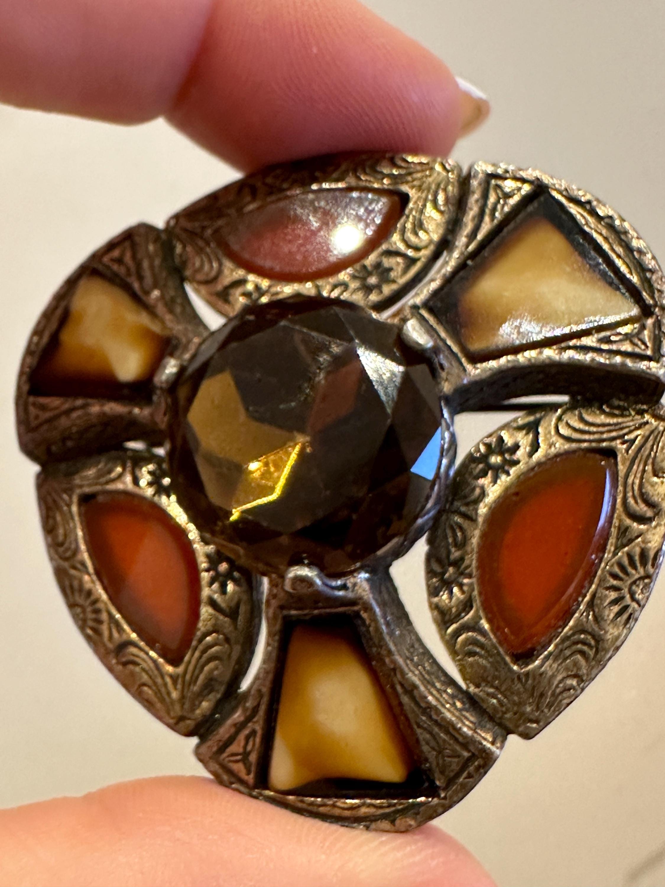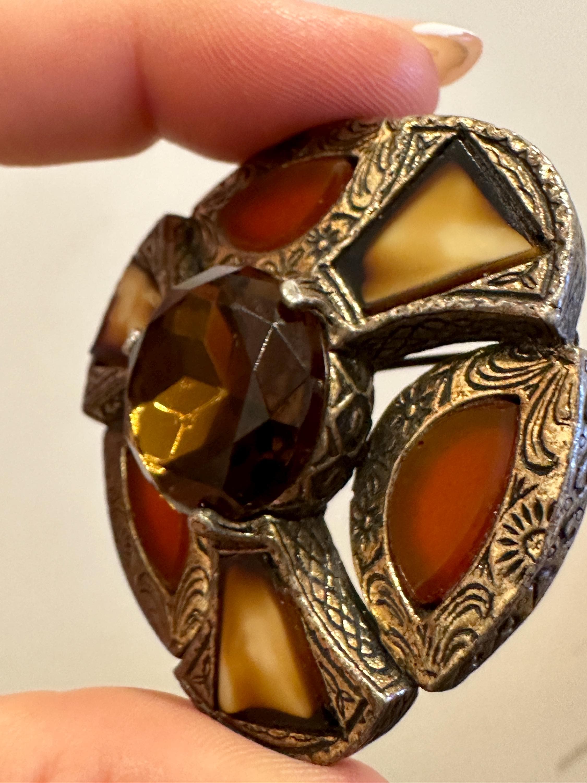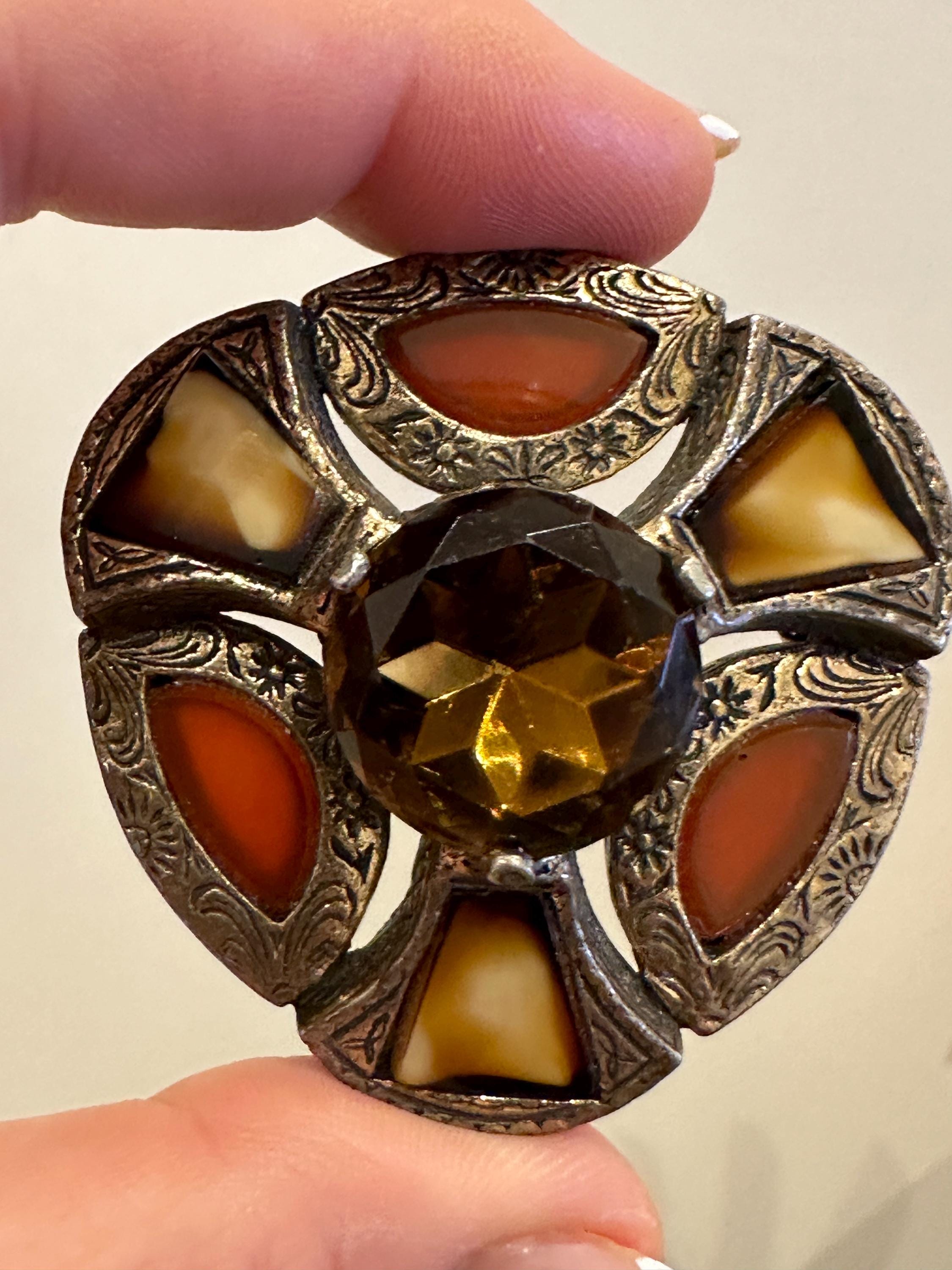 Here is a Celtic style brooch dating from the 60/70s. It is made from a pewter type metal with faux glass agate cabochons. It is a signed piece by costume jewellery makers MIRACLE. The brooch measures 2 inches in length by 2 inches in width. It is in great condition with no damage.