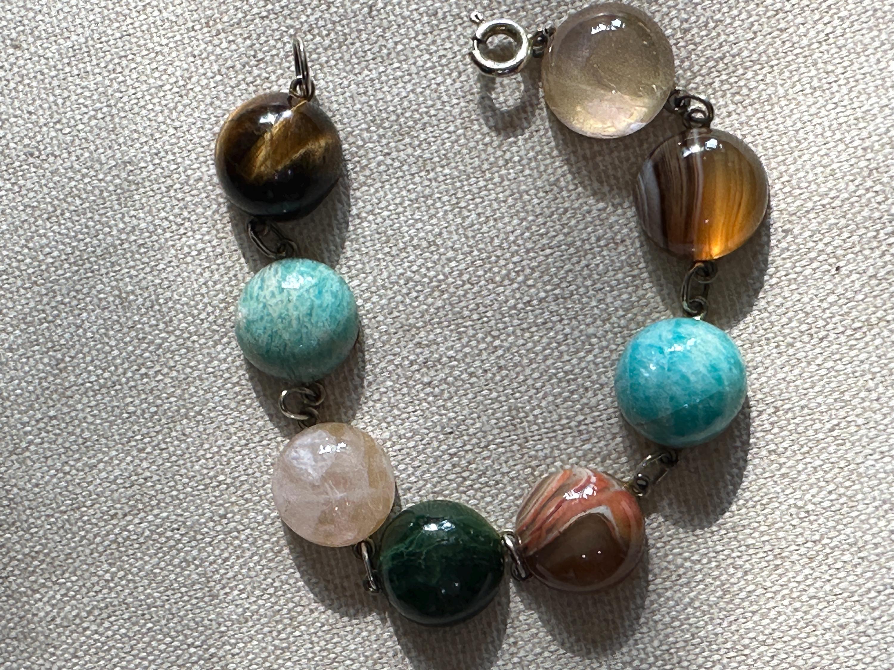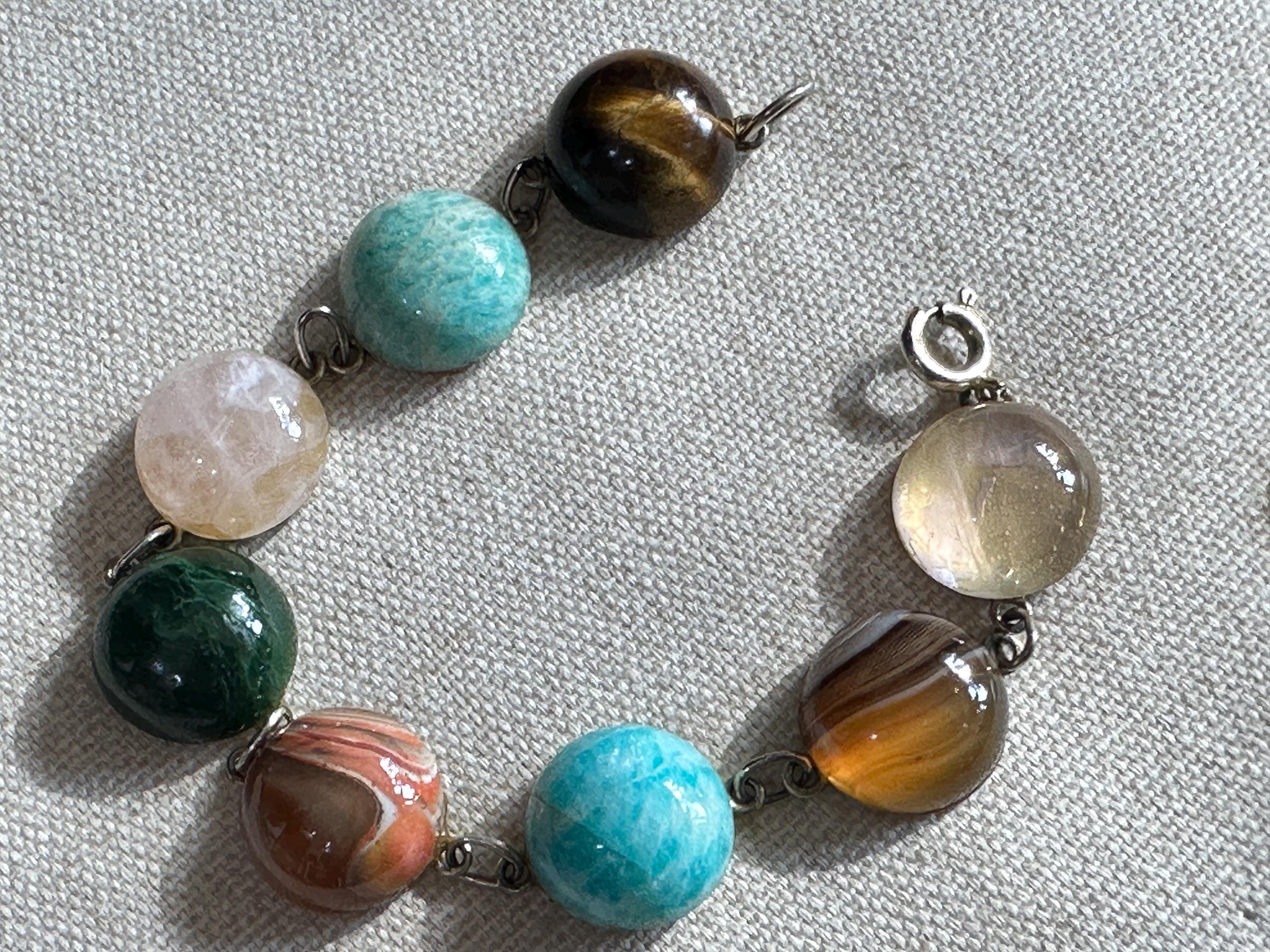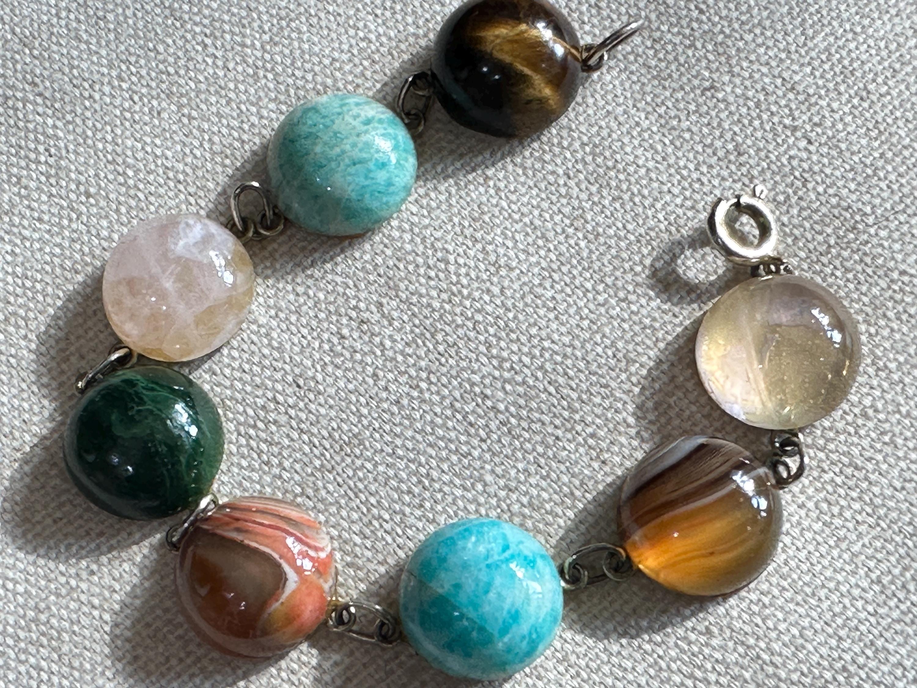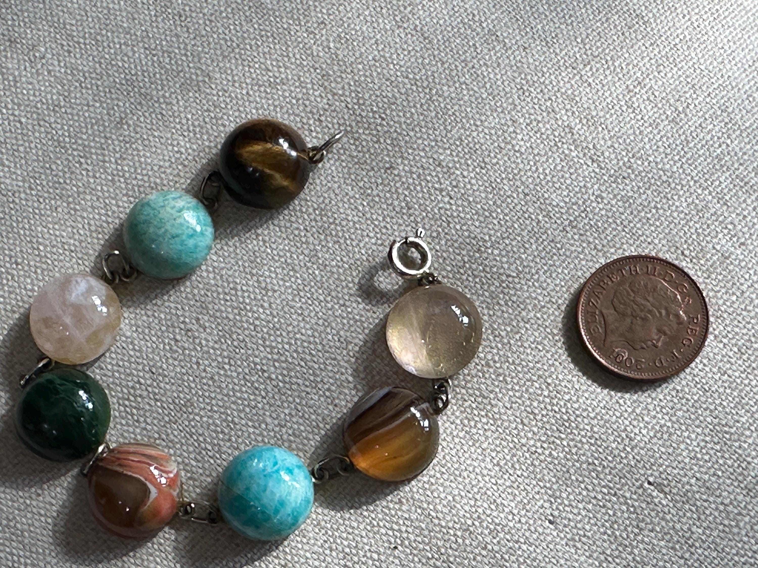 Here is a beautiful chunky agate stone bracelet . It is marked for silver with makers mark Zeeta. It measures 7.5 inches in length. Each stone measures approx 1.5cm. The stones include tigers eye, Rose quartz, banded agate and more.