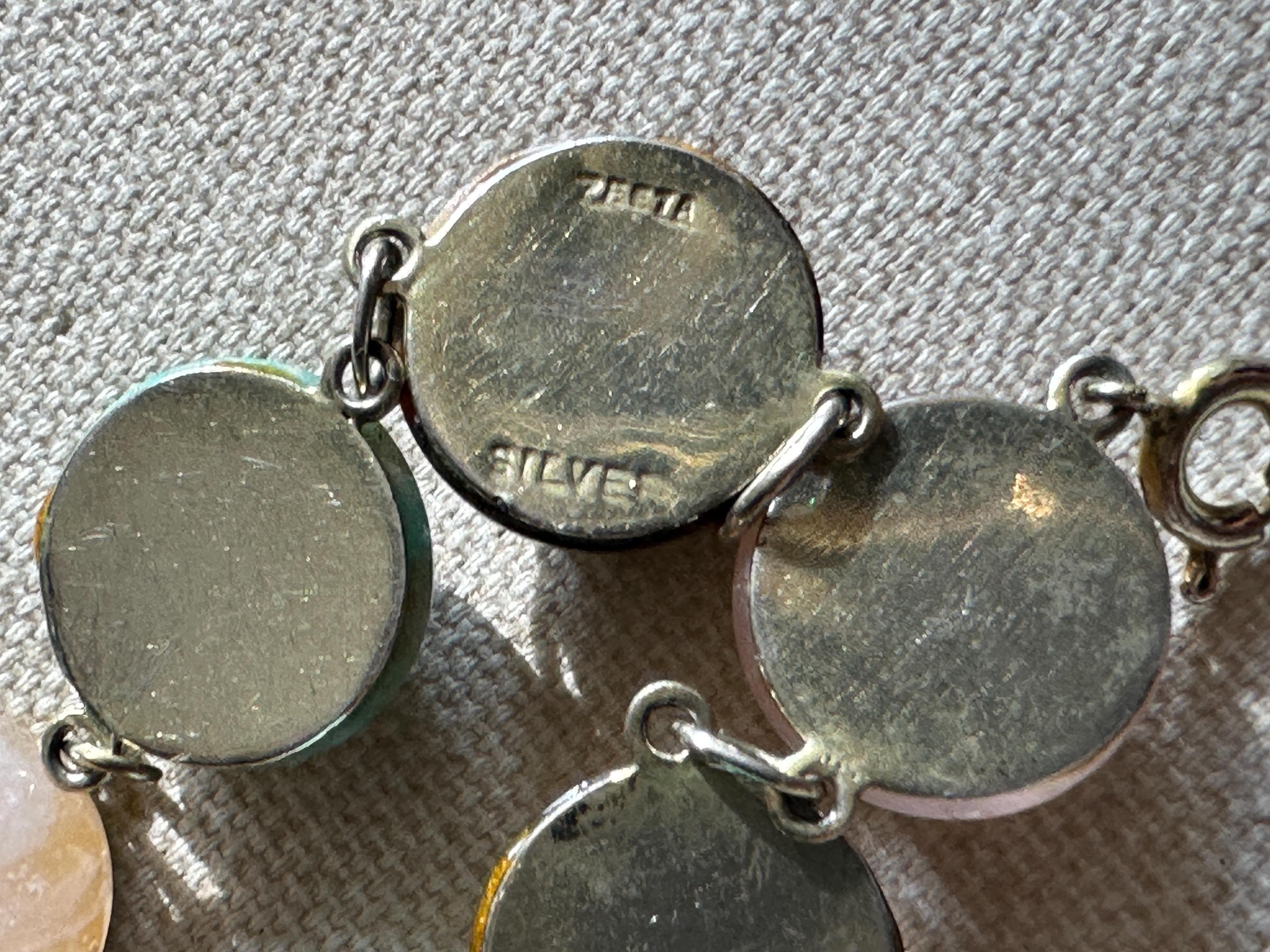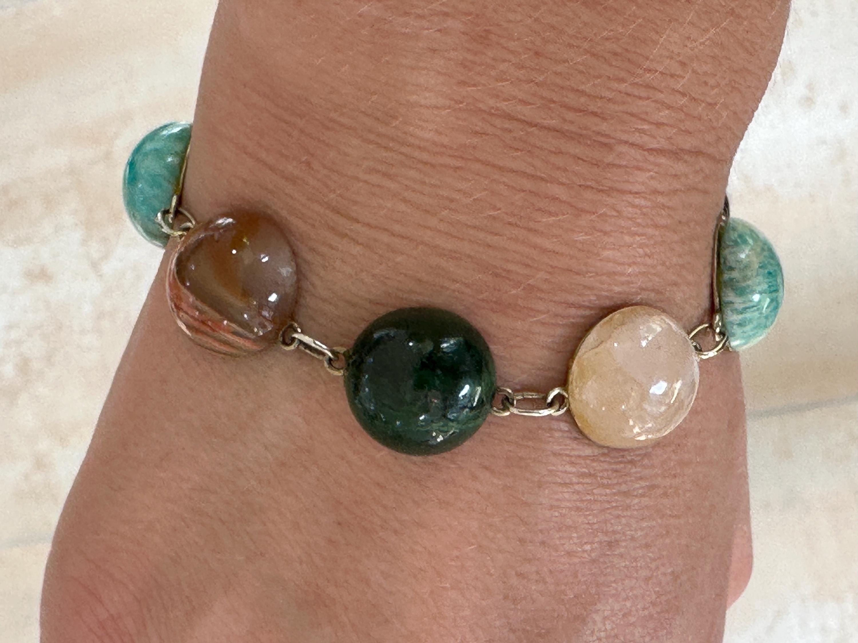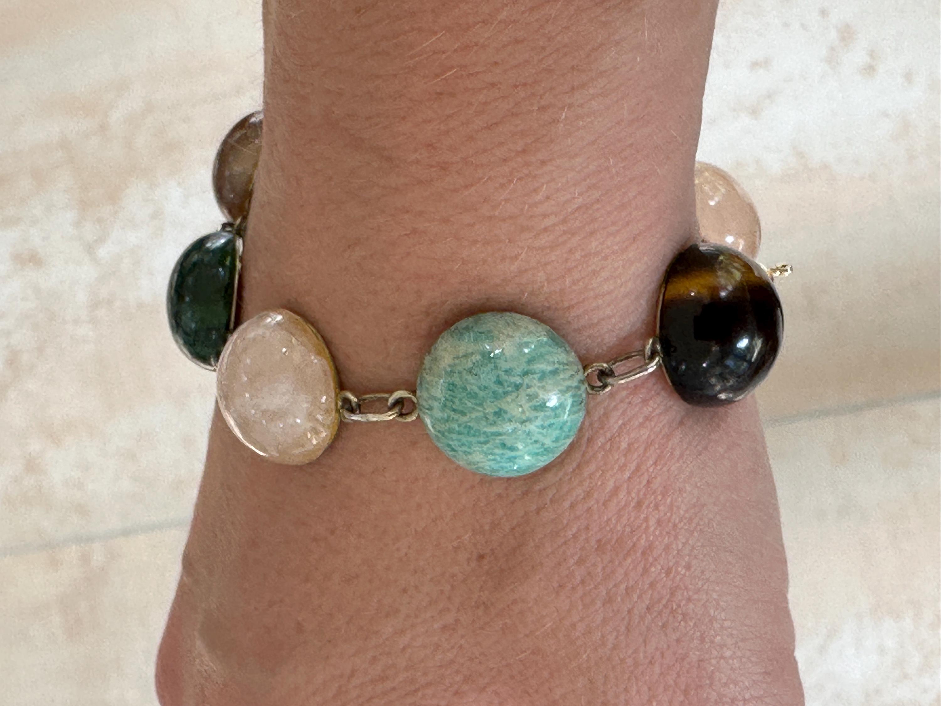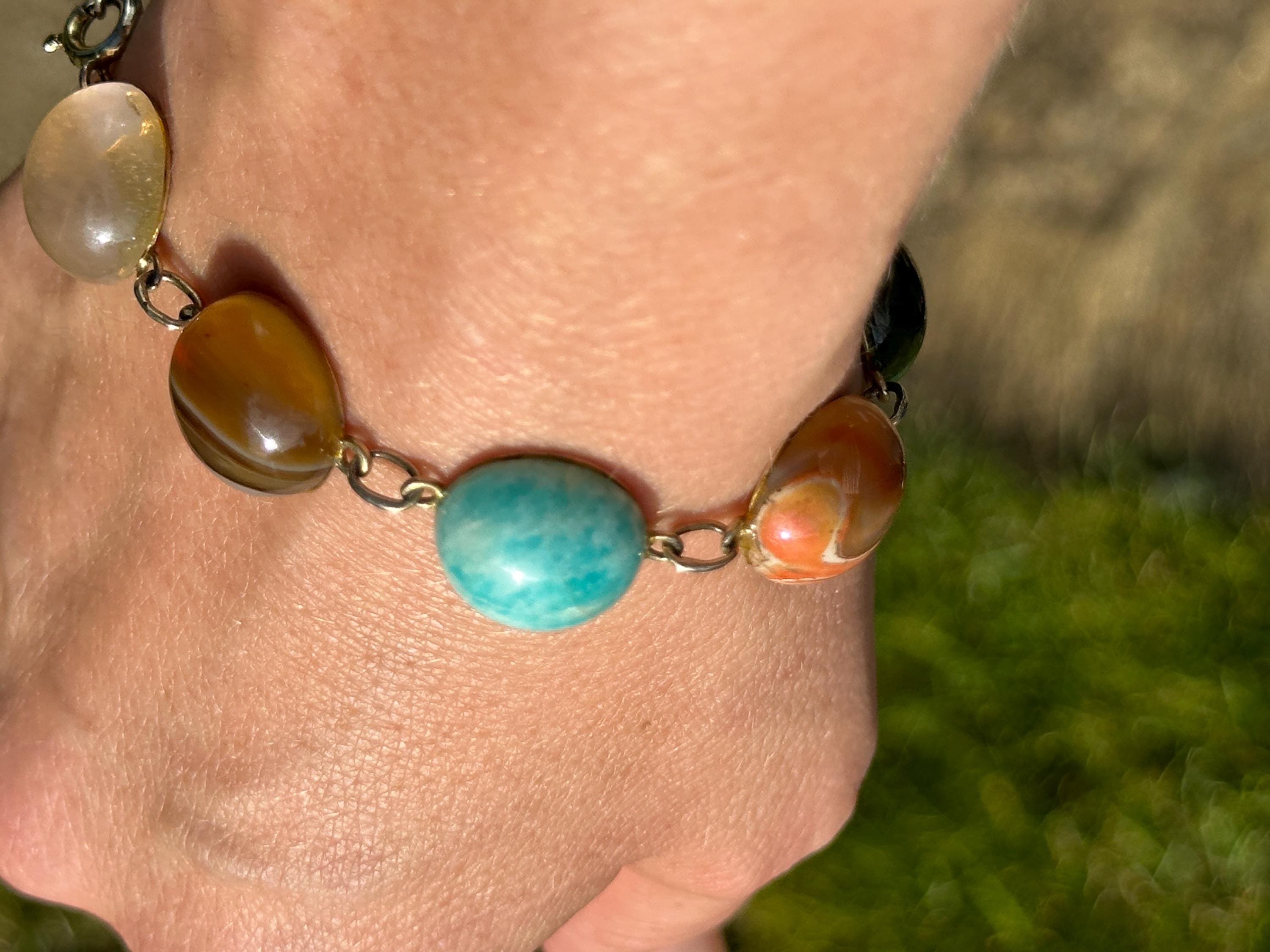 Here is a beautiful chunky agate stone bracelet . It is marked for silver with makers mark Zeeta. It measures 7.5 inches in length. Each stone measures approx 1.5cm. The stones include tigers eye, Rose quartz, banded agate and more.