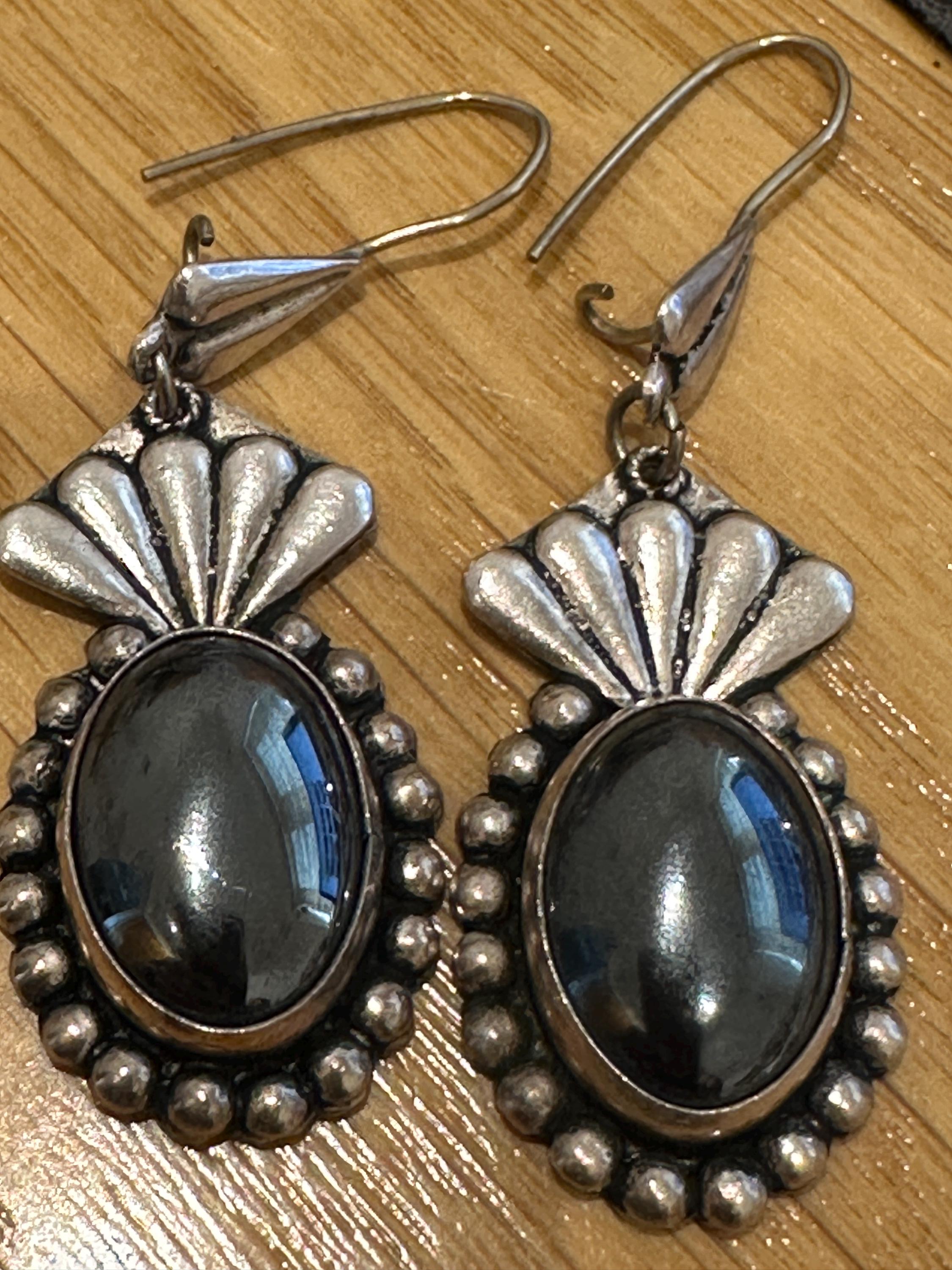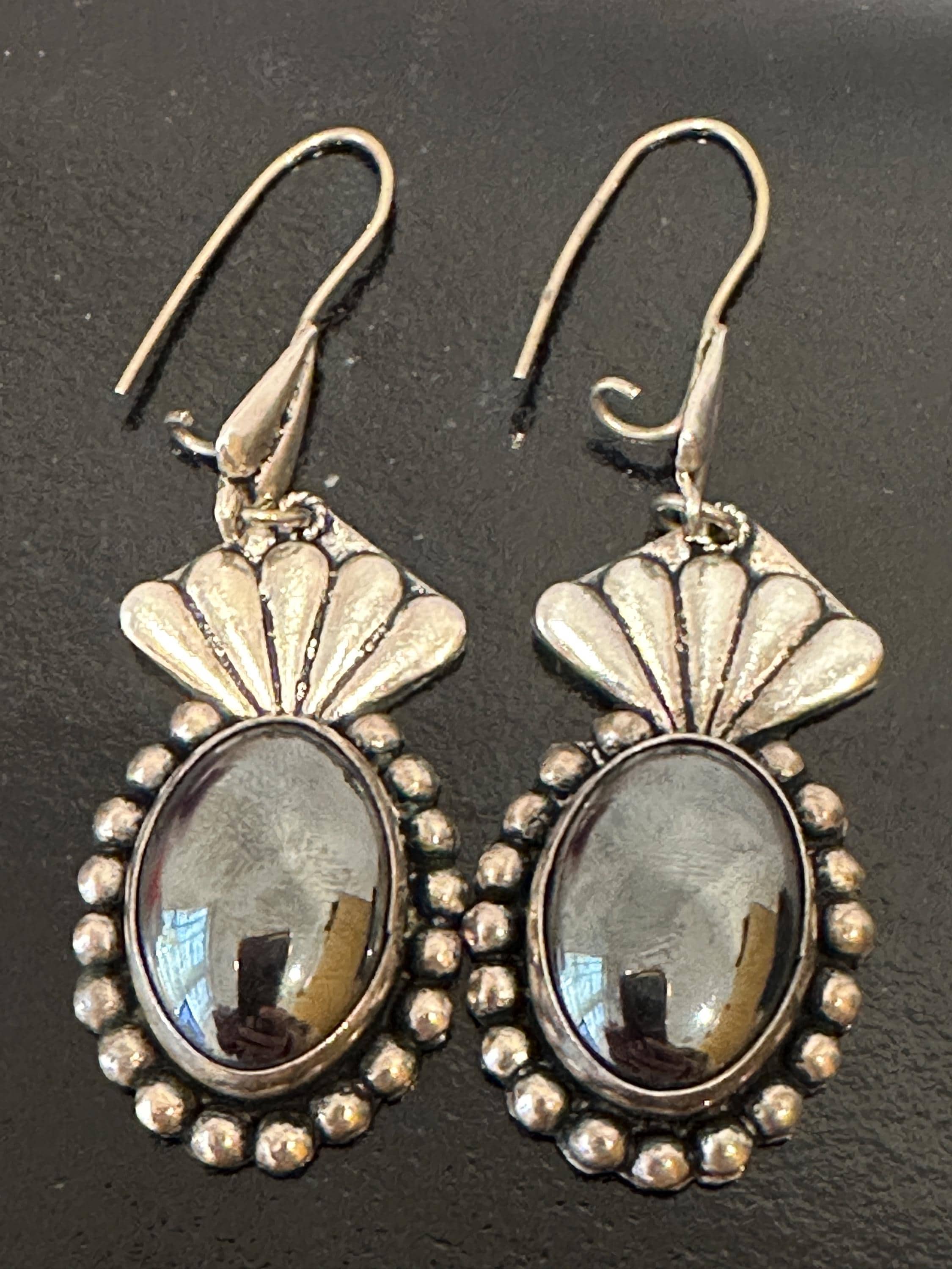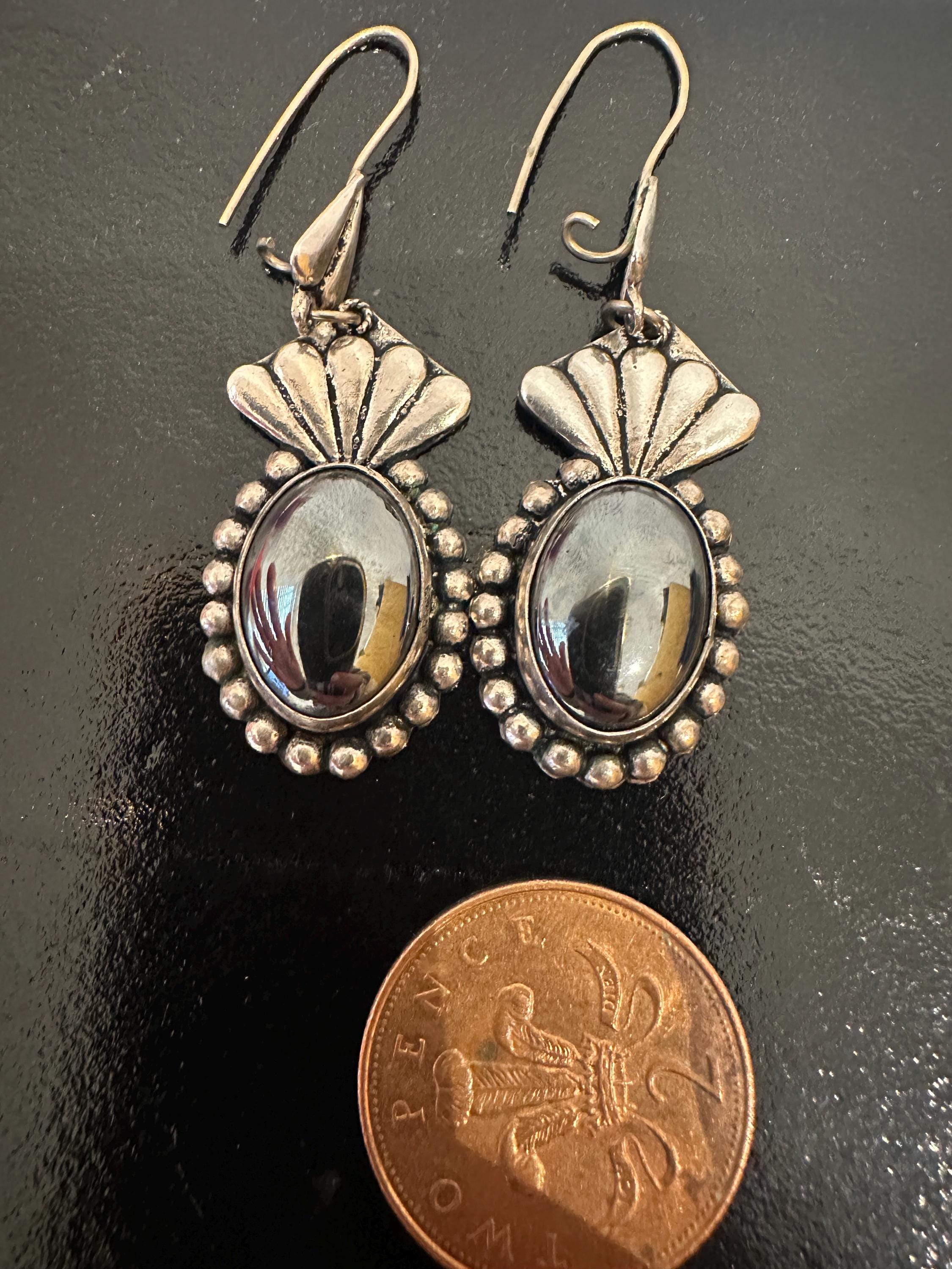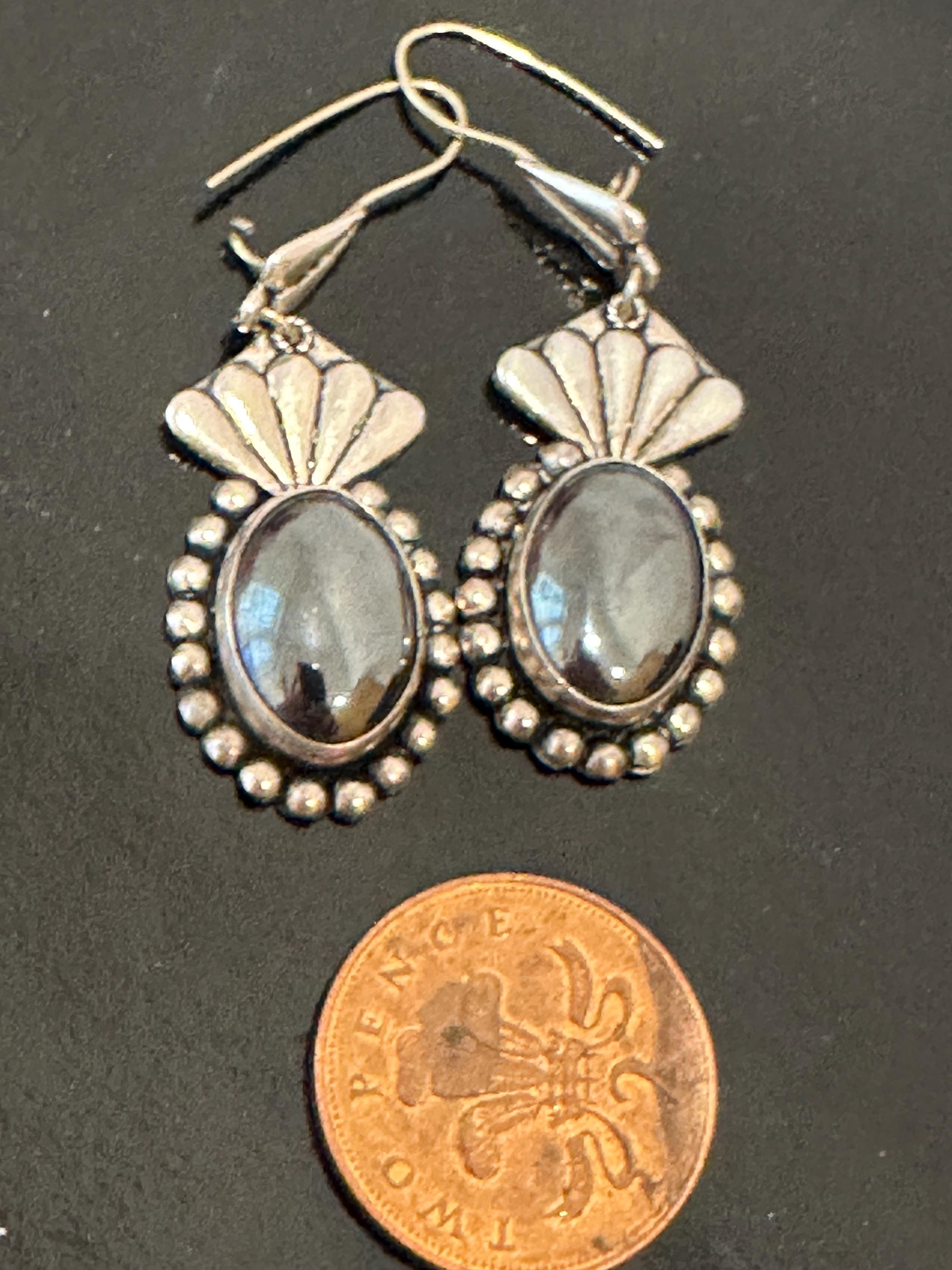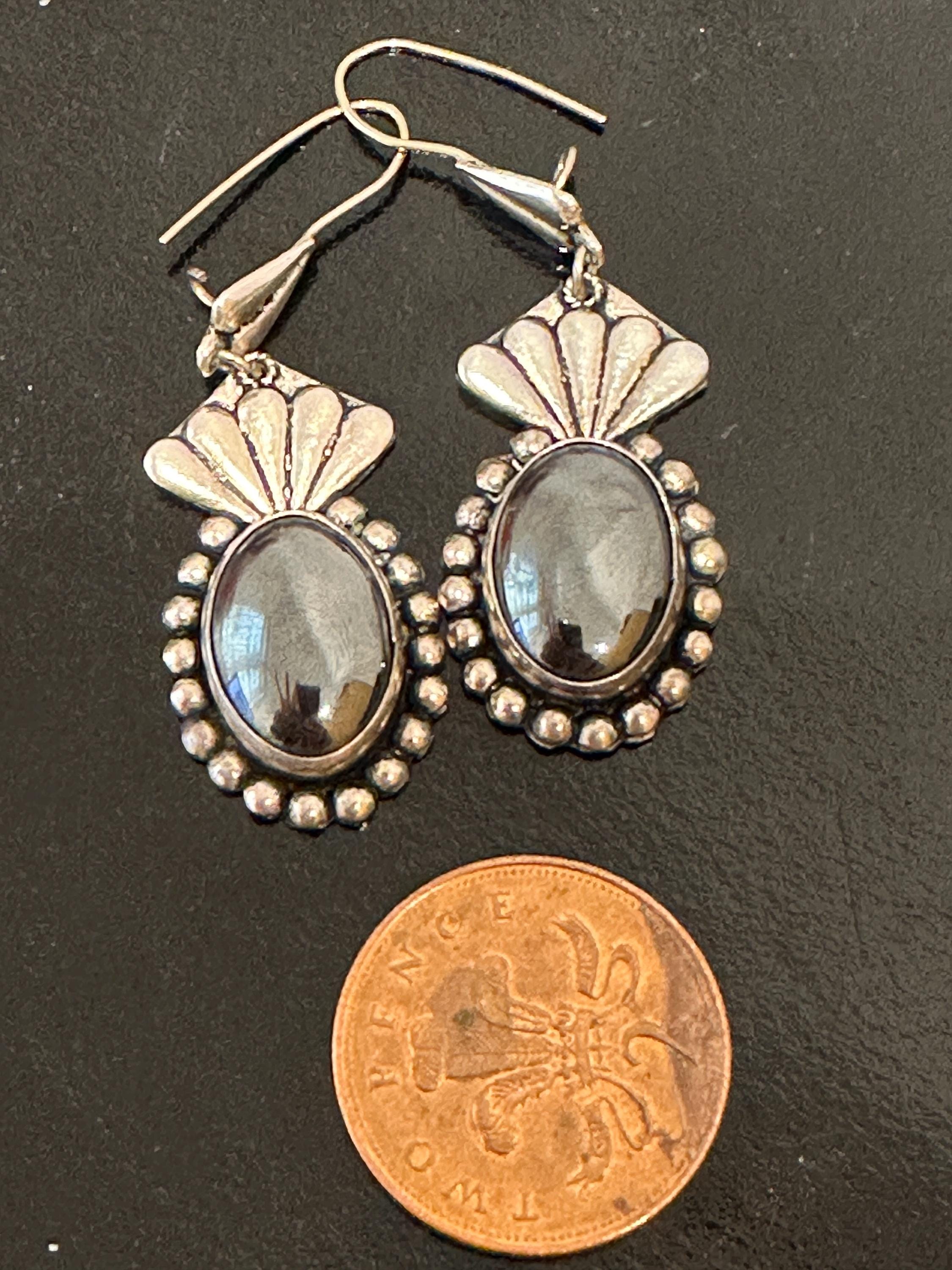 Large Mexican silver earrings set with oval hematite cabochons. Theses earrings measure a drop of 6.5cm and a width of 2cm. These are marked on reverse 950( a mark used for the grade of silver).