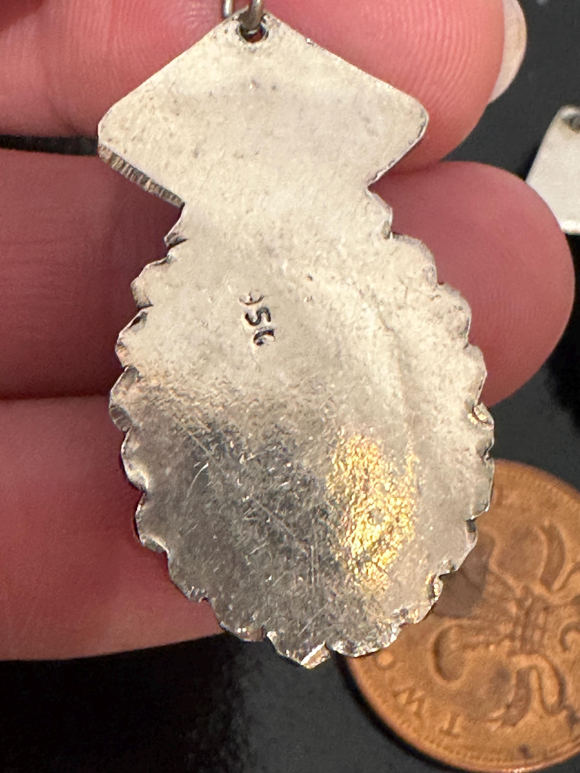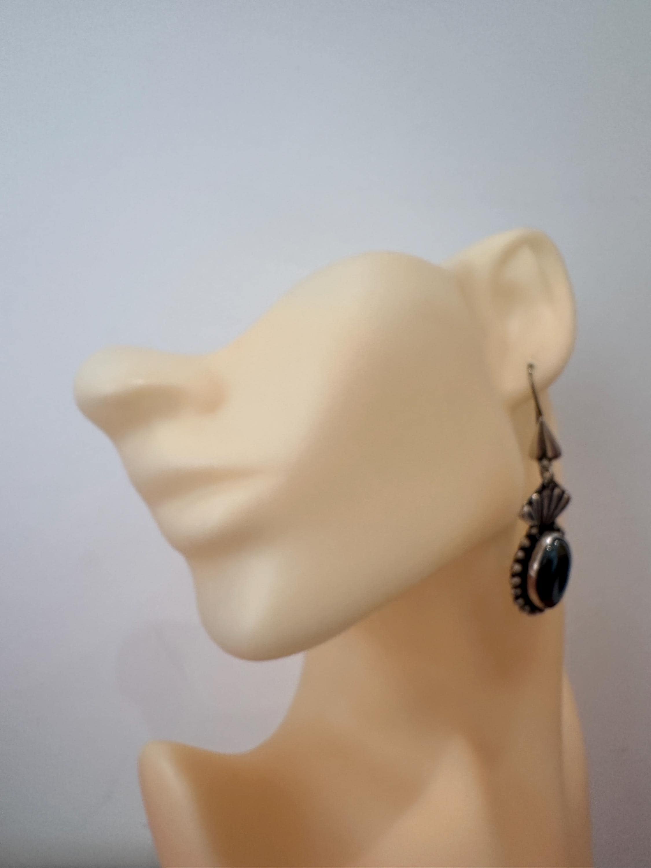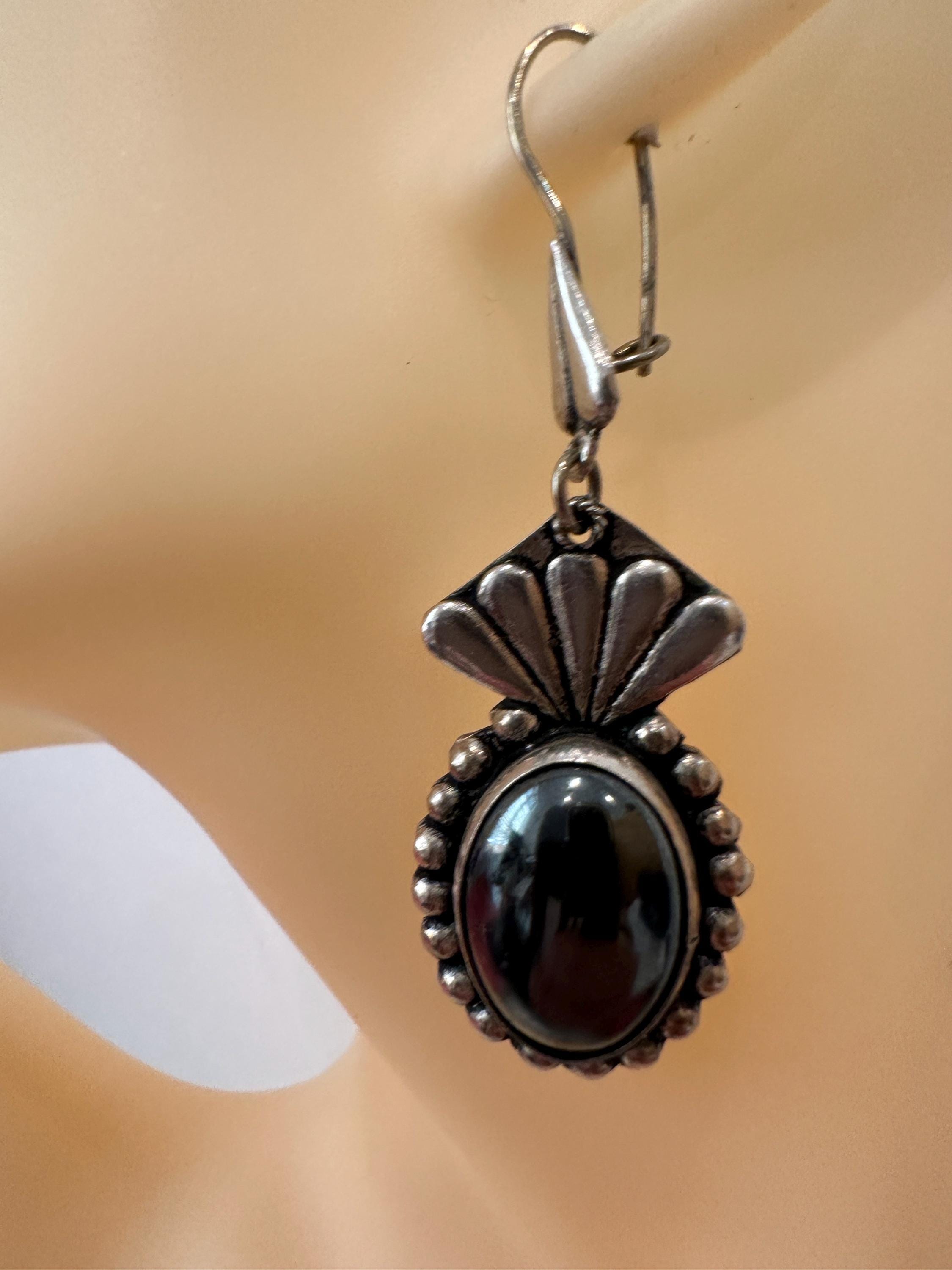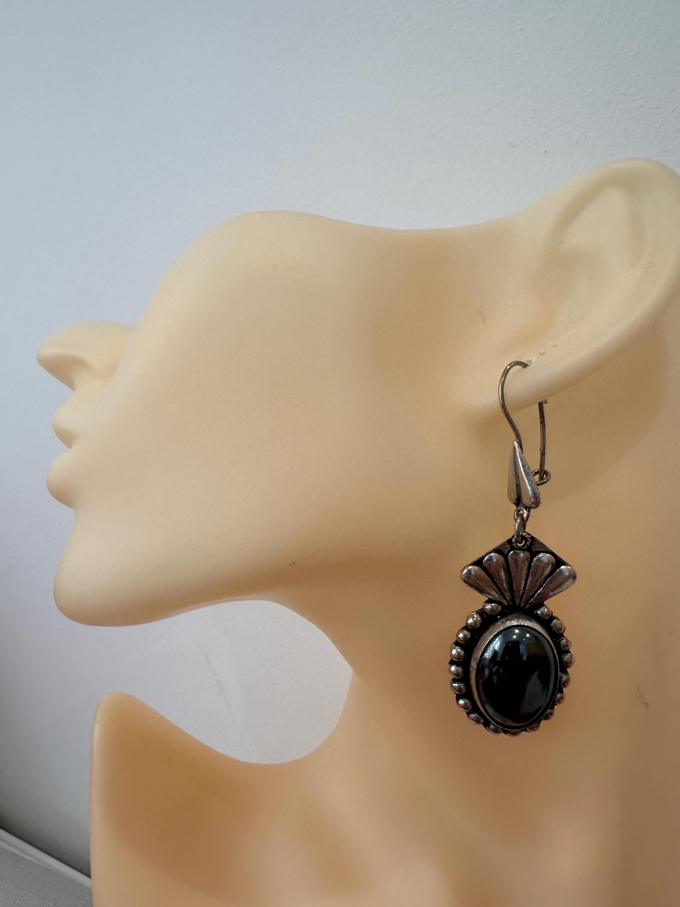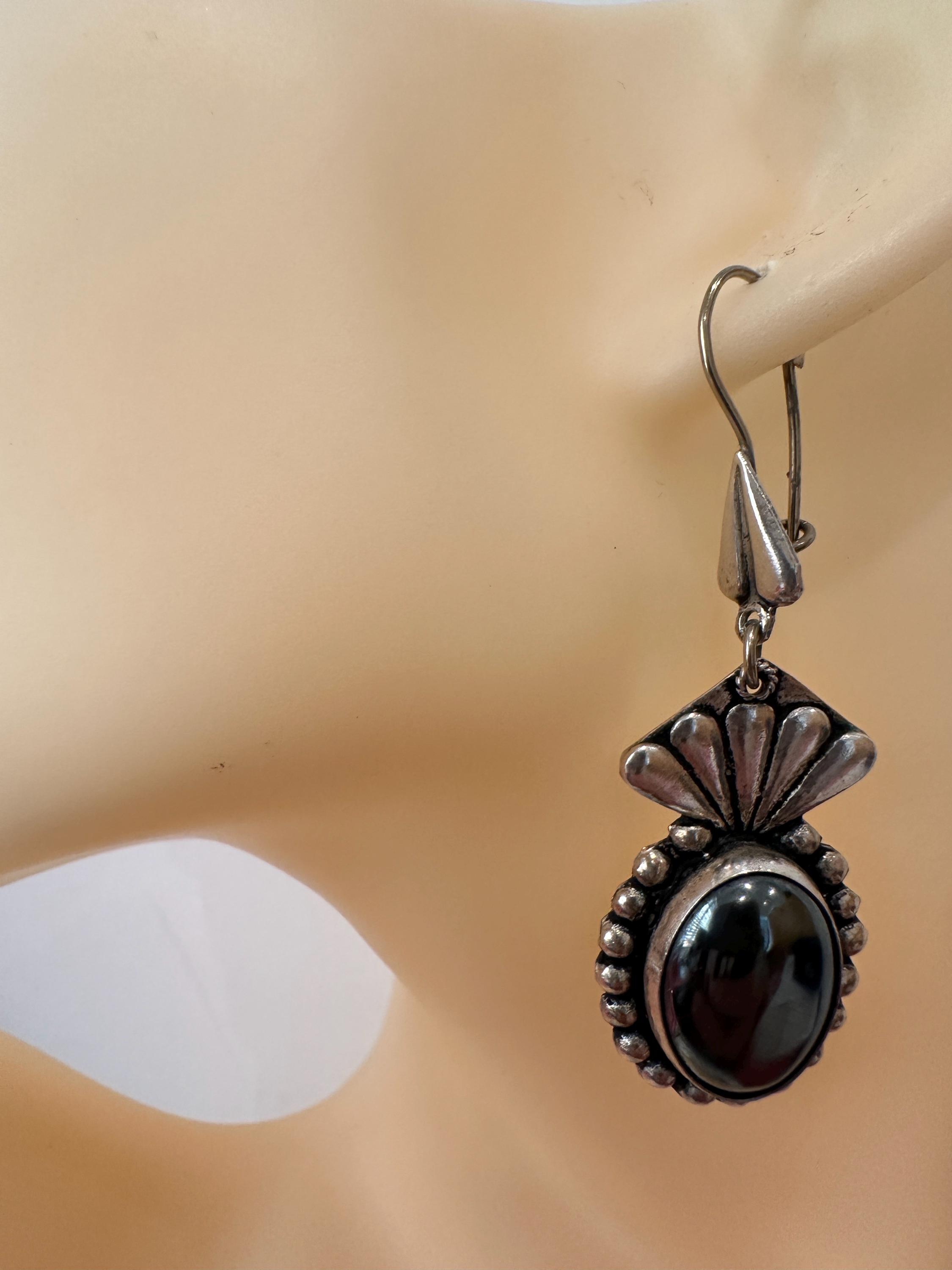 Large Mexican silver earrings set with oval hematite cabochons. Theses earrings measure a drop of 6.5cm and a width of 2cm. These are marked on reverse 950( a mark used for the grade of silver).