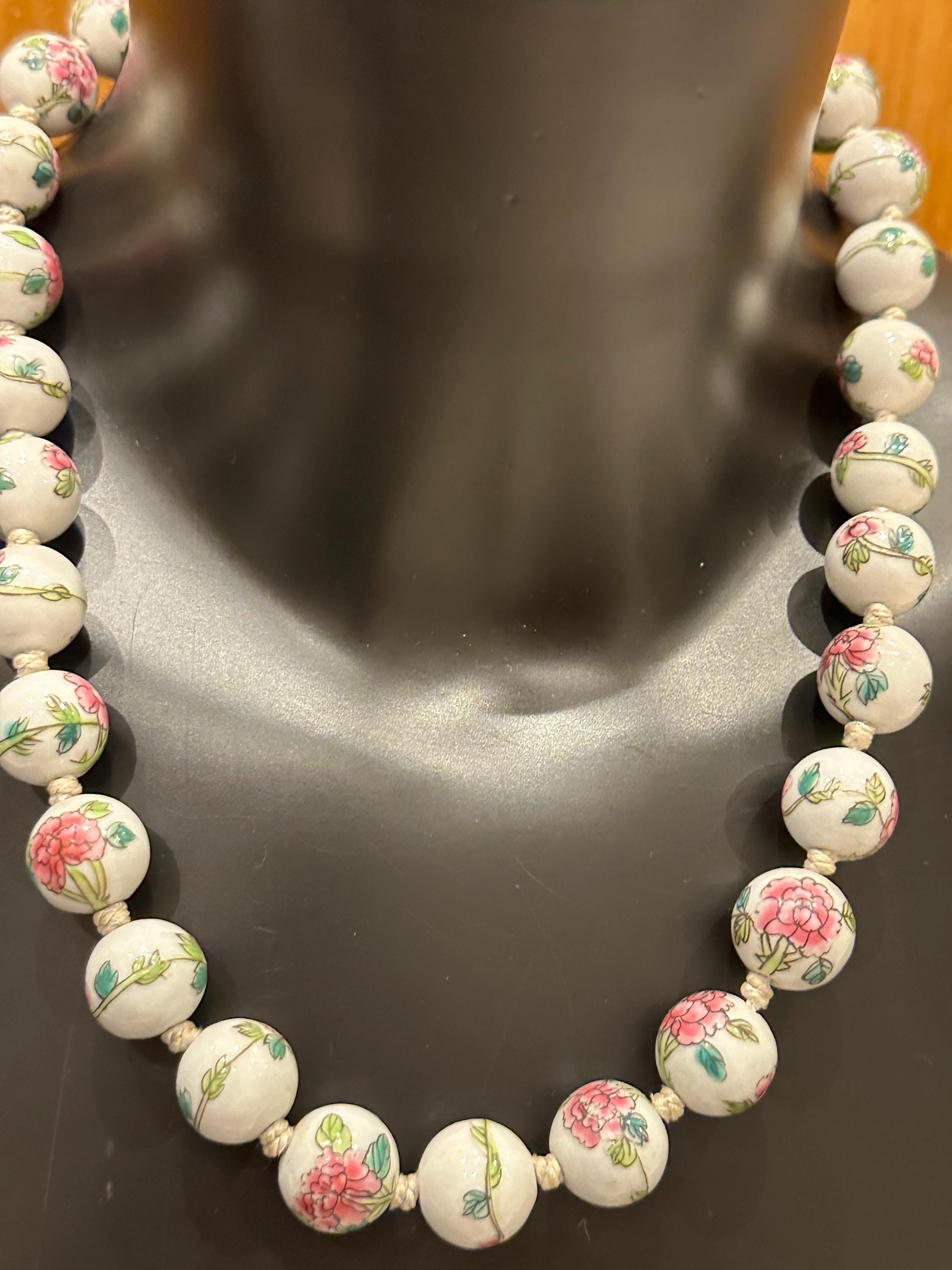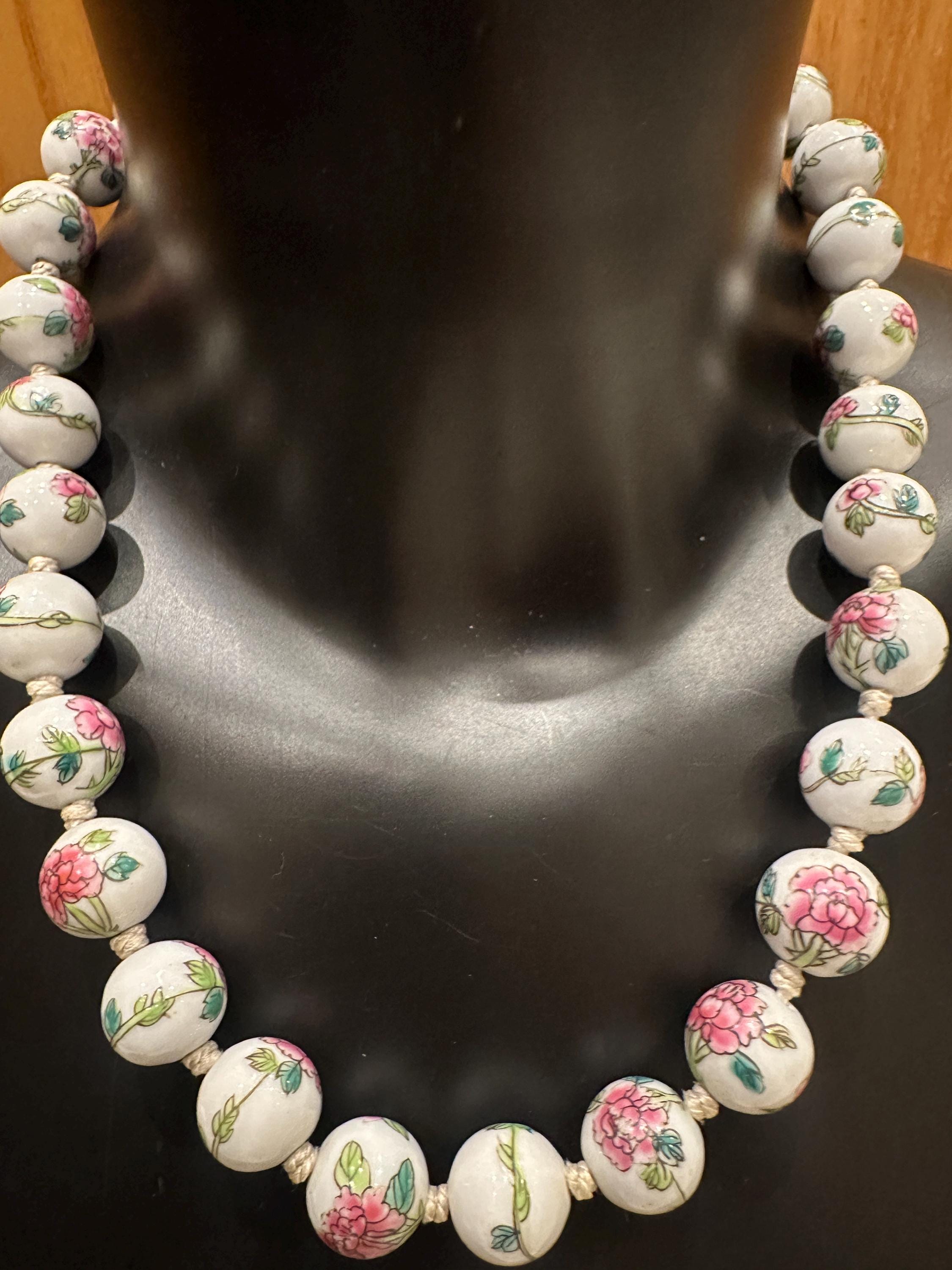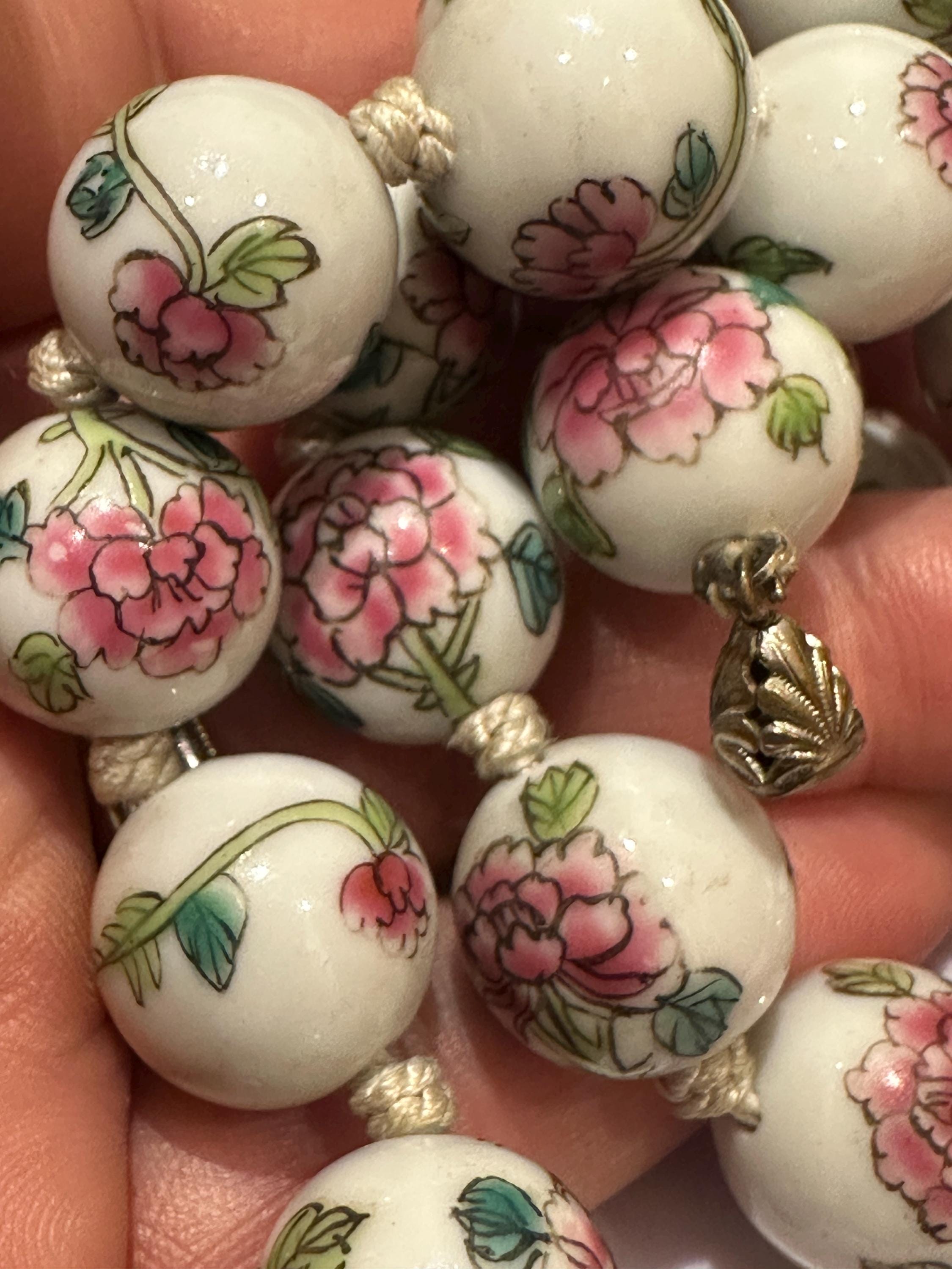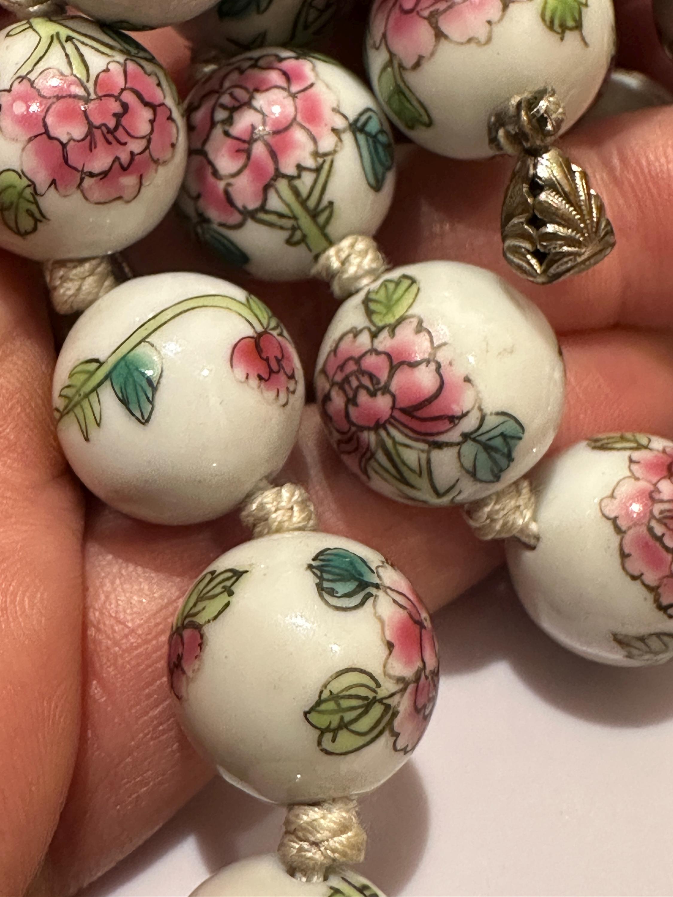 VintageChinese export hand painted Beaded necklace. Made from thick hand knotted silk cord.It measures approximately 20 inches in length. It remains in great condition.