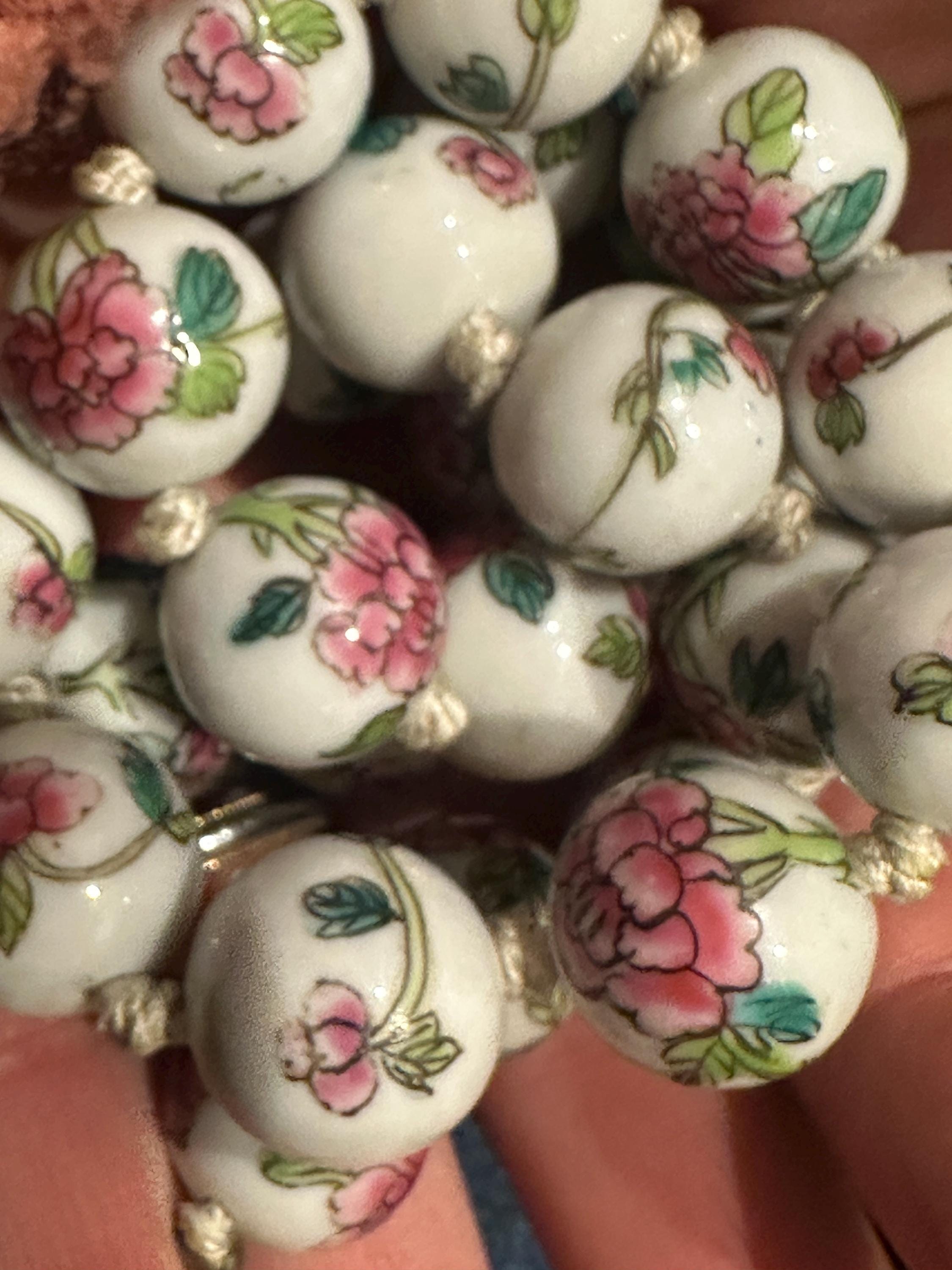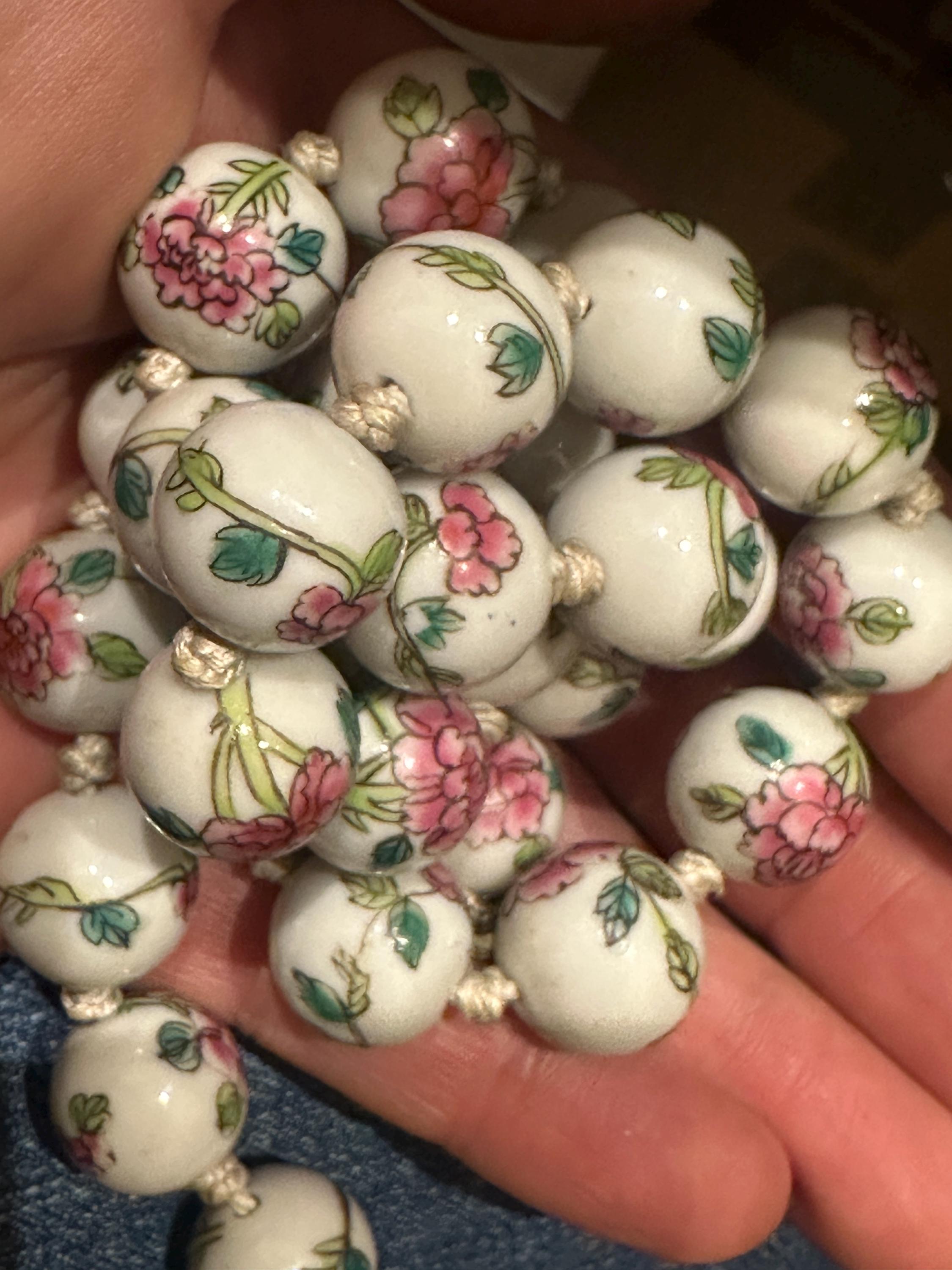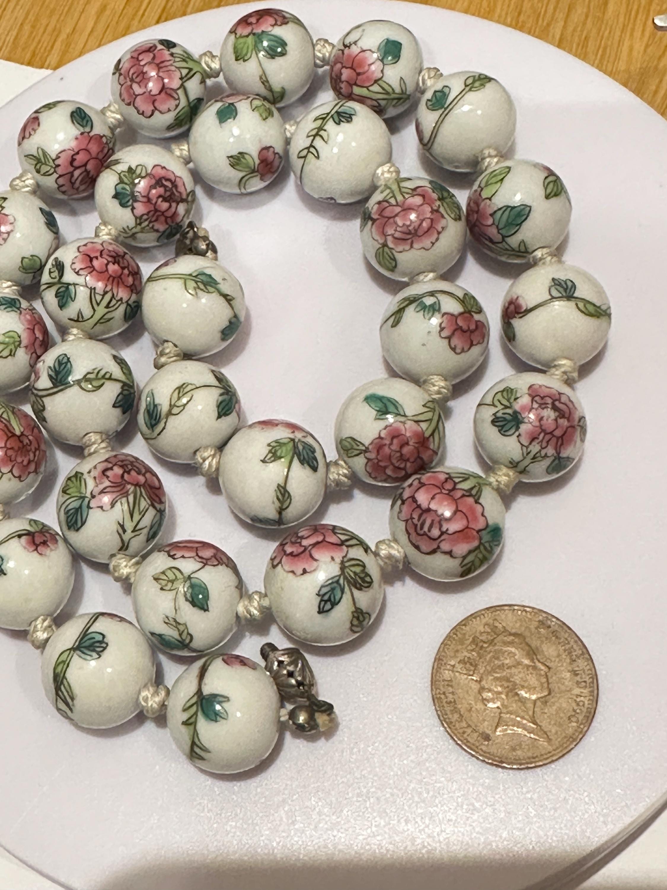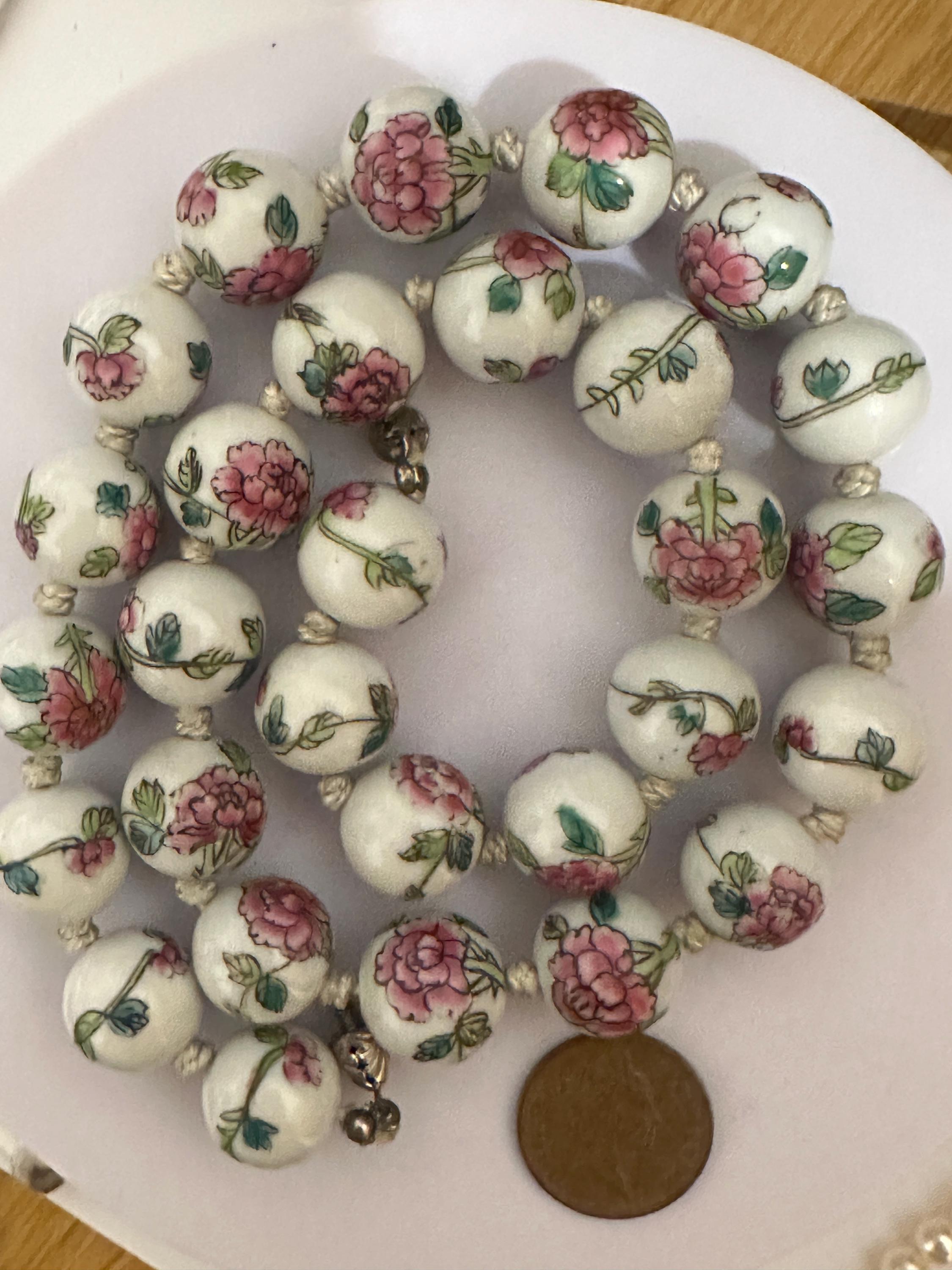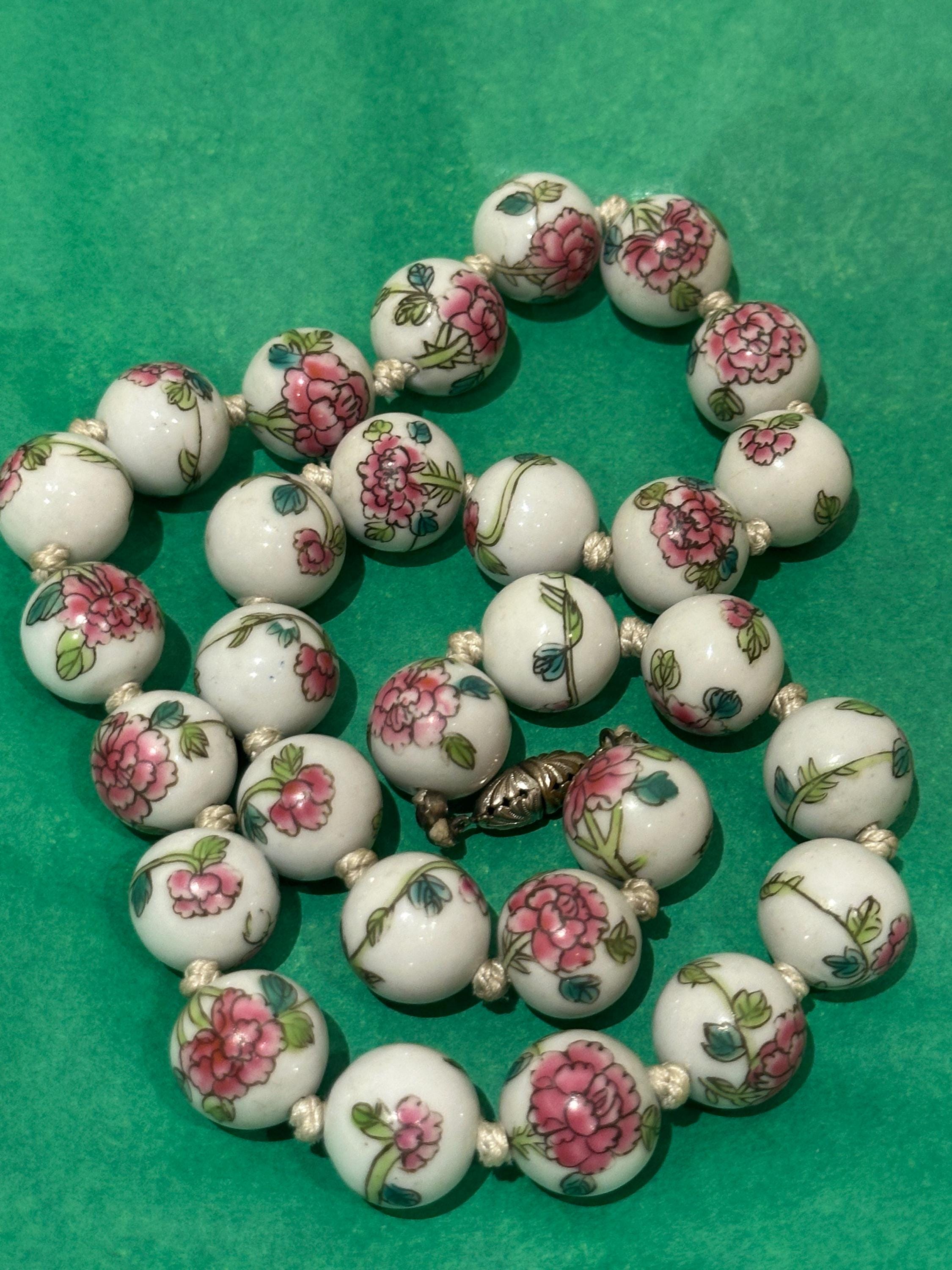 VintageChinese export hand painted Beaded necklace. Made from thick hand knotted silk cord.It measures approximately 20 inches in length. It remains in great condition.