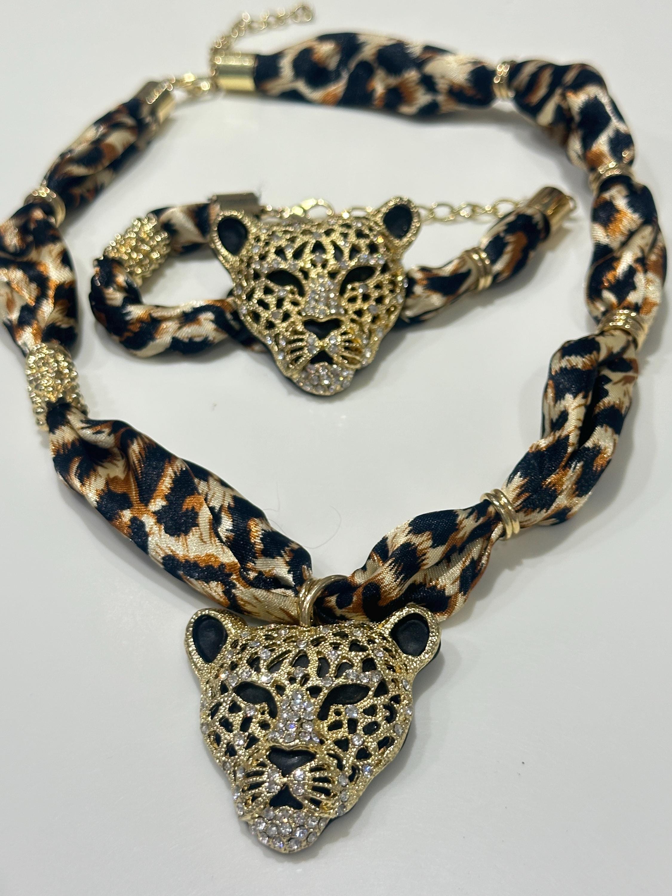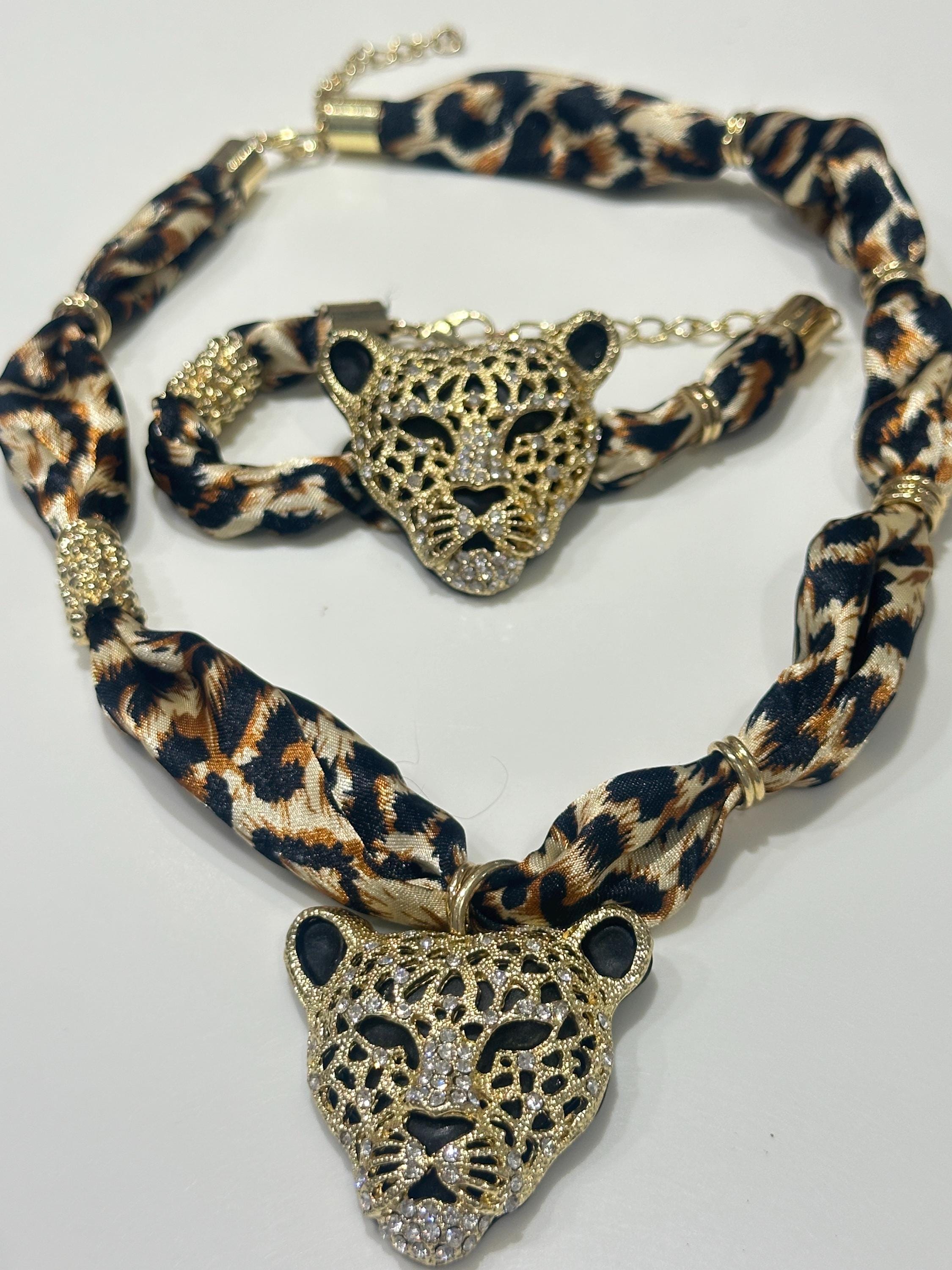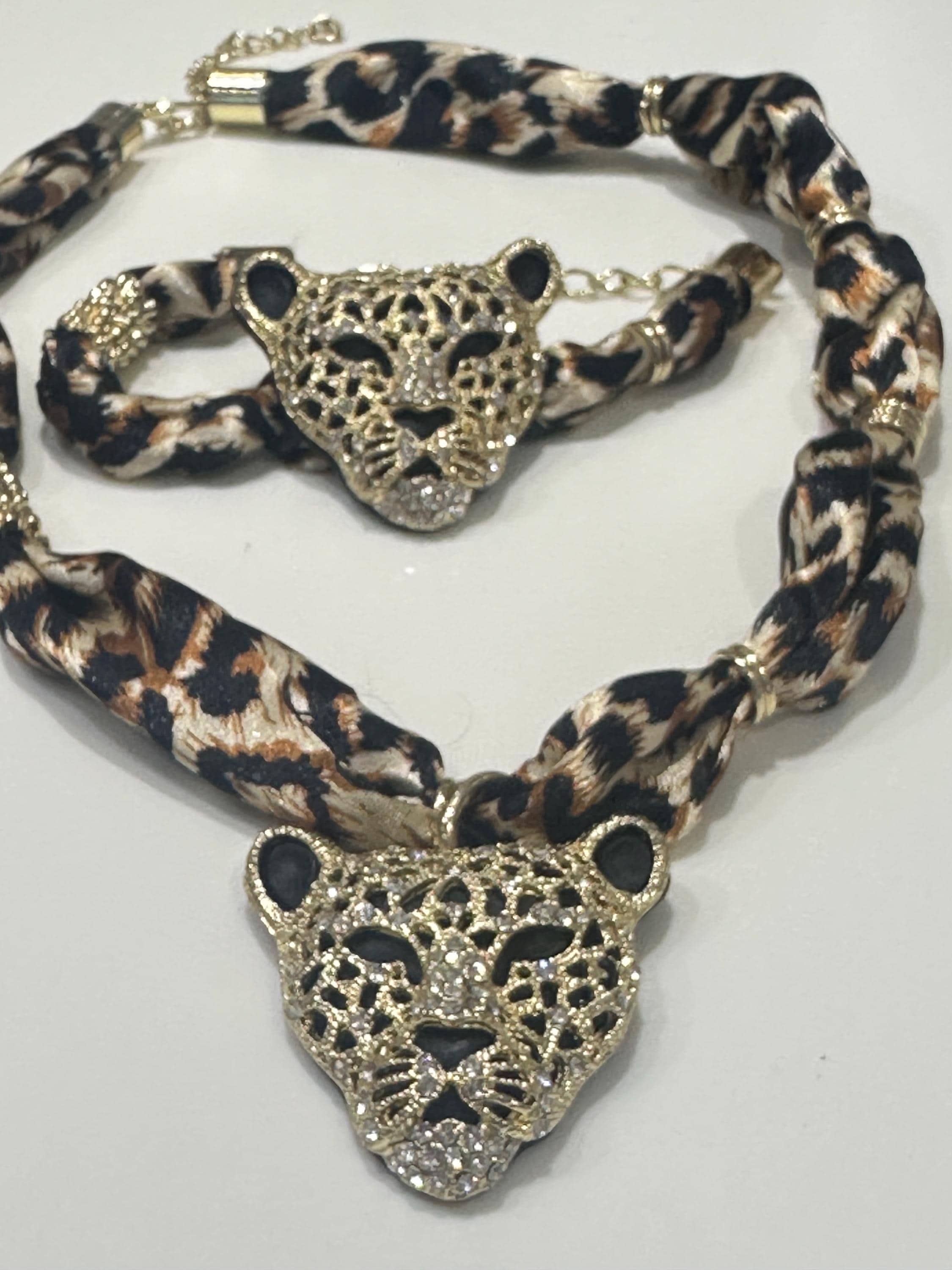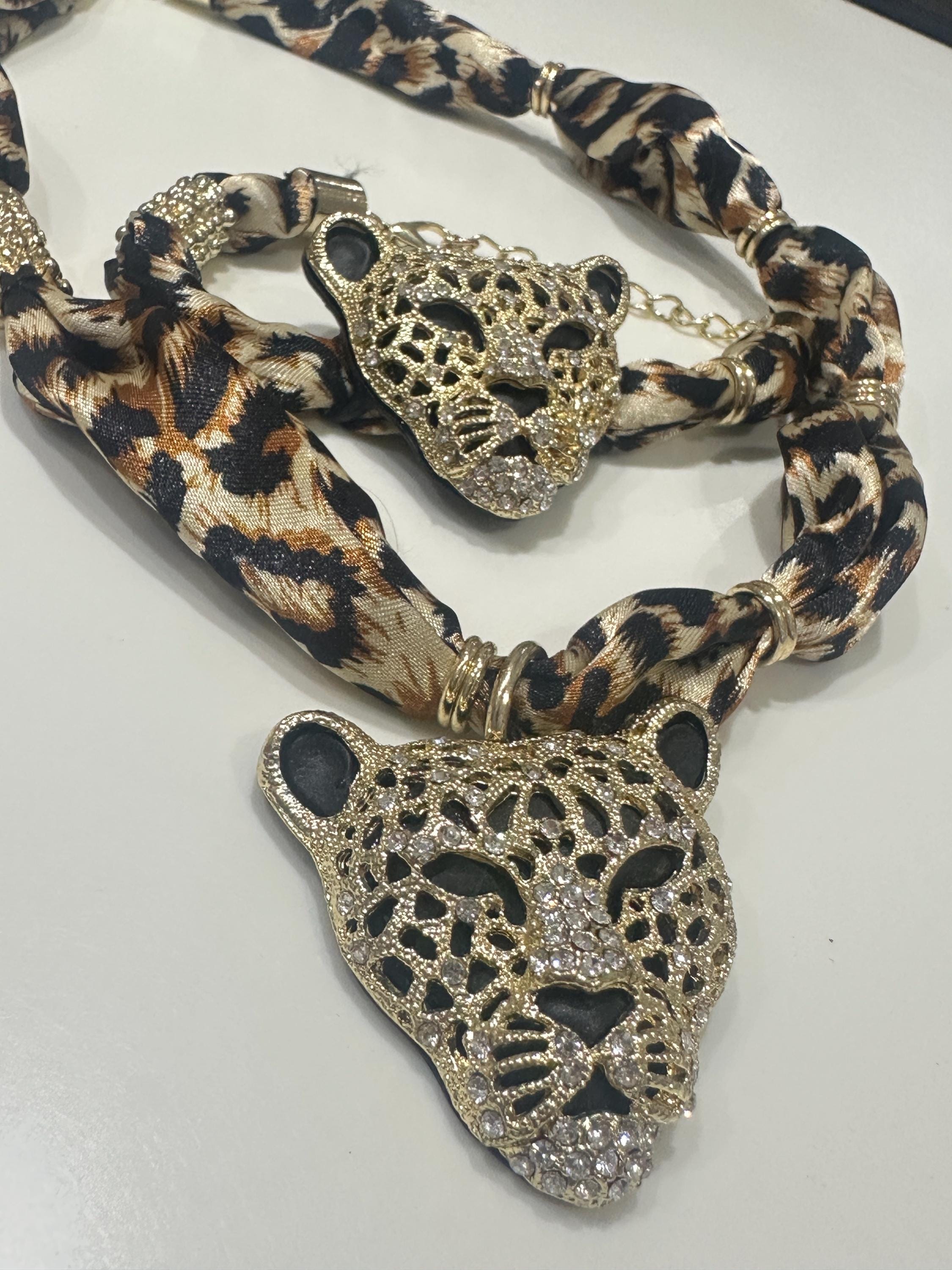 Fun set of oversized Rhinestone Leopard Head Necklace and Bracelet on print fabric.