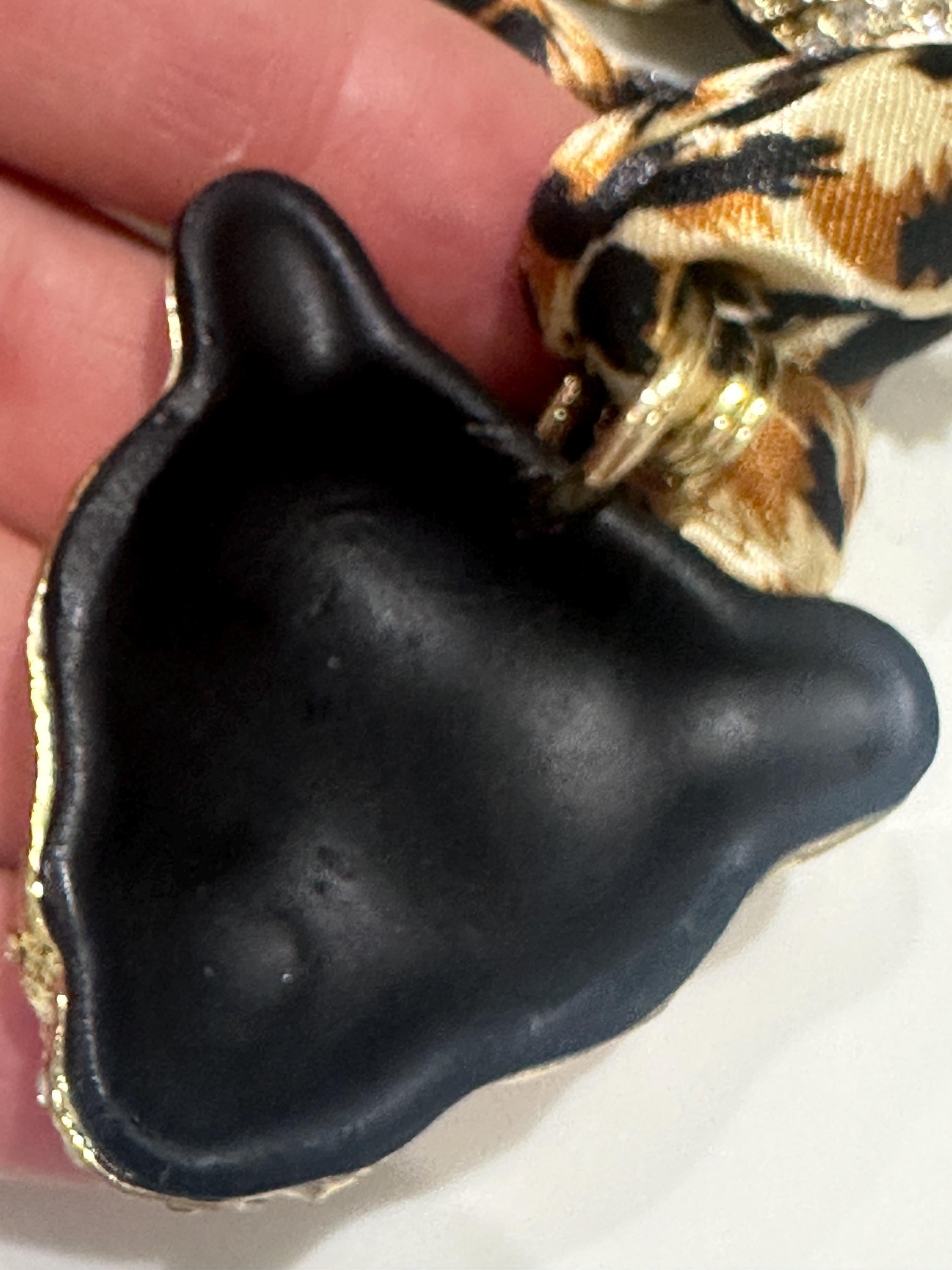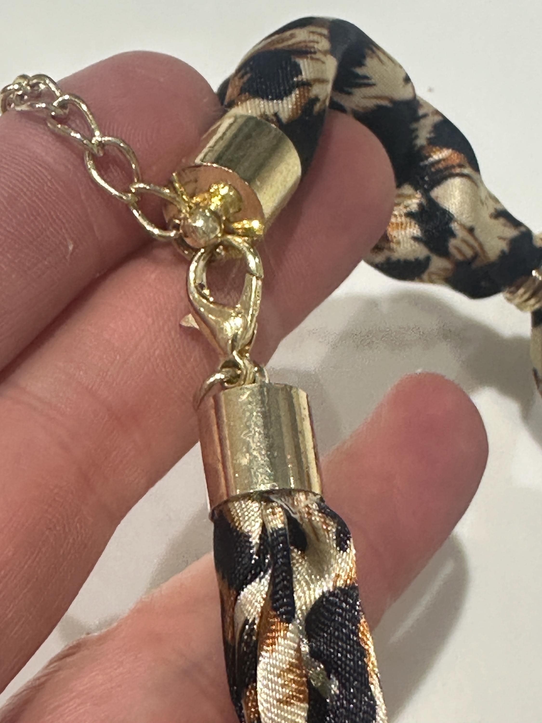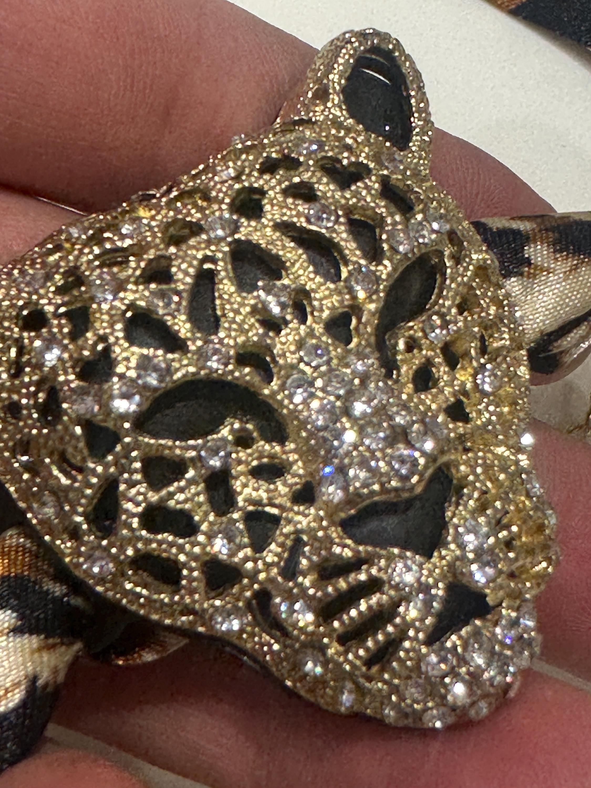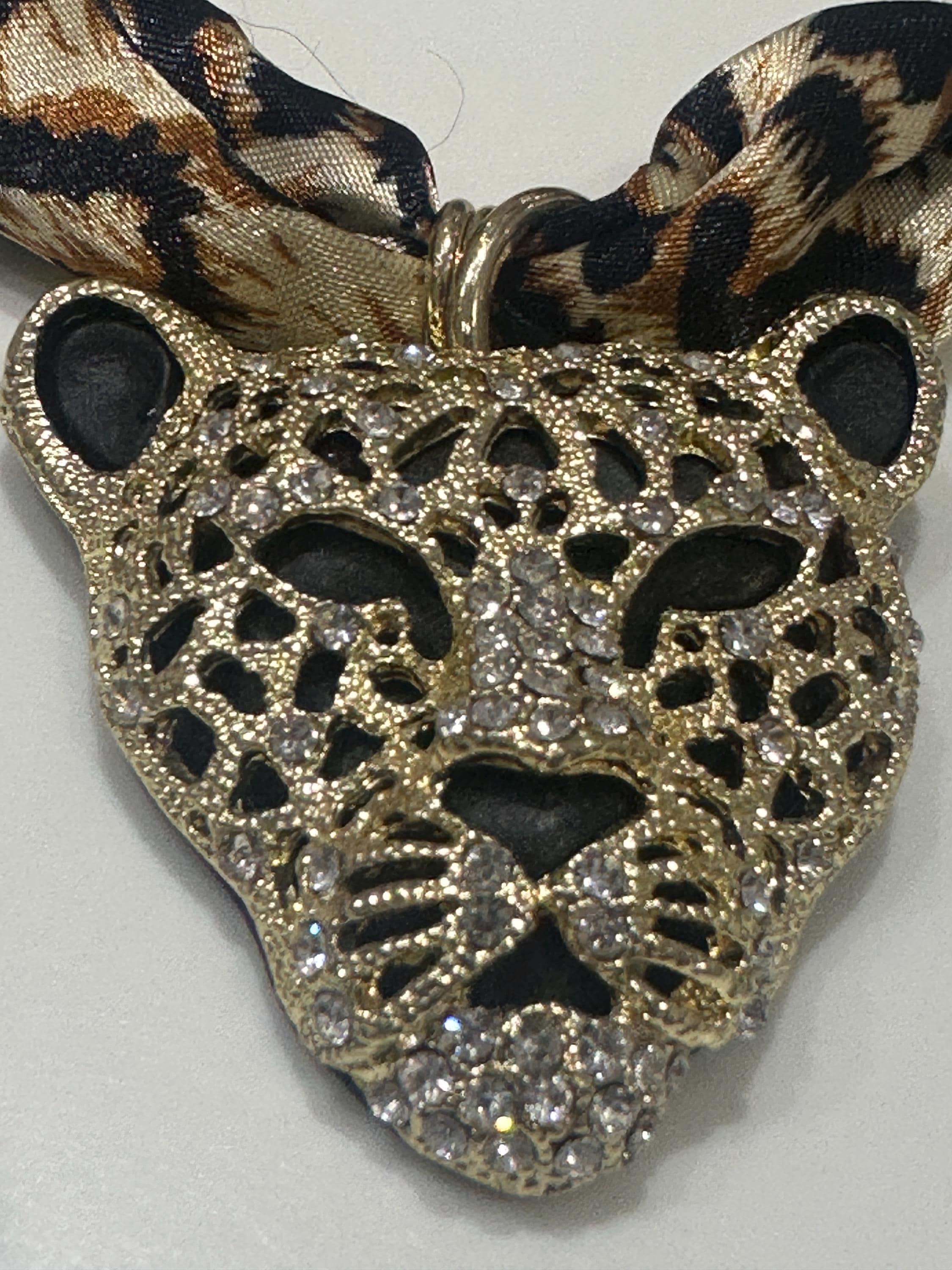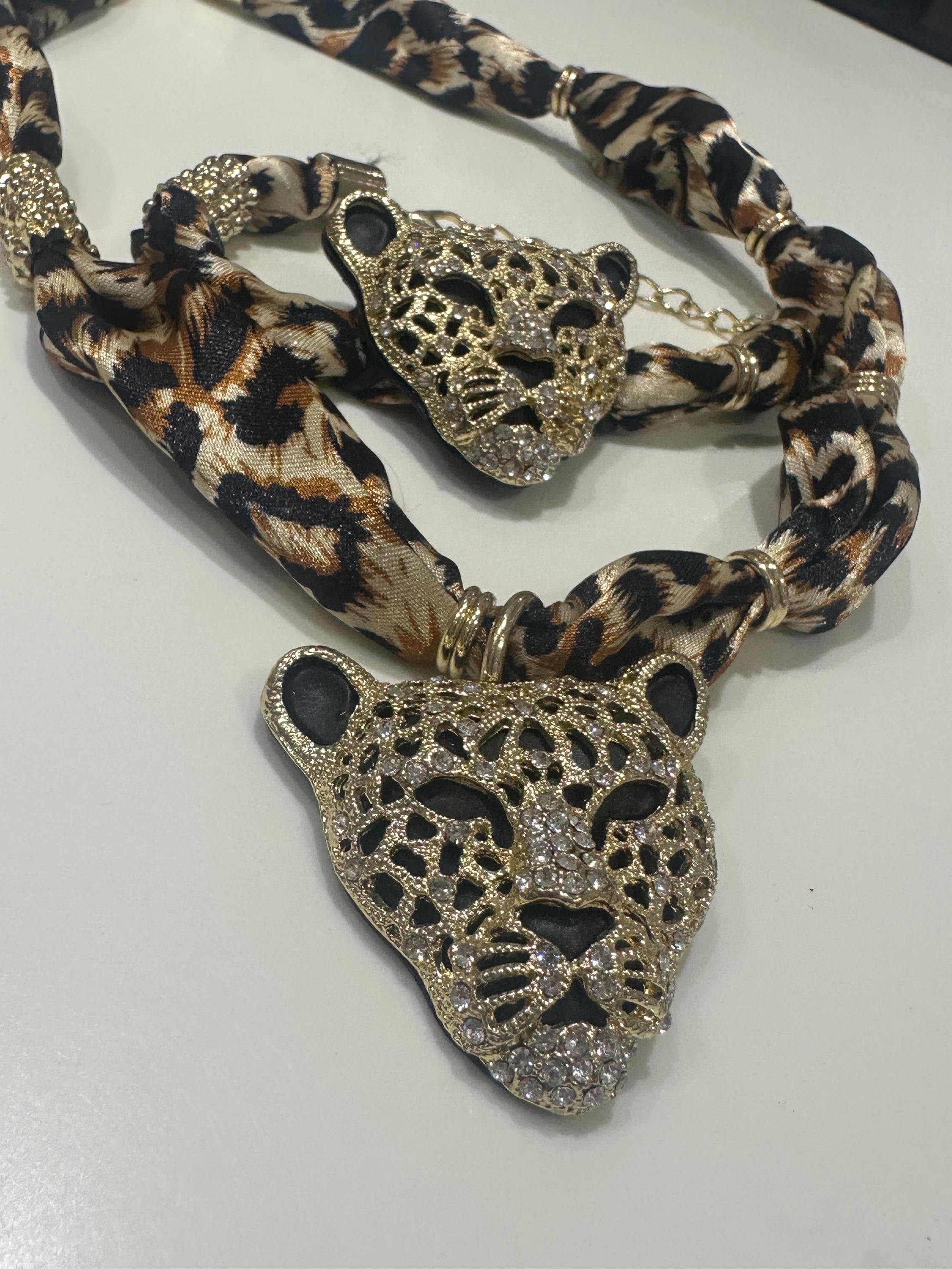 Fun set of oversized Rhinestone Leopard Head Necklace and Bracelet on print fabric.