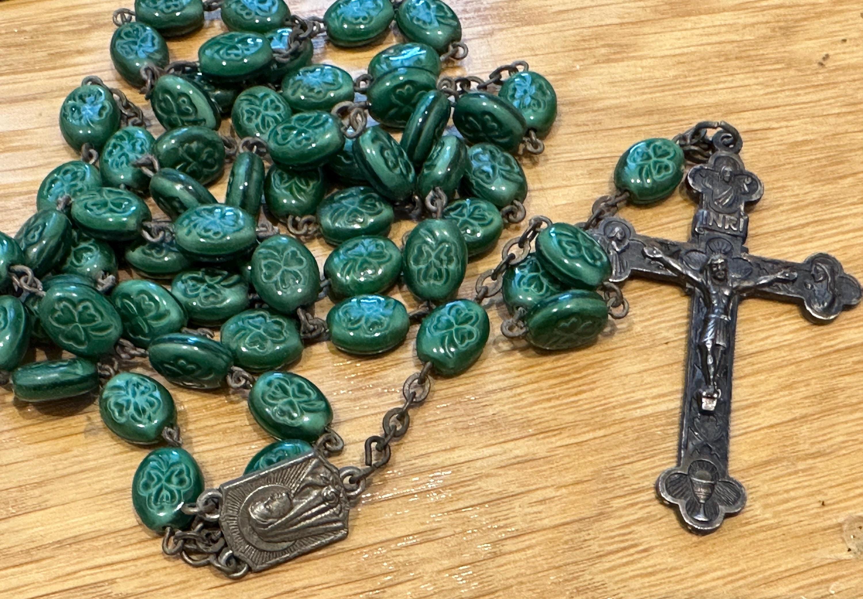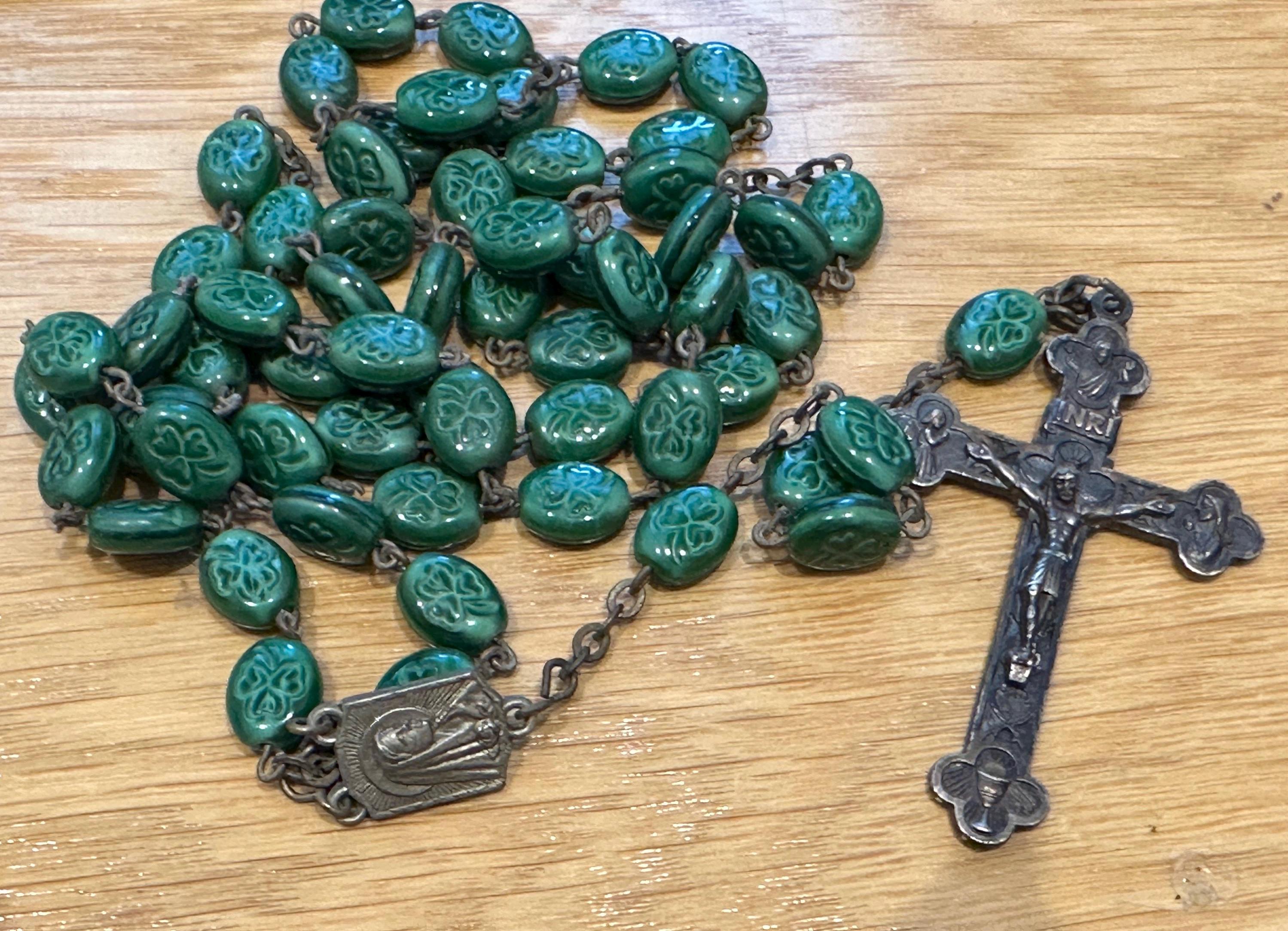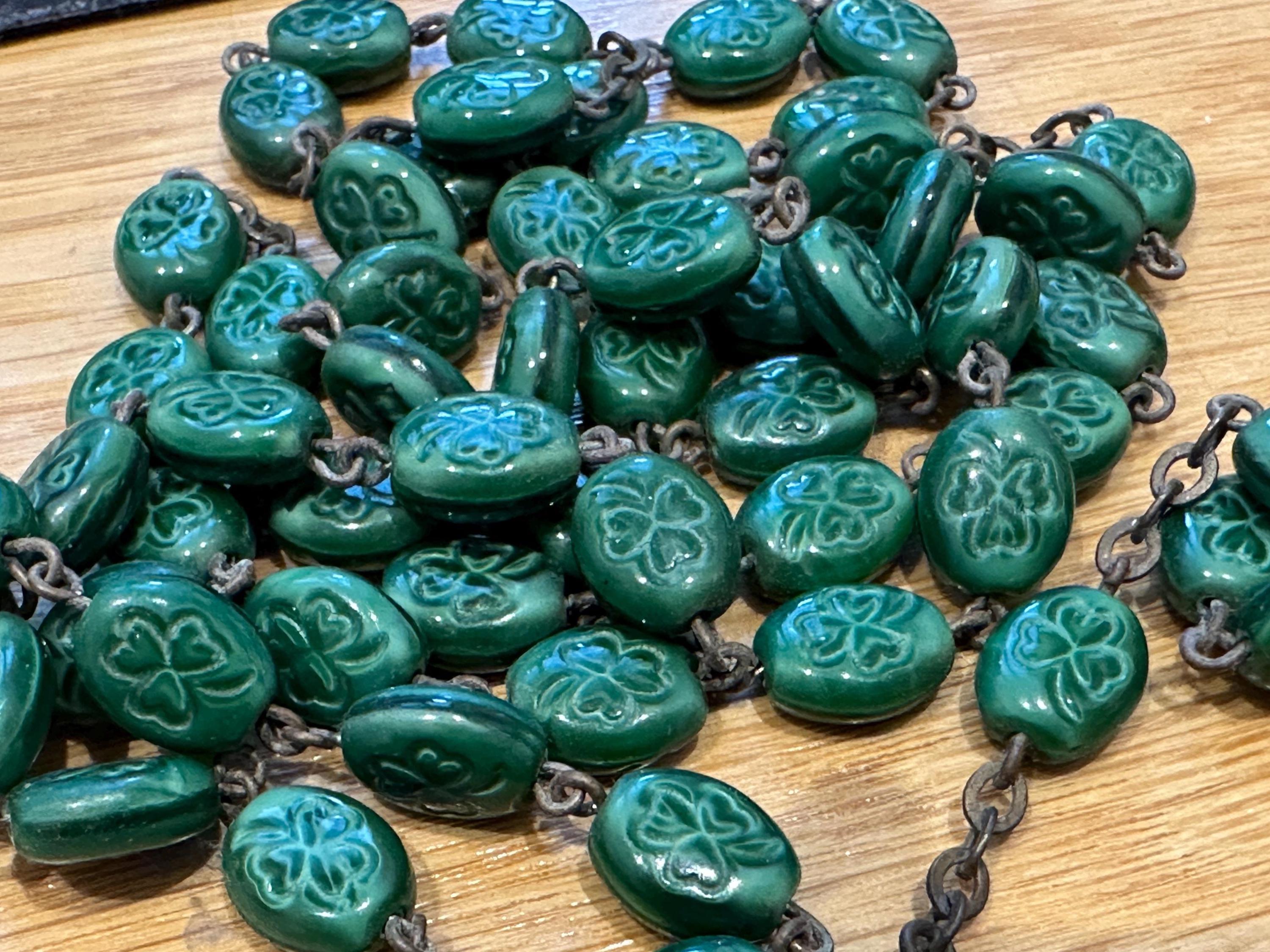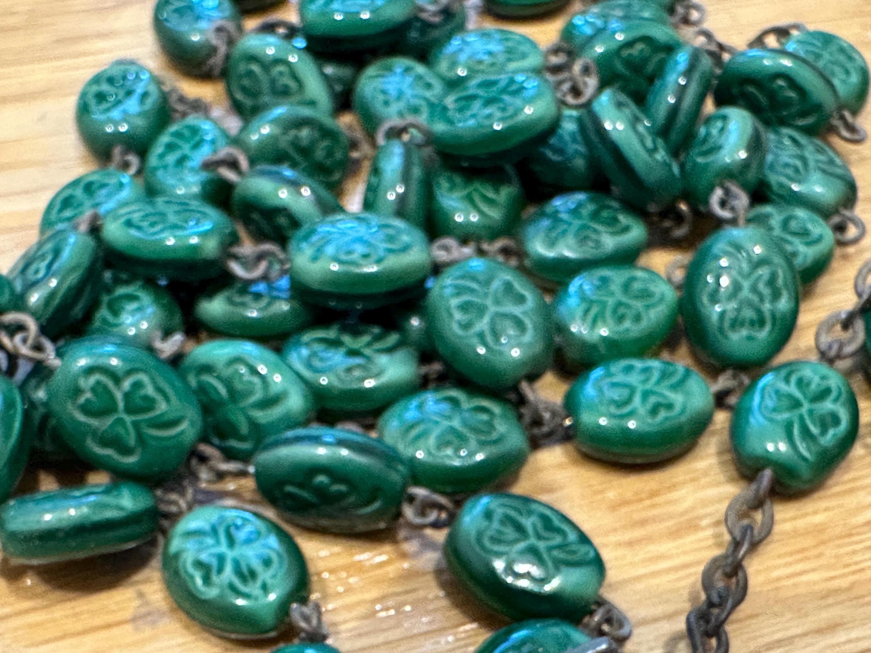 vintage rosary beads. These are made from green glass each featuring a shamrock.im not sure if the cross was the original one as the center piece reads Lourdes and the cross reads Italy. These have quite an aged patina to them cross which. I'm unsure as to what the metal is but out of respect for the piece I havent cleaned it but I’m sure the metal will clean up well.