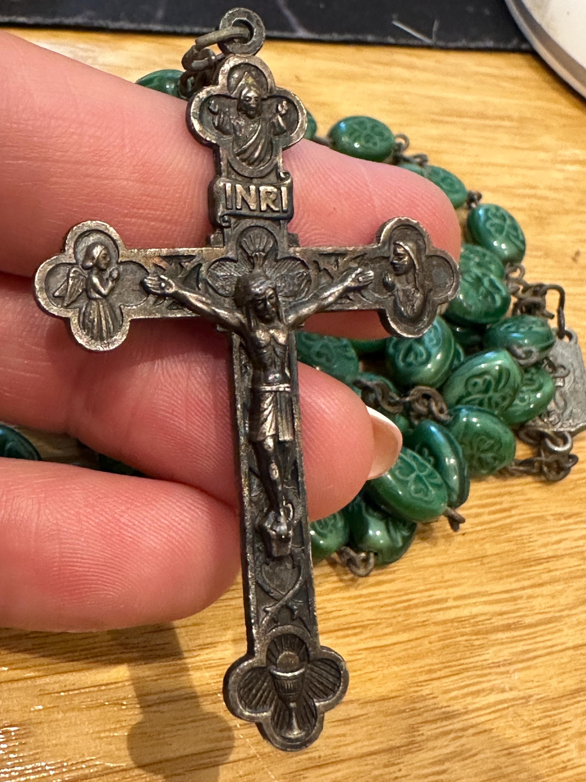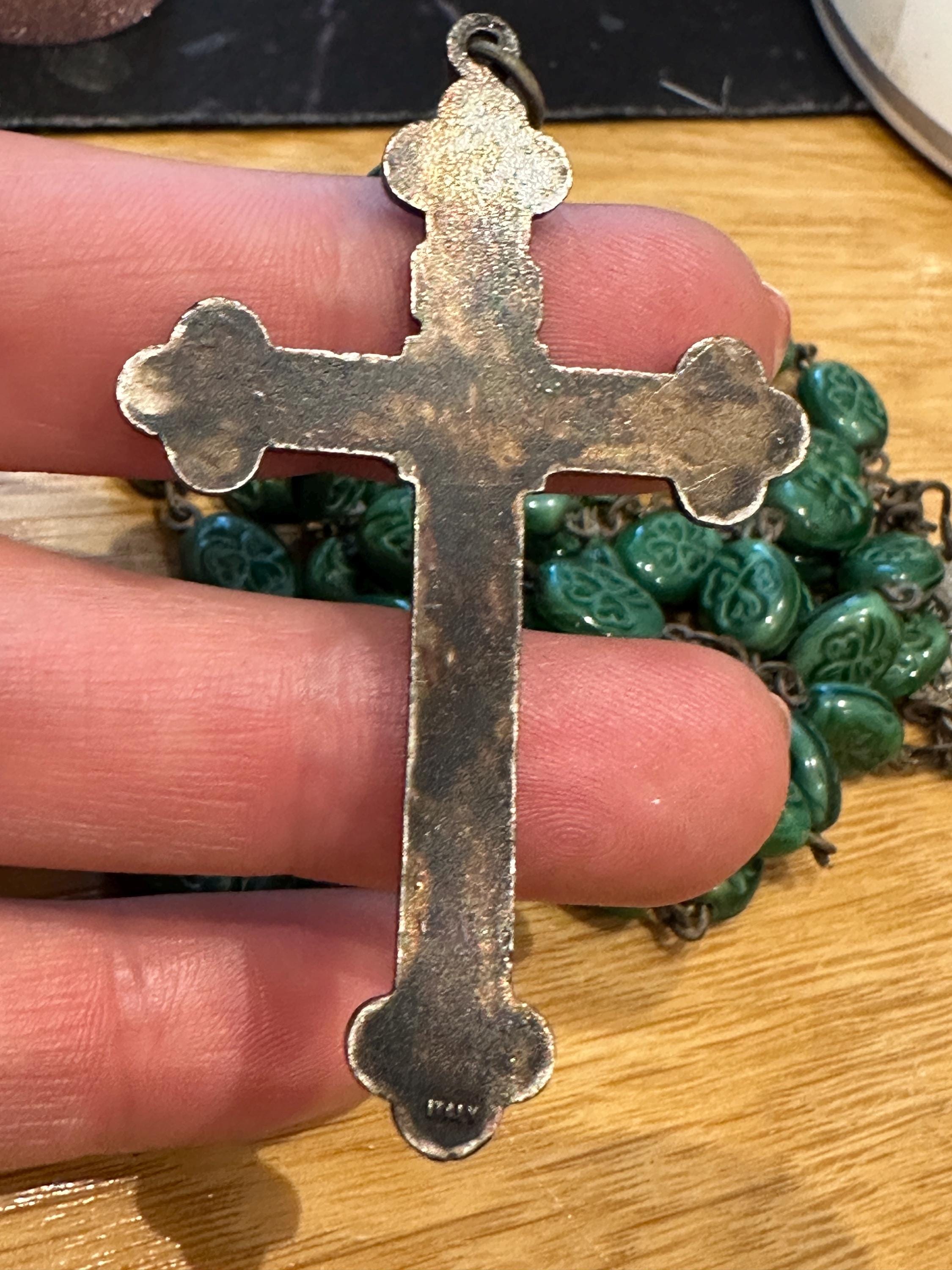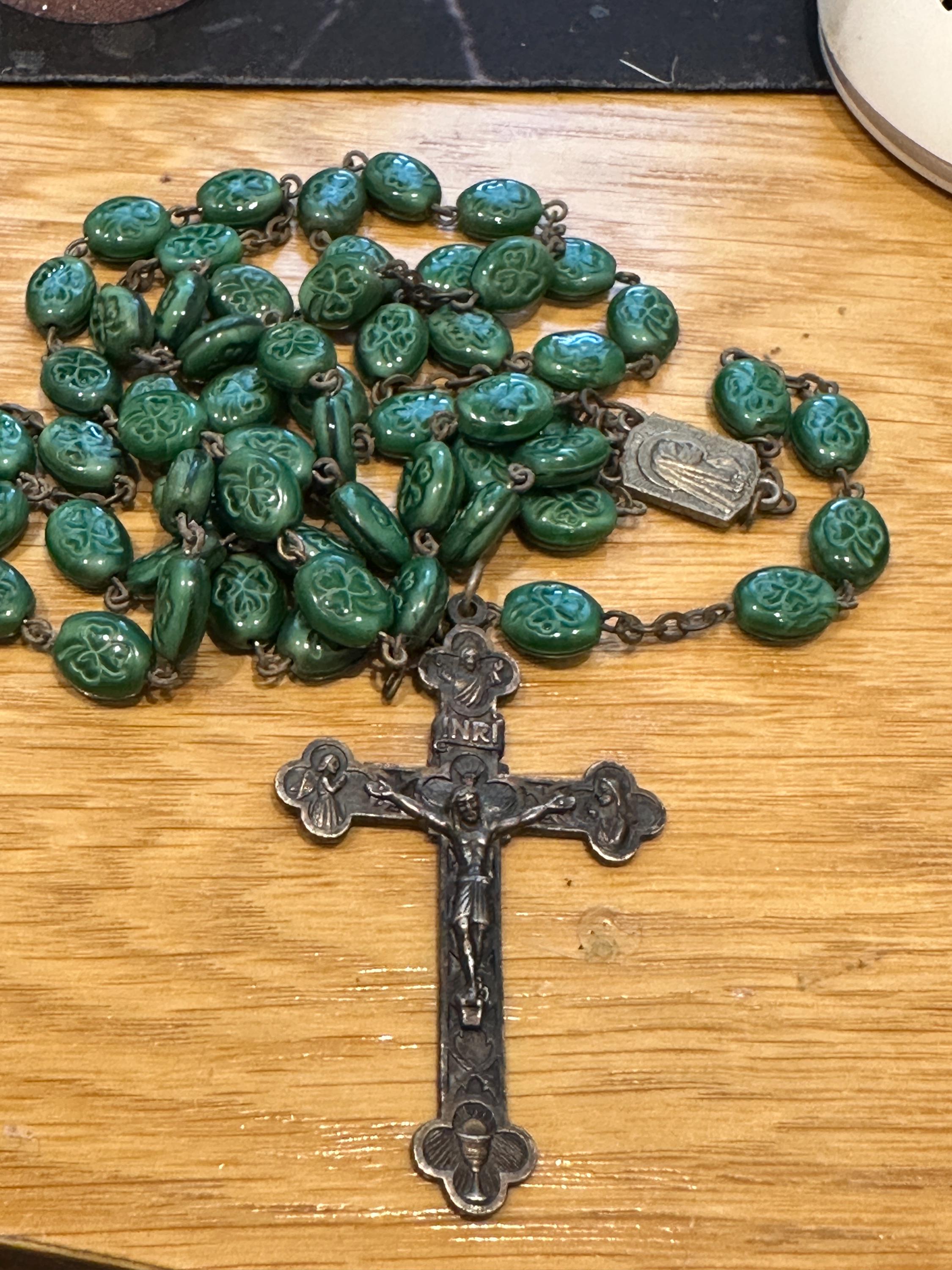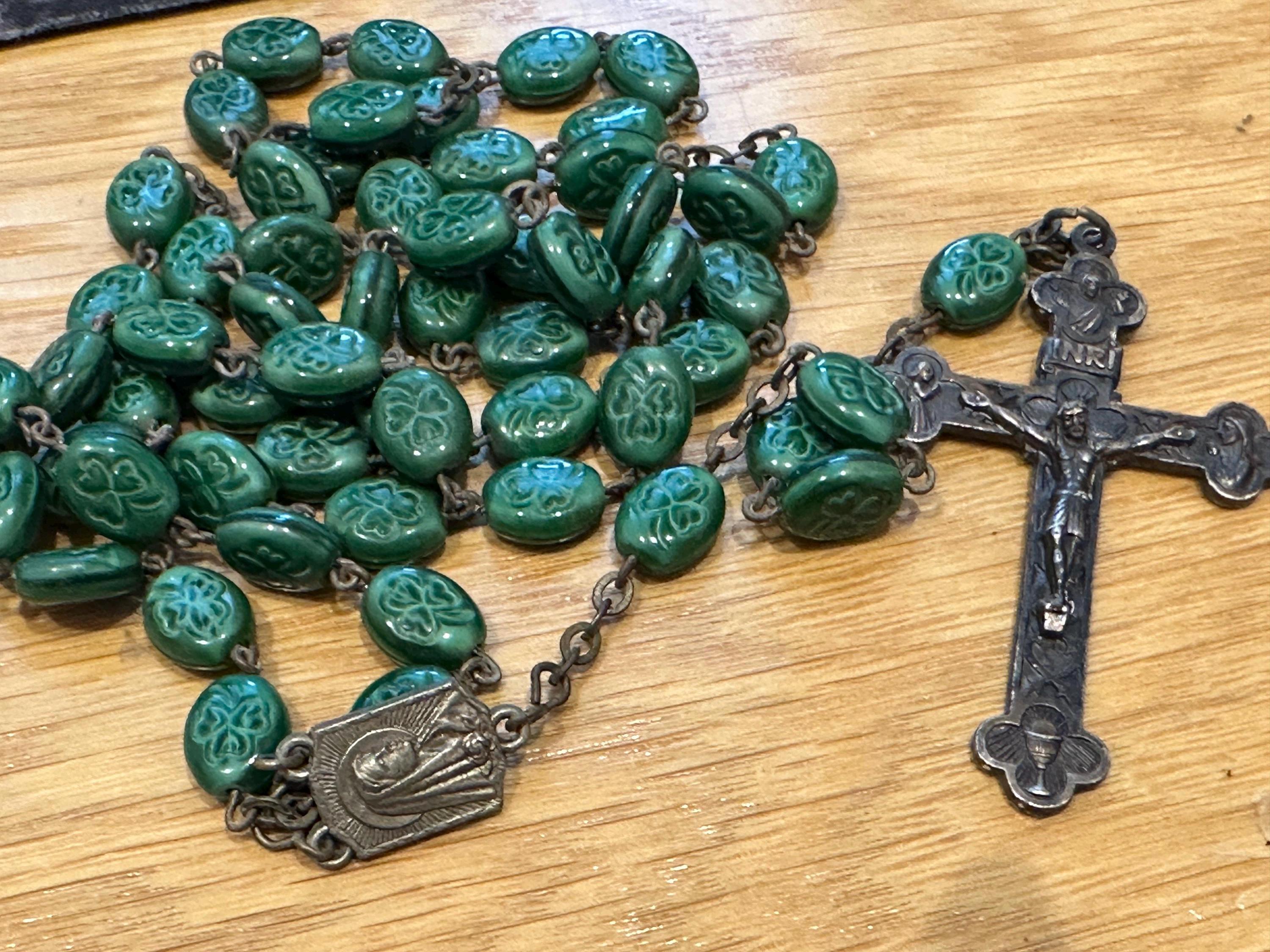 vintage rosary beads. These are made from green glass each featuring a shamrock.im not sure if the cross was the original one as the center piece reads Lourdes and the cross reads Italy. These have quite an aged patina to them cross which. I'm unsure as to what the metal is but out of respect for the piece I havent cleaned it but I’m sure the metal will clean up well.
