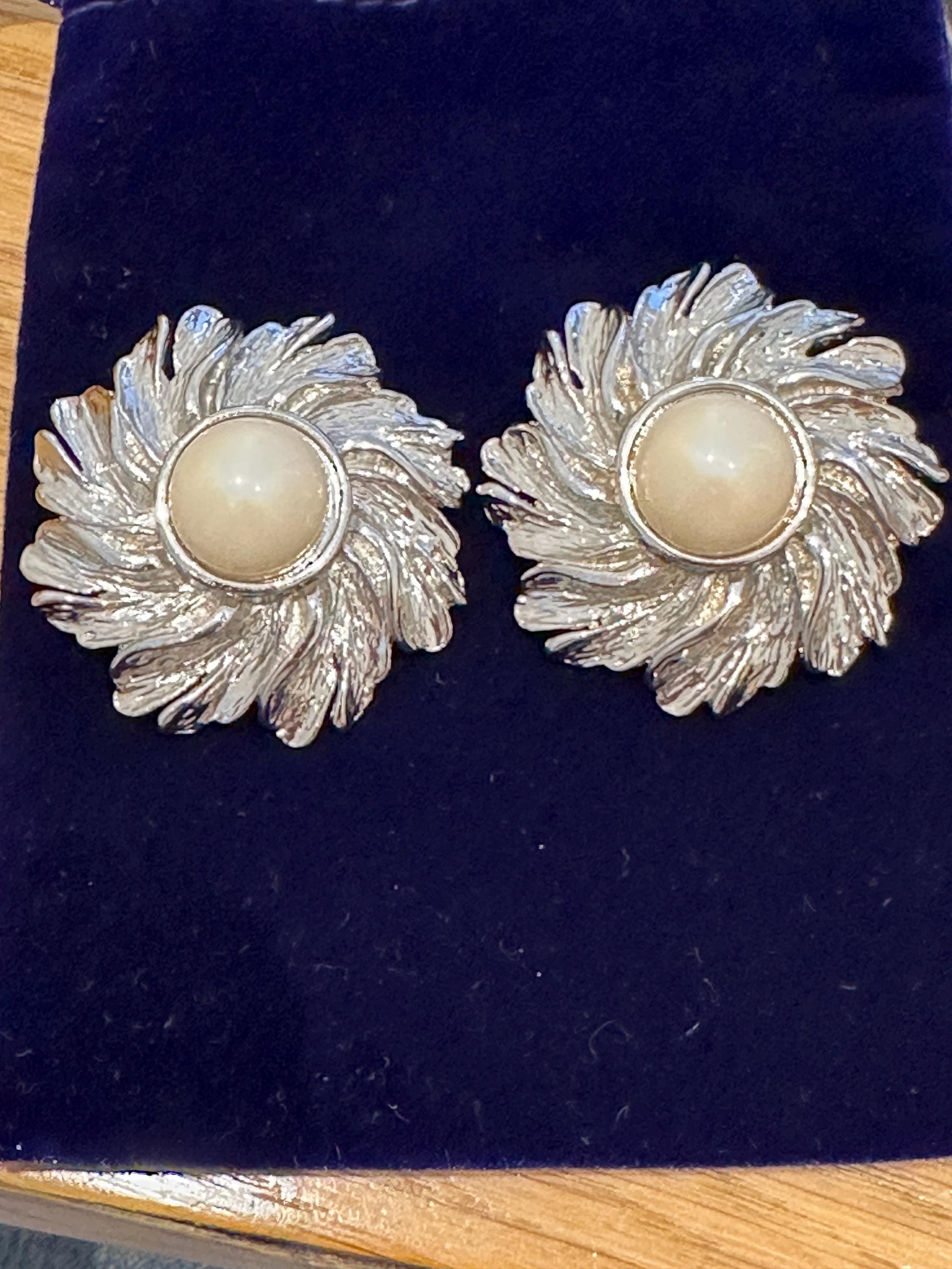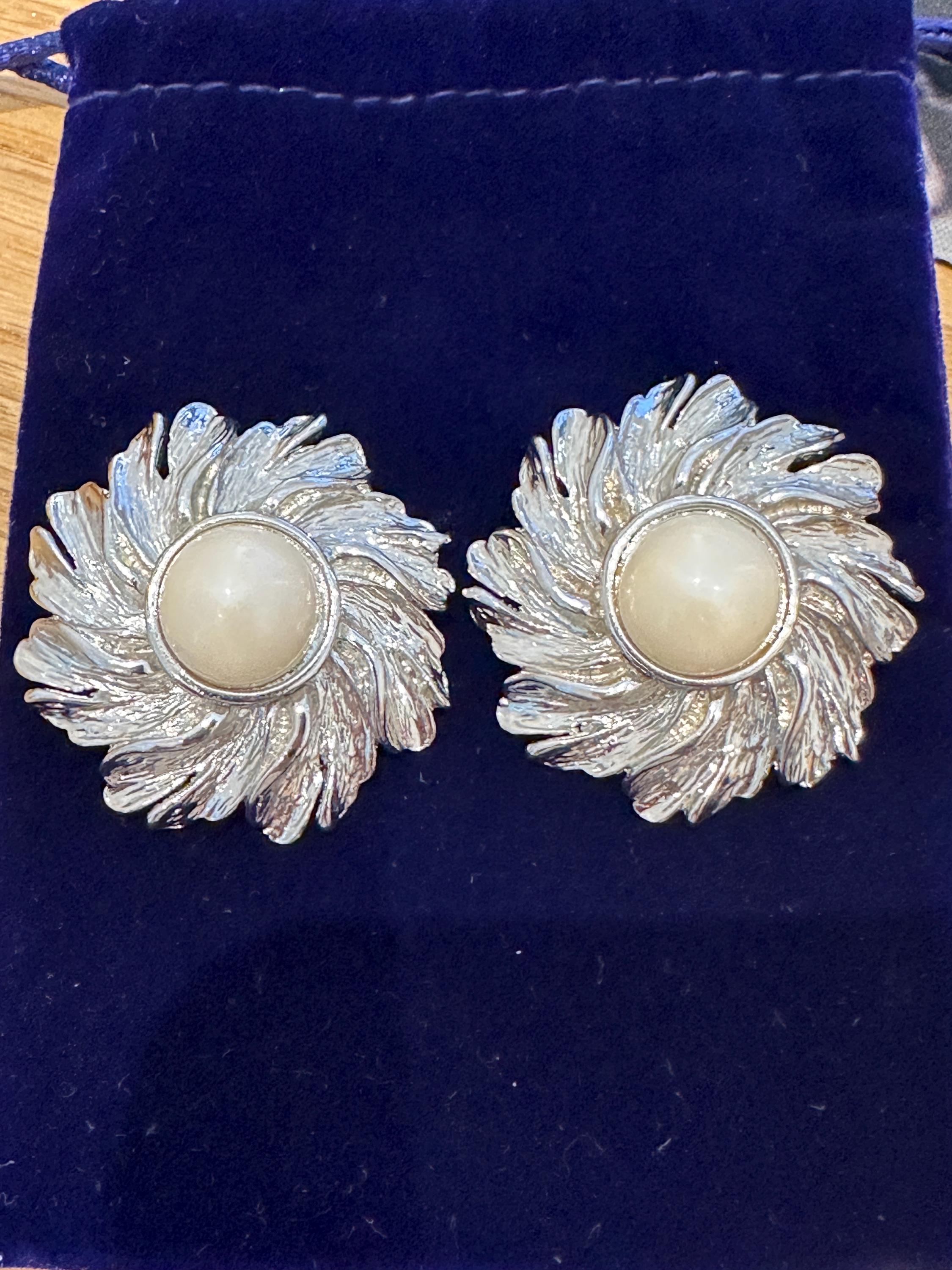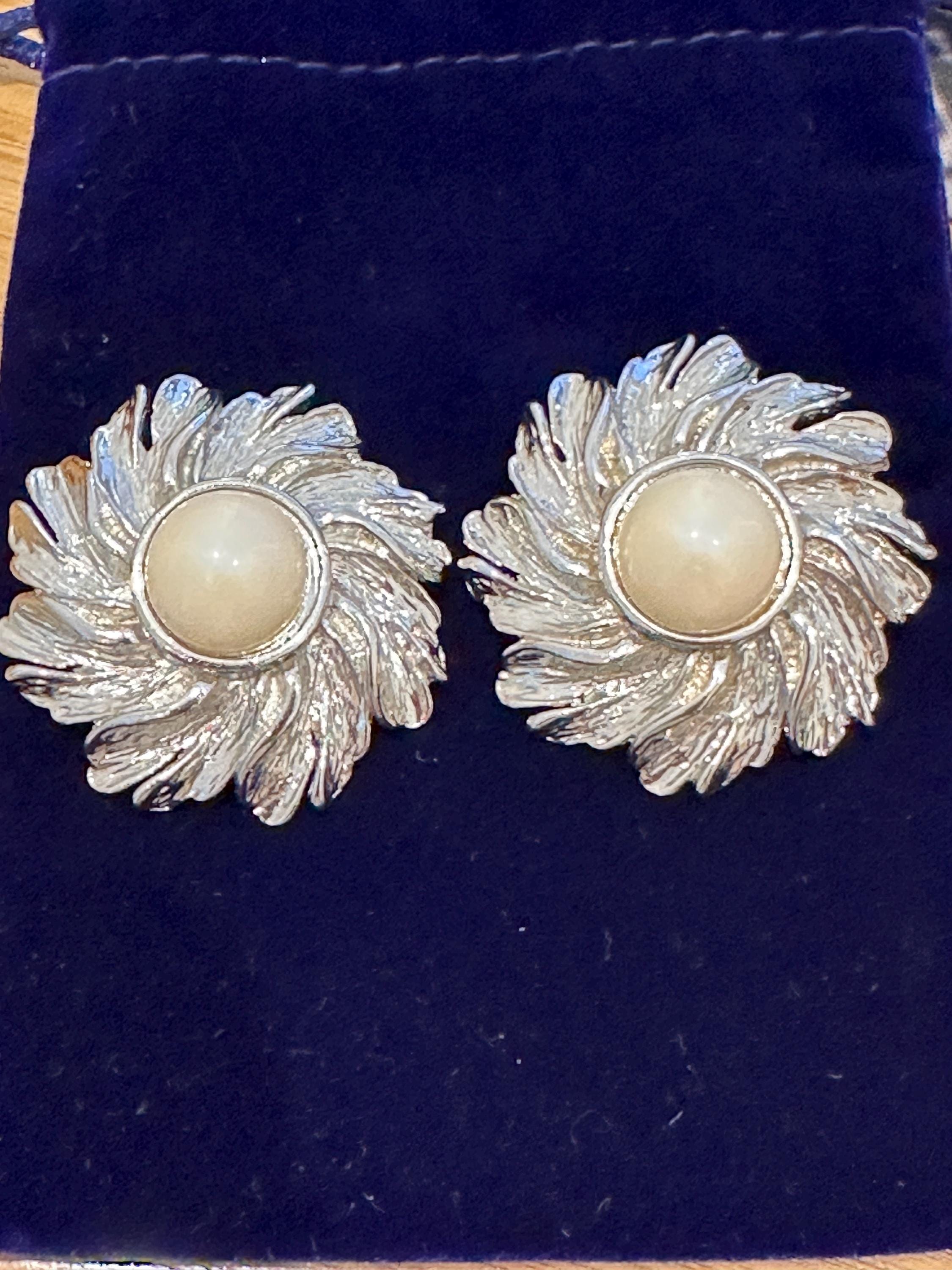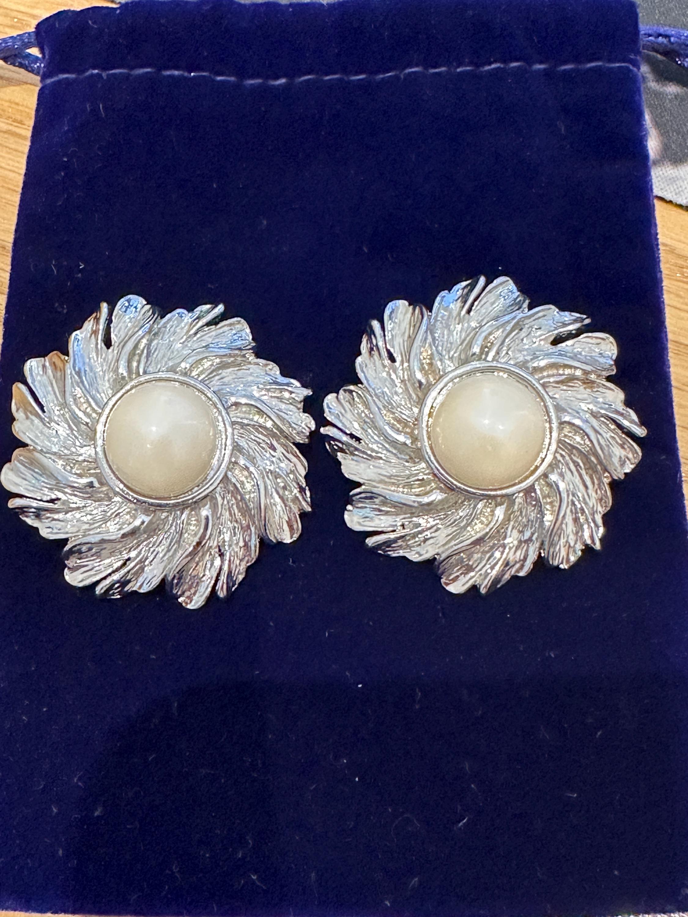 Here are a lovely pair of vintage clip on earrings. The are large in size and measure a diameter of approximately 4cm. These are very well crafted in silver toned metal and set with an imitation pearl. They weigh 21 grams each. These remain in great condition with no damage.