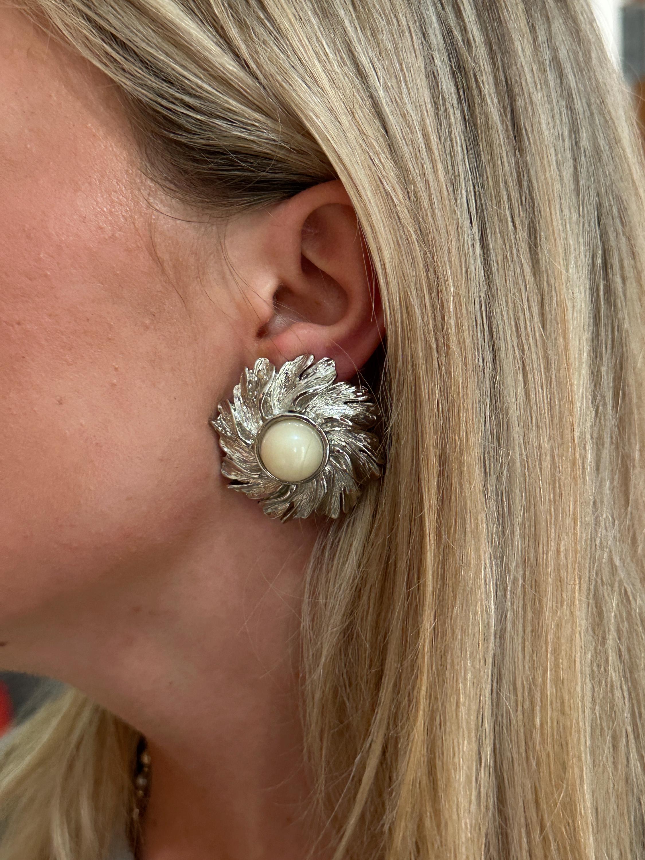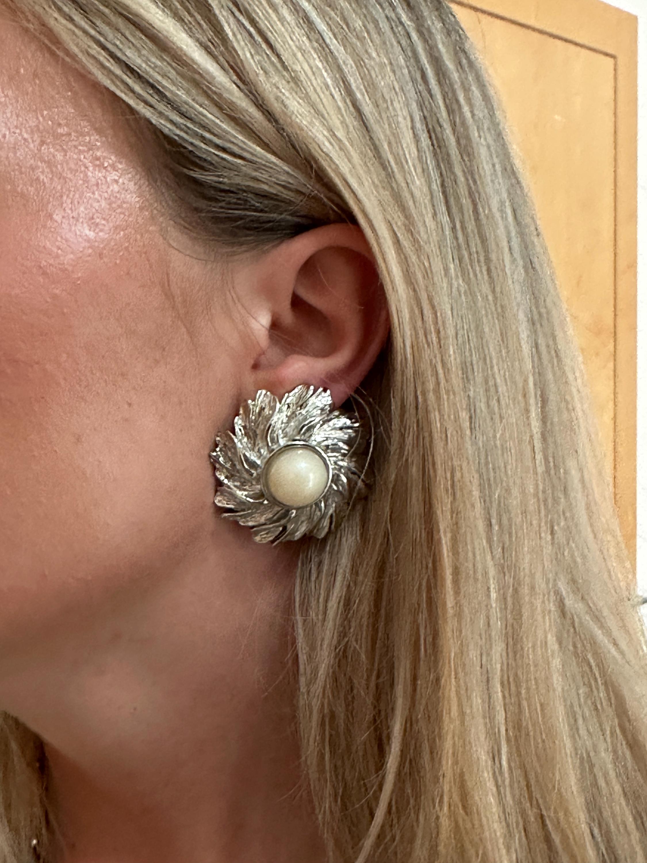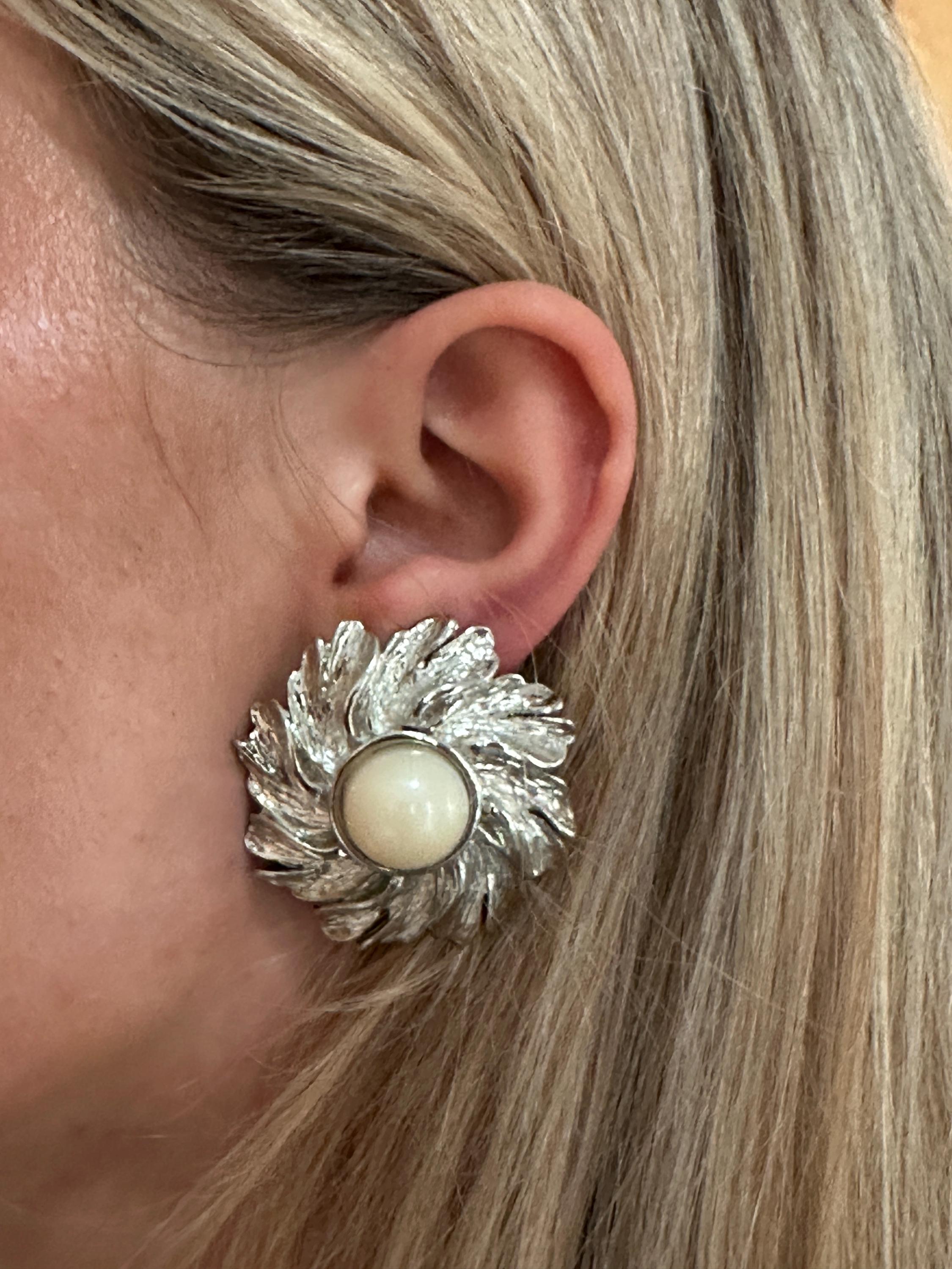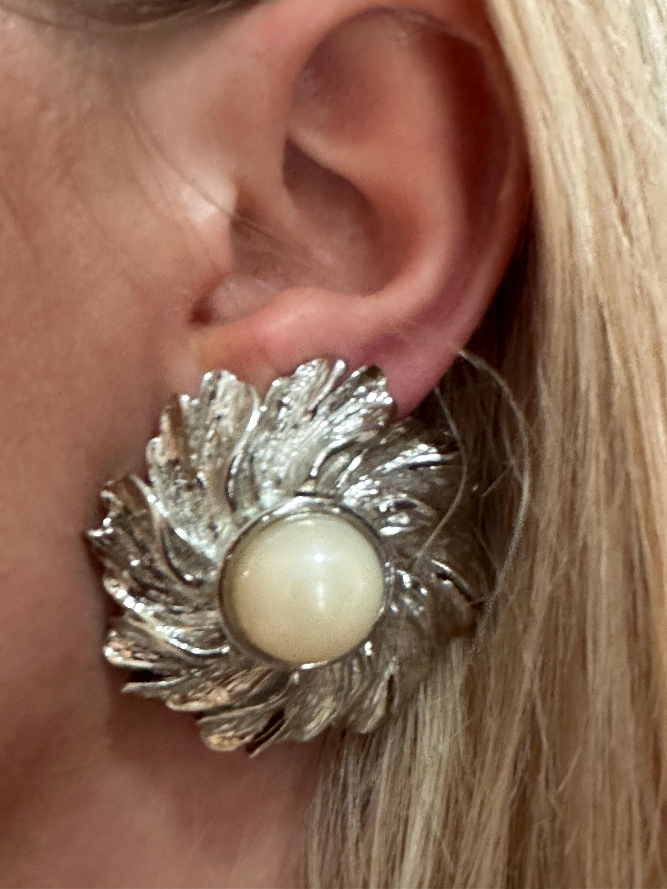 Here are a lovely pair of vintage clip on earrings. The are large in size and measure a diameter of approximately 4cm. These are very well crafted in silver toned metal and set with an imitation pearl. They weigh 21 grams each. These remain in great condition with no damage.