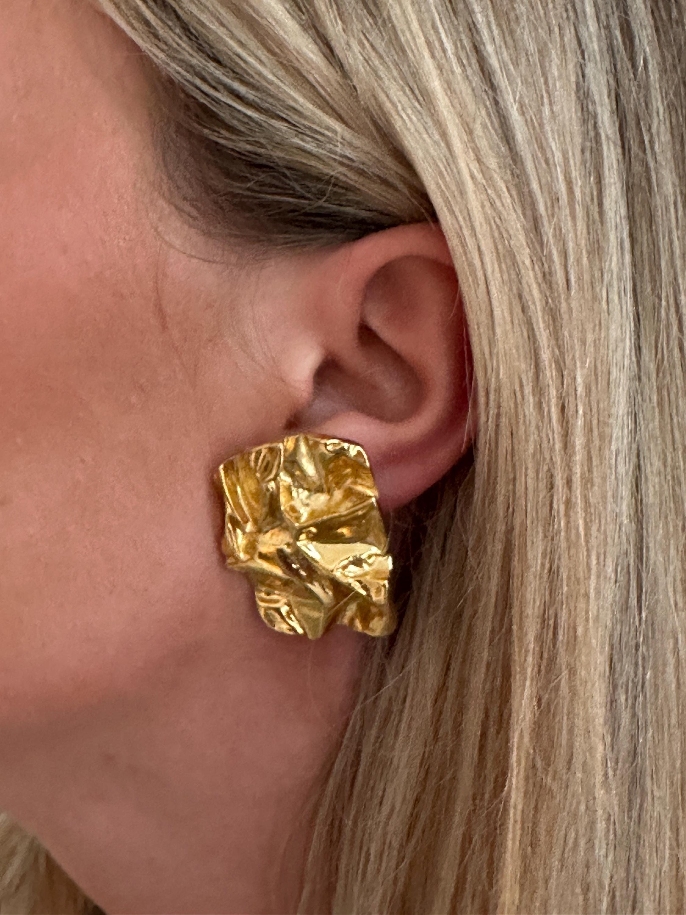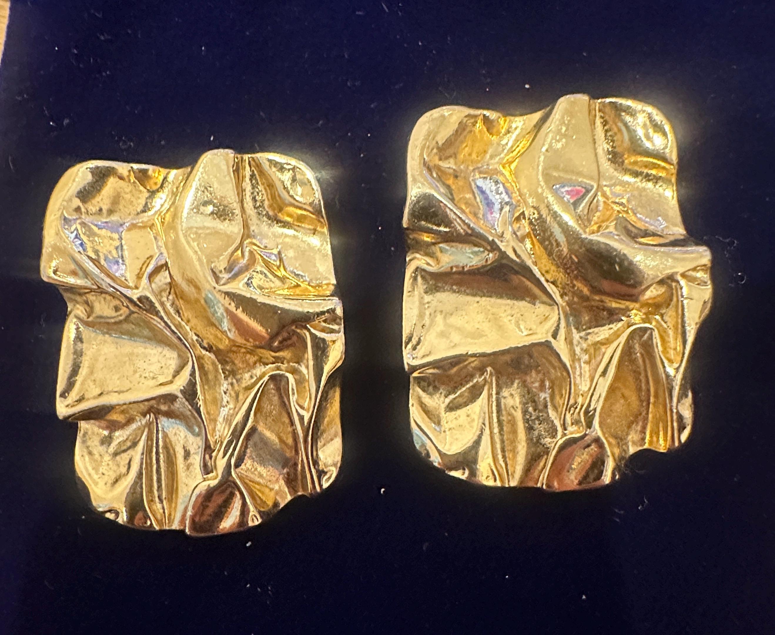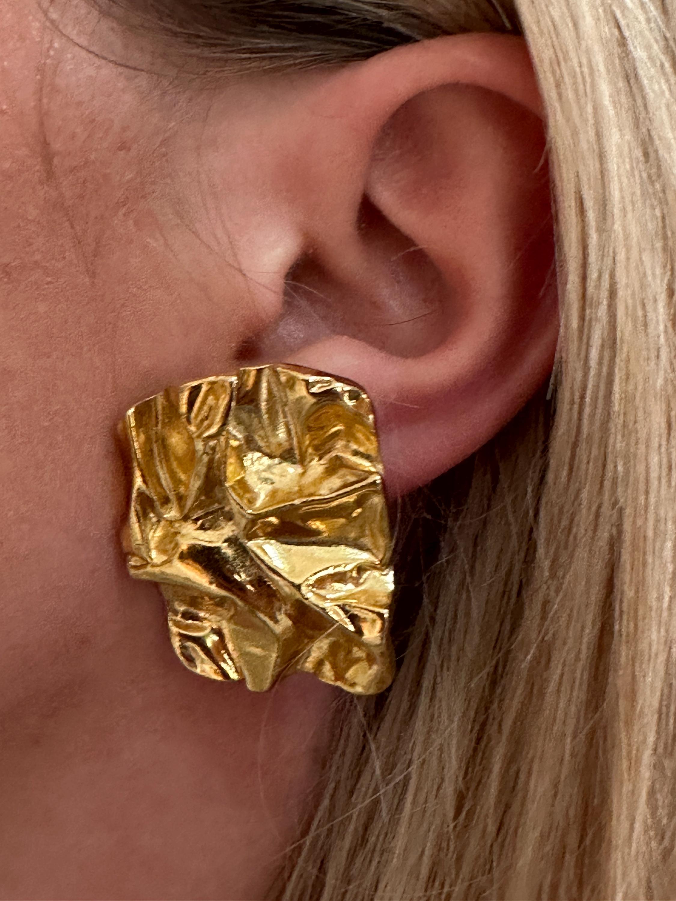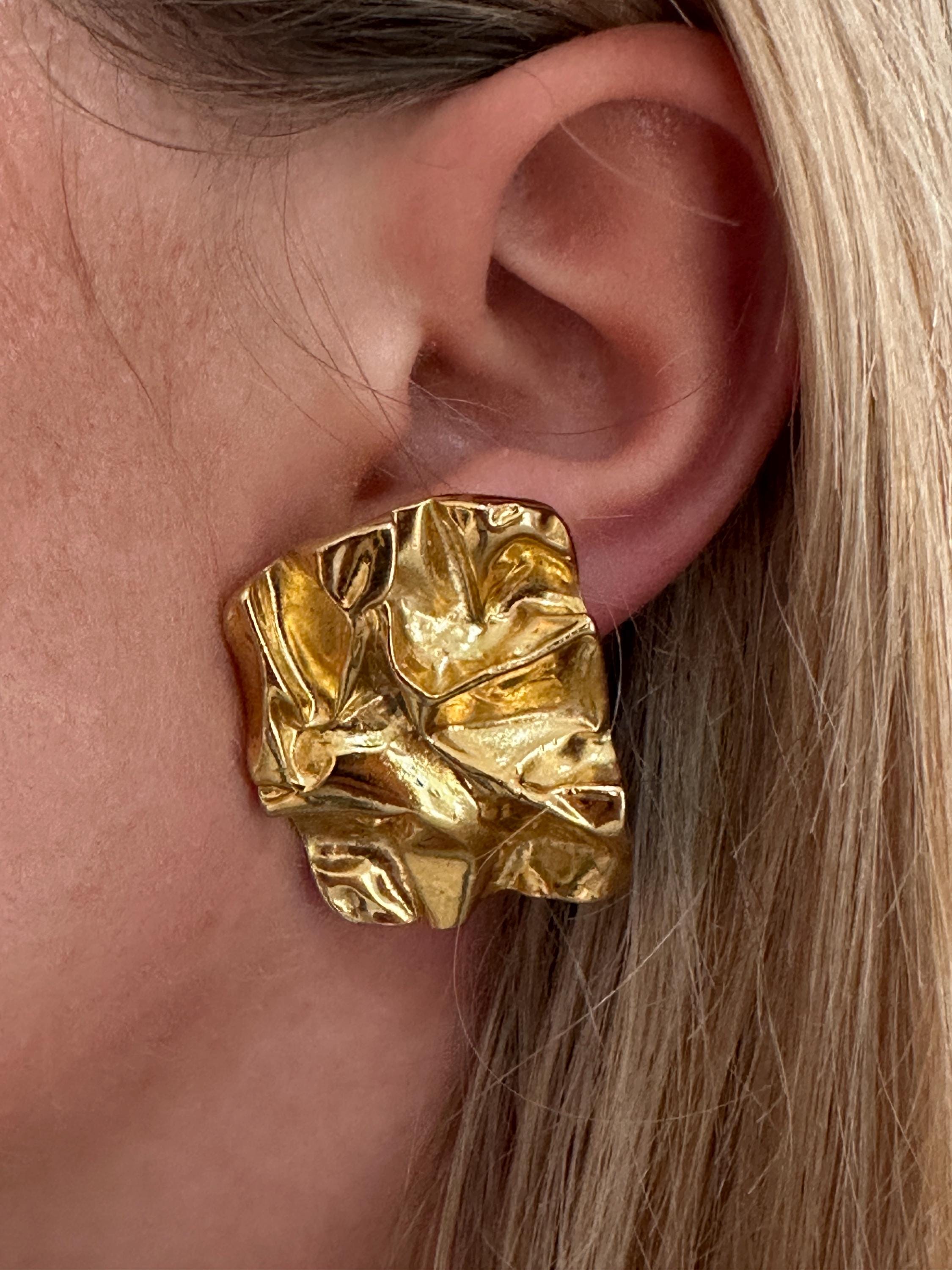 Here are a fantastic pair of vintage clip on earrings. These measure 3.5cm in height and 2.5cm in width. They make a great stand out pair of earrings and look like crumpled paper . They remain in great condition.