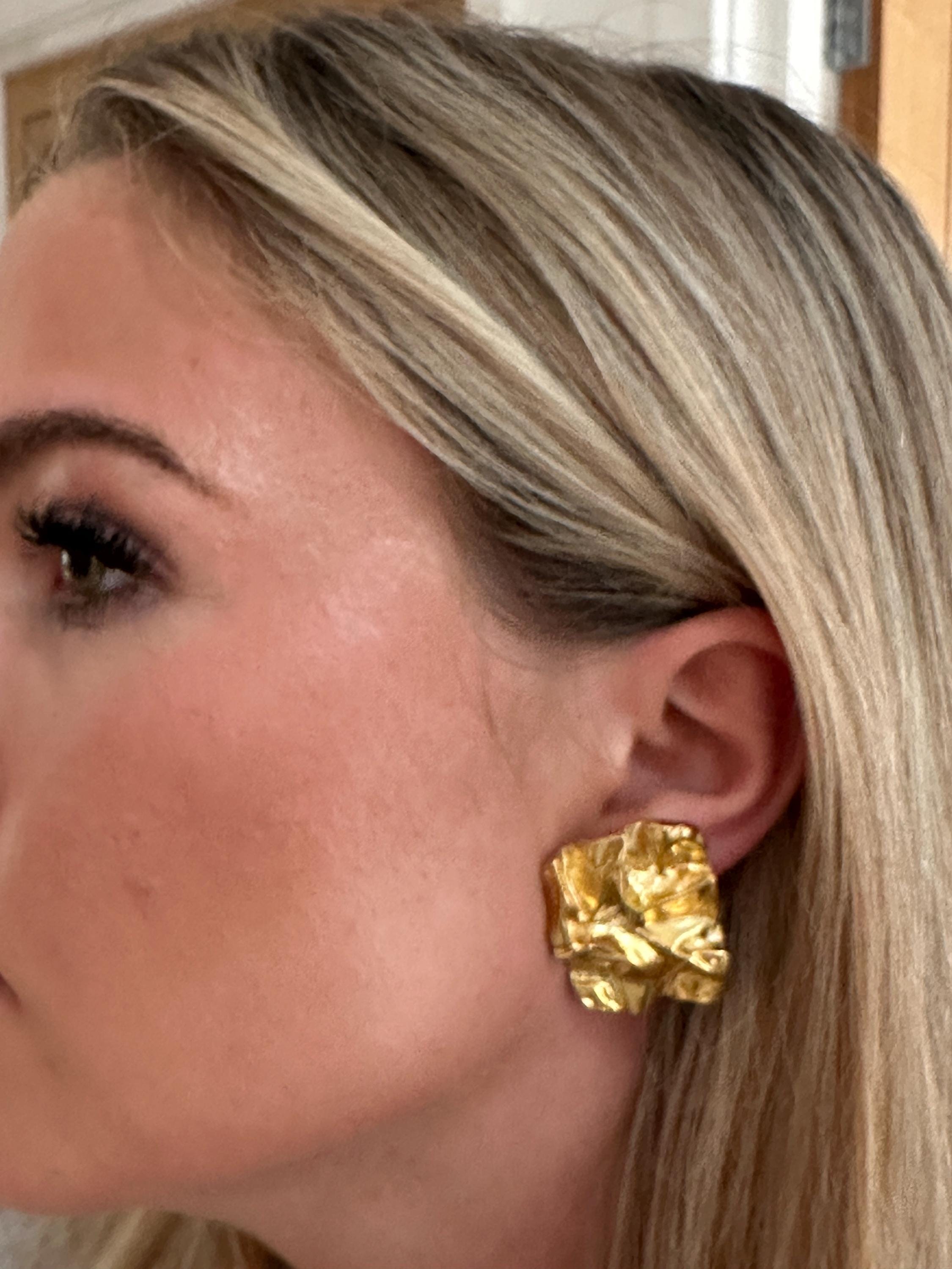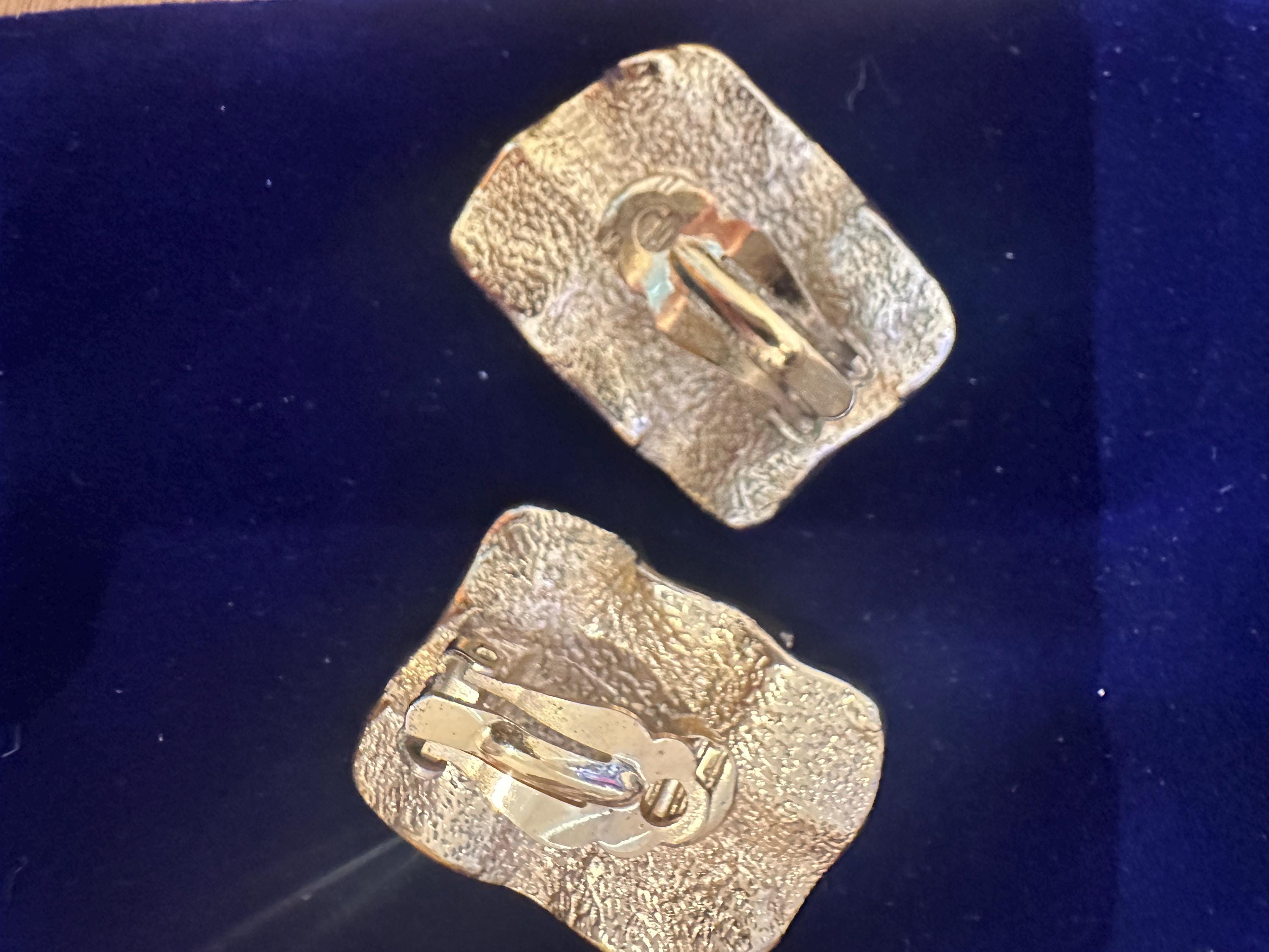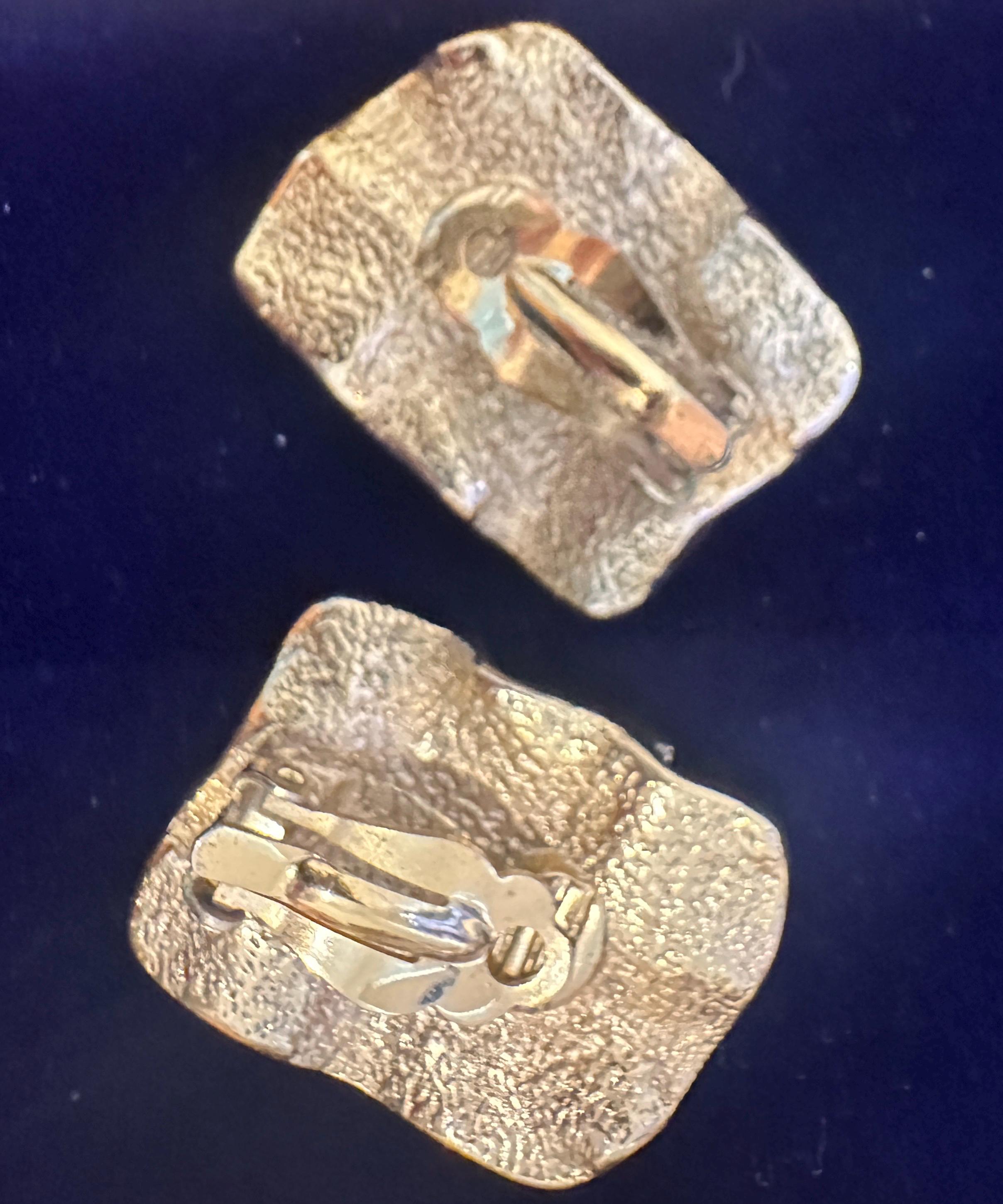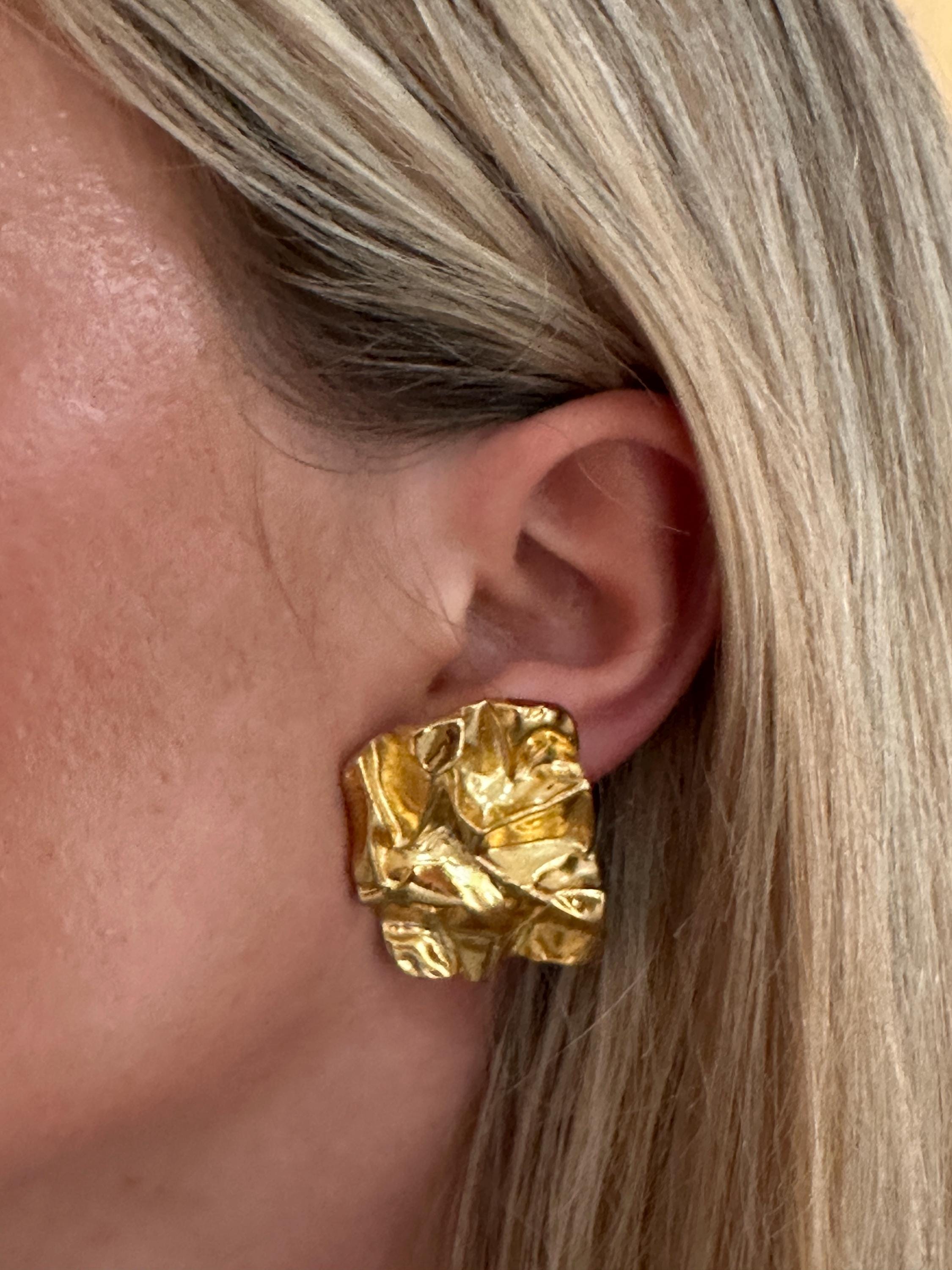 Here are a fantastic pair of vintage clip on earrings. These measure 3.5cm in height and 2.5cm in width. They make a great stand out pair of earrings and look like crumpled paper . They remain in great condition.