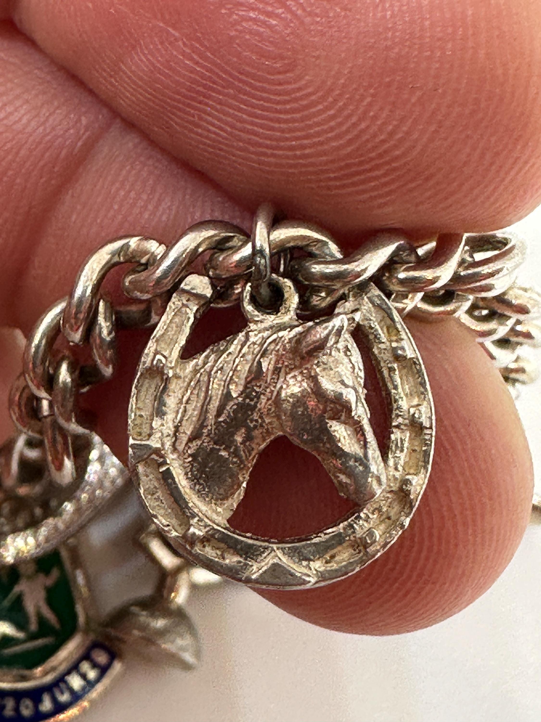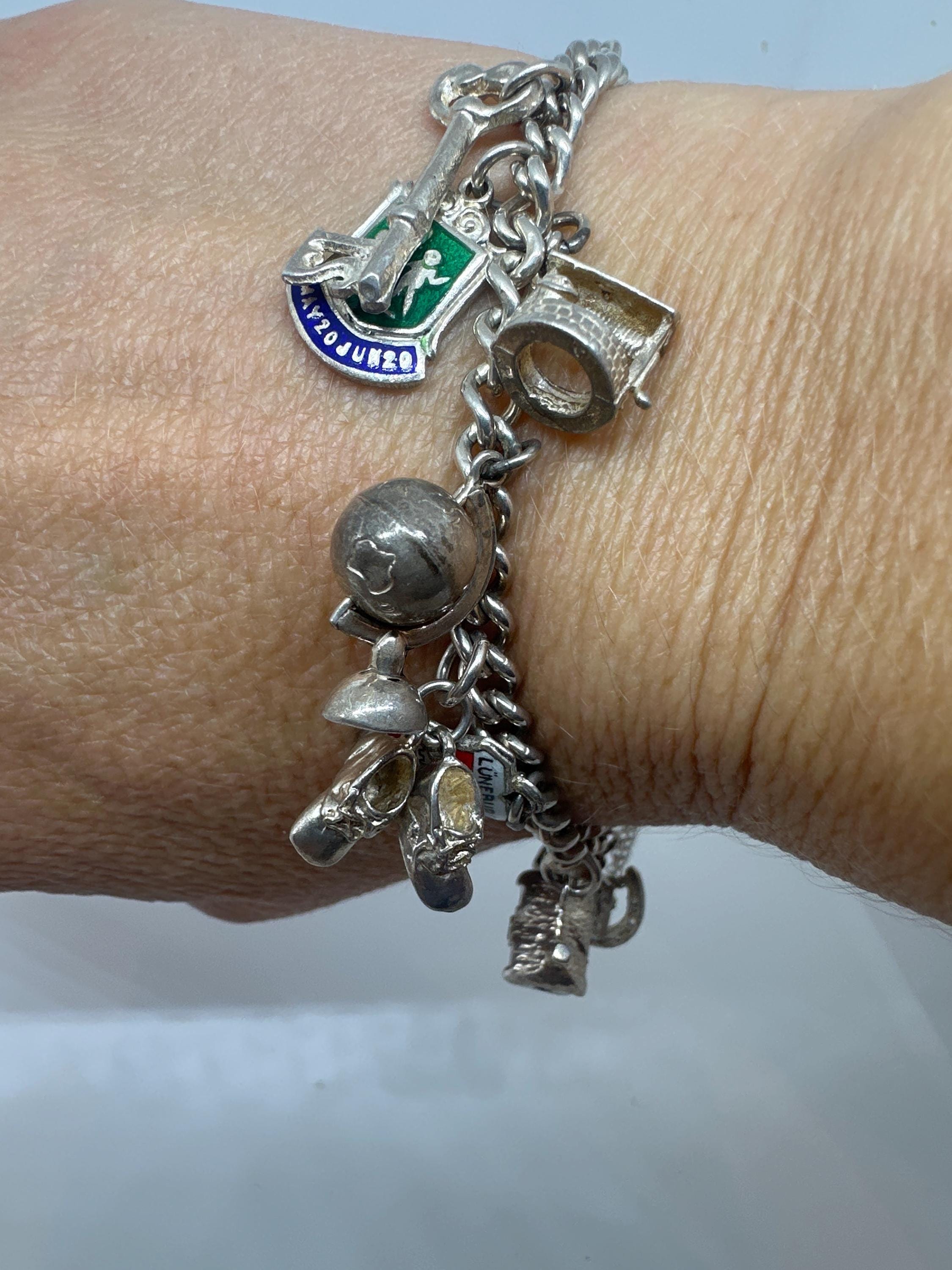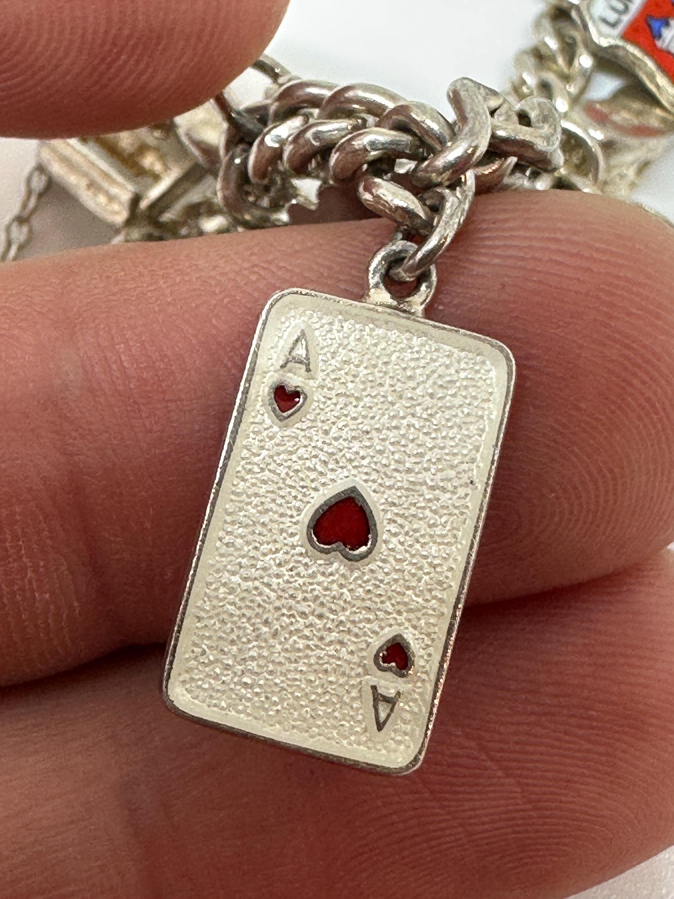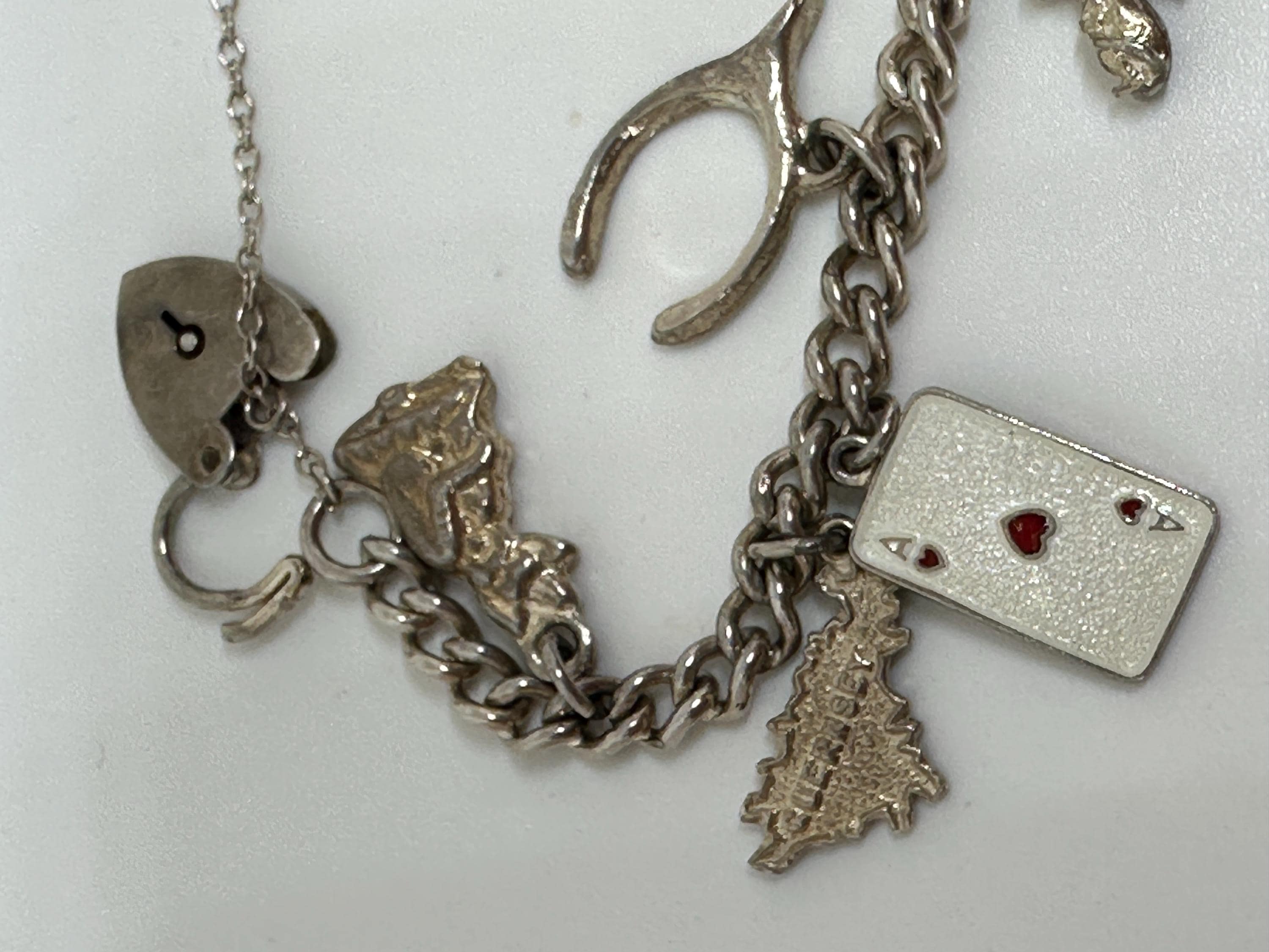 Here is a superb vintage charm bracelet. The bracelet itself is made from silver and closes with a marked for silver heart lock .It is a small wrist size and measures approximately 7 inches in length and weighs 32.6 grams. It has 13 charms including; Ace enamelled card charm, wishbone, pixie well, three mice, baby boots, atlas, horse head and more. It remains in excellent vintage condition.