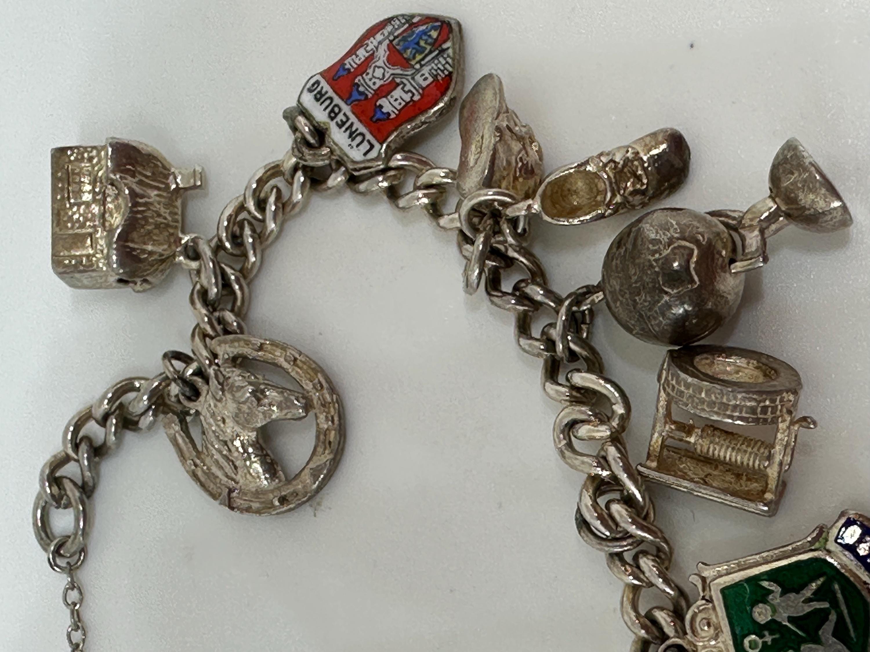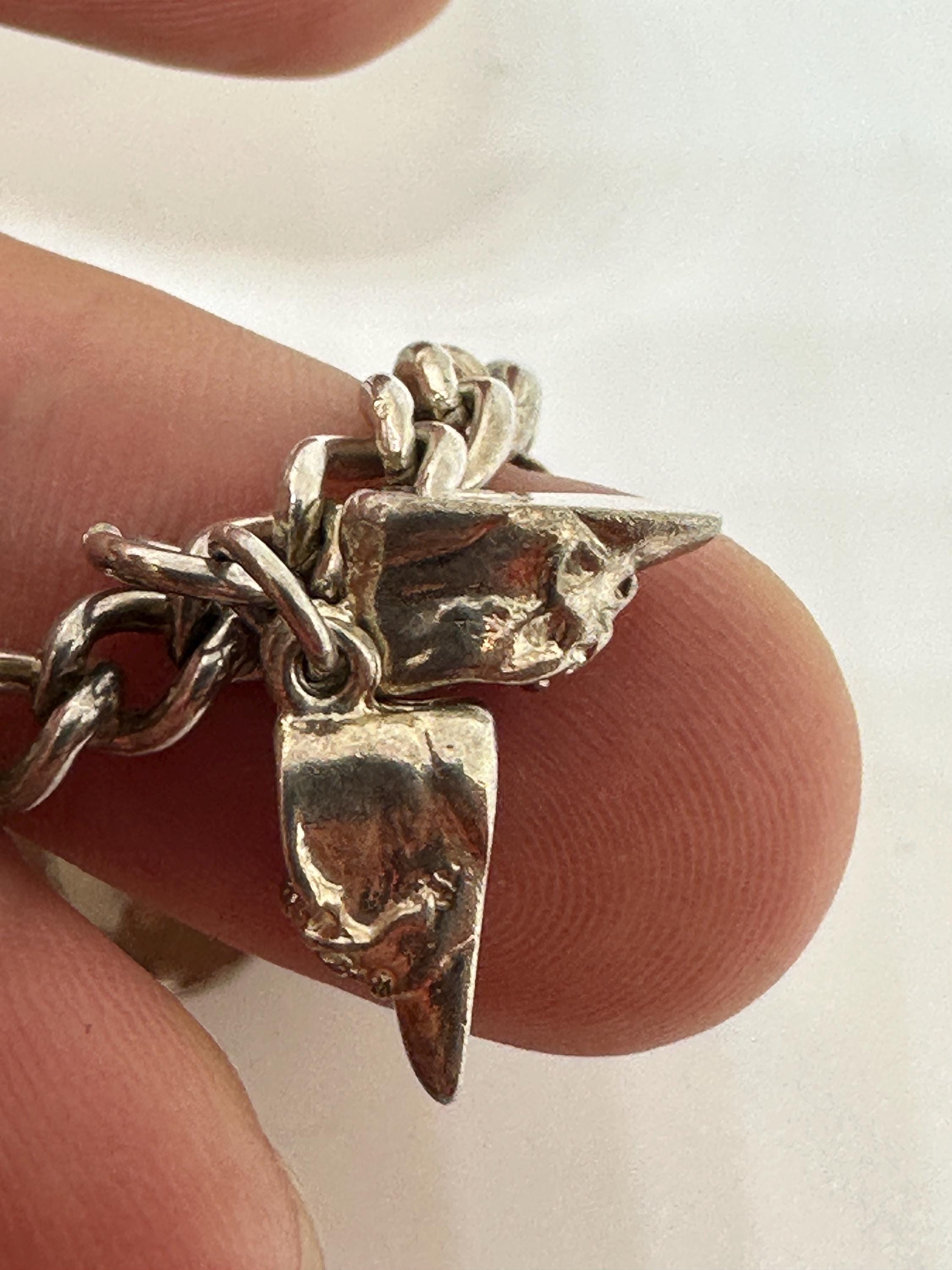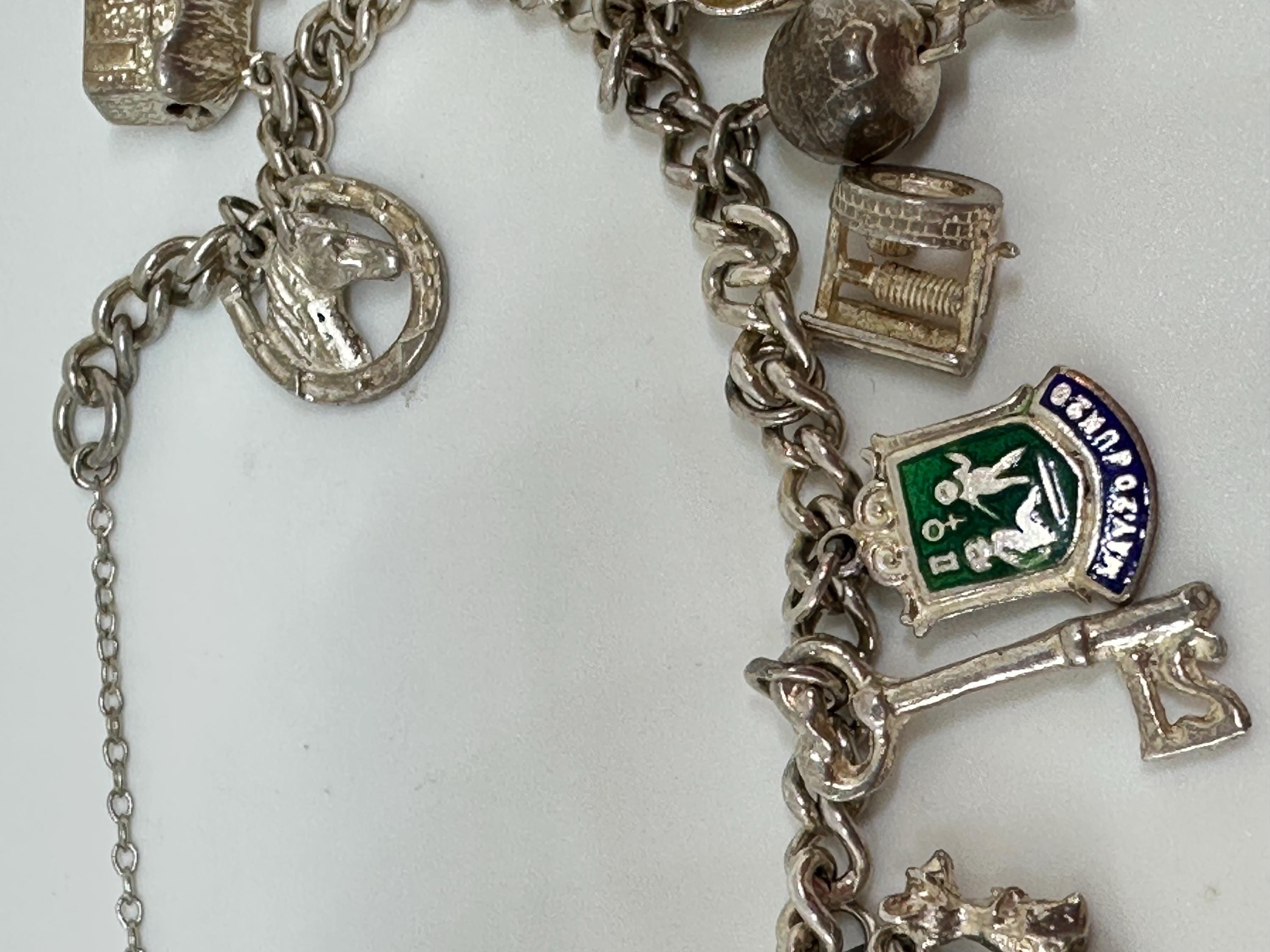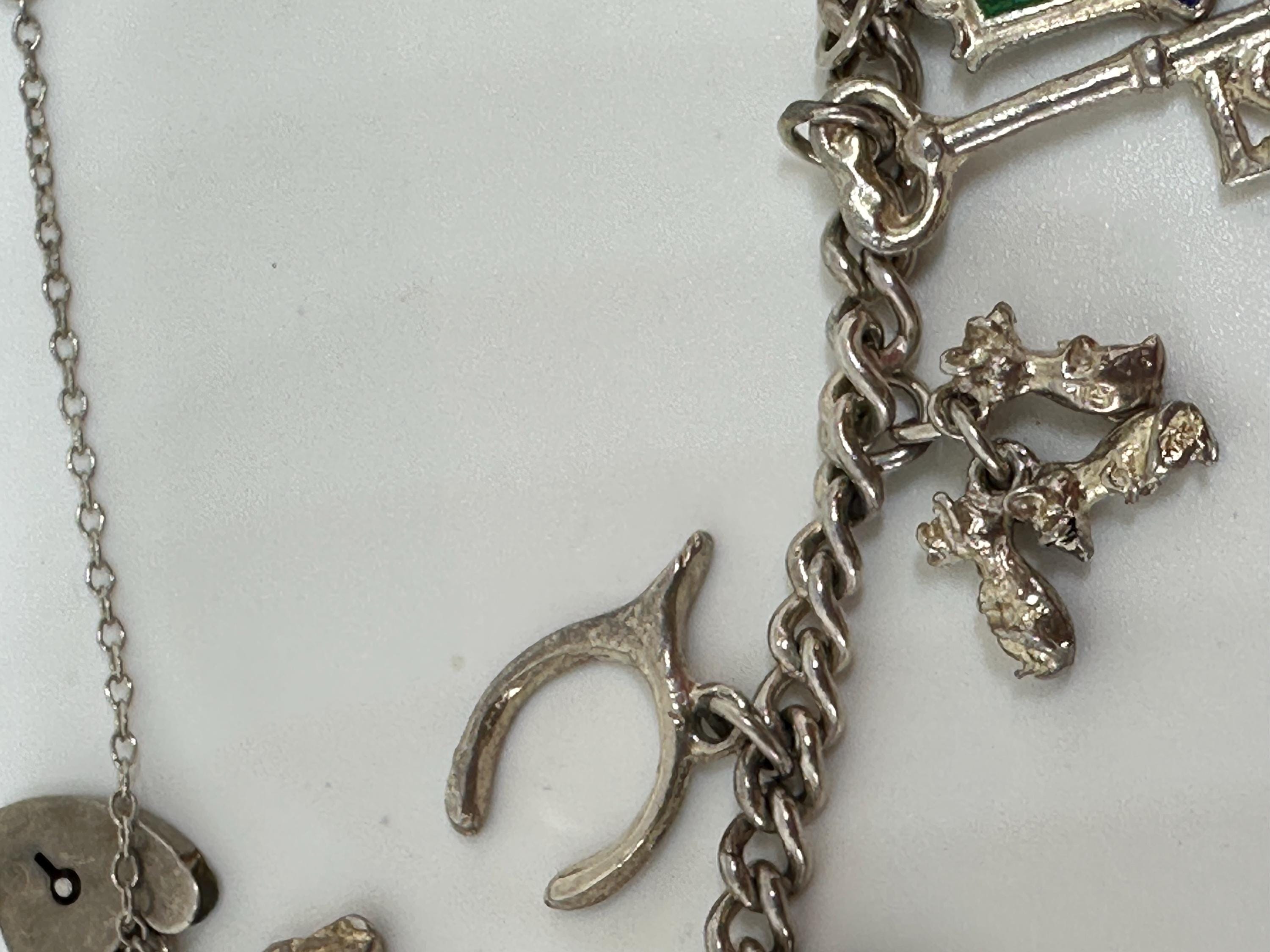 Here is a superb vintage charm bracelet. The bracelet itself is made from silver and closes with a marked for silver heart lock .It is a small wrist size and measures approximately 7 inches in length and weighs 32.6 grams. It has 13 charms including; Ace enamelled card charm, wishbone, pixie well, three mice, baby boots, atlas, horse head and more. It remains in excellent vintage condition.